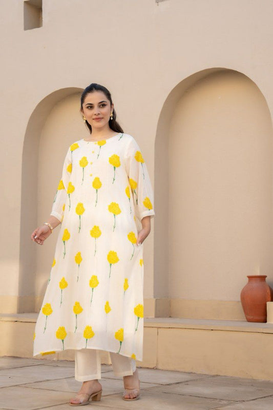 Yellow Pastel Garden Mul Cotton A Line Kurta Set