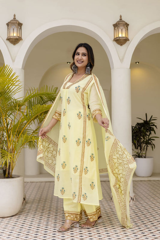 Yellow Cotton block print Suit Set