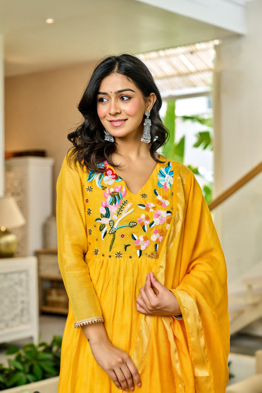 Handwork mul chanderi yellow suit