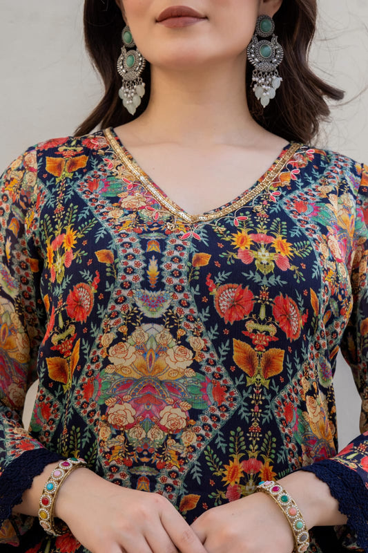 Handwork mul chanderi blue suit