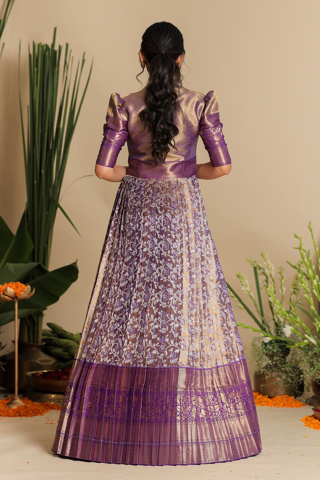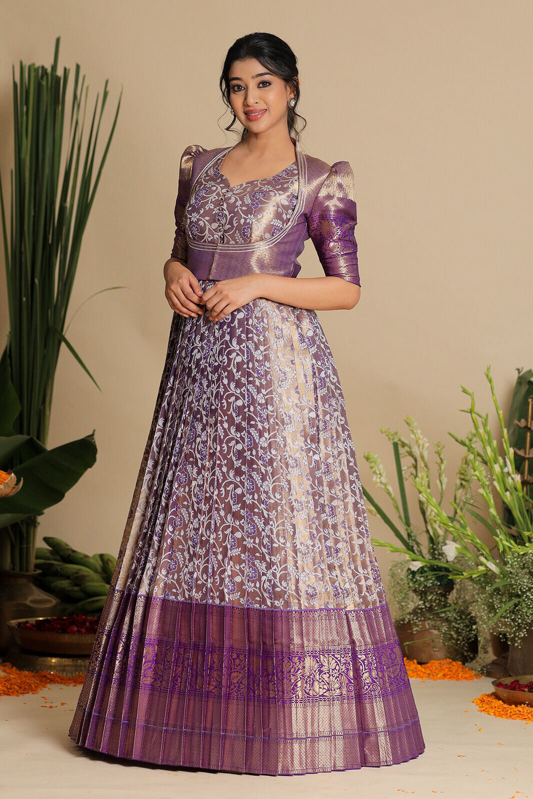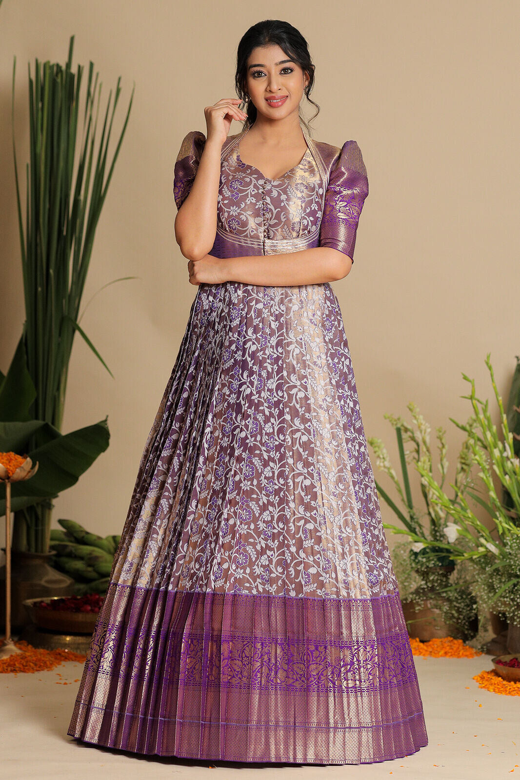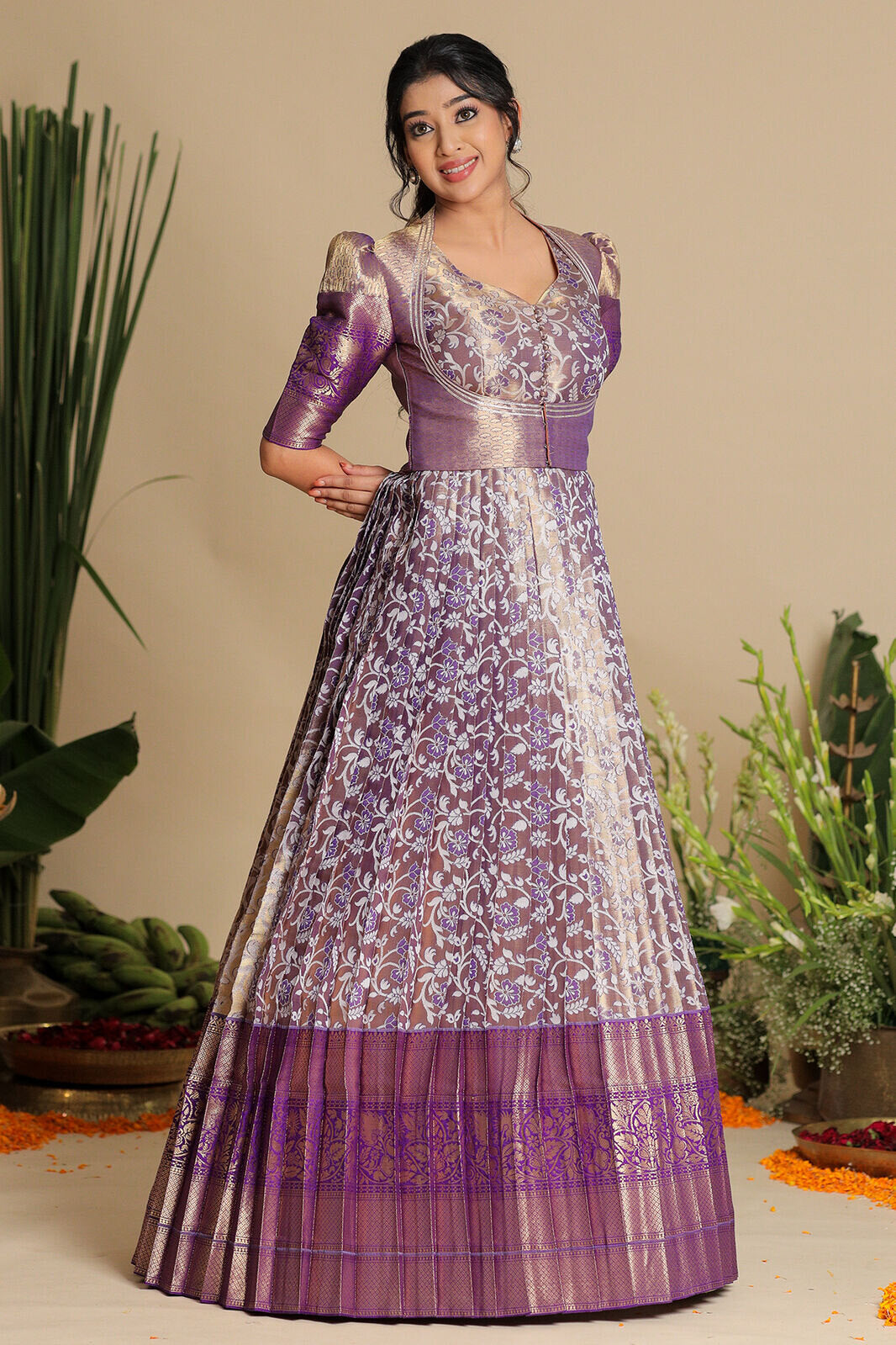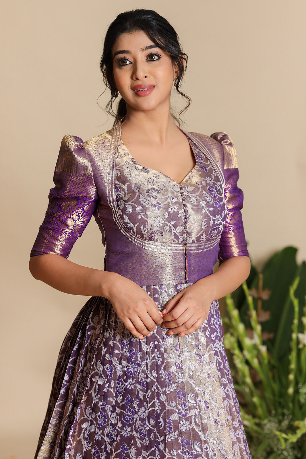 Experience the charm of Indian textiles with This Banarasi two-piece dress. Crafted in Banarasi silk fabric, the Jacket highlights fantastic features, such as puff sleeves with gotta lace on the yoke, potli detailing on the front opening, and a sweetheart neckline. Twirl your heart out, as it will definitely give you an Indian princess vibe in this dress. The edge of the dress and the sleeves feature some intricate, detailed, broad Pattu designs.