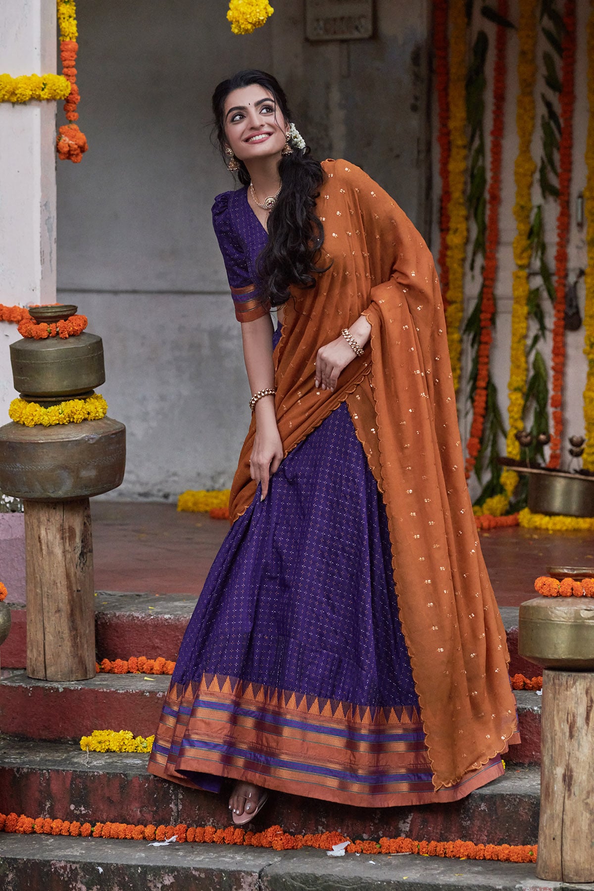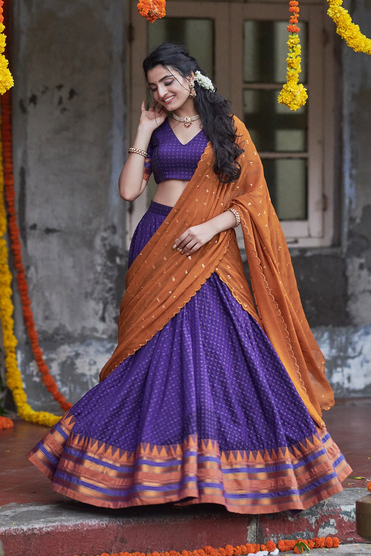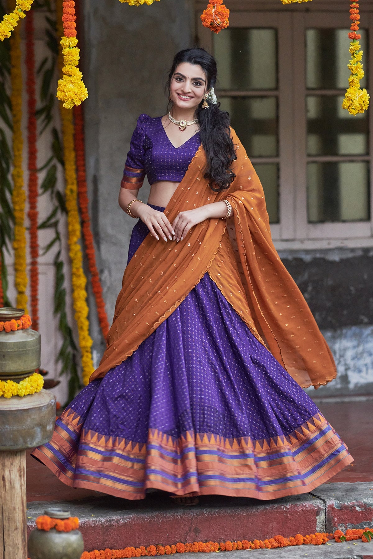 The festive season is Just around the corner, and we can't wait to serve you the best! Get this beautiful karigari Half-Saree crafted in Pure handloom and Known for its lightweight characteristics. Dyed in Royal Purple color with contrasting Dark Mustard Yellow in georgette Butti detailing. The highlighting part of this lehenga is a woven Border on the lehenga and blouse. Blouse Feature V-Neckline with Puff Sleeves. Accessories minimally and make this Festival memorable.