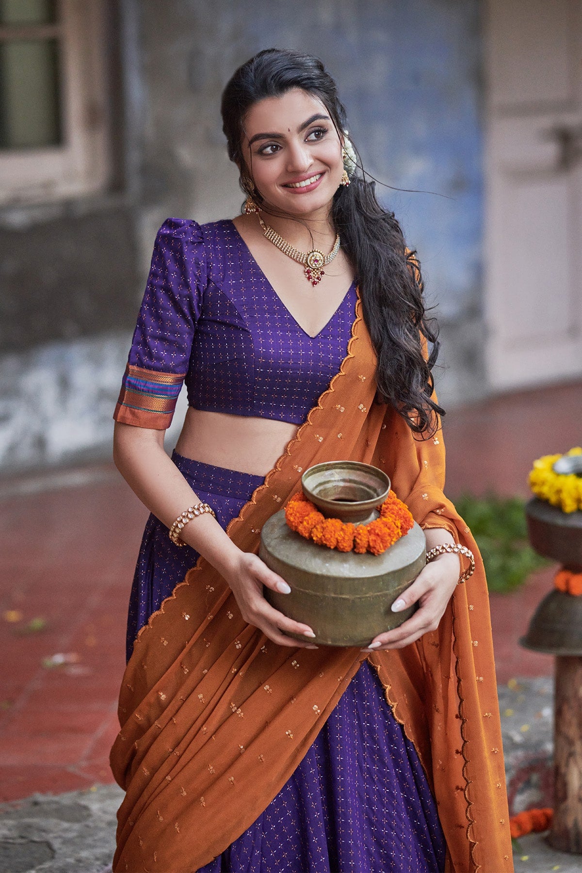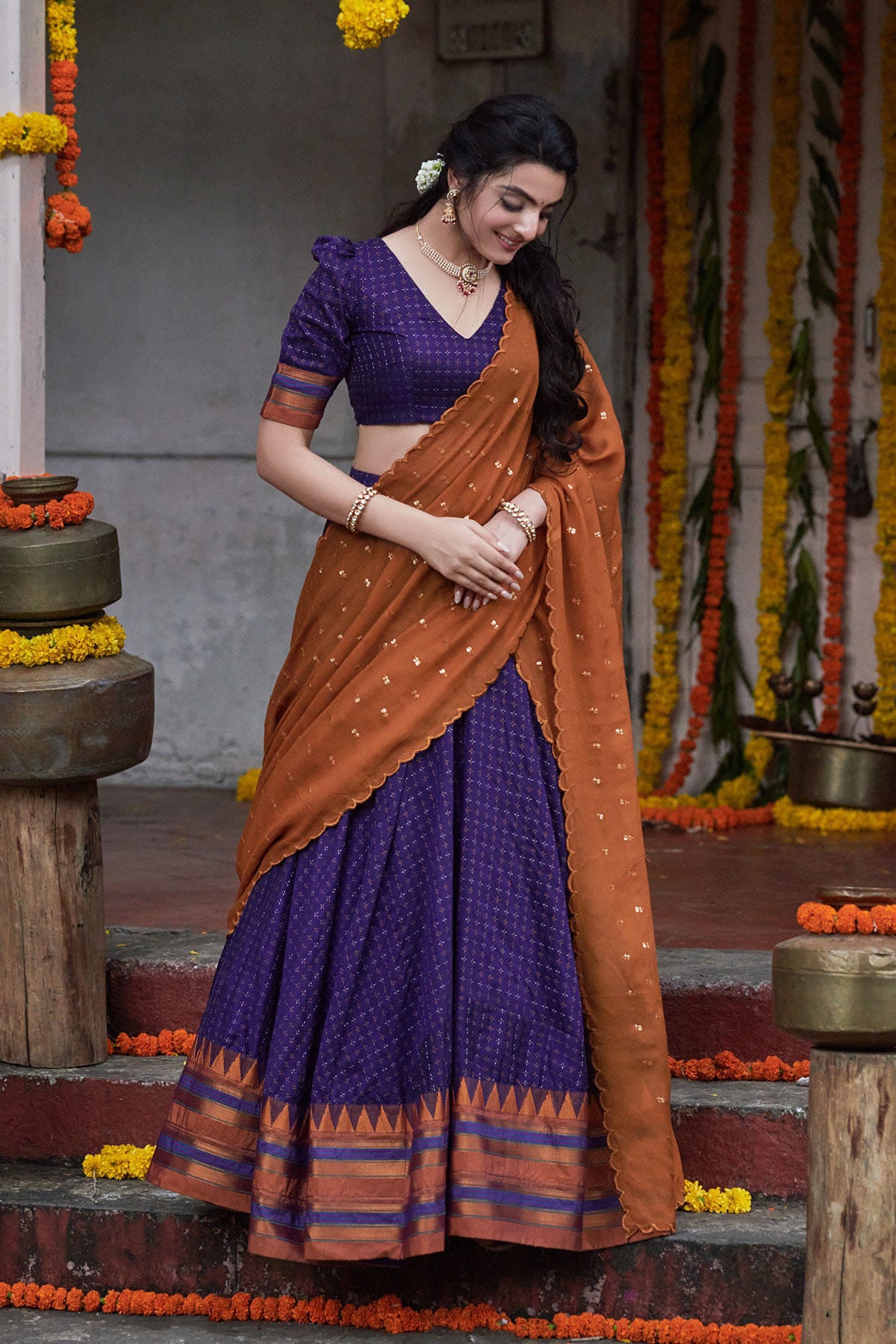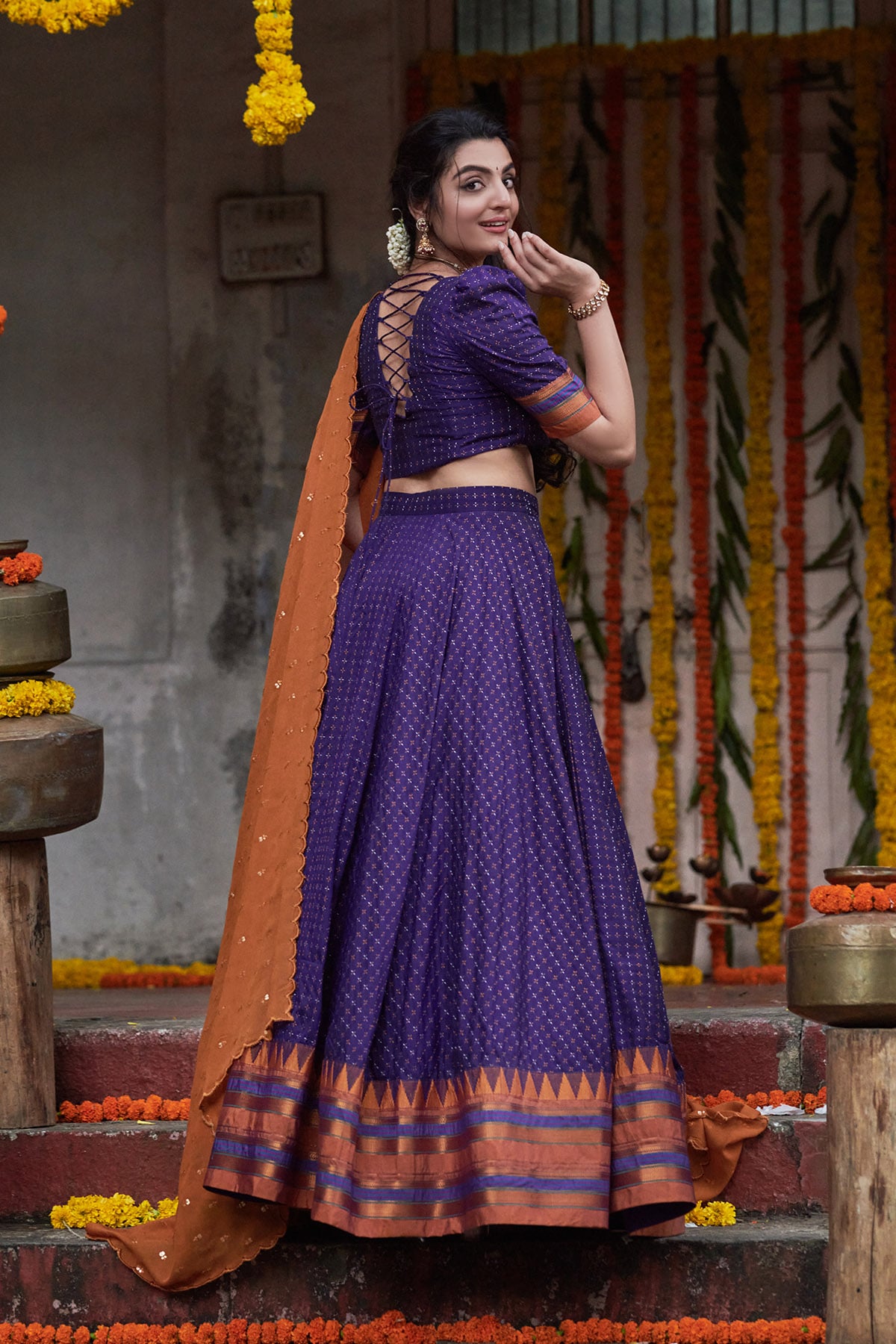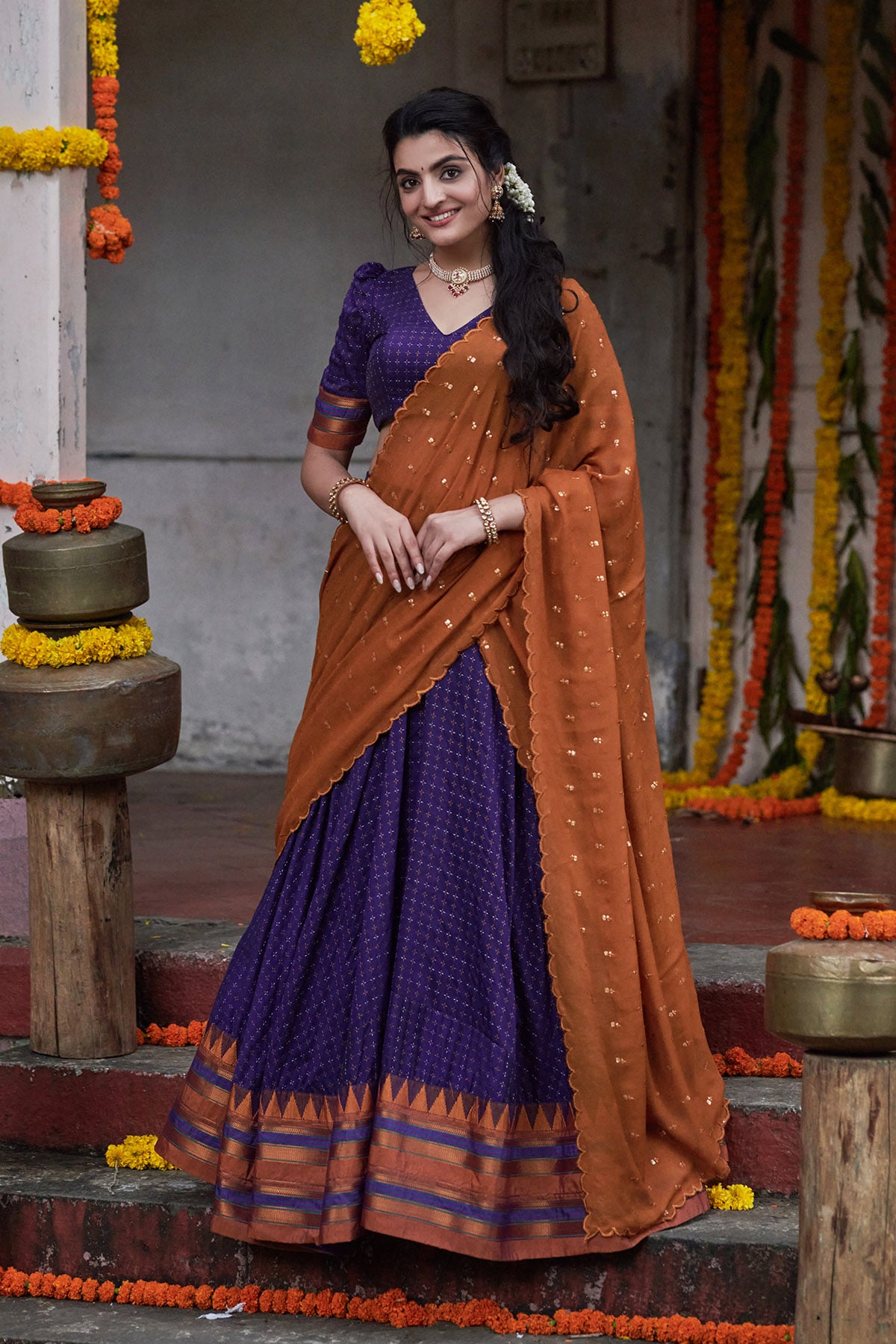 The festive season is Just around the corner, and we can't wait to serve you the best! Get this beautiful karigari Half-Saree crafted in Pure handloom and Known for its lightweight characteristics. Dyed in Royal Purple color with contrasting Dark Mustard Yellow in georgette Butti detailing. The highlighting part of this lehenga is a woven Border on the lehenga and blouse. Blouse Feature V-Neckline with Puff Sleeves. Accessories minimally and make this Festival memorable.
