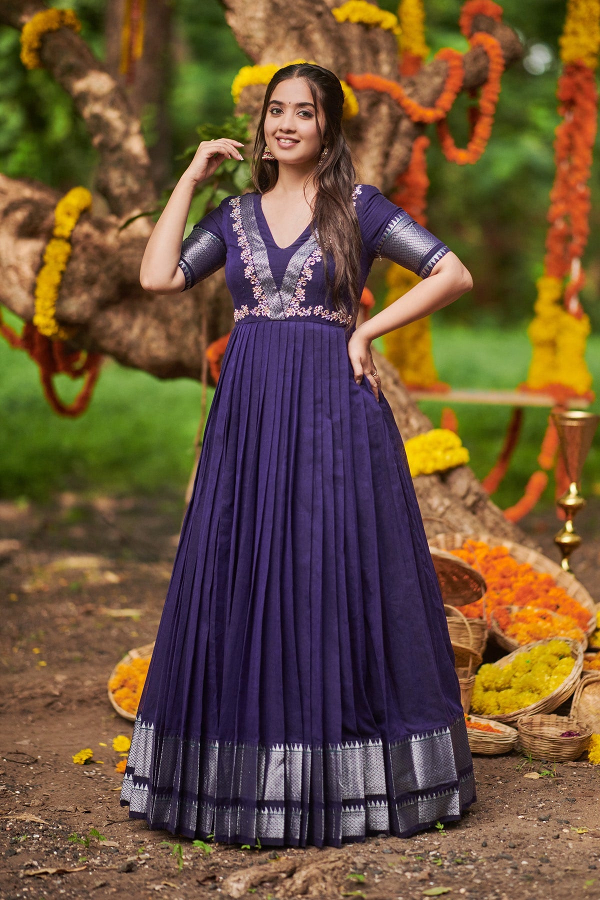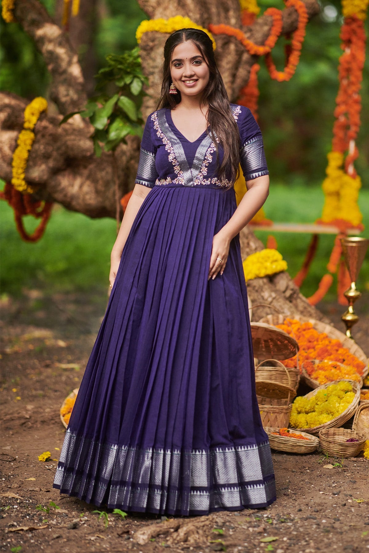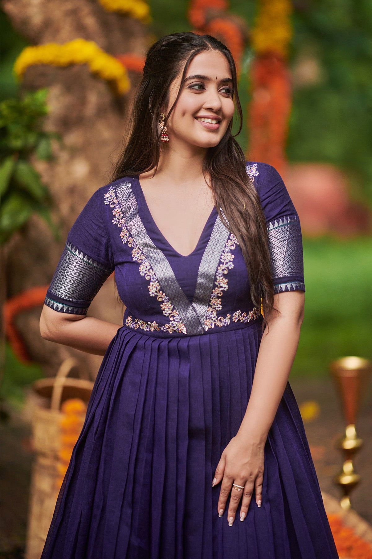 Want a Classy yet casual-looking dress? You need this Purple Apeksha Handloom Dress crafted from pure handloom cotton. It has a woven pattu on the edge of the dress and on the sleeves. It has a long pleated flair length of 55 with handwork detailing the yoke, elevating the V-neckline. Perfect for your festive wardrobe. (Side zip attached)