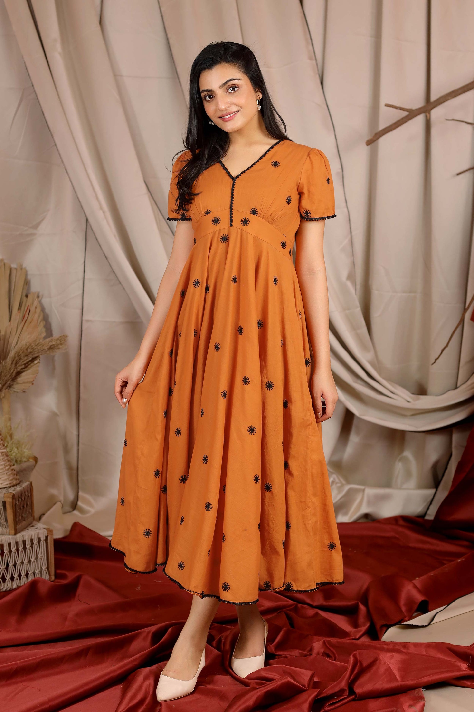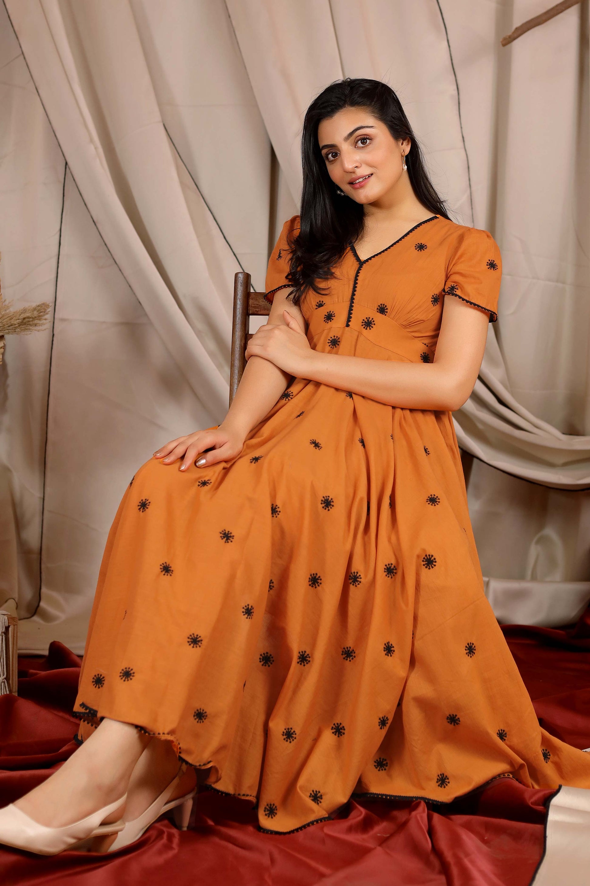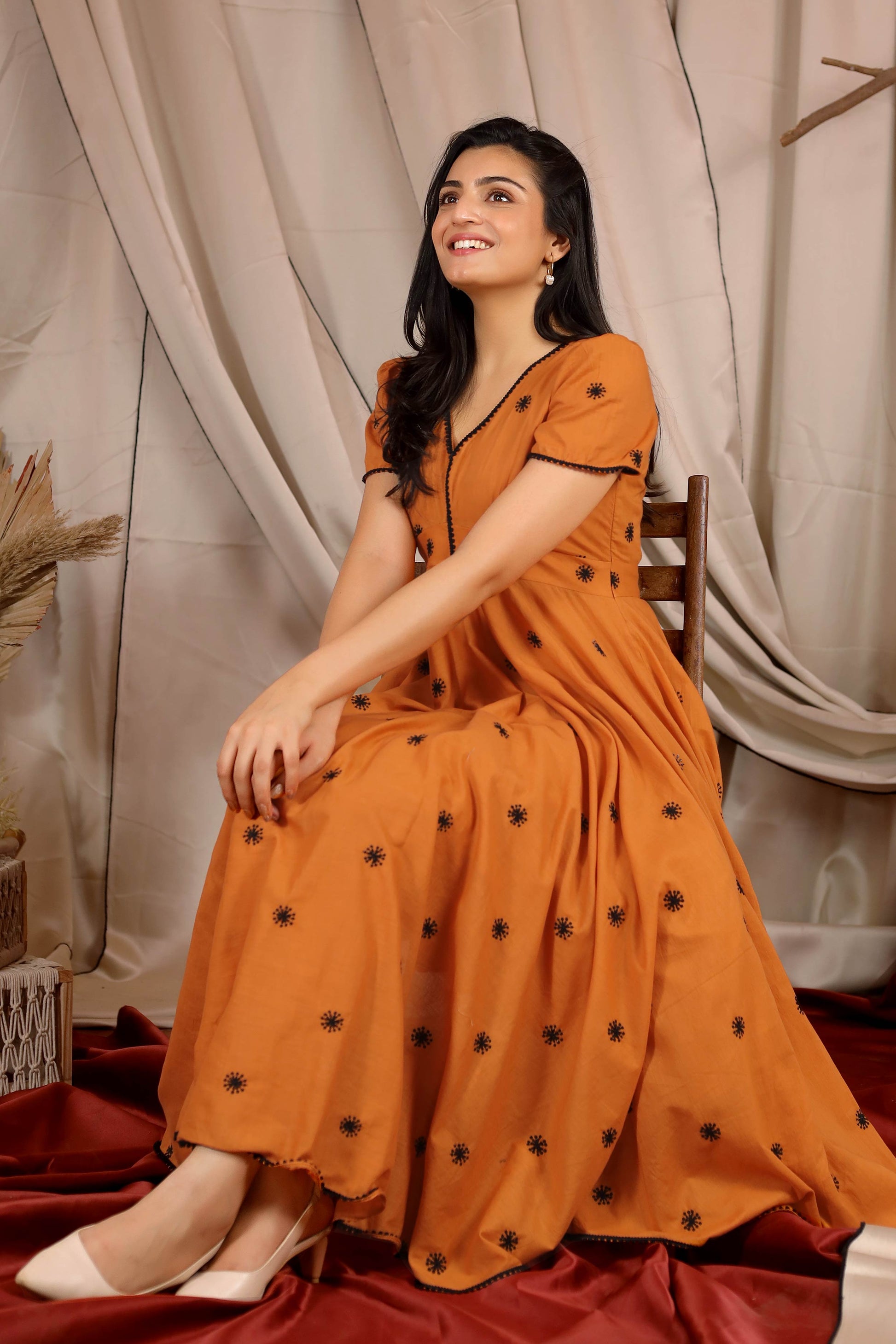Our latest addition to your summer wardrobe is true to its elegance and comfort—our Apricot Summer Dress is crafted in premium cotton fabric. This dress showcases delicate thread embroidery that adds a touch of artisanal charm. The hue perfectly complements the summer vibe with a V-neckline and basic Balloon sleeves.