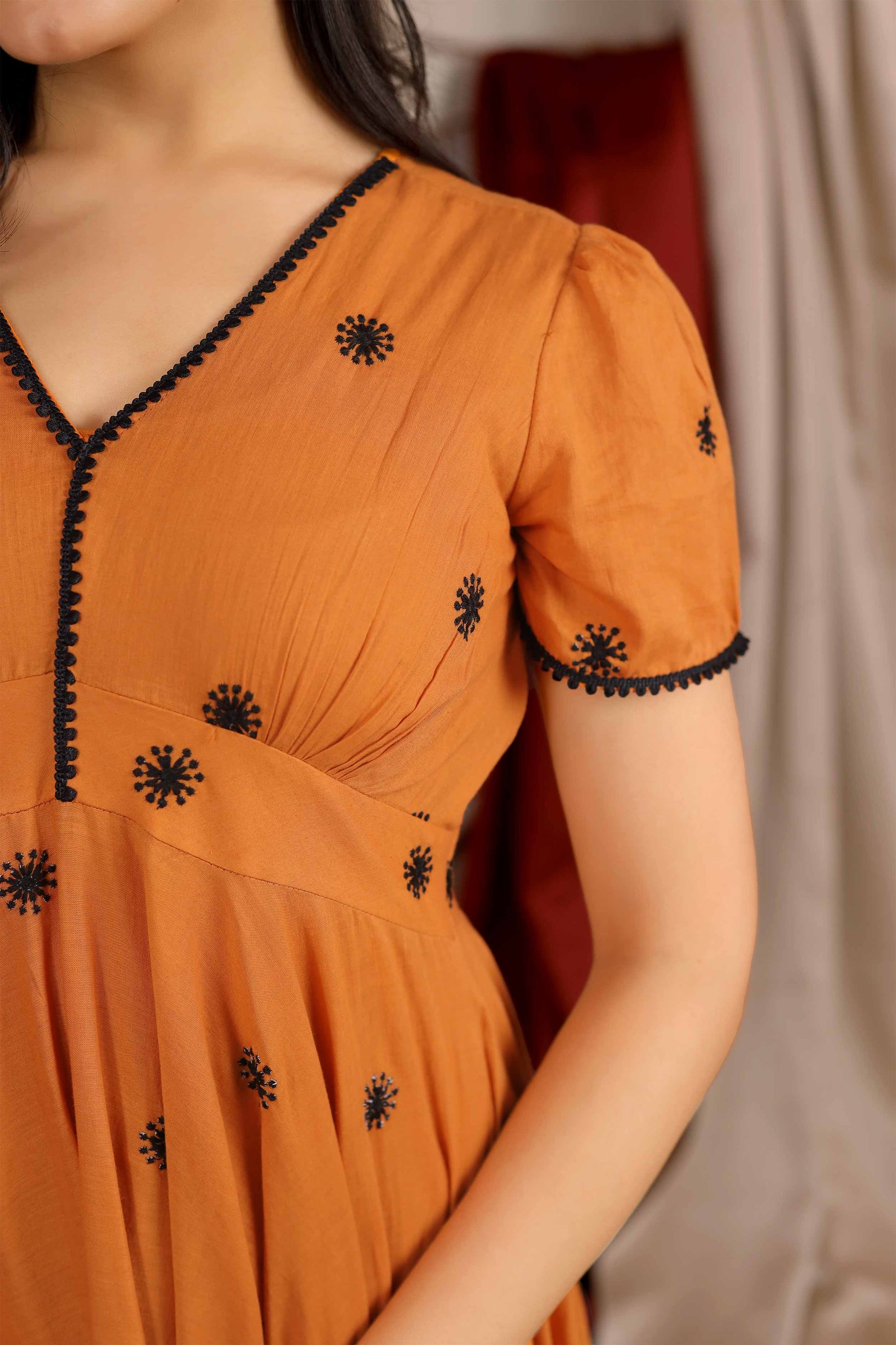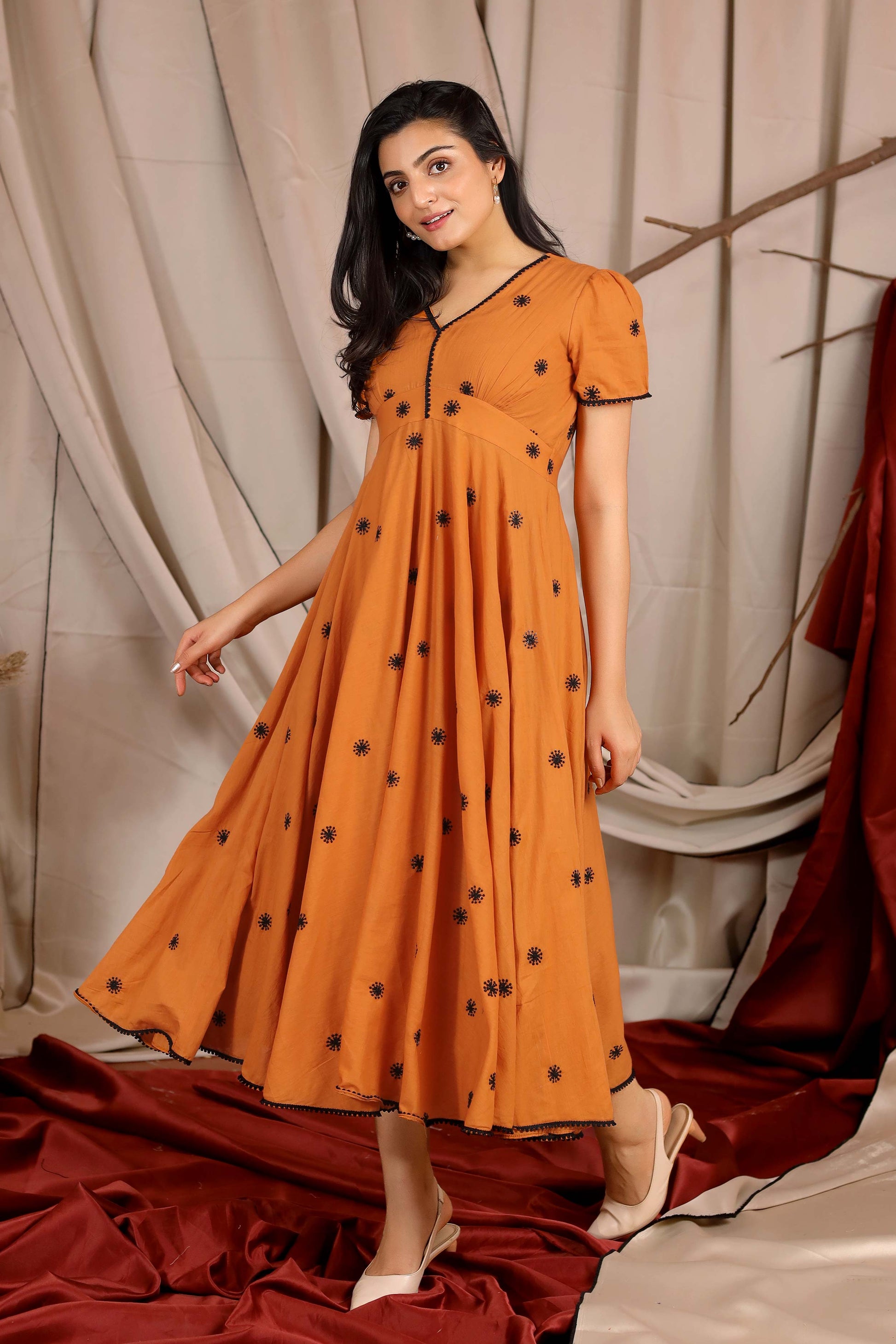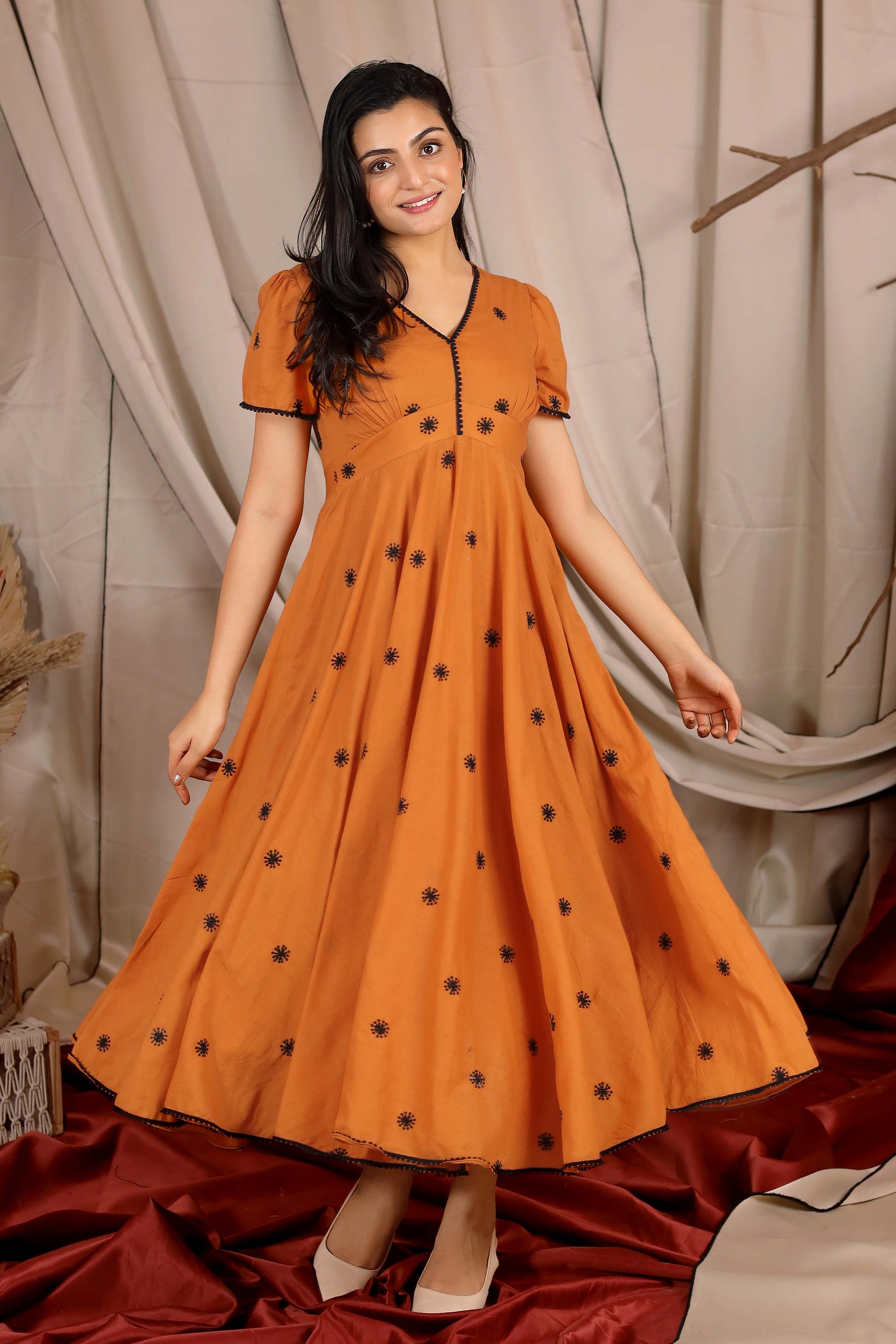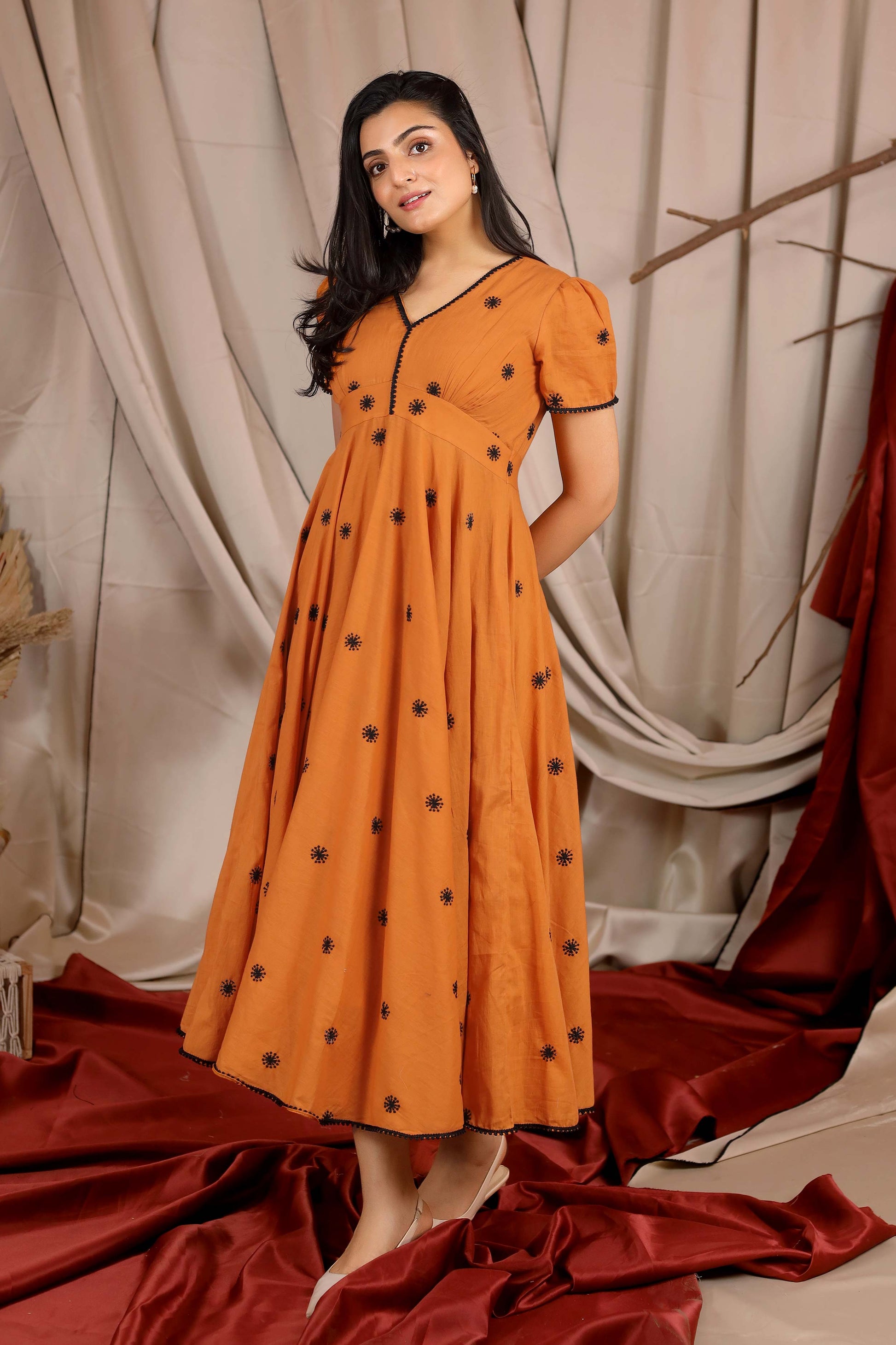 Our latest addition to your summer wardrobe is true to its elegance and comfort—our Apricot Summer Dress is crafted in premium cotton fabric. This dress showcases delicate thread embroidery that adds a touch of artisanal charm. The hue perfectly complements the summer vibe with a V-neckline and basic Balloon sleeves.