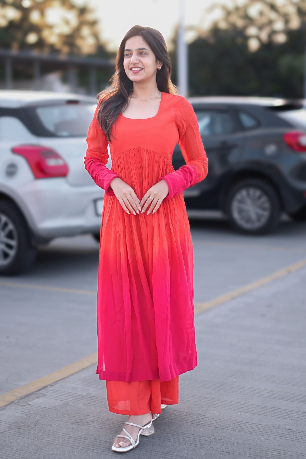 This palazzo in ombre shades creates a subtle elegance and charming visual effect, making it stand out at any occasion. It features a U-neckline and long sleeves with front gathering on the yoke that ensures comfort while enhancing the dress's movement, making it perfect for every body type. This is the perfect choice for a family gathering or housewarming party, making it a versatile addition to your wardrobe. For the best standard look, go for minimal pearl accessories for effortless charm.