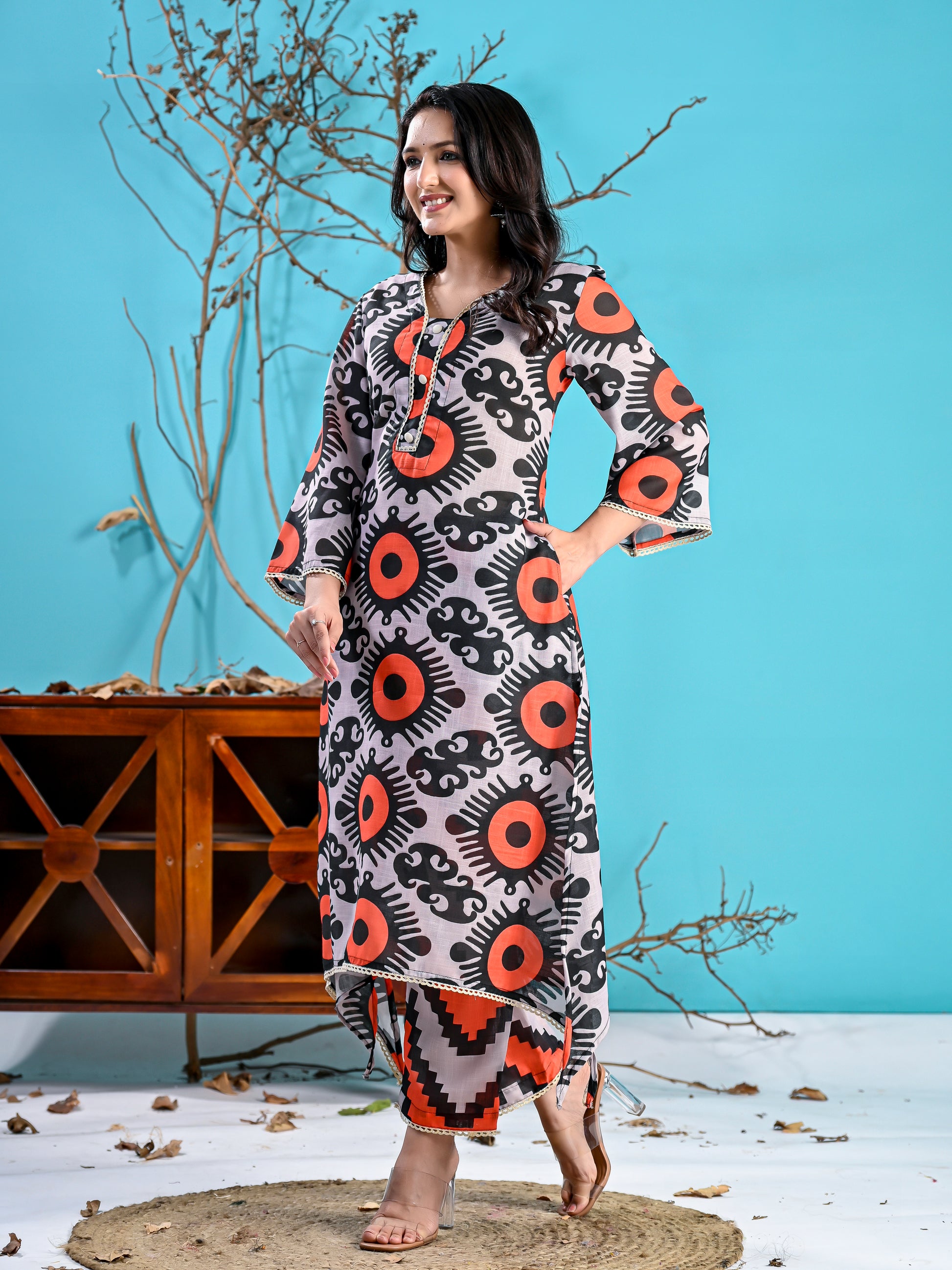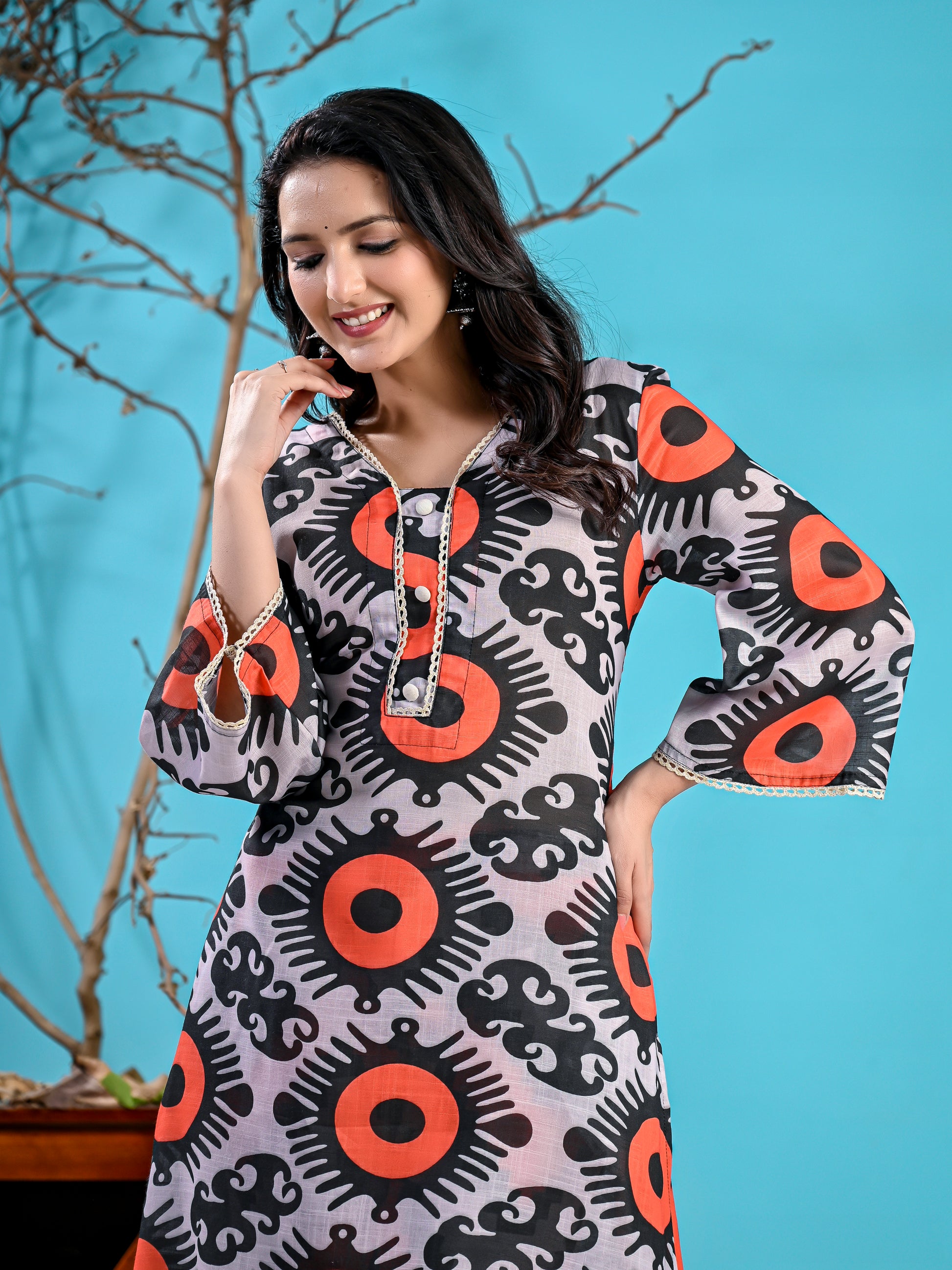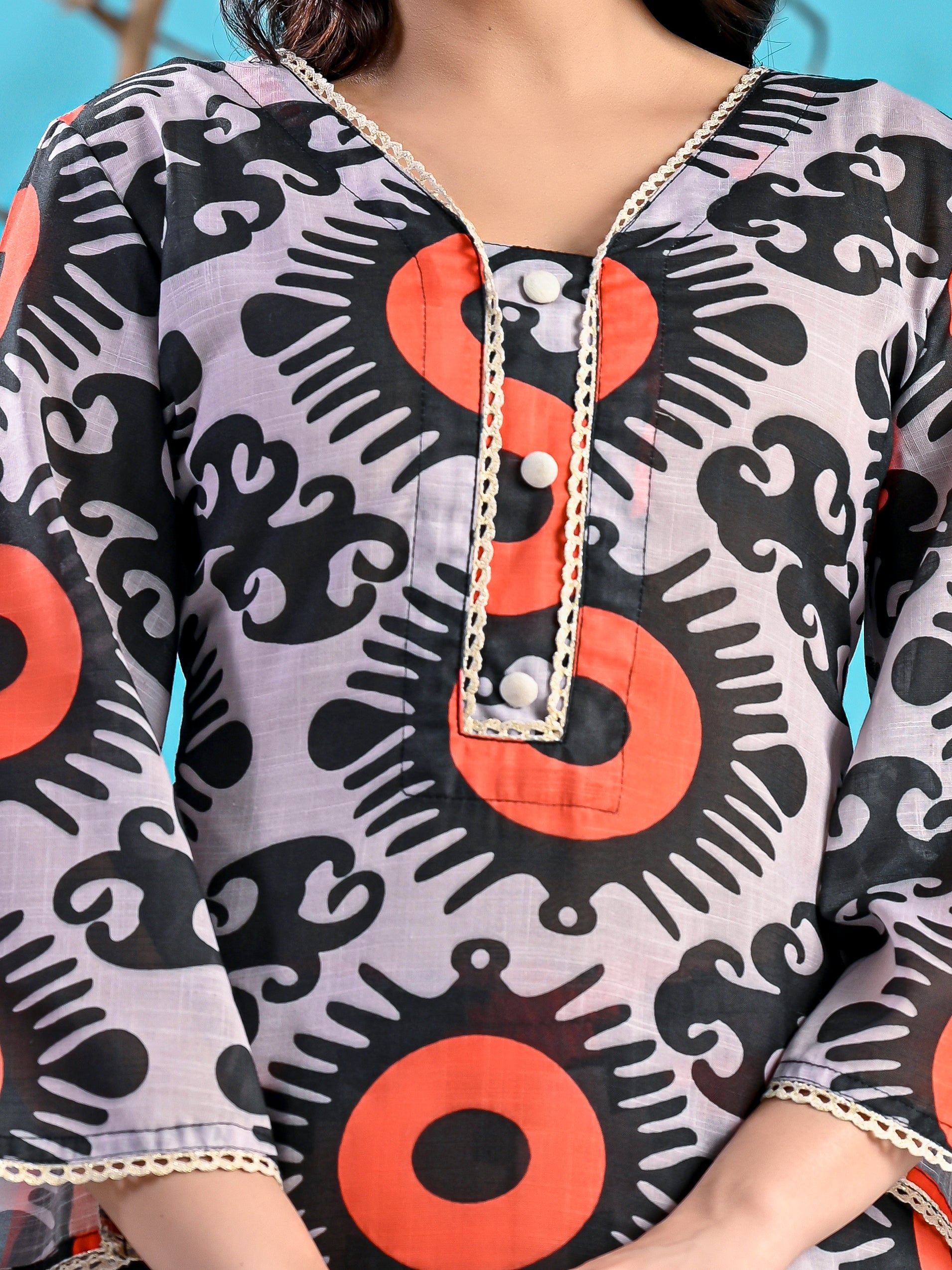 Embrace effortless elegance with this versatile orange kurta and pants set. The lace detailed neck kurta features chic 3/4th bell sleeves and elegant fish cut.This standout piece is adorned with lace accents along the neckline, sleeves, and hem, with pockets adding a touch of sophistication. Paired with straight printed pants, embellished with delicate lace detailing at the hemline, and offering both comfort and style