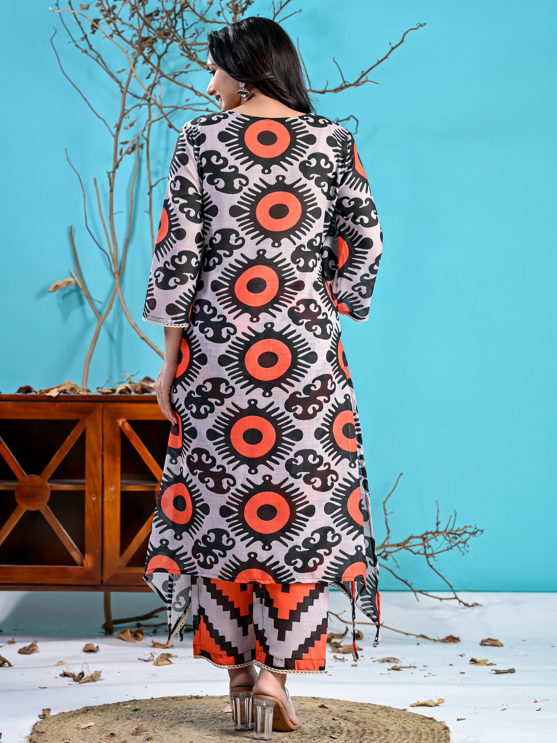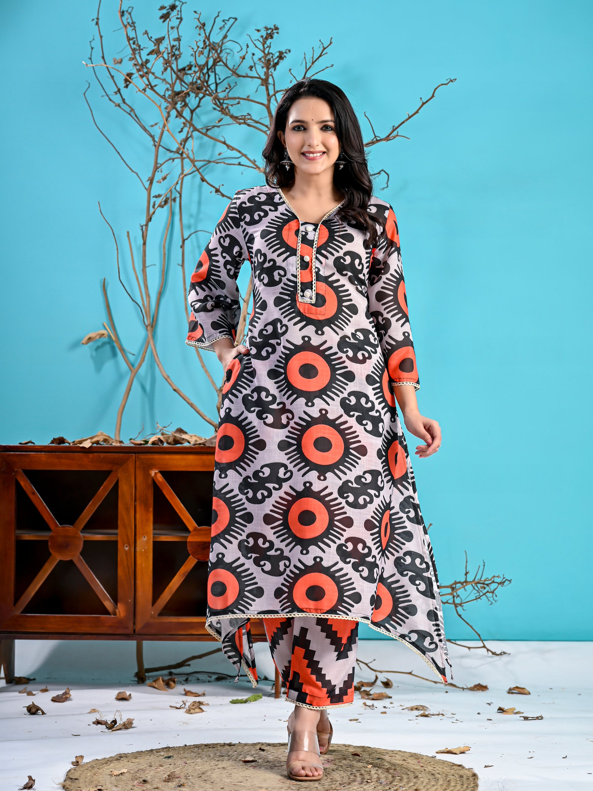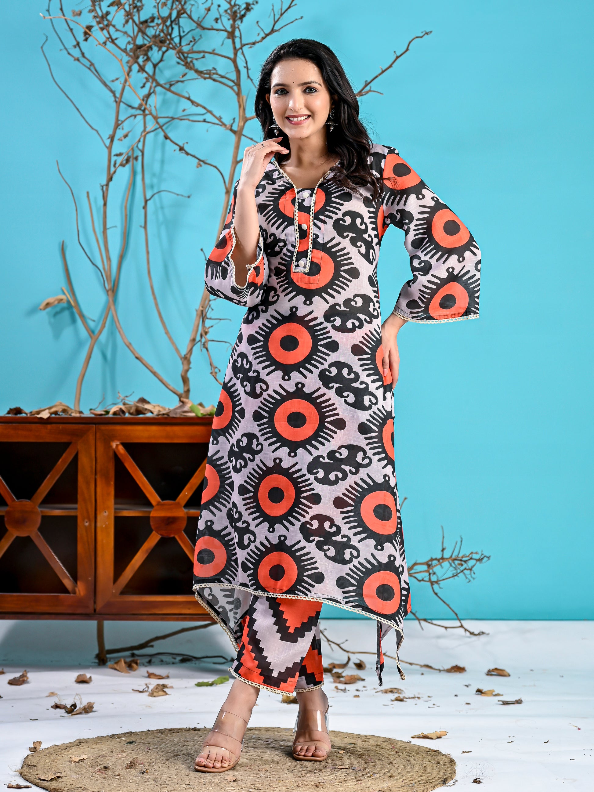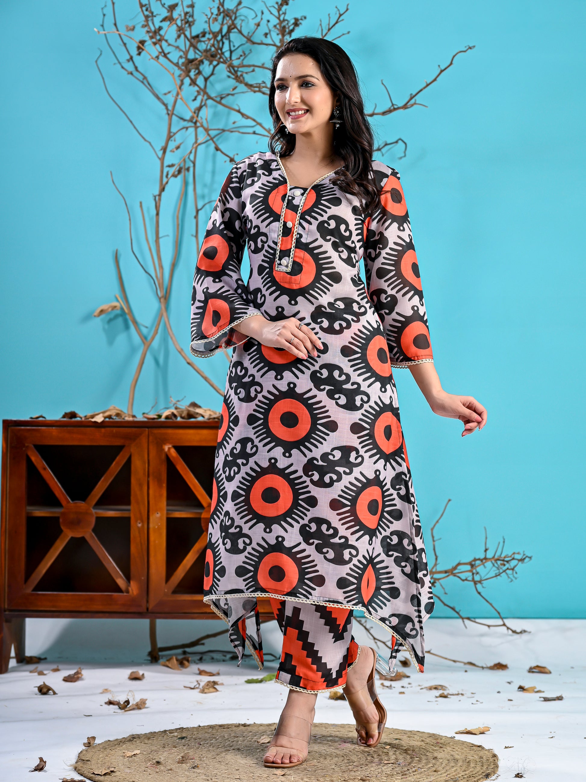 Embrace effortless elegance with this versatile orange kurta and pants set. The lace detailed neck kurta features chic 3/4th bell sleeves and elegant fish cut.This standout piece is adorned with lace accents along the neckline, sleeves, and hem, with pockets adding a touch of sophistication. Paired with straight printed pants, embellished with delicate lace detailing at the hemline, and offering both comfort and style