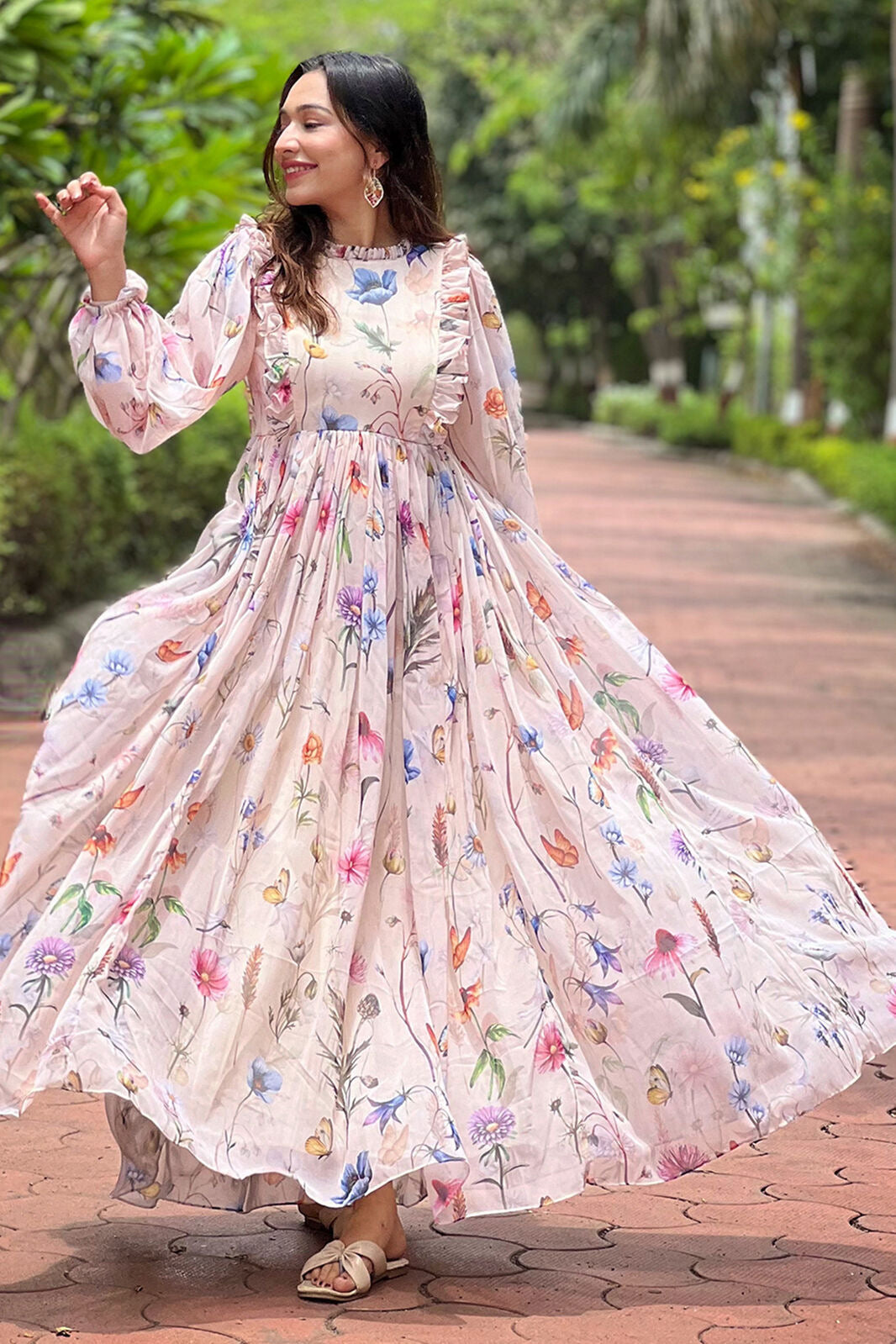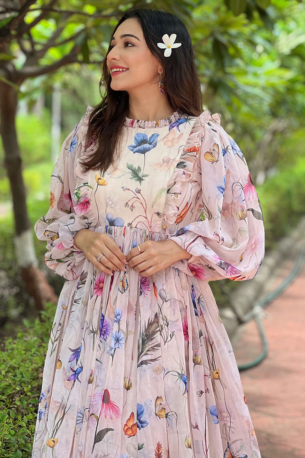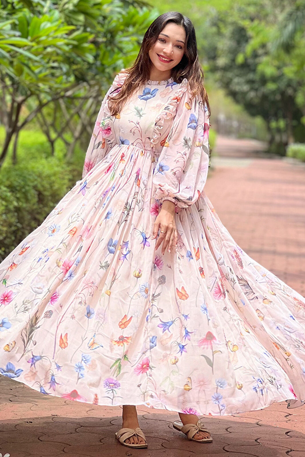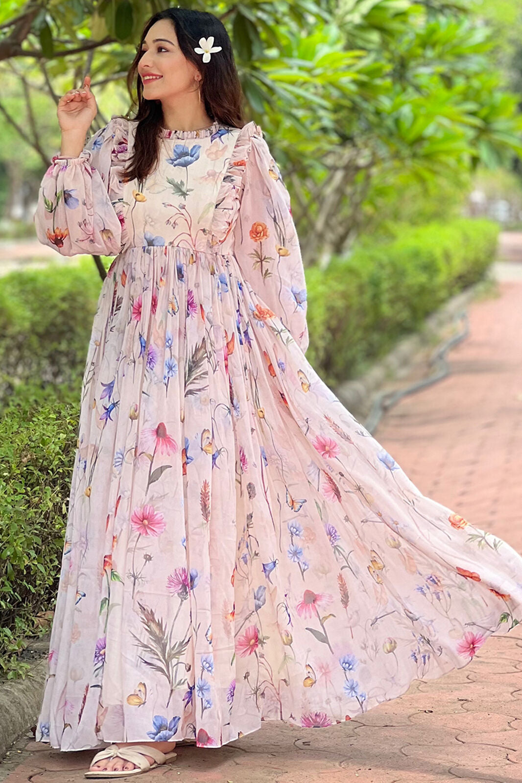 Crafted from high-quality Georgette, this garment boasts a lightweight and sheer texture. The floral patterns are meticulously printed, enhancing the overall aesthetic of the garment. Featuring balloon long sleeves, this design provides a voluminous and dramatic silhouette. The boat neck is elegantly designed with pleated work. The garment includes an open back zip, ensuring a seamless and snug fit. For added comfort and support, the garment is padded. The garment offers a luxurious and flowing look. Making it ideal for any special occasion. (Back Zip Open)