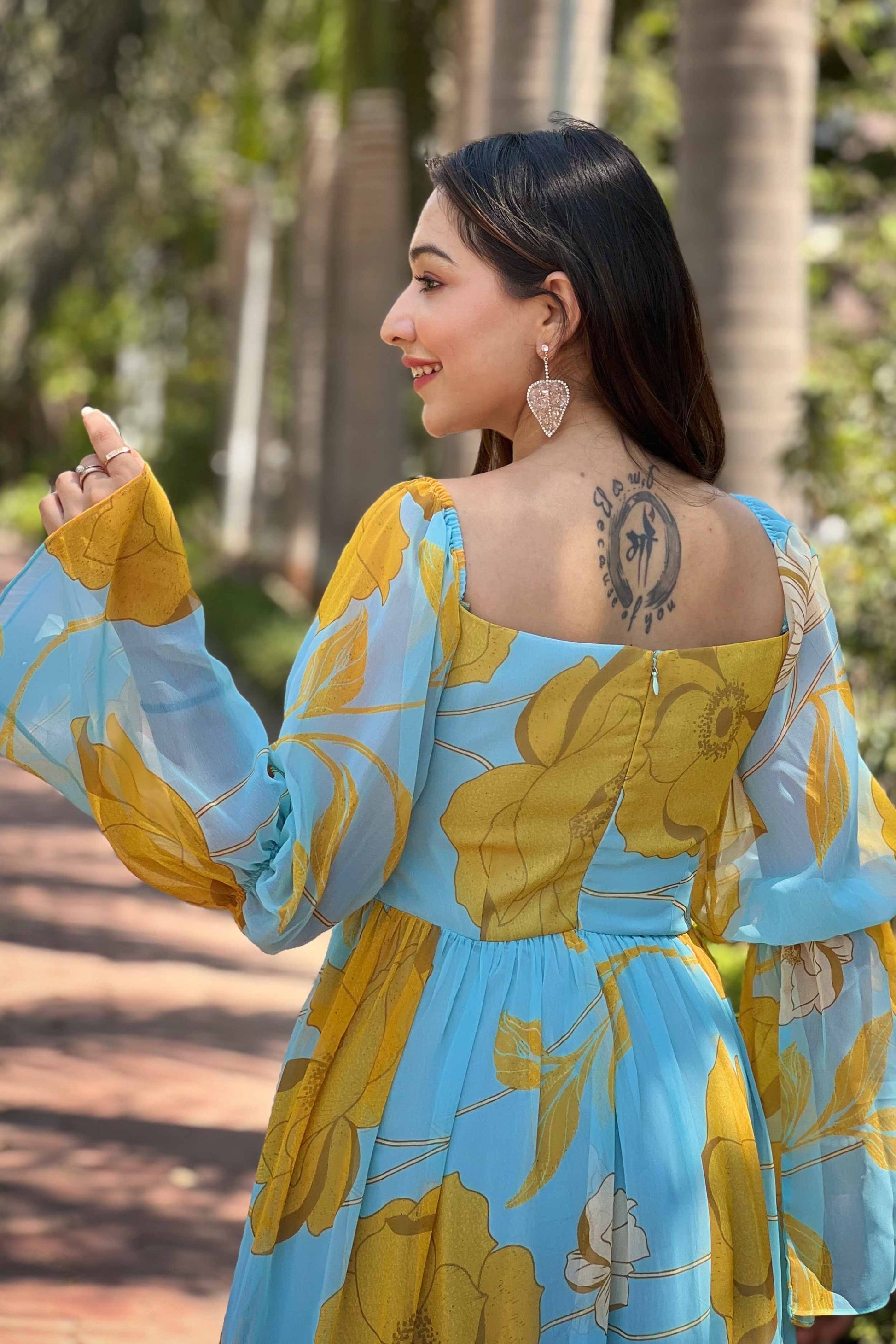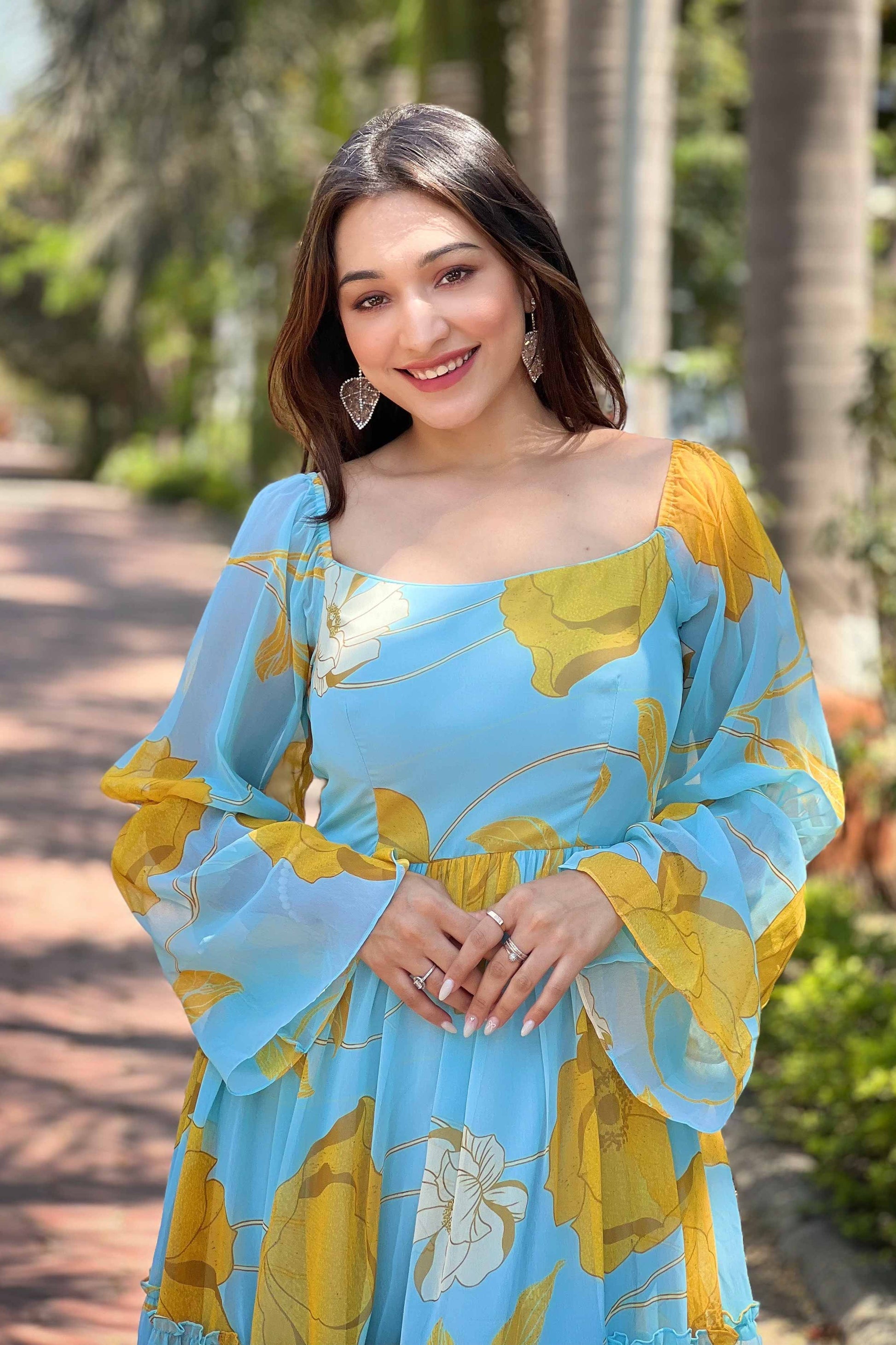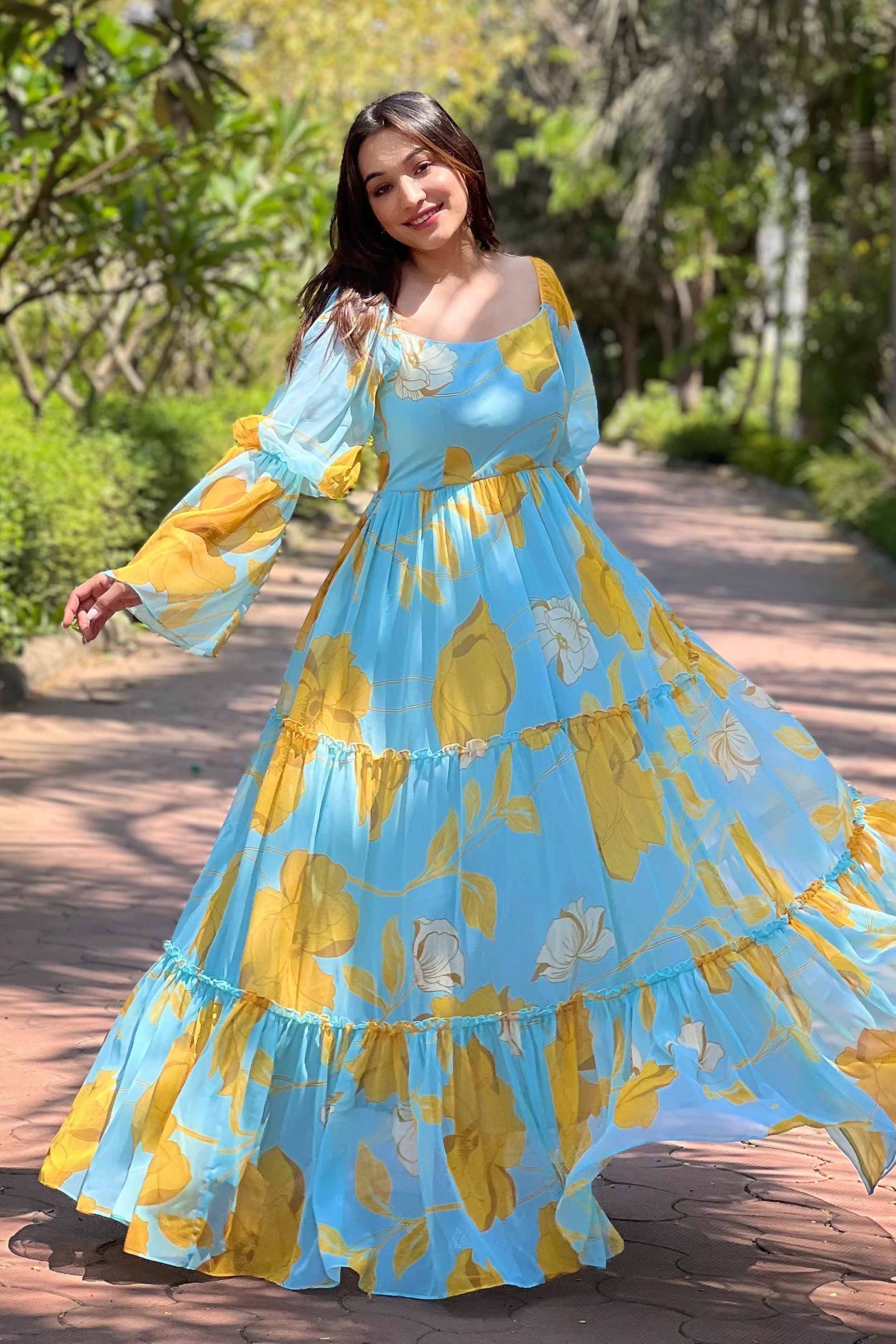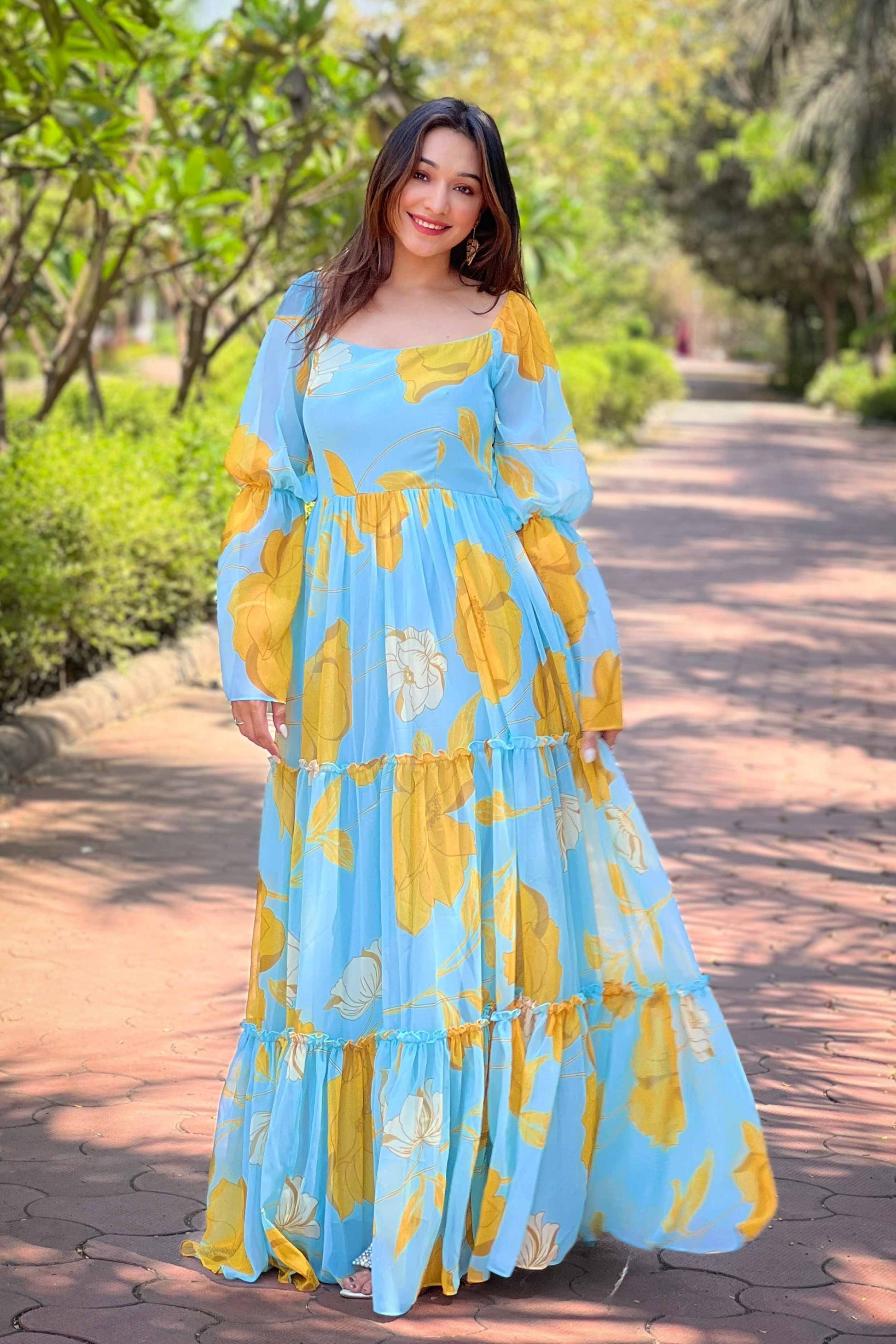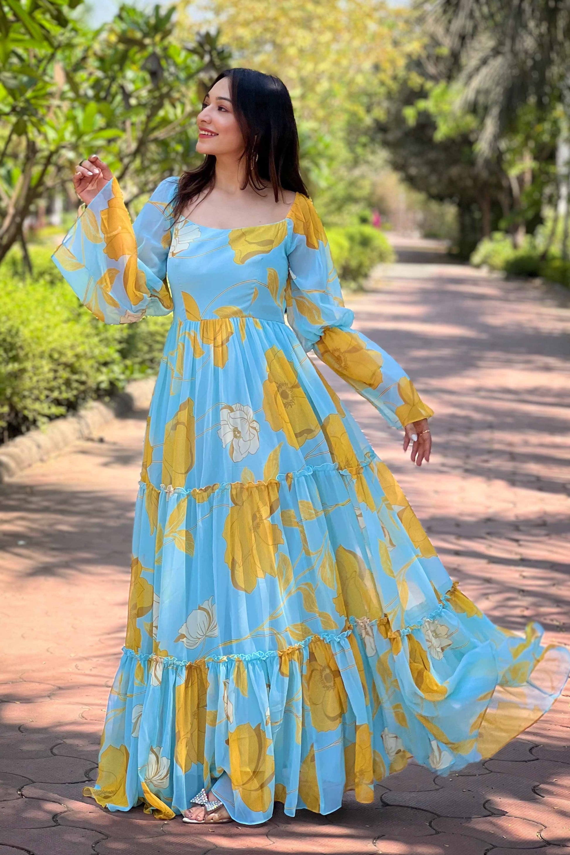 Never say no to this gorgeous new party-wear dress! This glamorous Aqua Blue Georgette dress is a must-have for your wardrobe. Don't miss out on the stunning full sleeves that add a touch of elegance to the ensemble.
