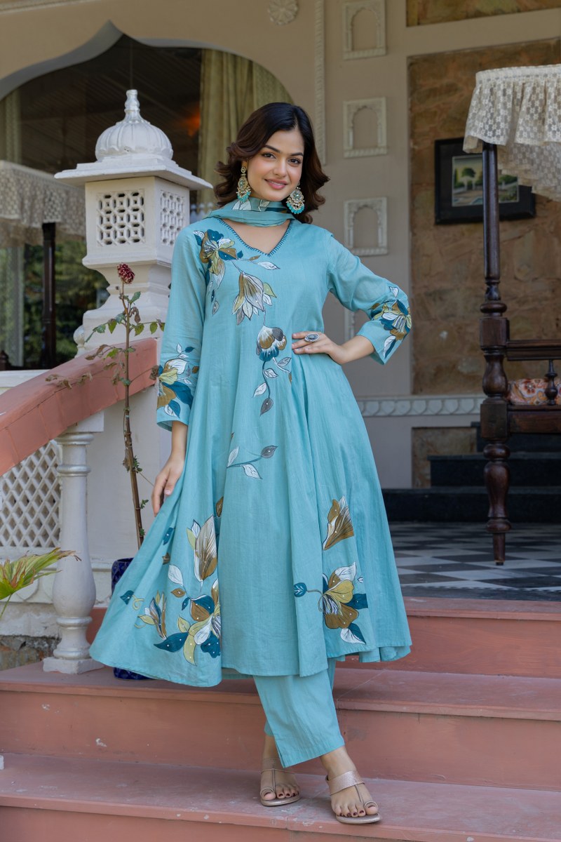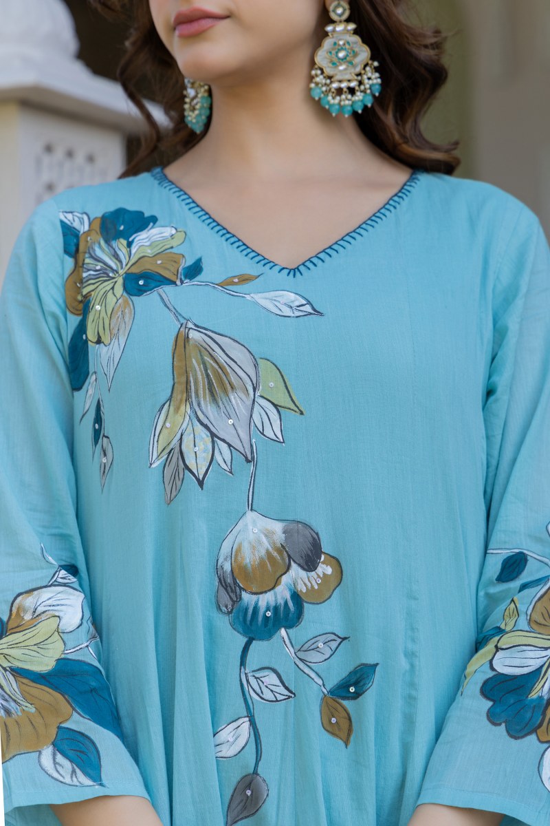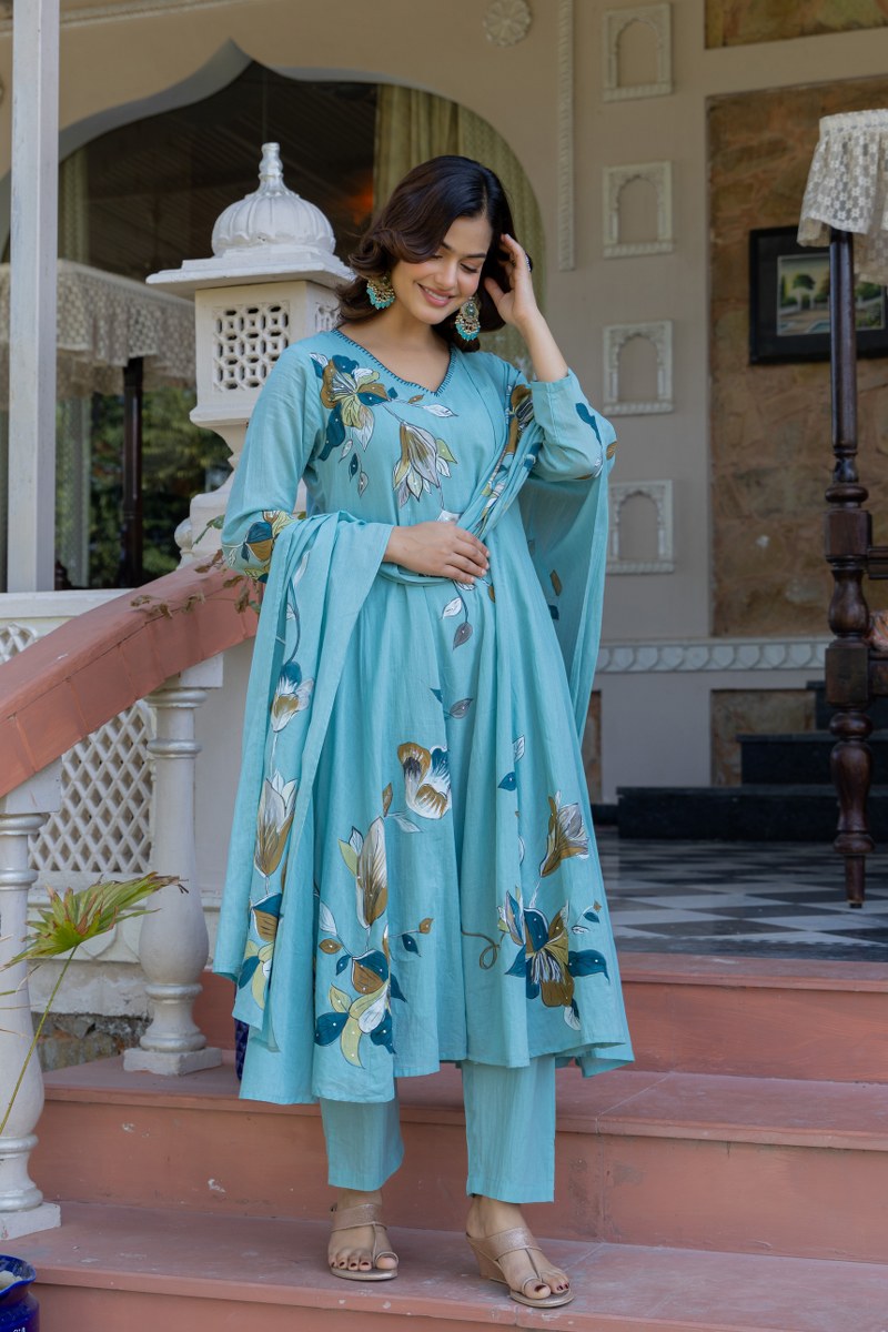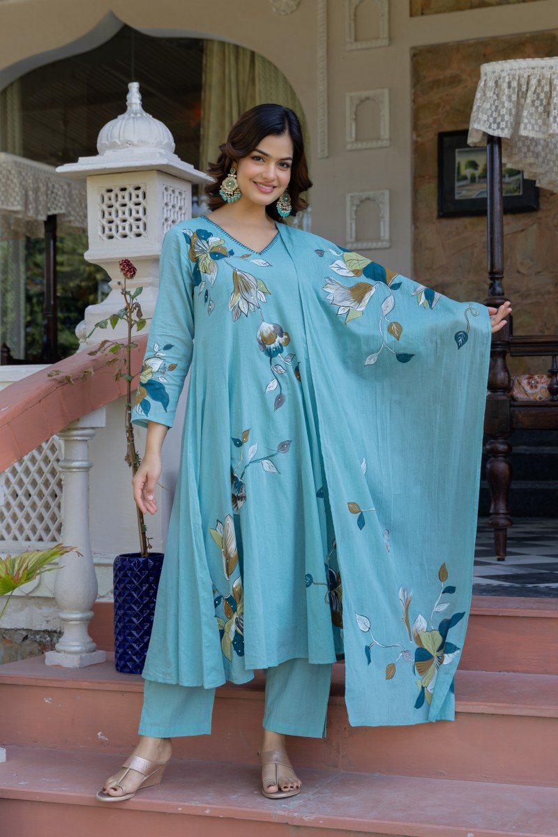 This stunning three-piece suit set features a soft Pure Mul Cotton fabric adorned with a mix of handpaint & sequence highlighted embroidery, with additional handwork detailing on the dress for a touch of elegance.It’s paired with a beautifully printed soft Dupatta, adding a graceful flow to the ensemble. To complete the look, the set includes soft mul cotton pants, providing both comfort and style.
