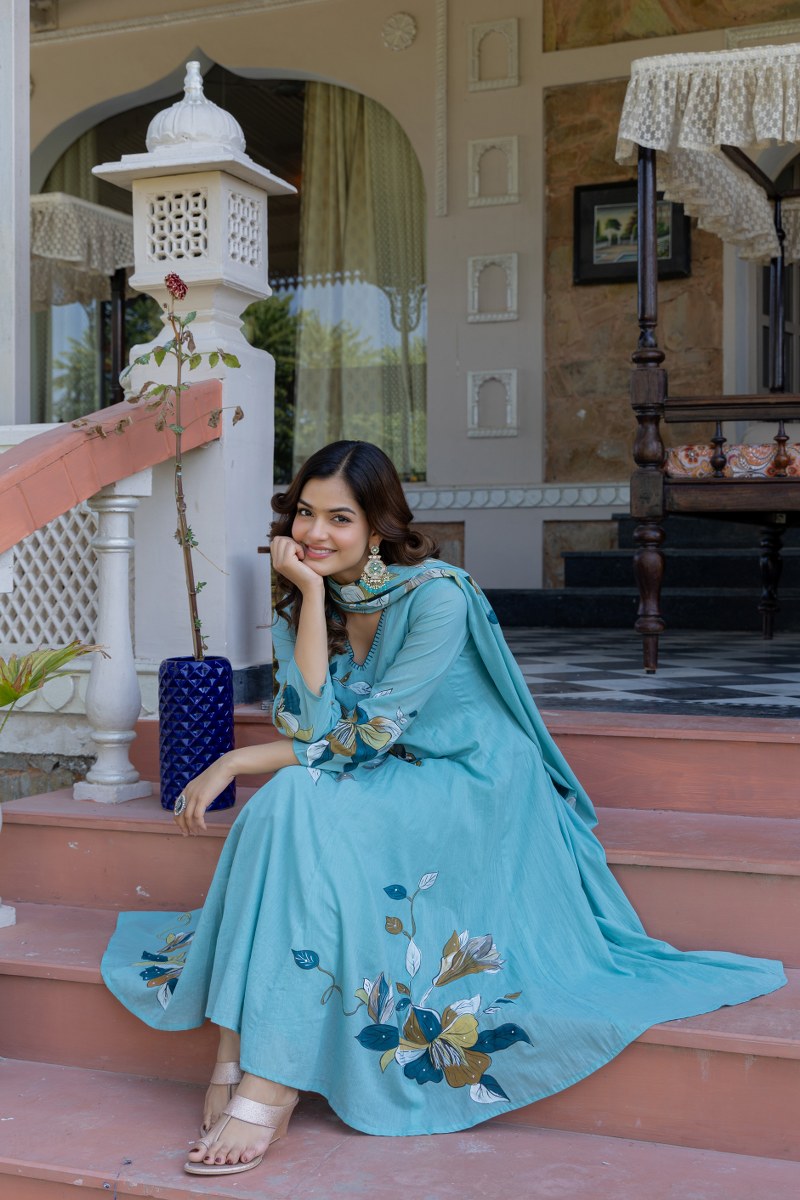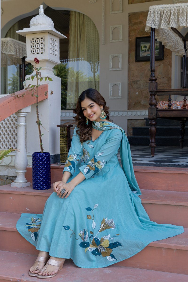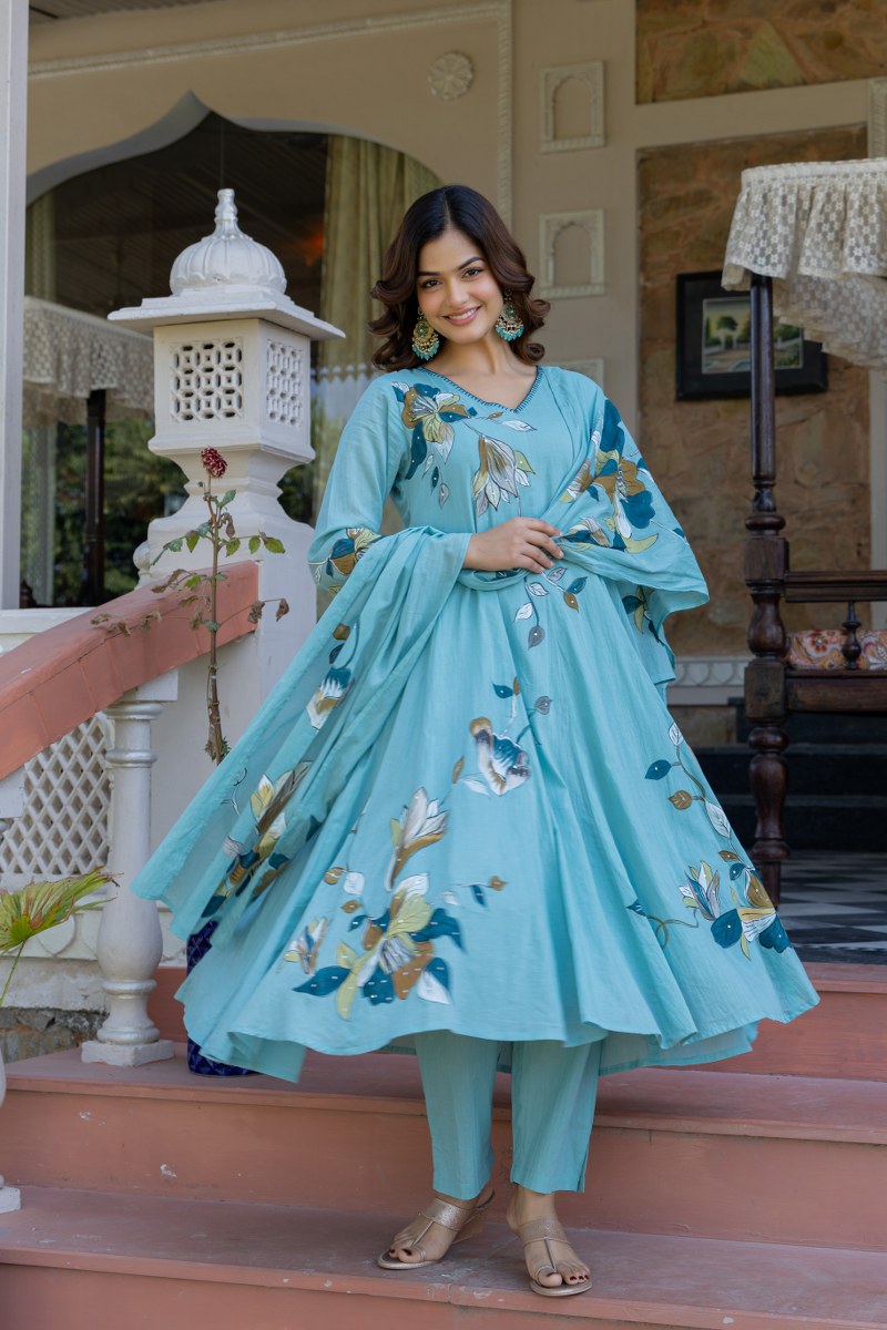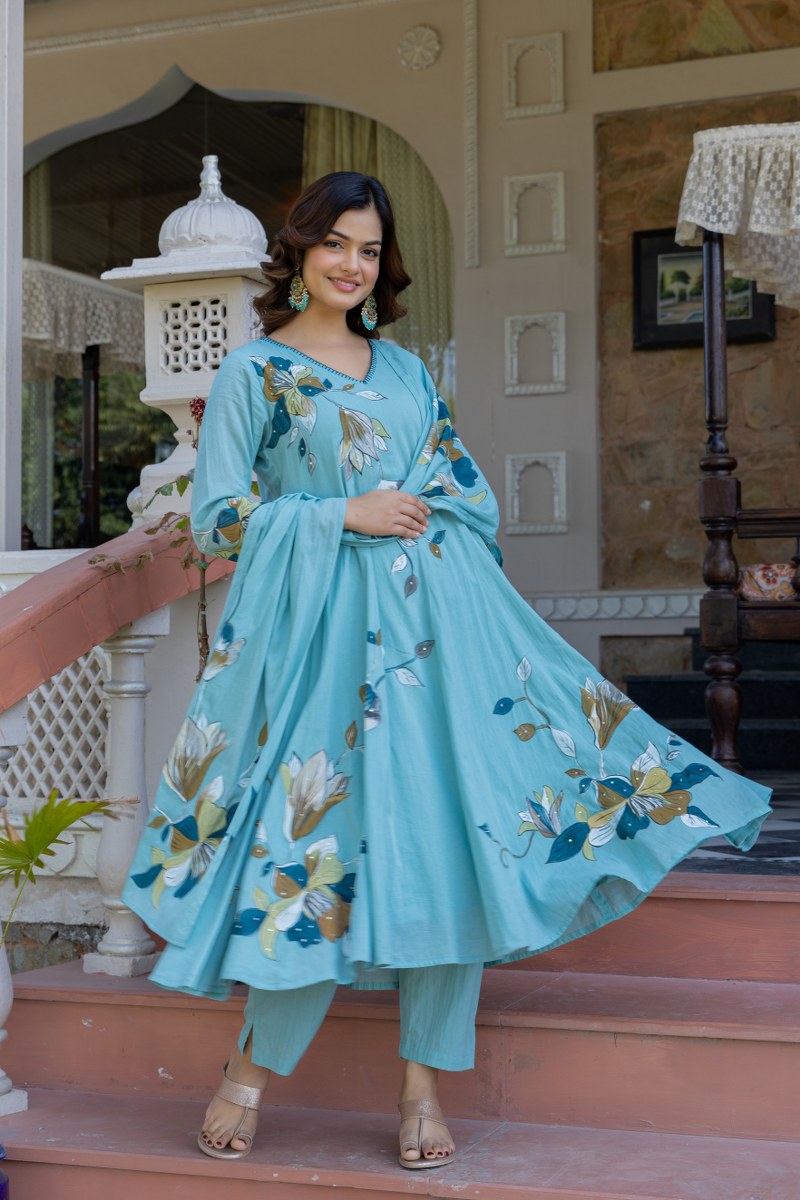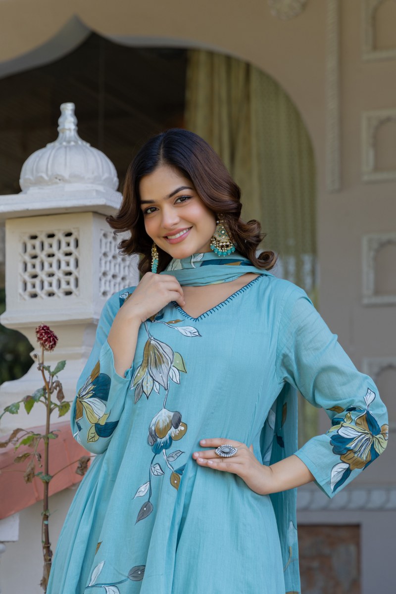 This stunning three-piece suit set features a soft Pure Mul Cotton fabric adorned with a mix of handpaint & sequence highlighted embroidery, with additional handwork detailing on the dress for a touch of elegance.It’s paired with a beautifully printed soft Dupatta, adding a graceful flow to the ensemble. To complete the look, the set includes soft mul cotton pants, providing both comfort and style.