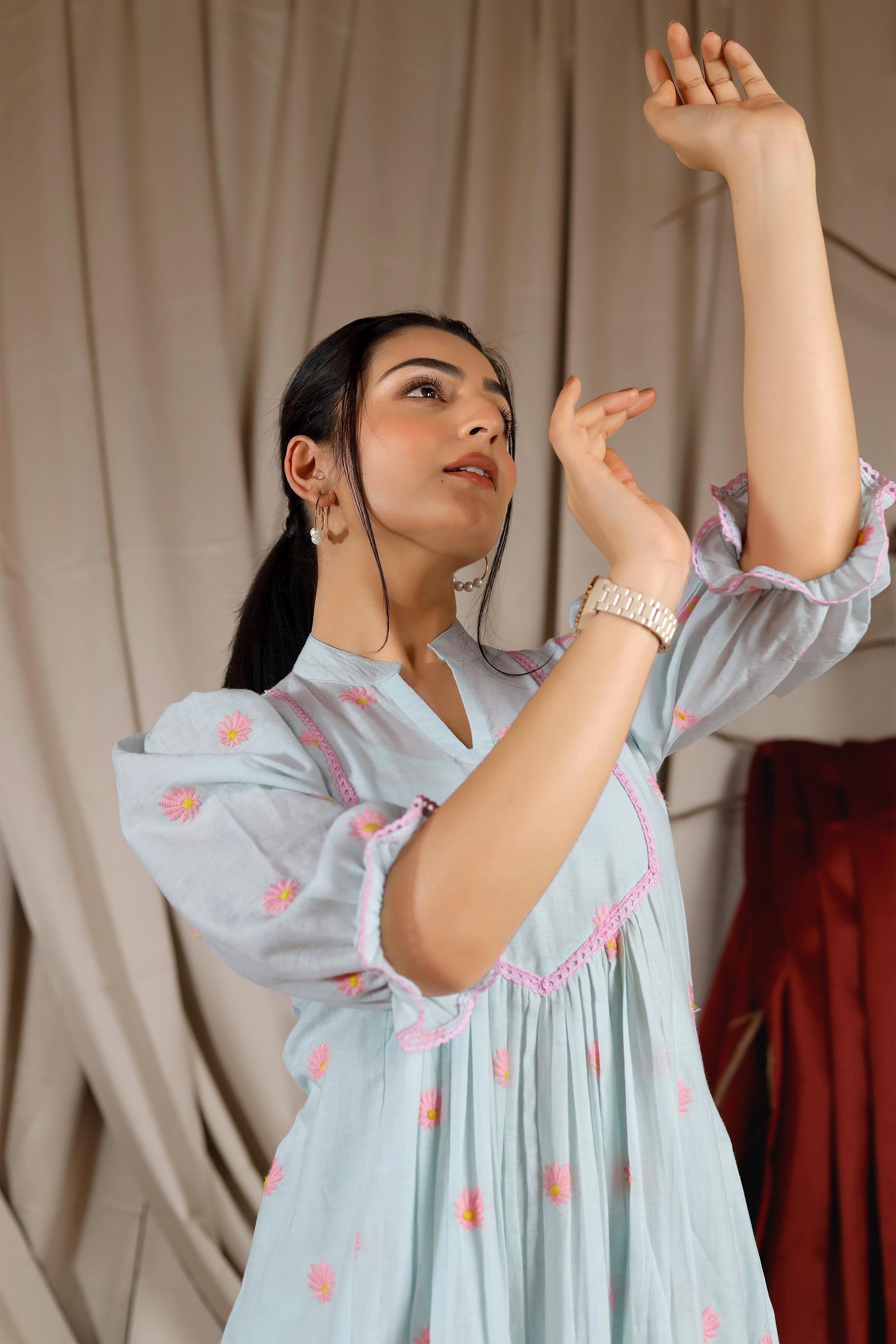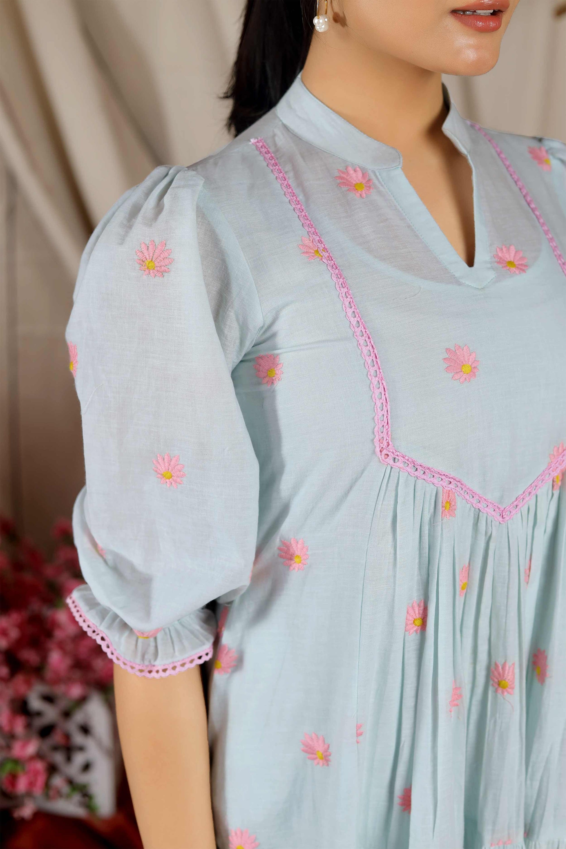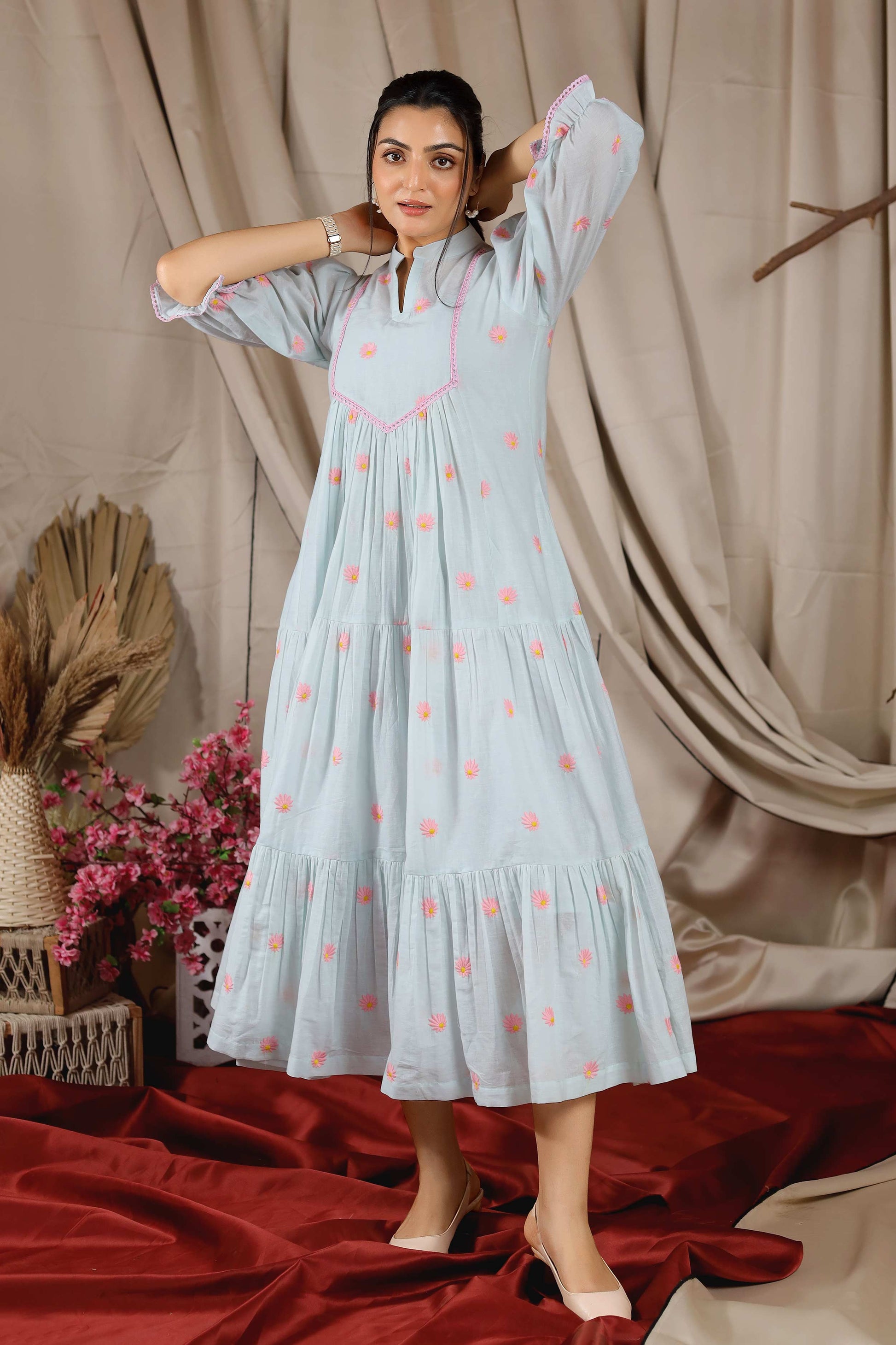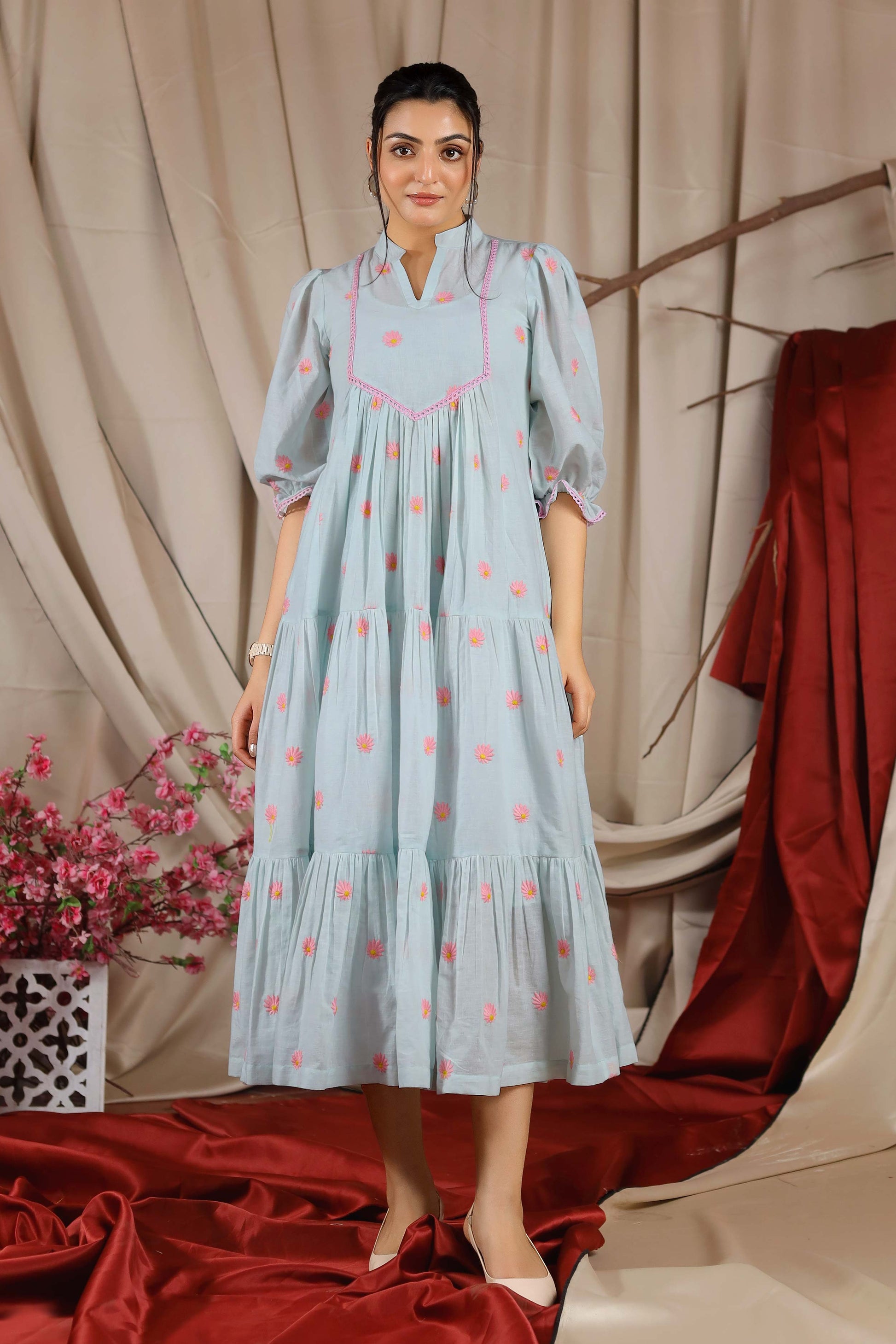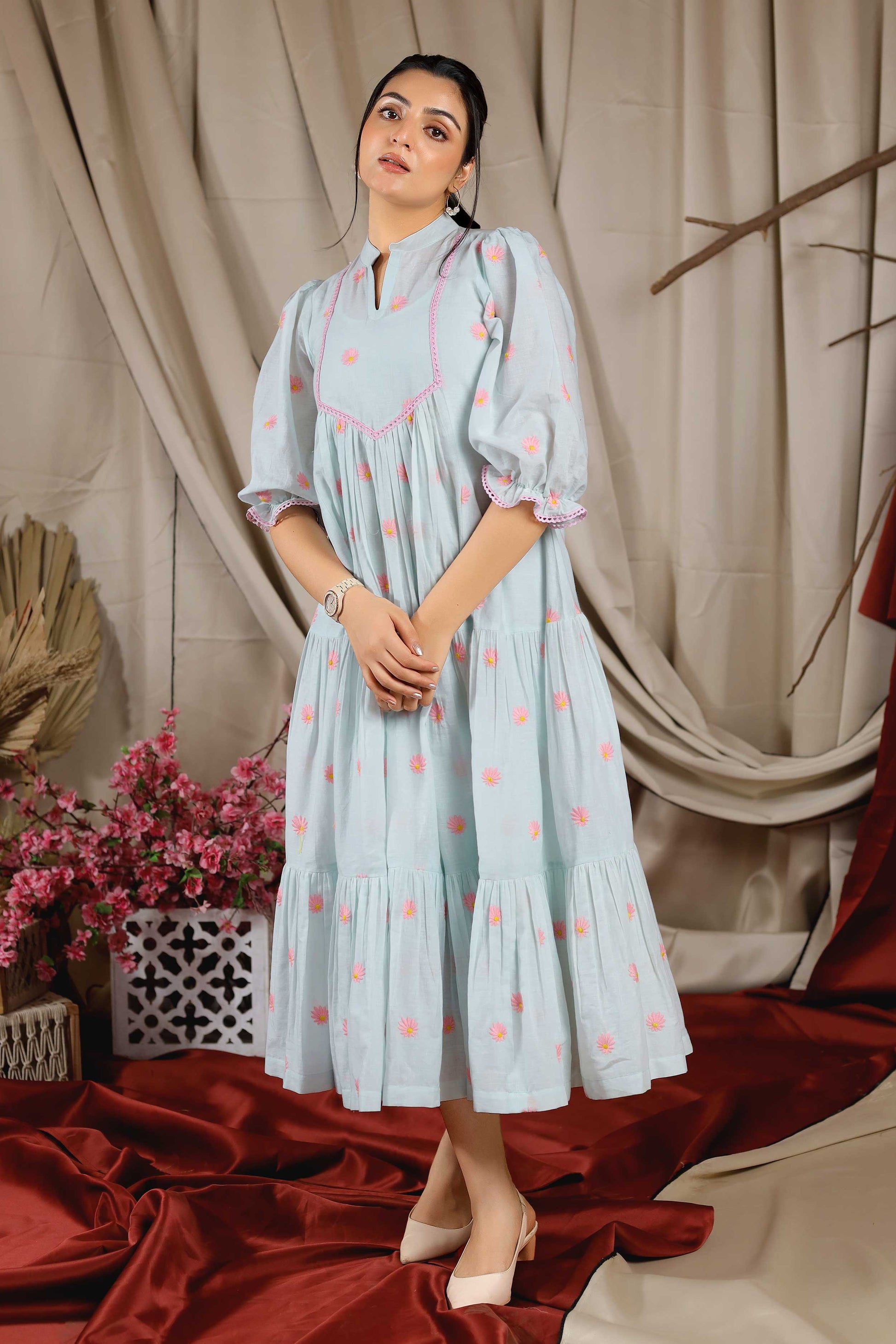 Perfect for all your casual brunch dates! This Camelia Summer Dress will add an edge of flair to your summer wardrobe. Crafted in pure cotton, it features a Chinese collar with a 3/4 puff sleeve and tired gathering. The charm of the dress lies in its Bullion-Knot motif embroidery.