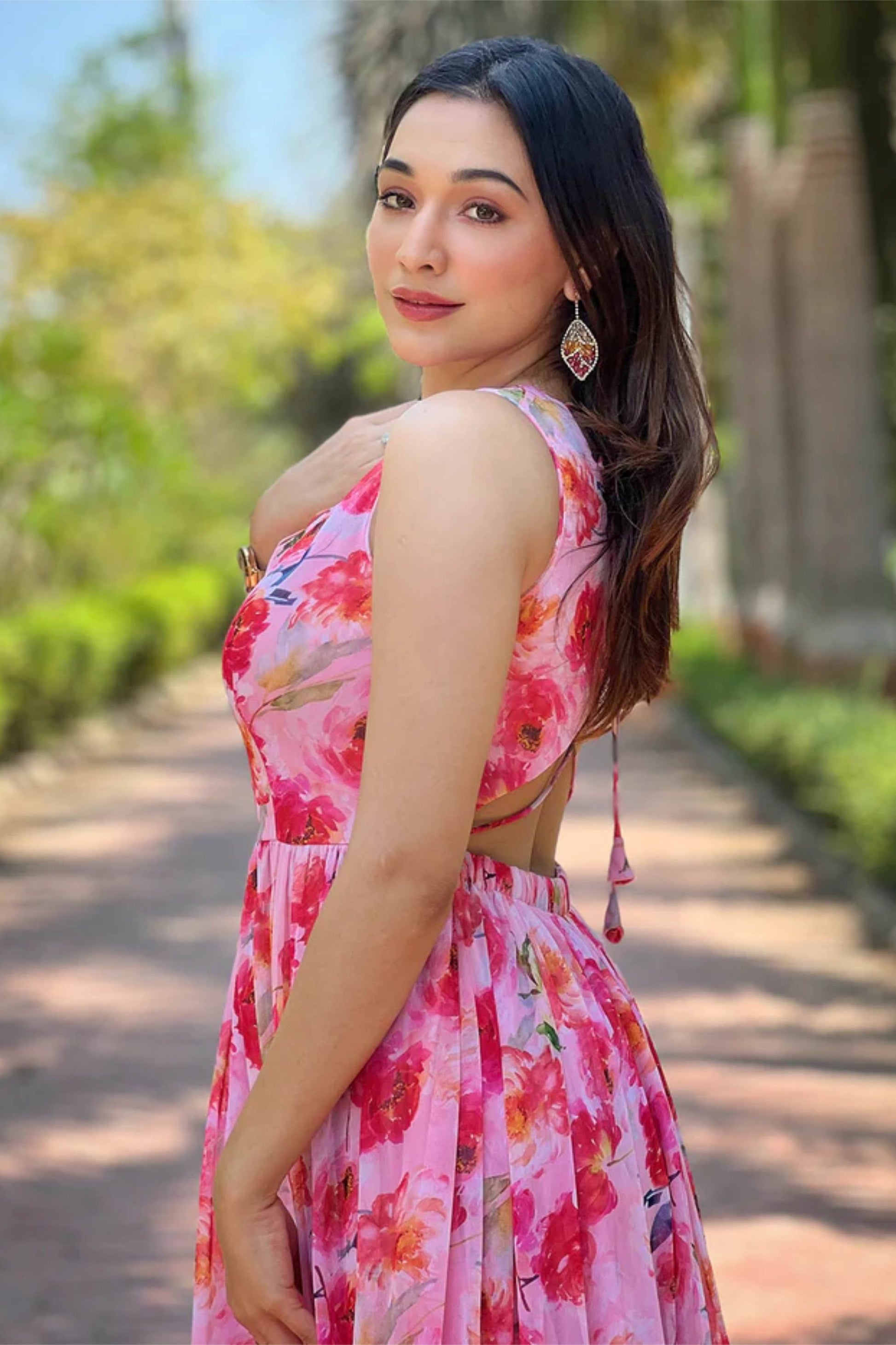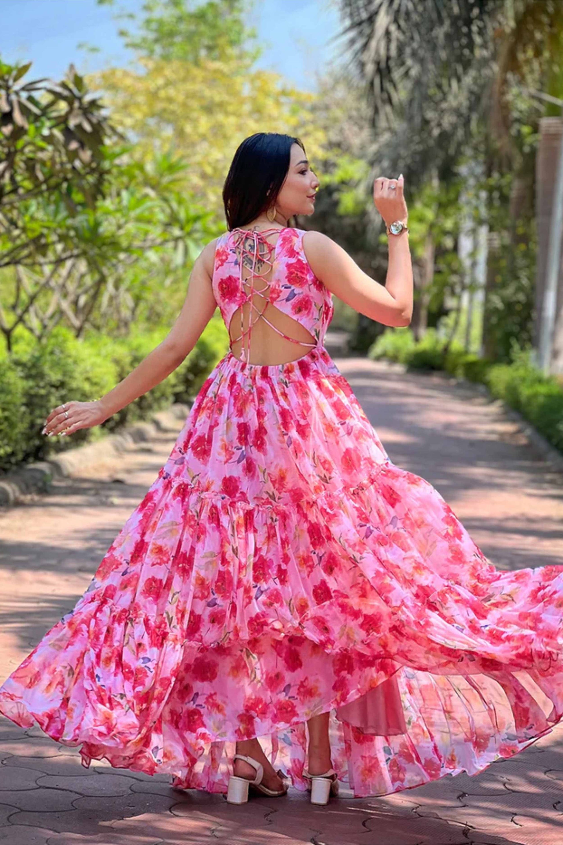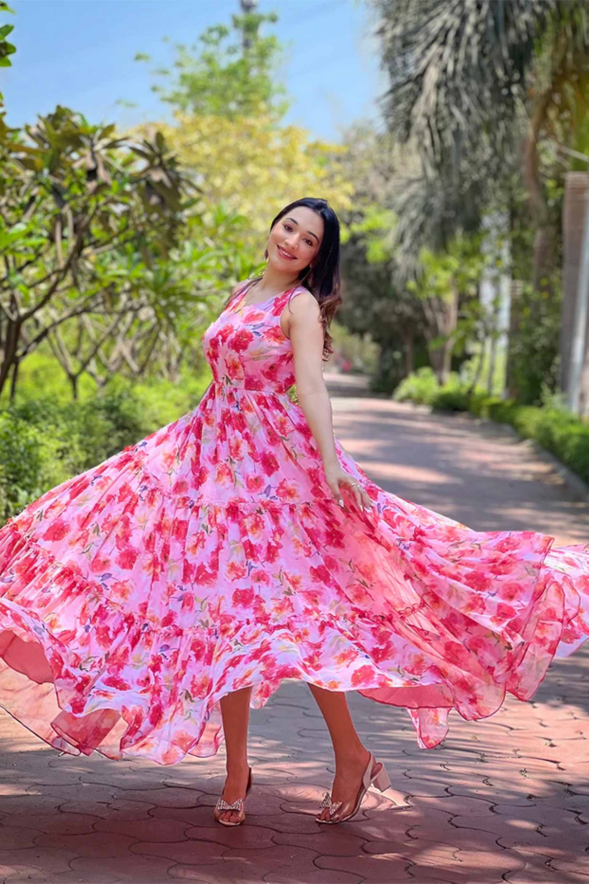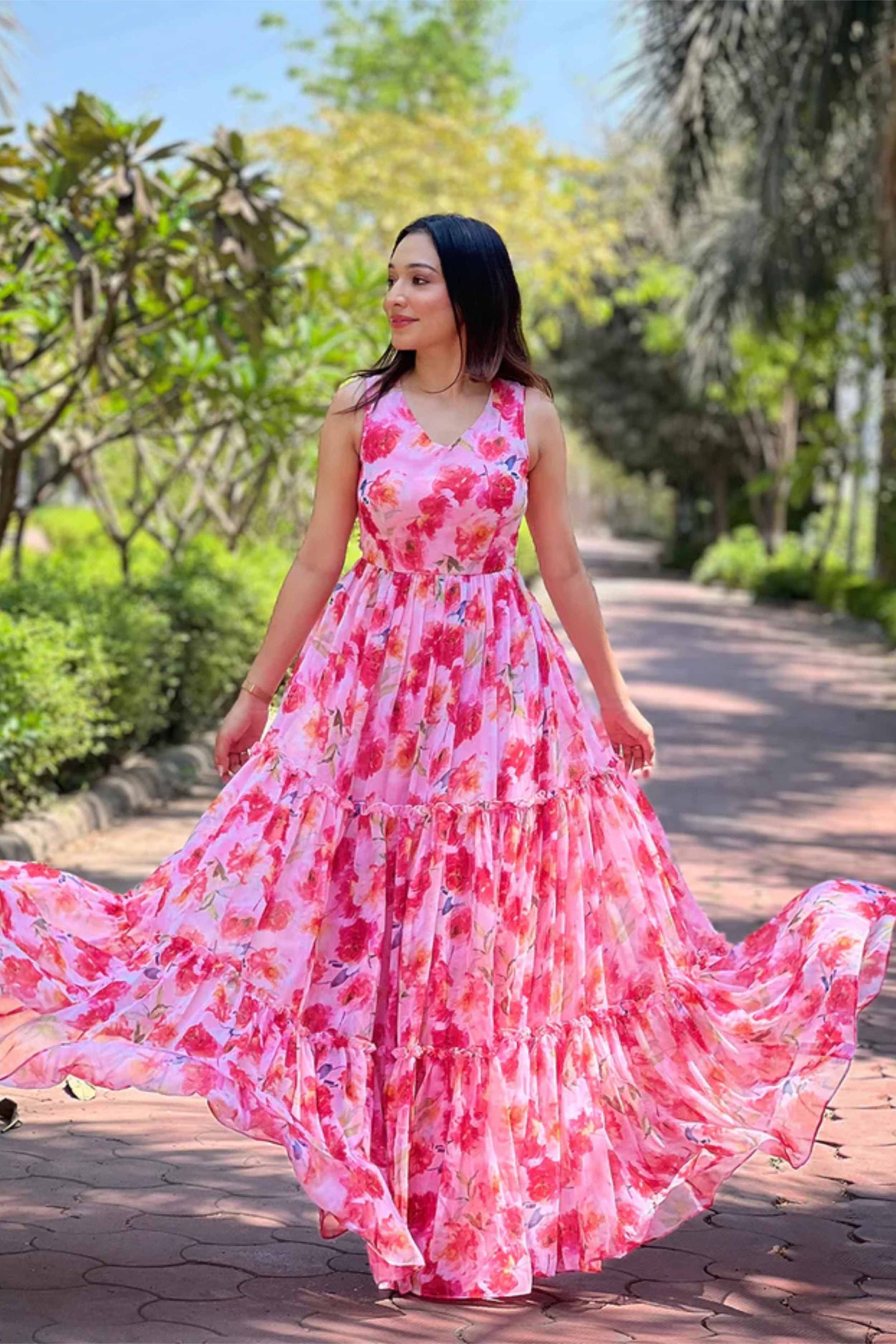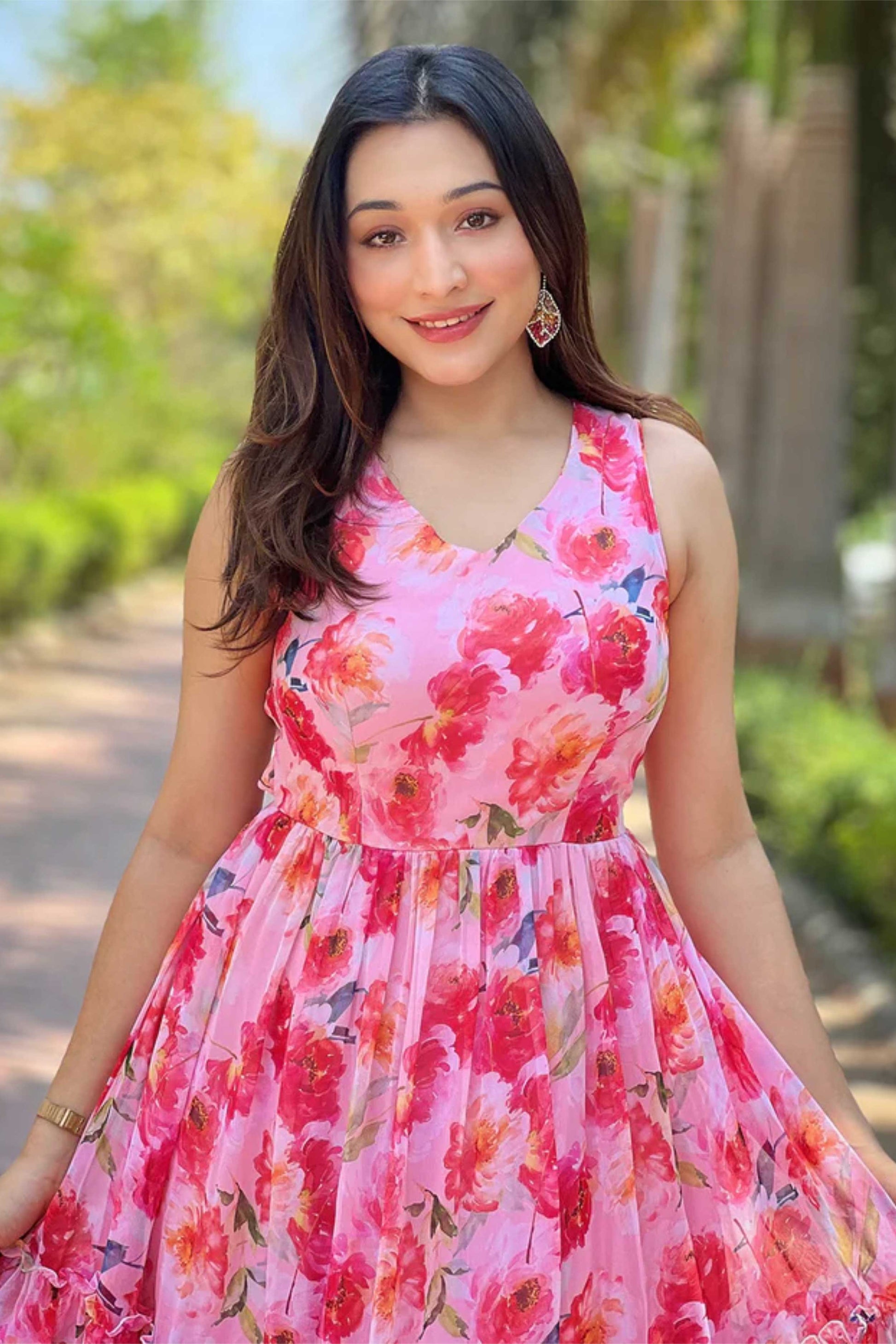 Celebrating the soothing shades of color, this soft pink georgette dress mesmerizes. With its beautiful appearance, exquisite detailing, and flattering flare, this outfit is an essential addition to any wardrobe. Pair it with stylish flats to complete the look.