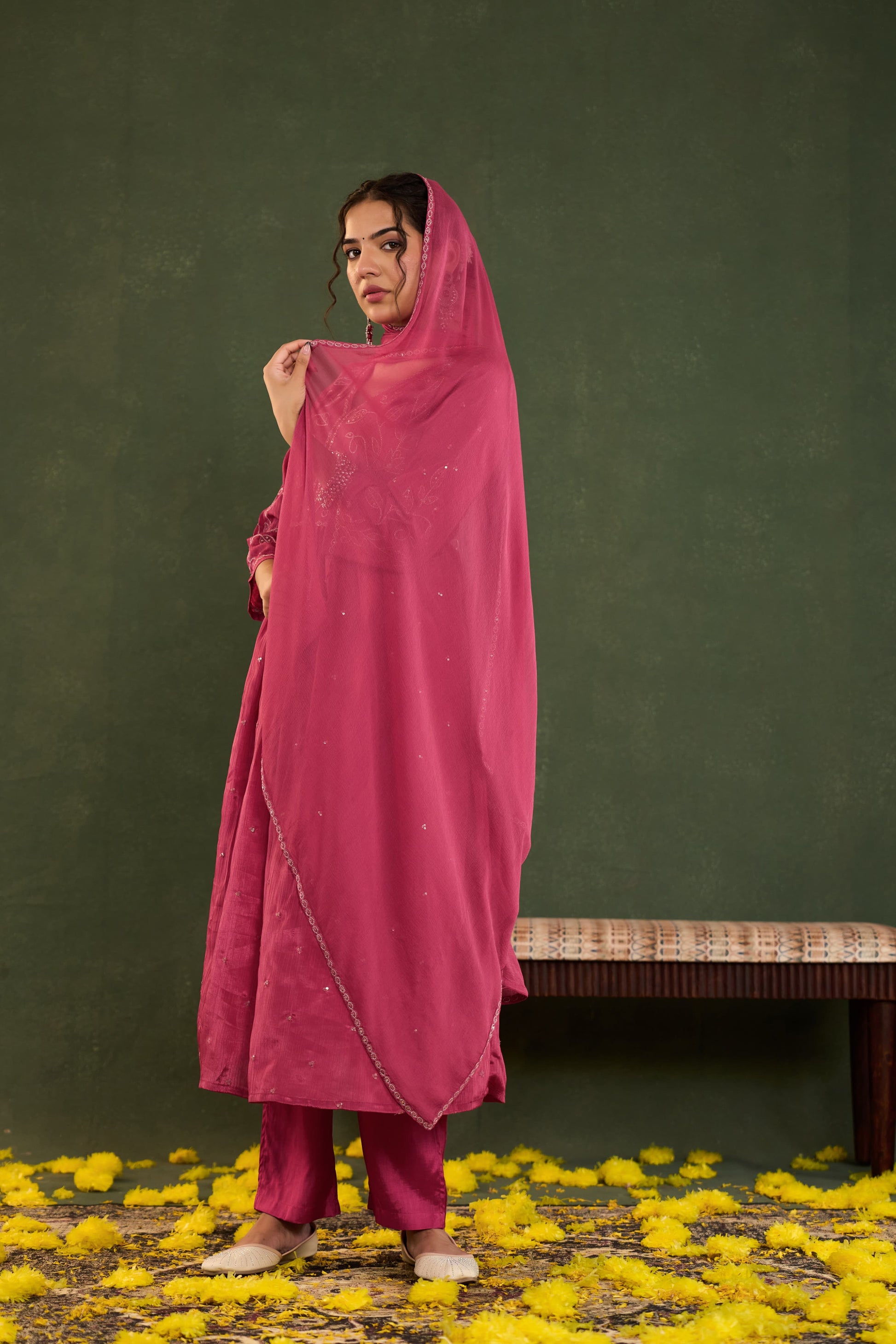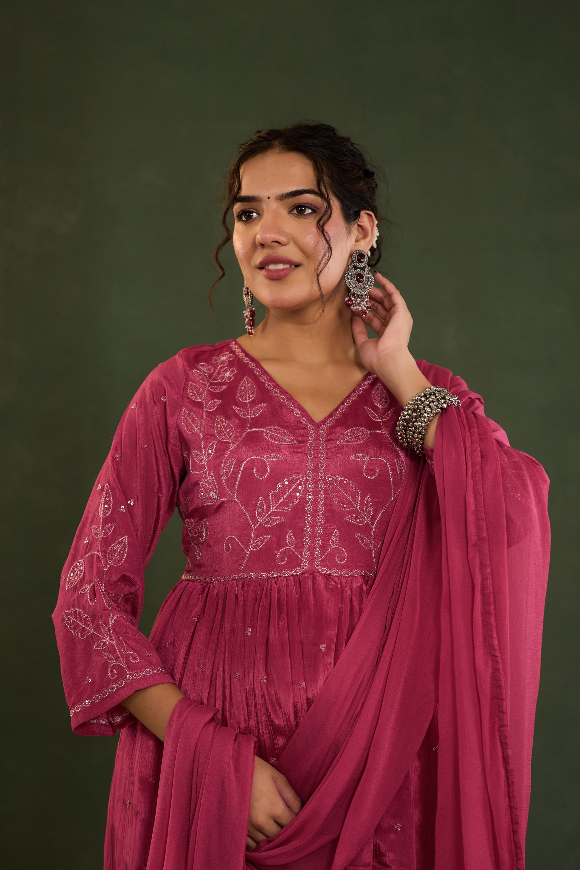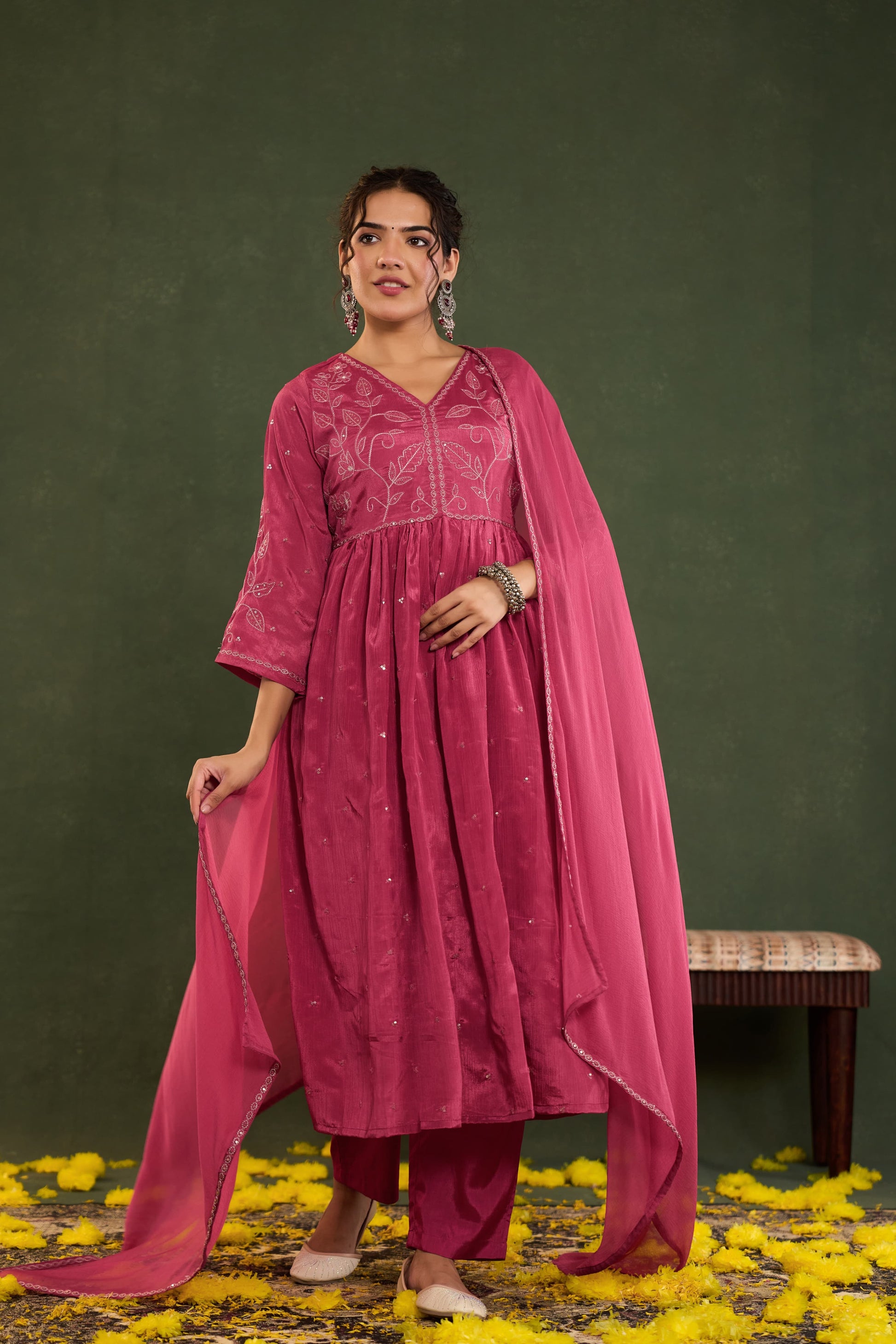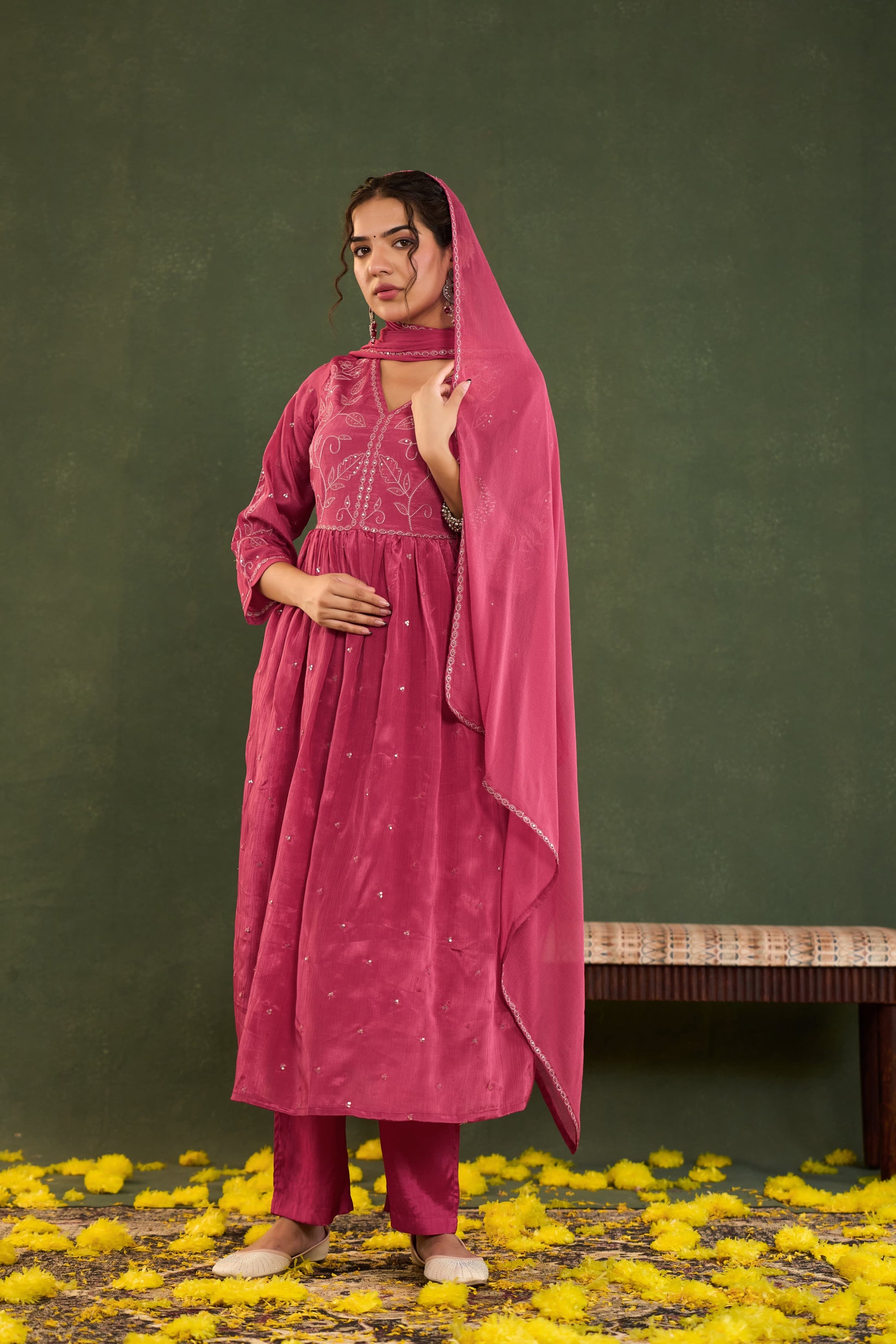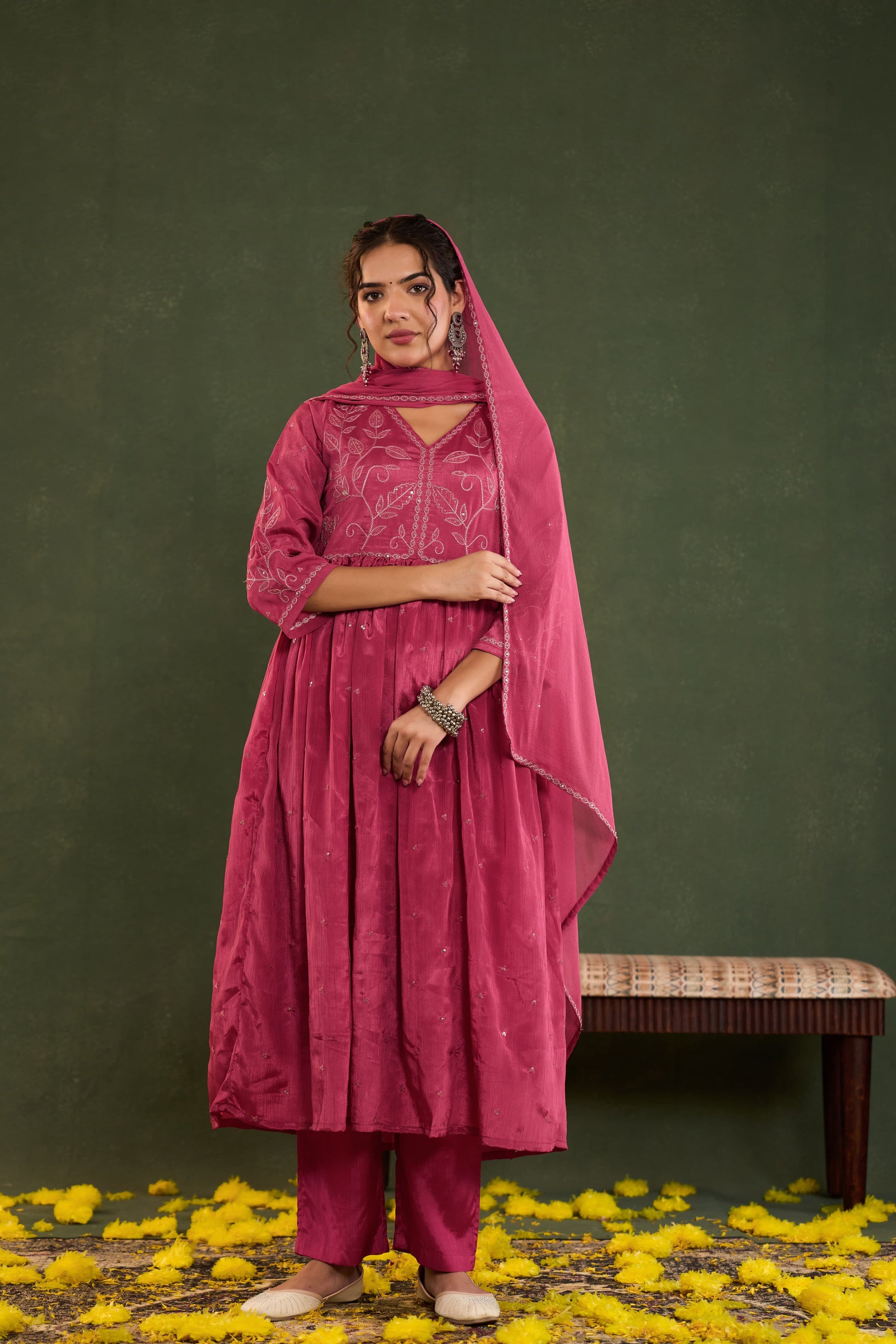 This elegant three-piece set features A line kurta in pure Chinnon fabric with delicate embroidery on the front. It’s paired with soft pants for all-day comfort and a beautiful dupatta to complete the look. Perfect for festive occasions, small gatherings, or a stylish day out.