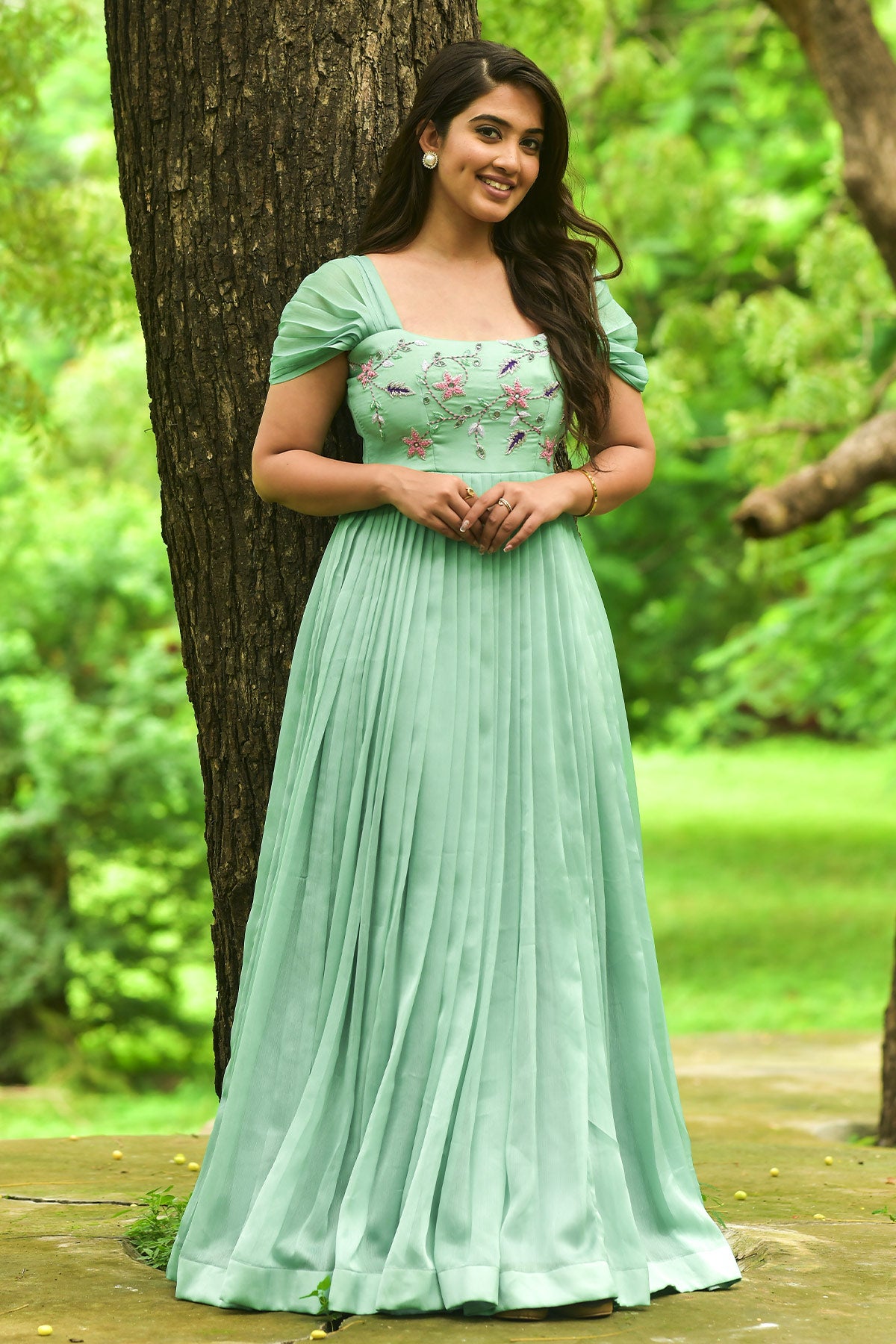 Add a touch of elegance to your wardrobe with our Cockatoo party wear gown. Impeccably designed with luxurious Chinon fabric, it showcases pleated short sleeves and intricate floral handwork embroidery on the yoke. This gown is your ticket to ruling the upcoming festivals with a dash of charm and a sprinkle of sophistication (This Dress Comes With Padded)