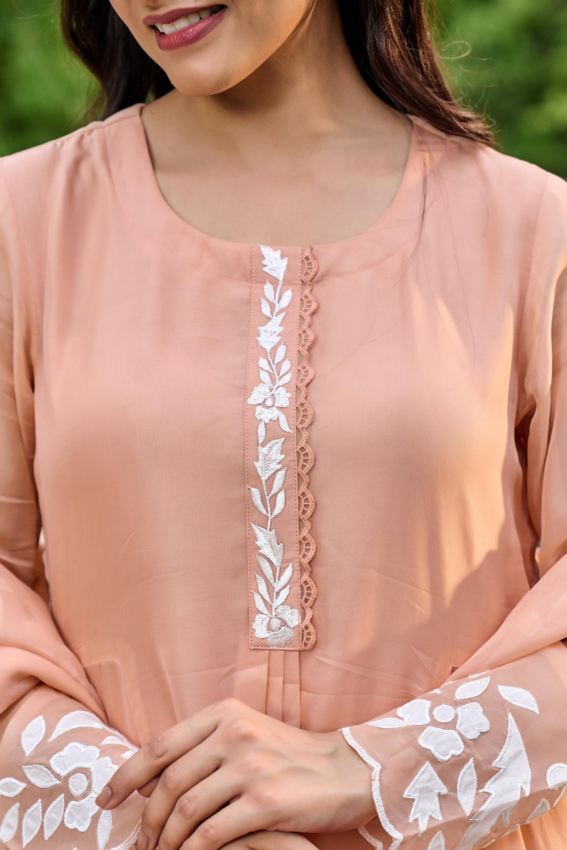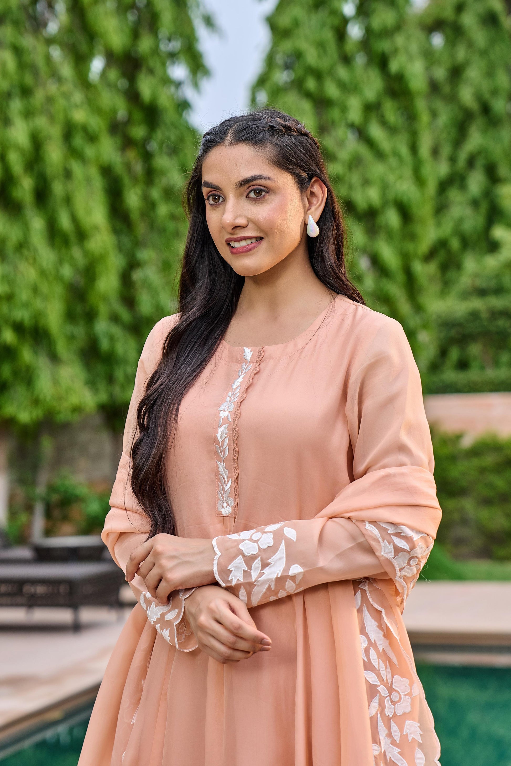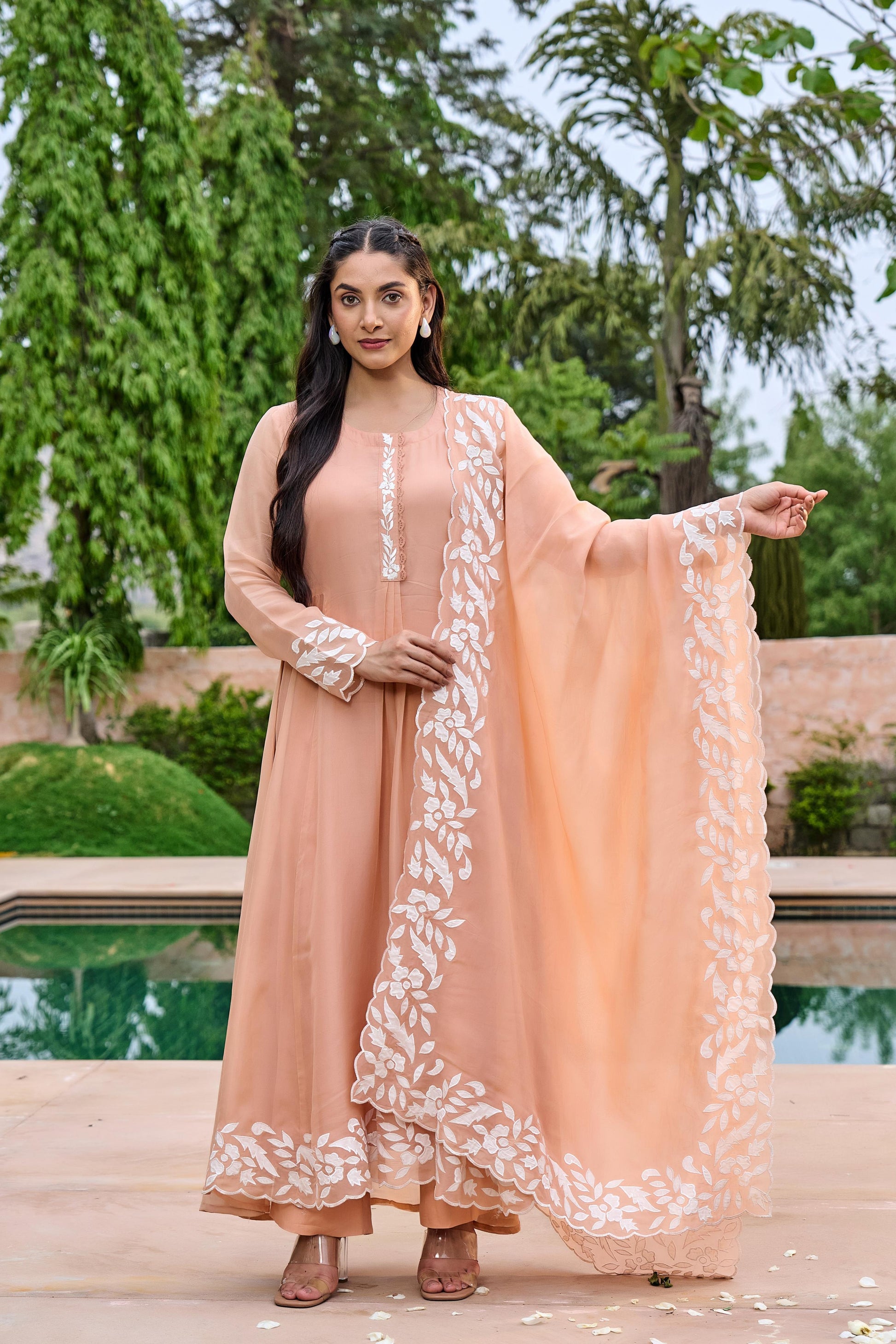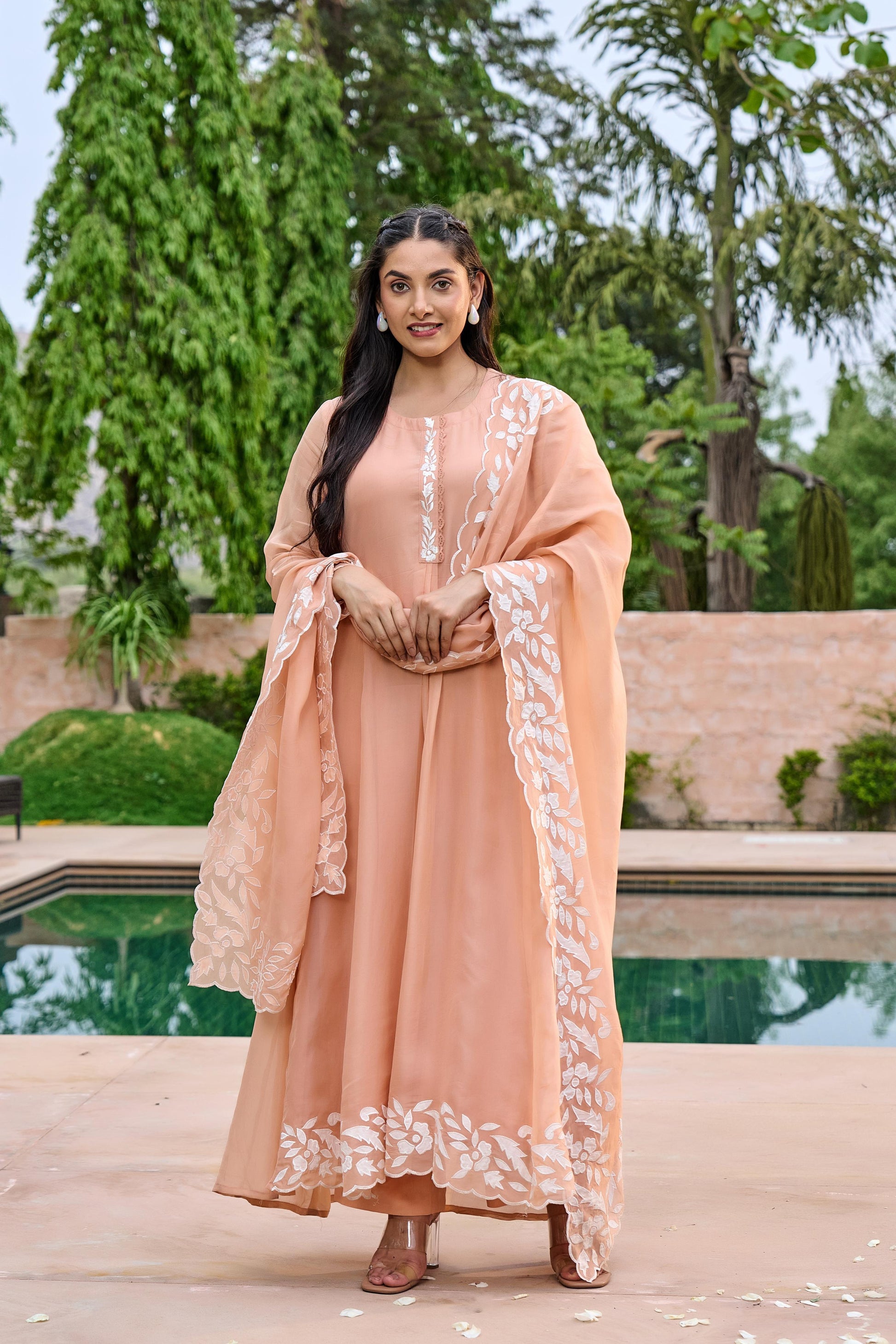 This three-piece suit set includes a pure mul Chanderi kurta with intricate embroidery on the neckline, ghera, and delicate applique work. It is paired with a fully embroidered organza dupatta and comfortable Shantoon pants to complete the look. Perfect for festive occasions and celebrations.