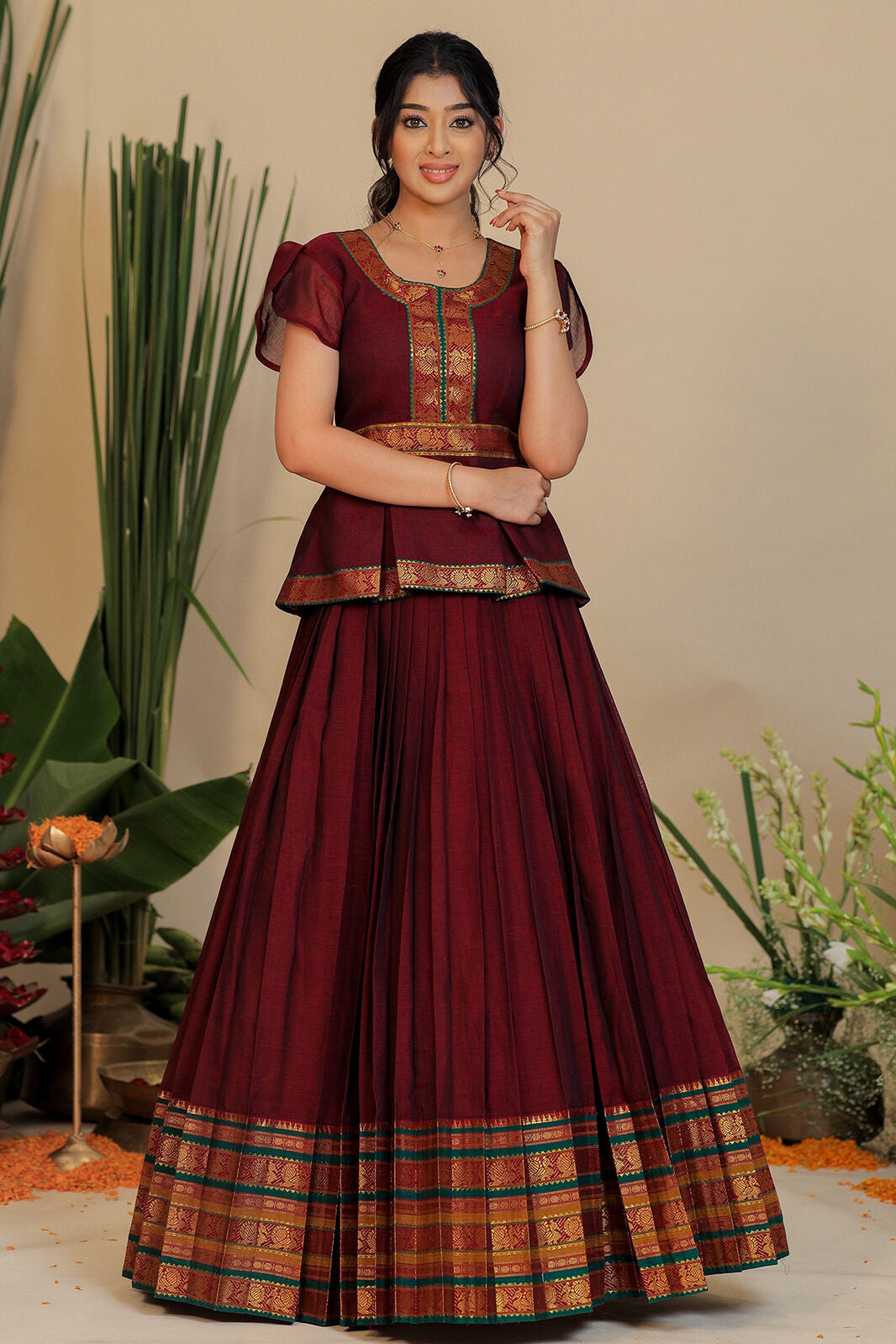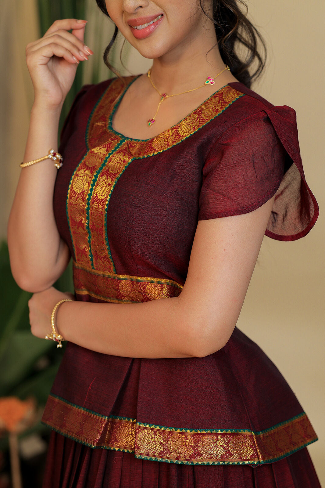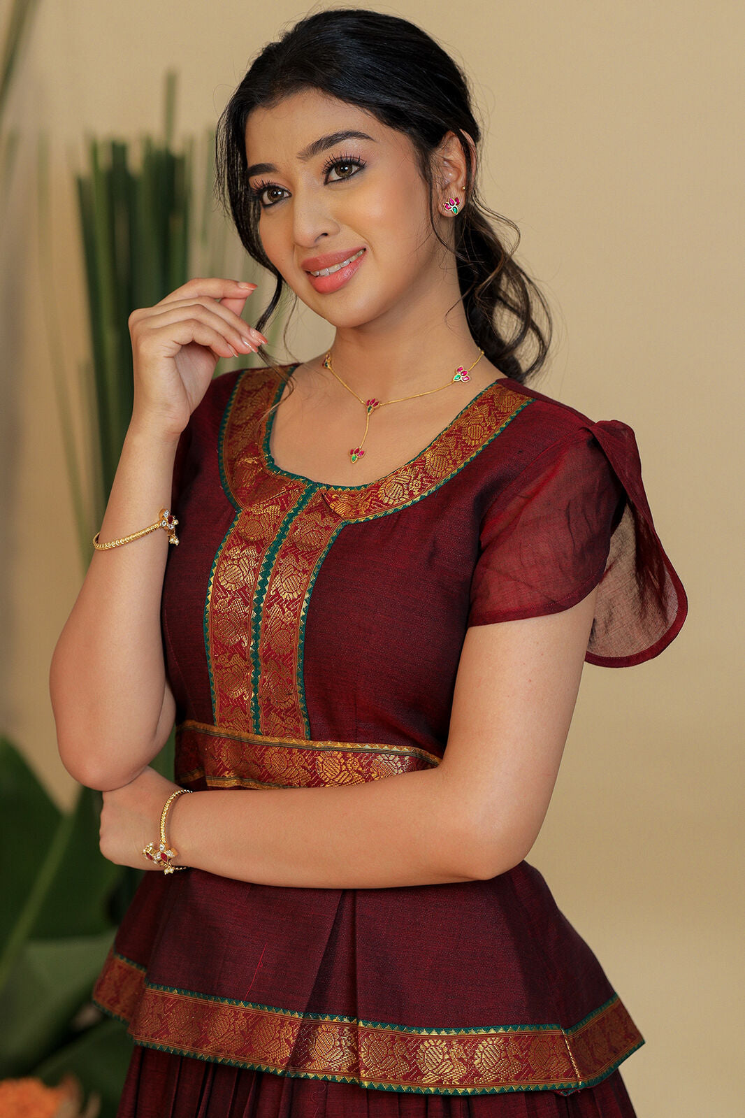 Match with your bestie; we have another bright color like you. This Maroon two-piece handloom lehenga set includes a contemporary peplum top with petal-overlapping sleeves and a back opening paired with a matching lehenga. Both pieces are adorned with delicate elephant pattu designs, perfectly blending the best of modern and traditional aesthetics.