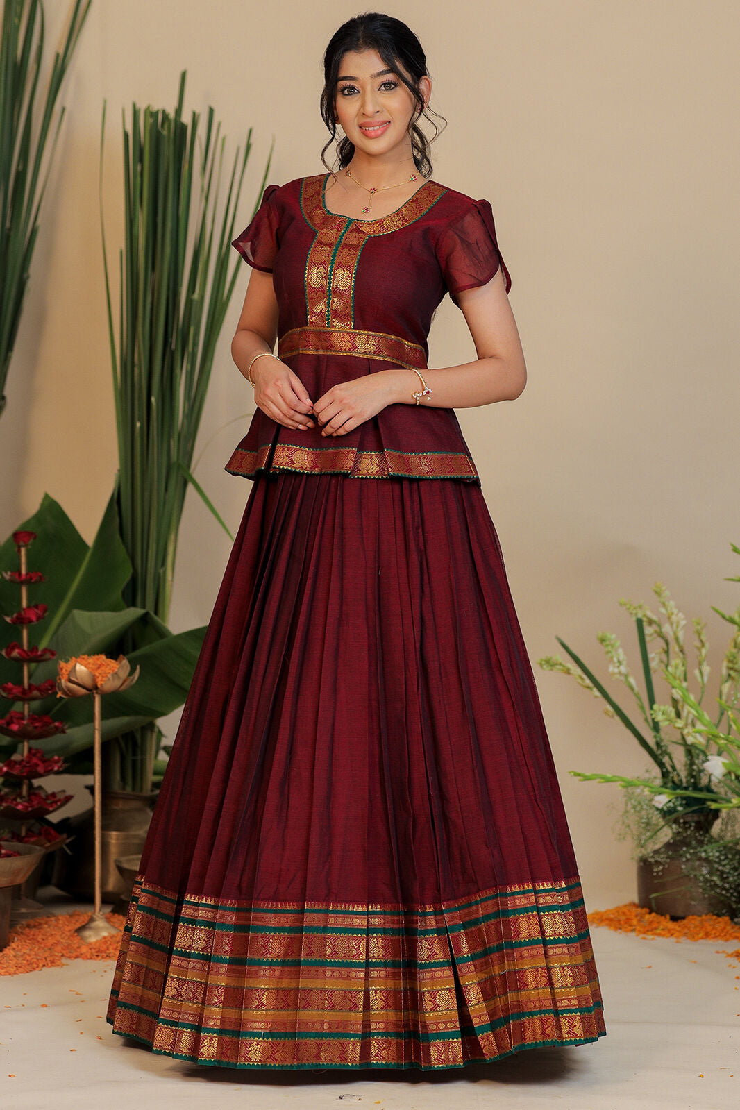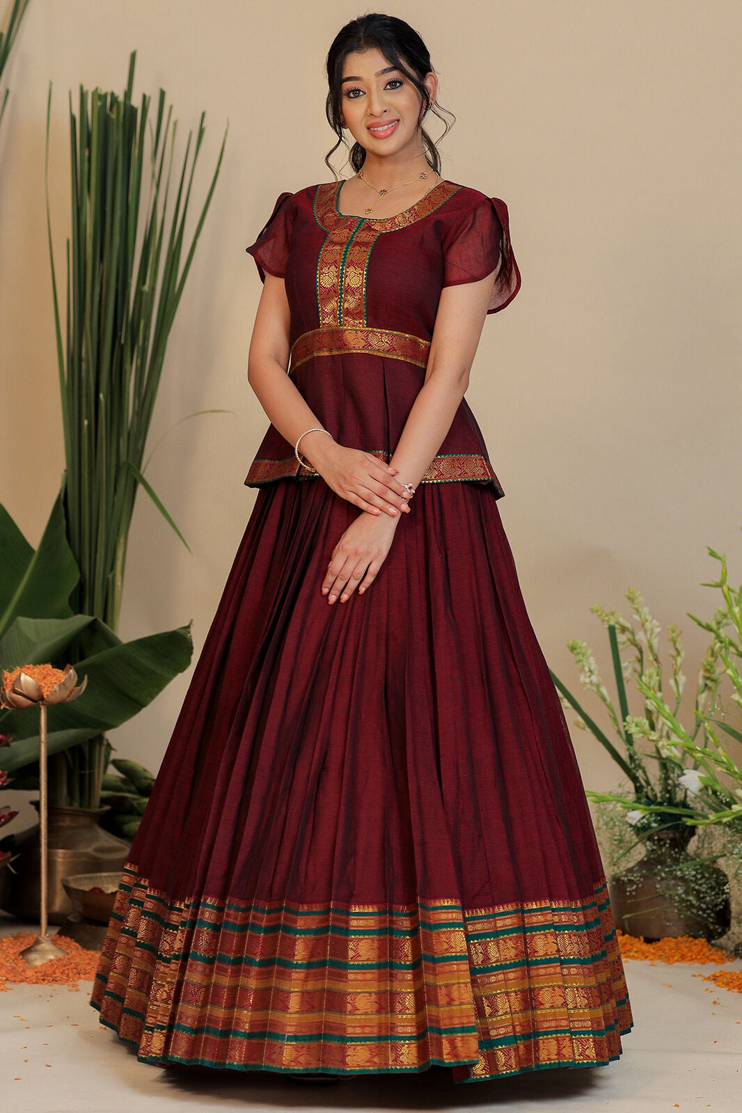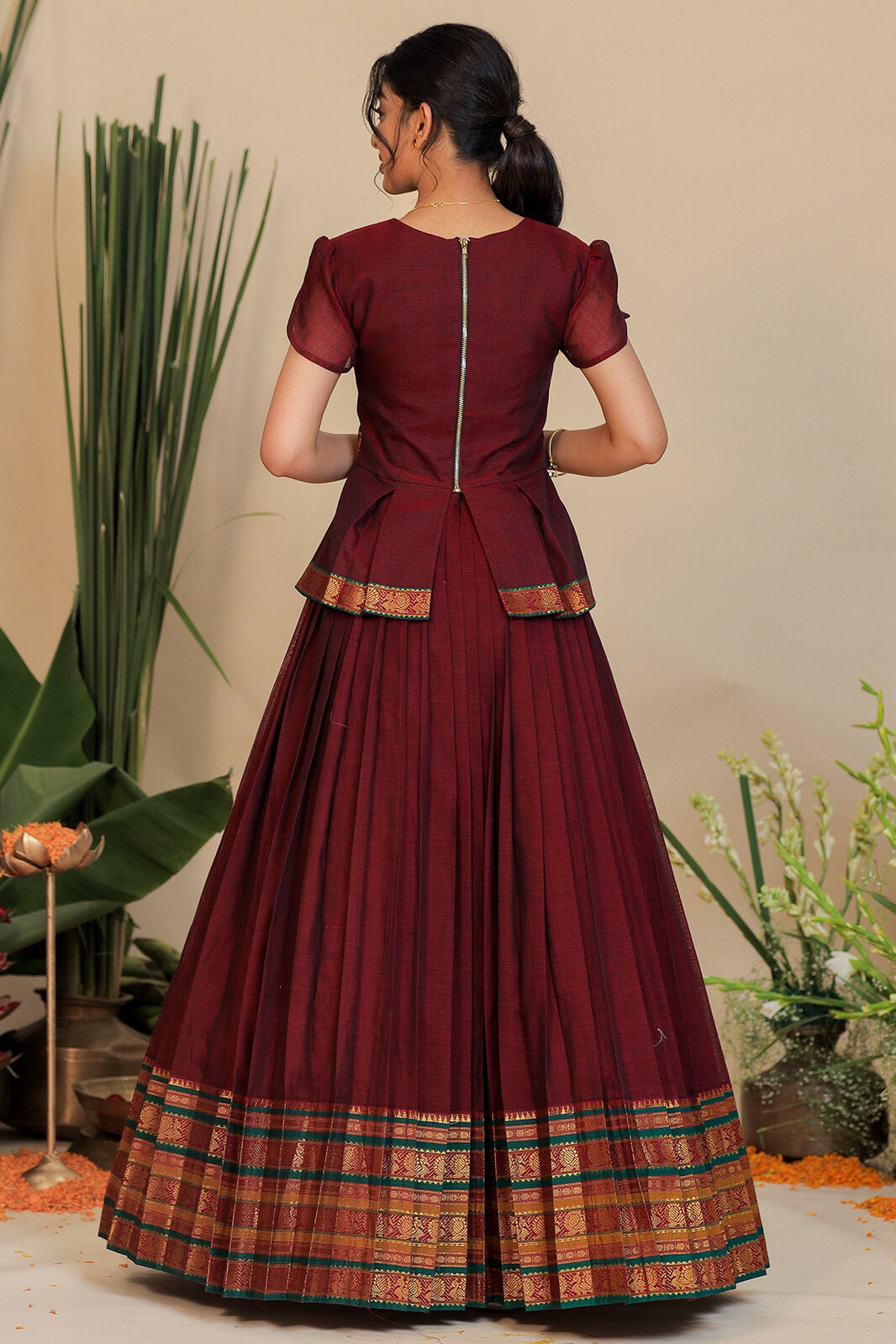 Match with your bestie; we have another bright color like you. This Maroon two-piece handloom lehenga set includes a contemporary peplum top with petal-overlapping sleeves and a back opening paired with a matching lehenga. Both pieces are adorned with delicate elephant pattu designs, perfectly blending the best of modern and traditional aesthetics.