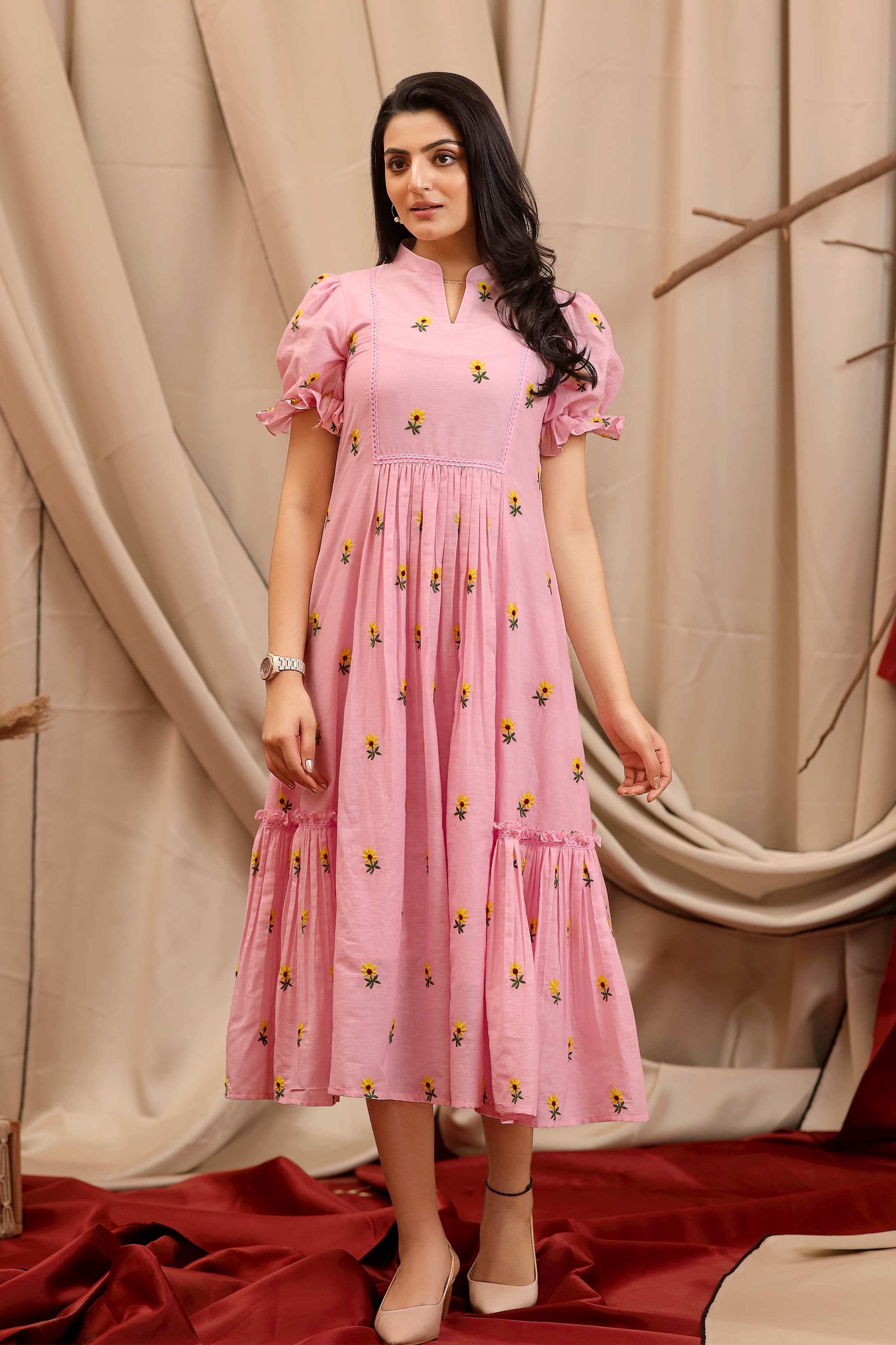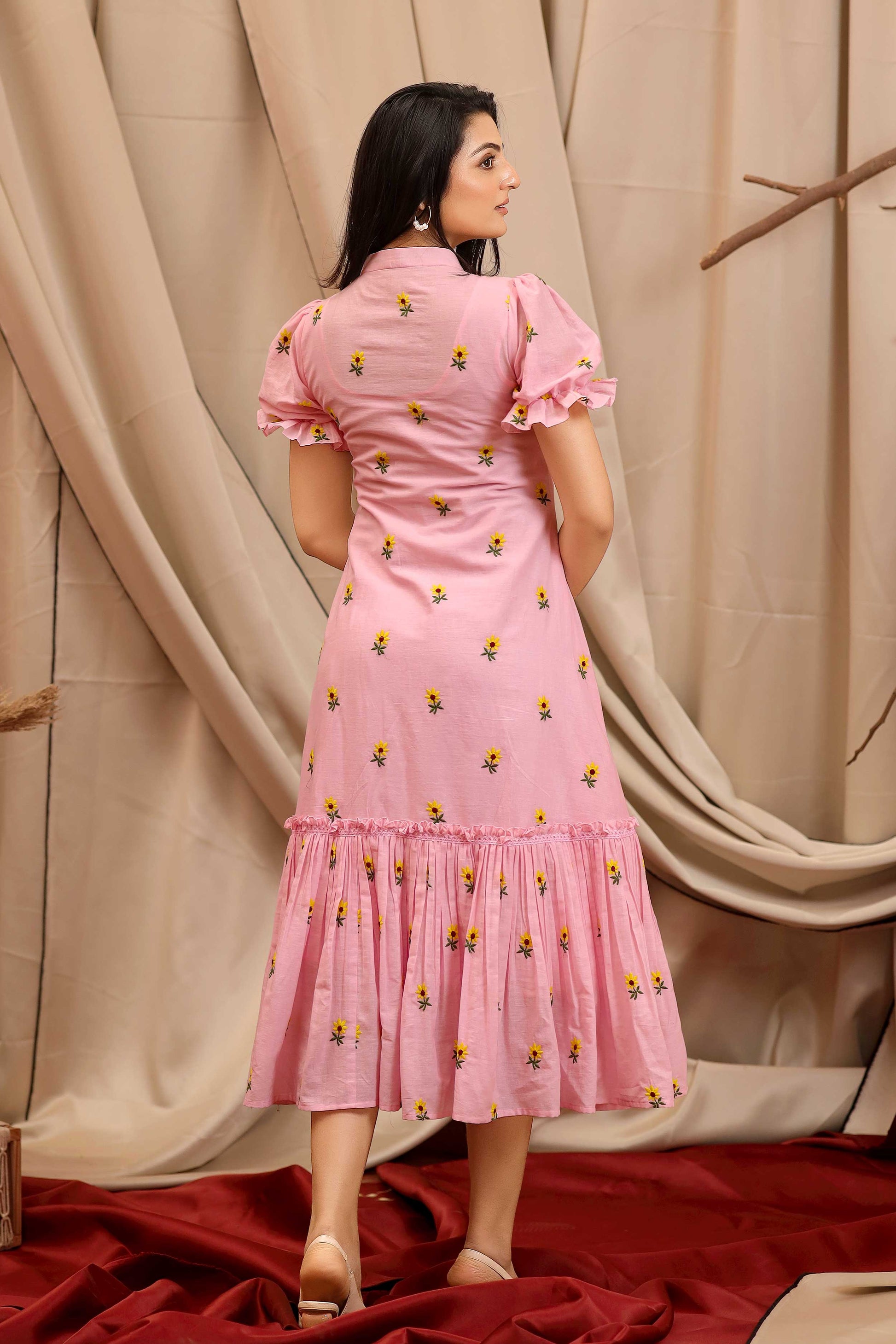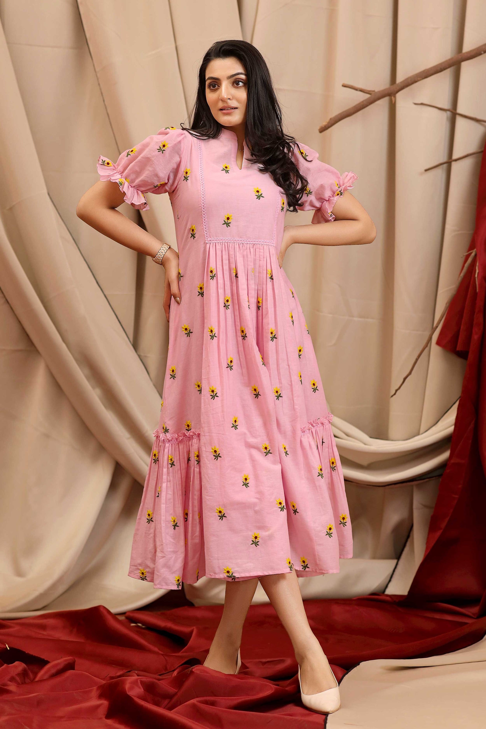 The color is unique, the Style stands out, and the vibe attracts! Get yourself this summer stunning Chinese collar cotton dress with sunflower hand embroidery motifs all over. It features side gathering and a puff sleeve, which visually gives a narrow waistline.