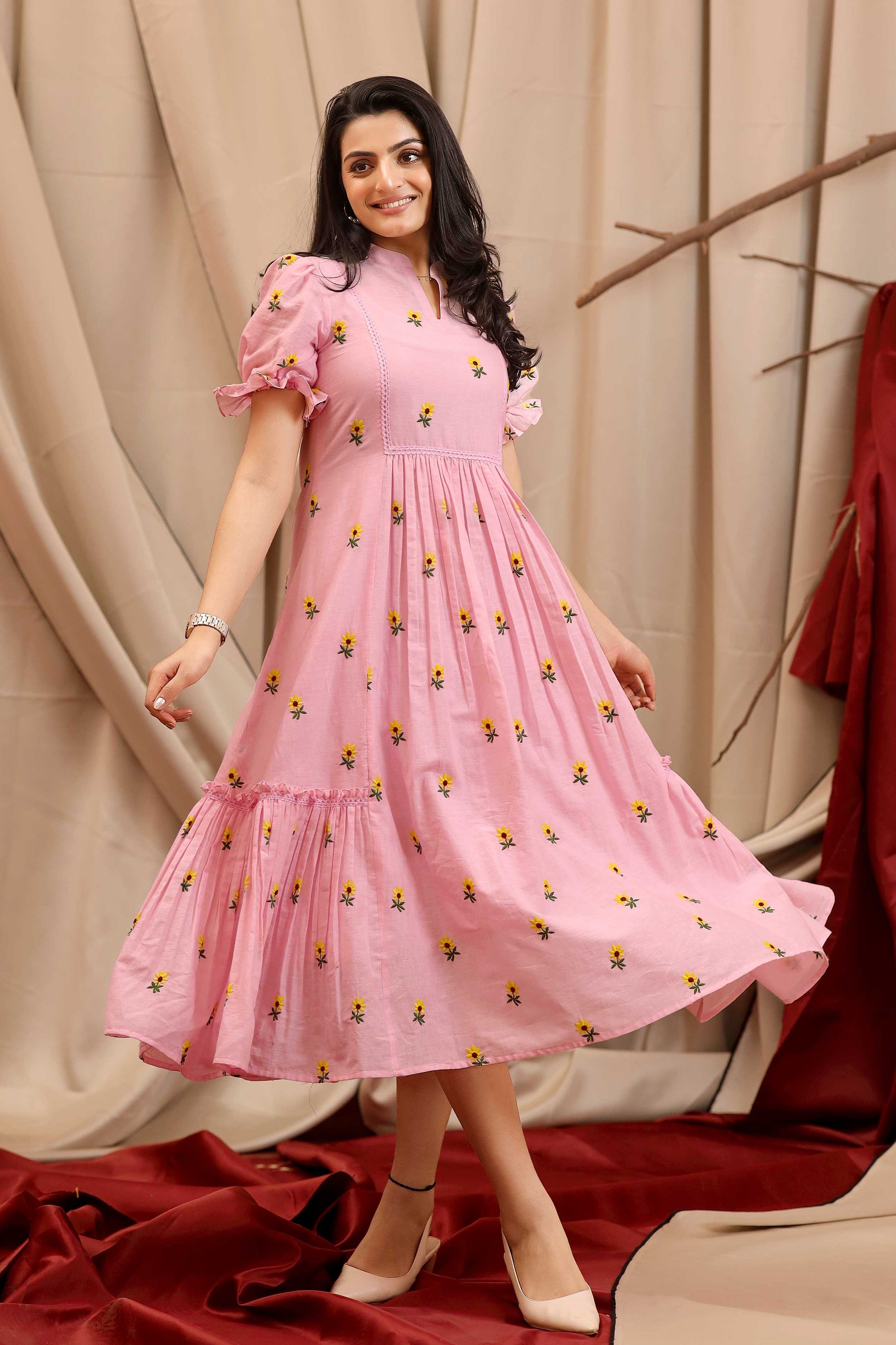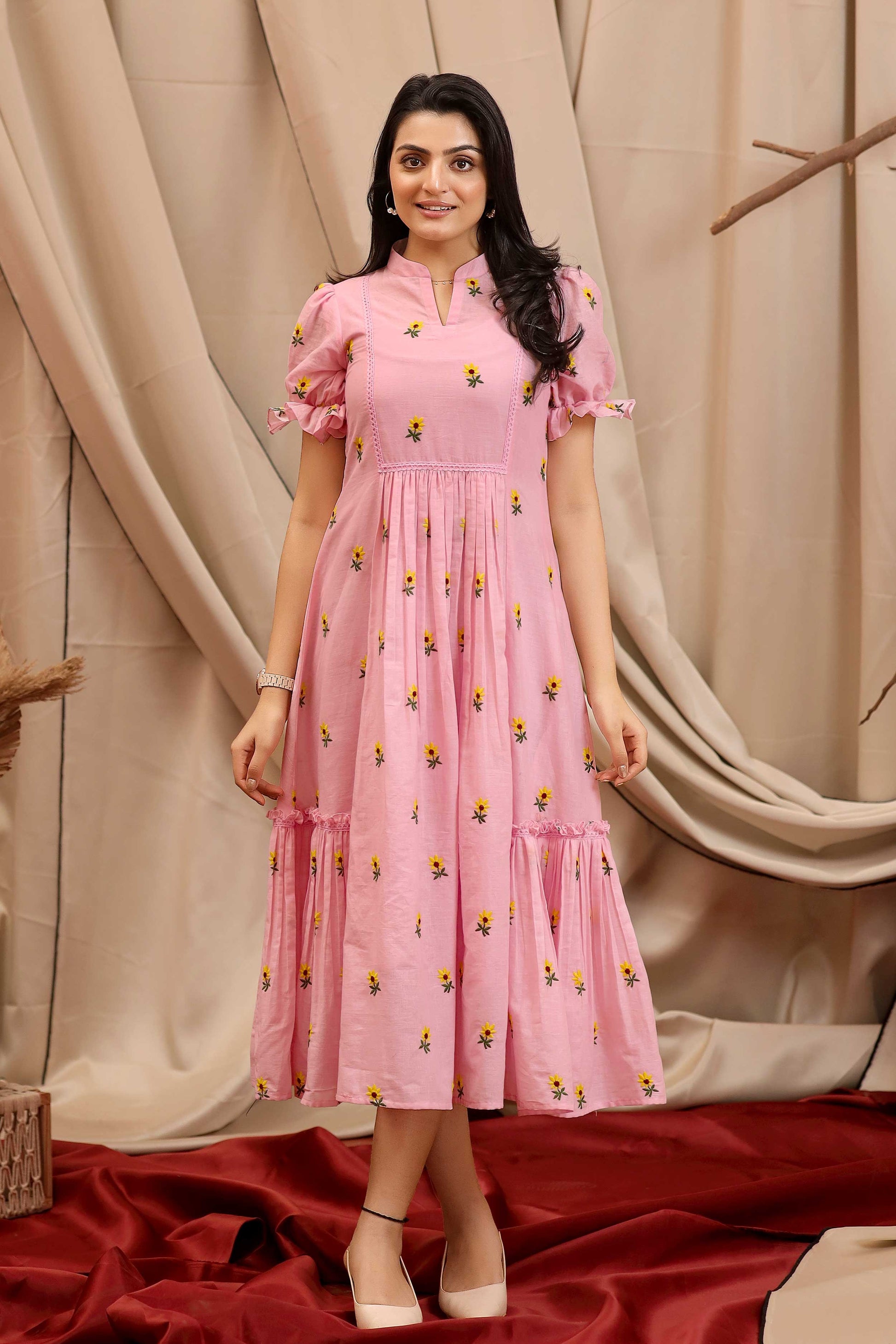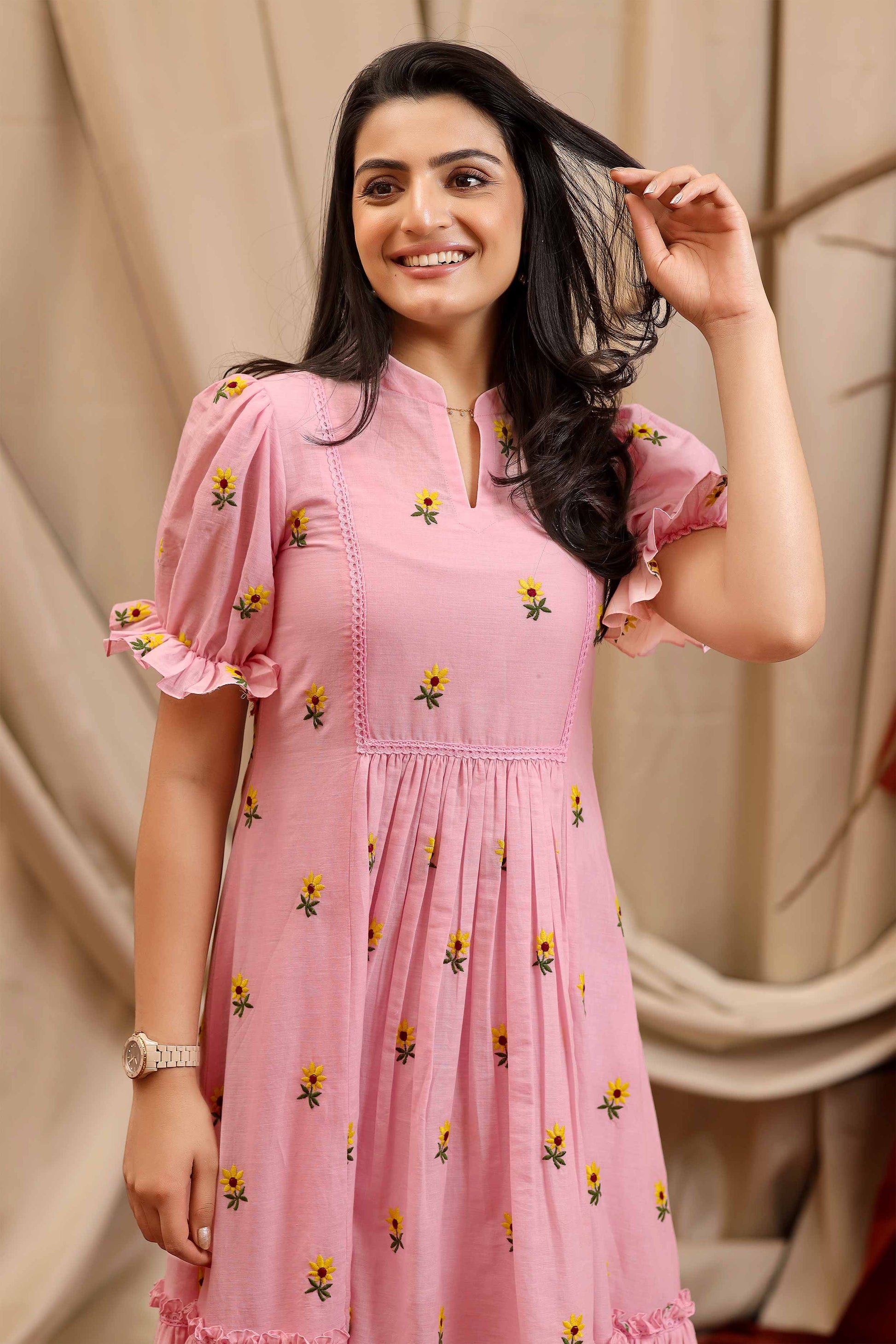 The color is unique, the Style stands out, and the vibe attracts! Get yourself this summer stunning Chinese collar cotton dress with sunflower hand embroidery motifs all over. It features side gathering and a puff sleeve, which visually gives a narrow waistline.