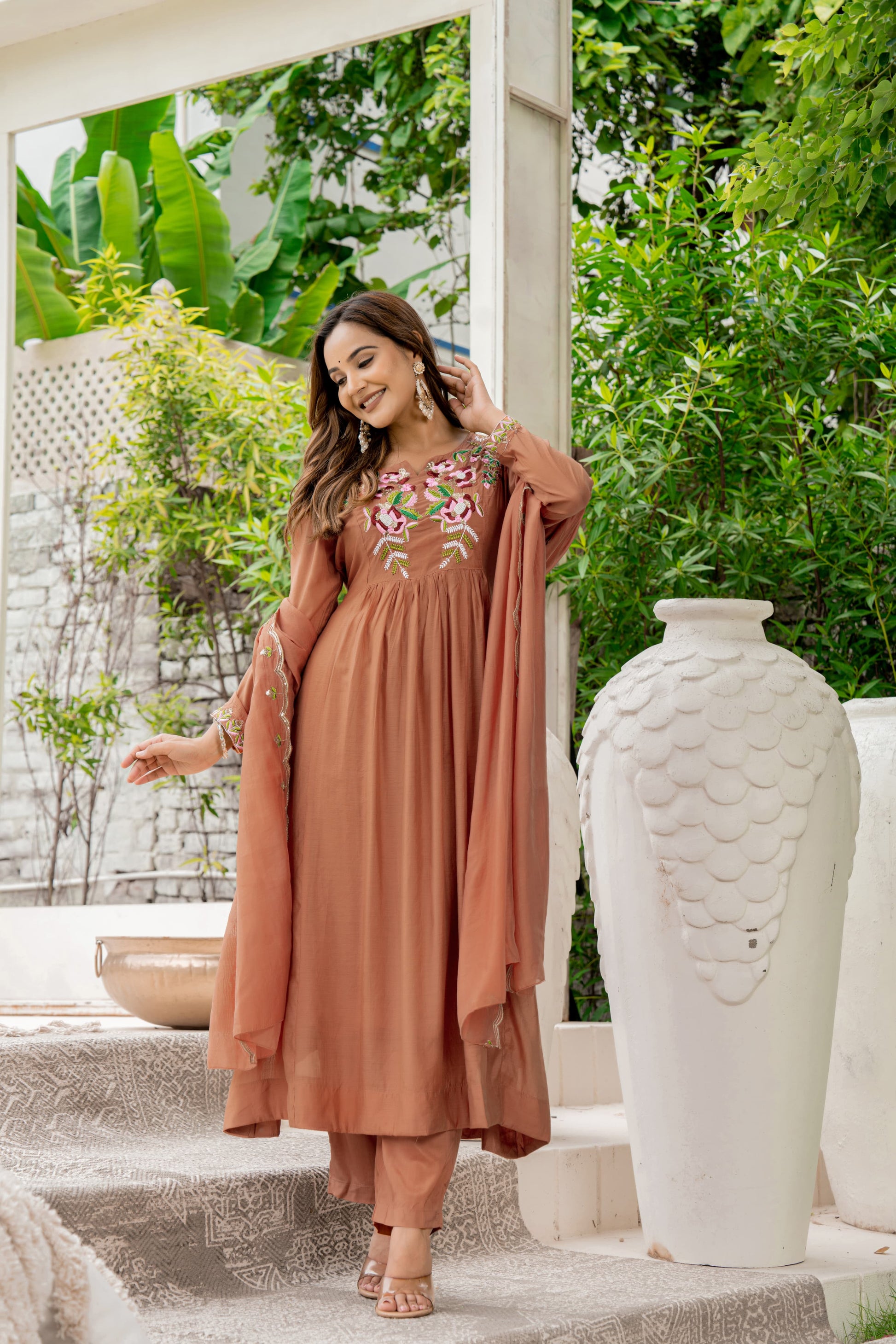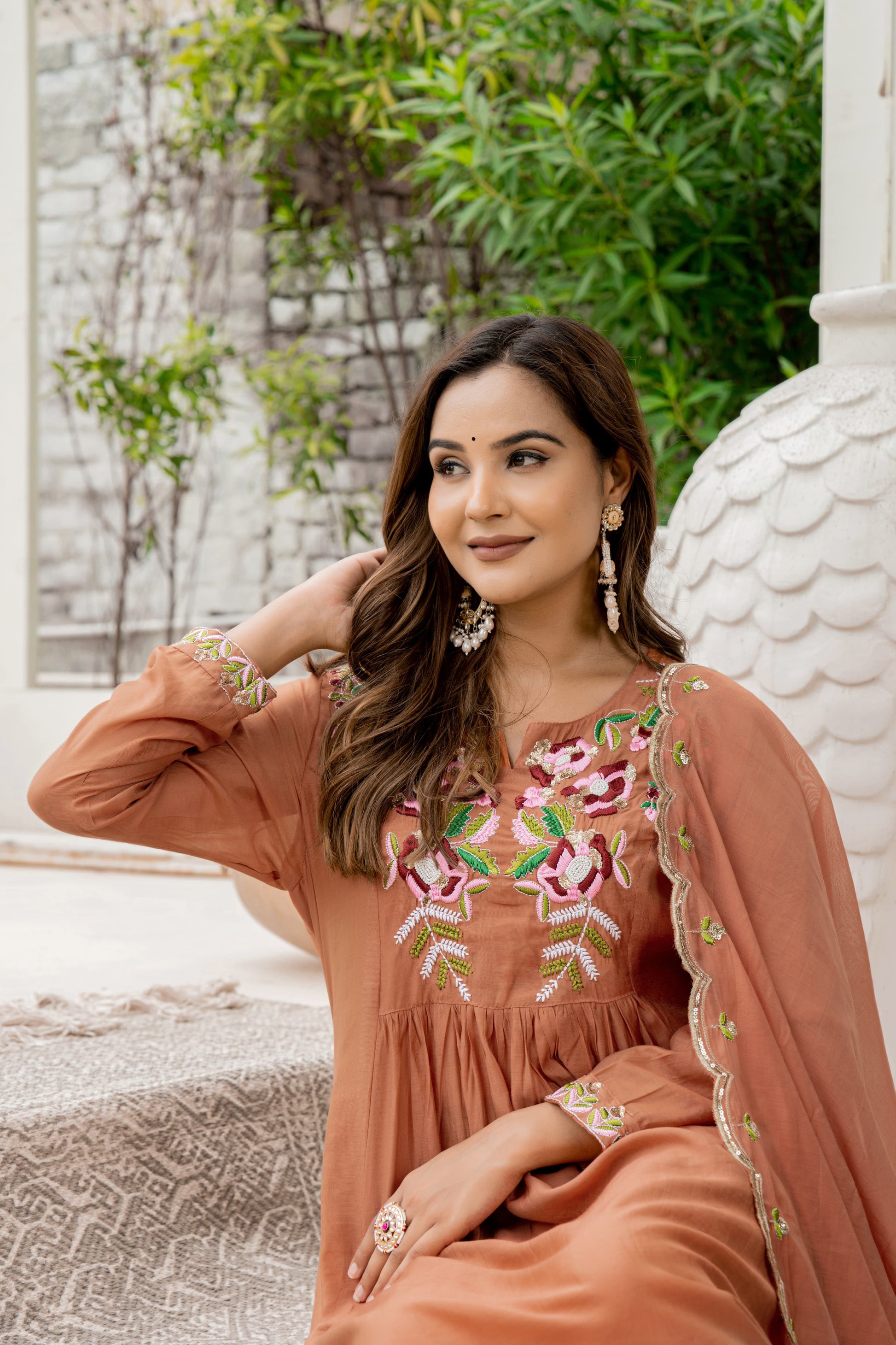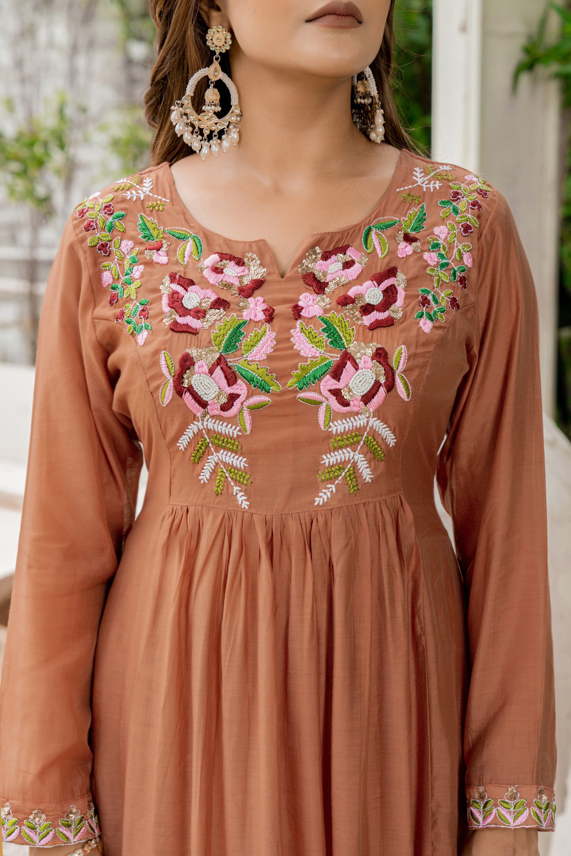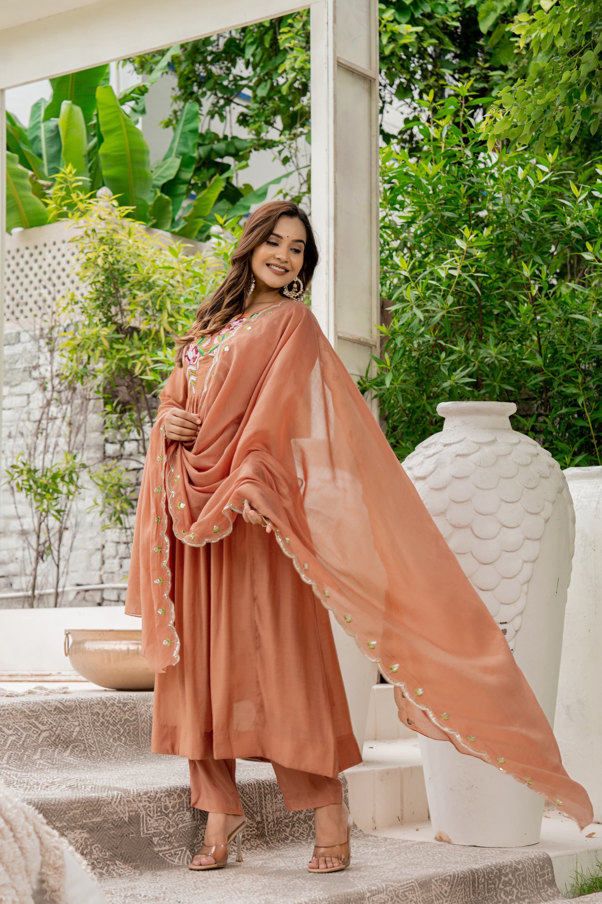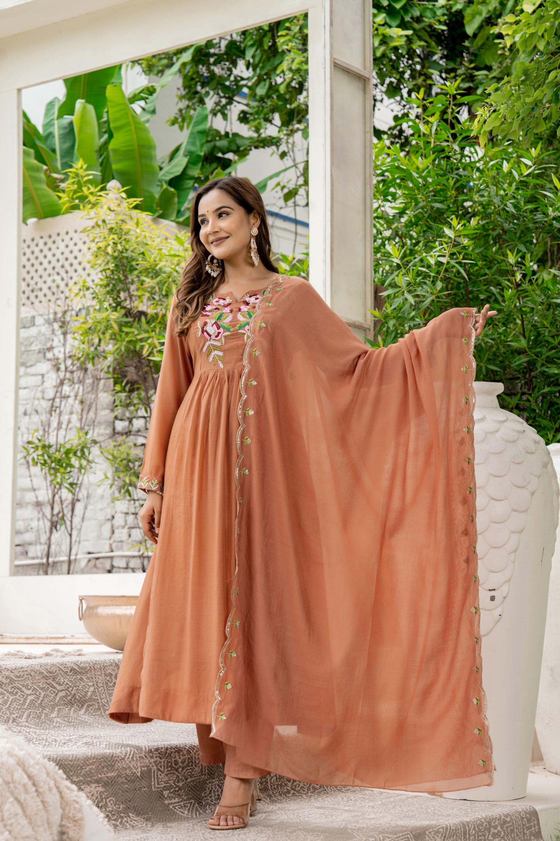 This stunning three-piece suit set features a Pure Mul Chanderi Flared Suit adorned with intricate handwork & hand paint with additional detailing on the sleeves for a touch of elegance.It’s paired with a beautiful hand scallop Dupatta, adding a graceful flow to the ensemble. To complete the look, the set includs pants, providing both comfort and style.