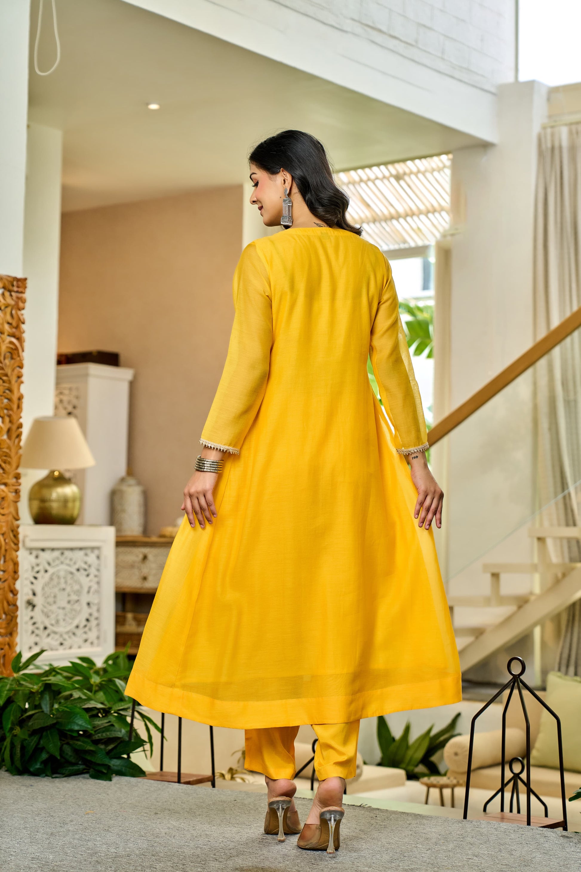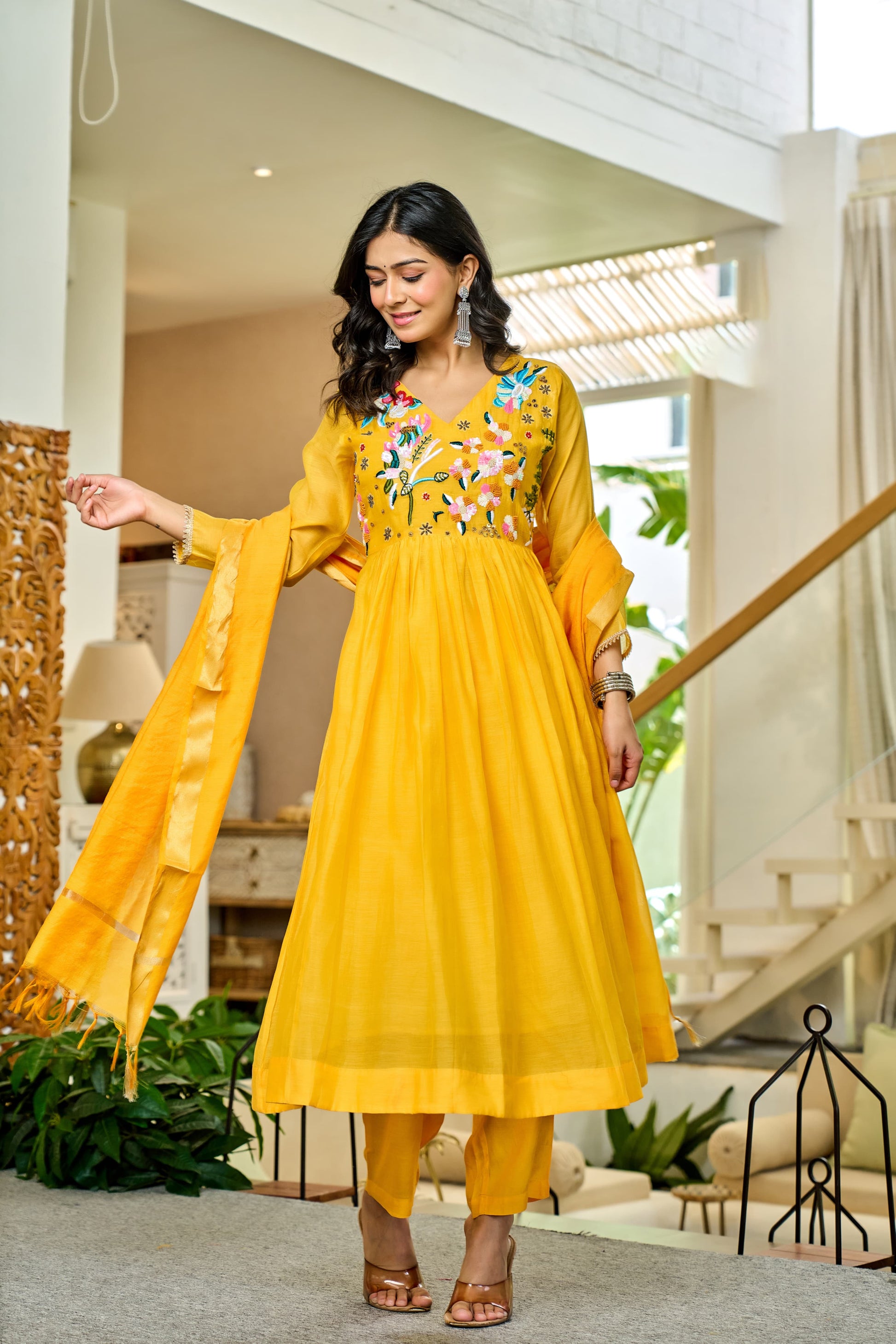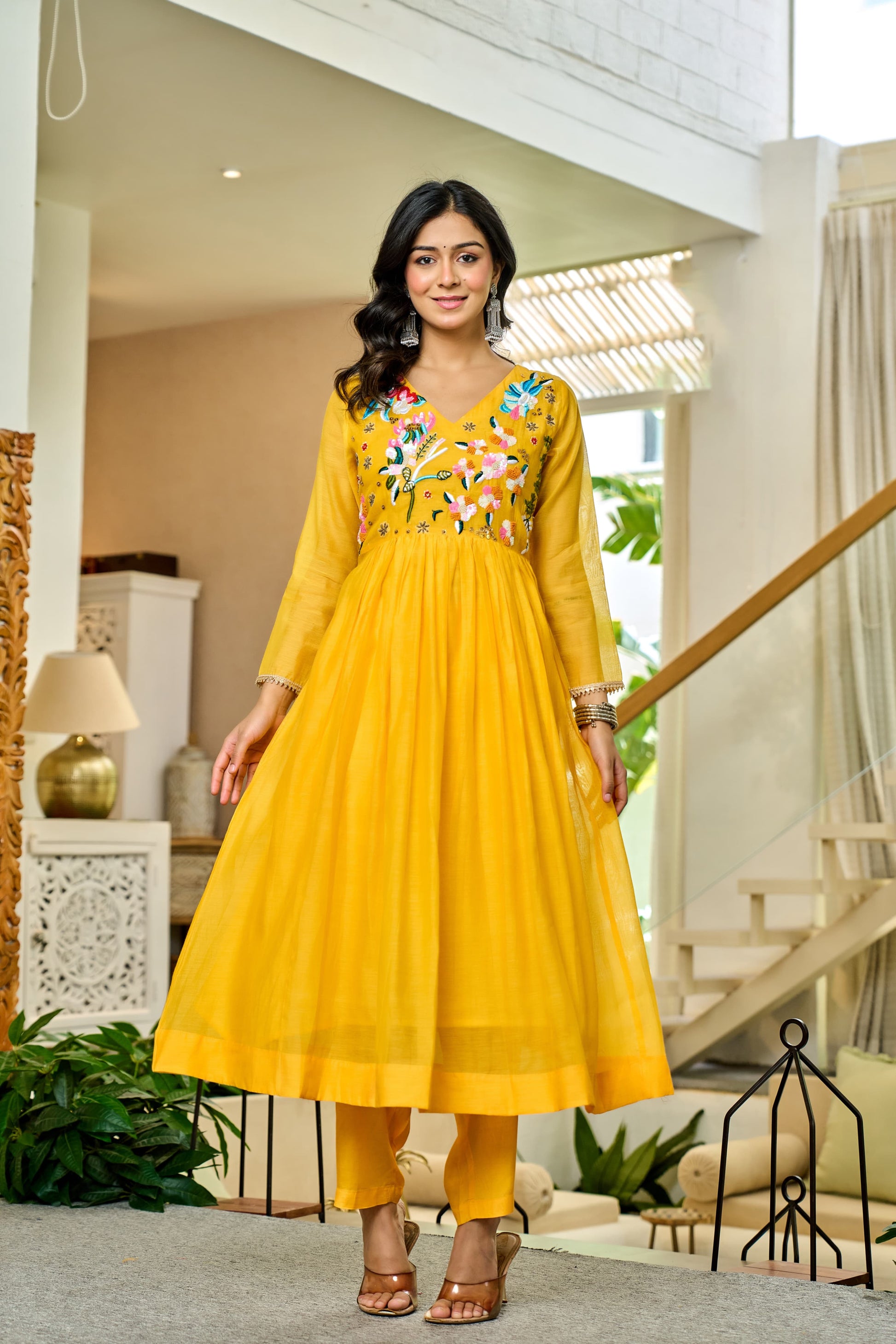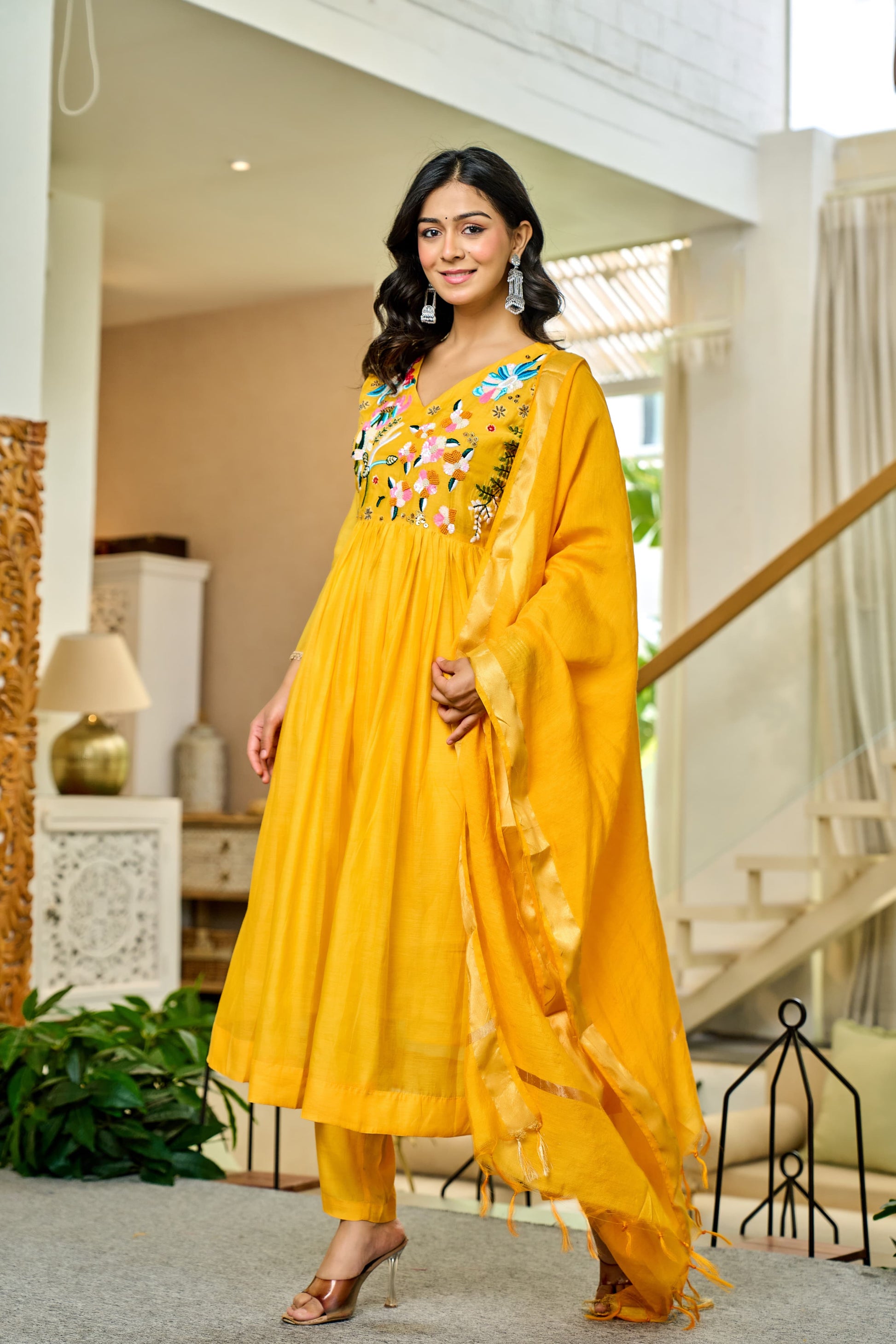 This stunning three-piece suit set features a Pure Mul Chanderi Flared Suit adorned with intricate handwork & hand paint with additional detailing on the sleeves for a touch of elegance.It’s paired with a beautiful hand scallop Dupatta, adding a graceful flow to the ensemble. To complete the look, the set includs pants, providing both comfort and style.