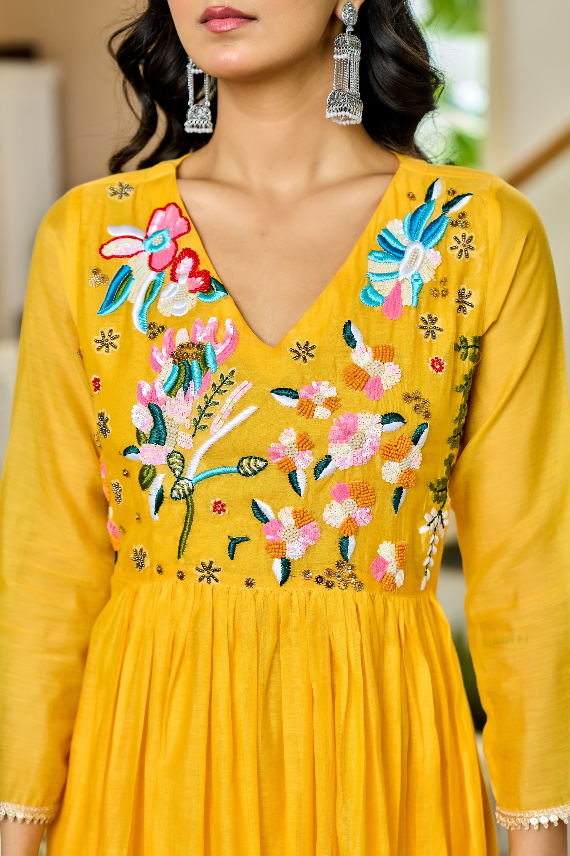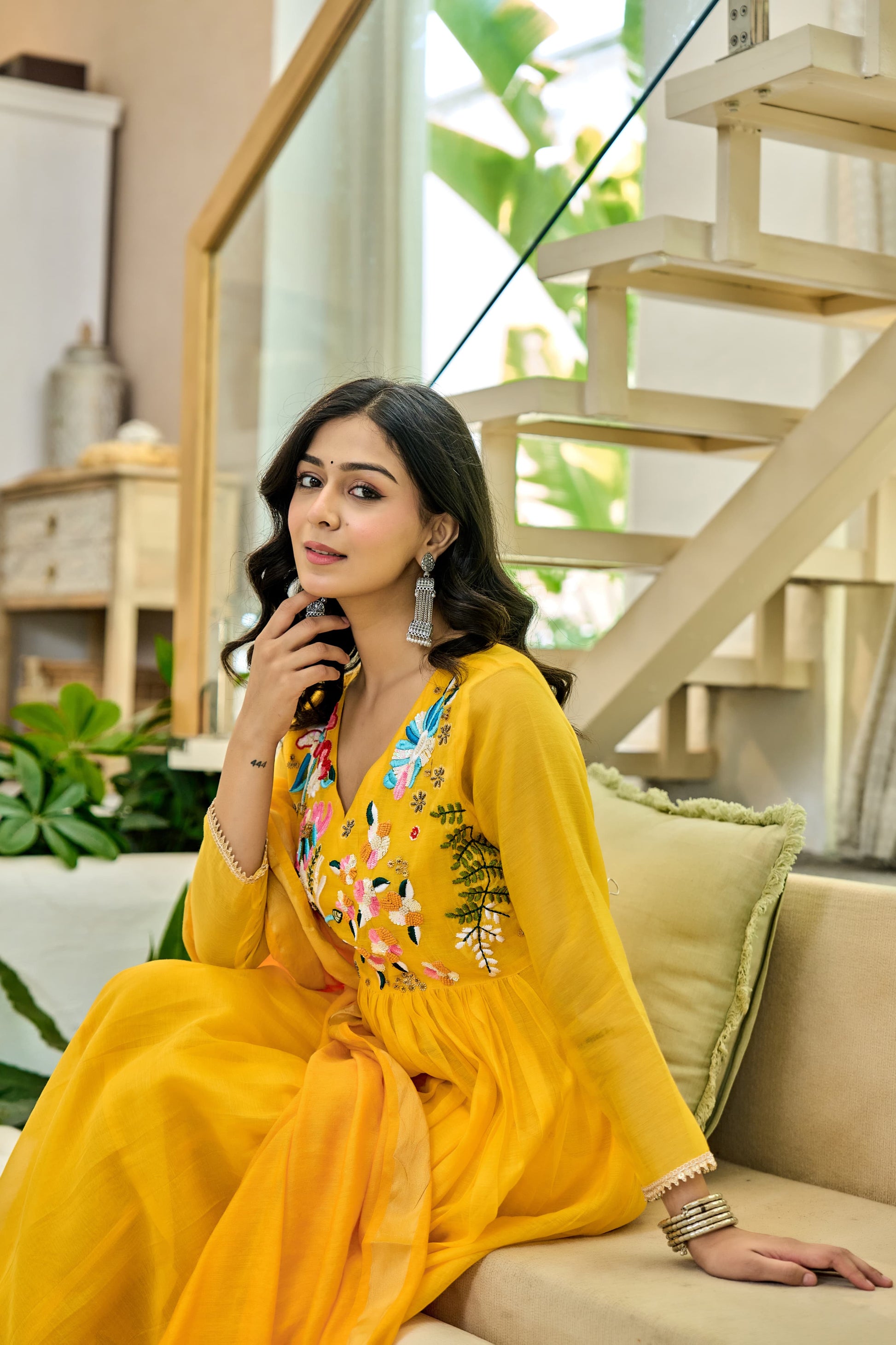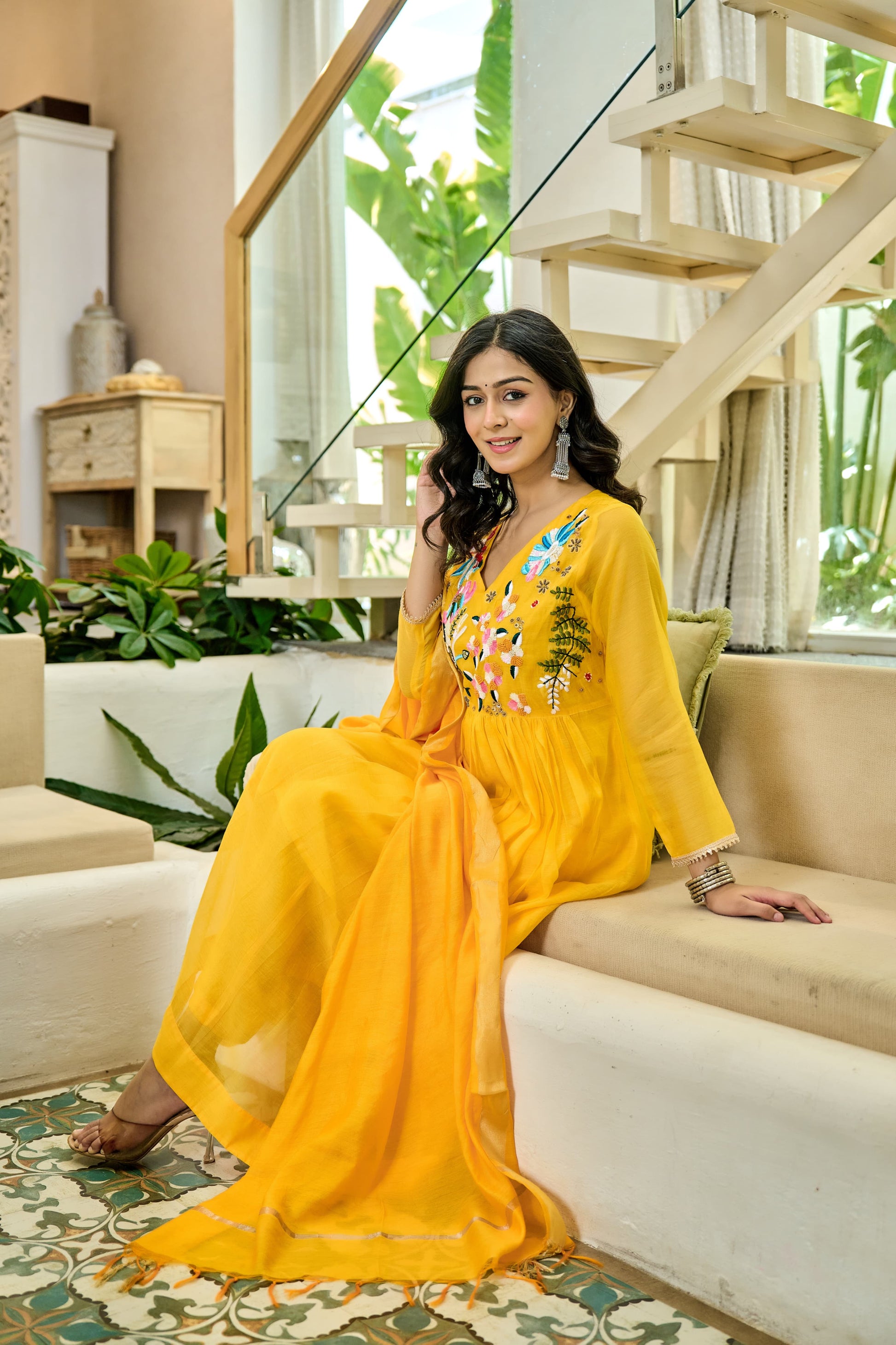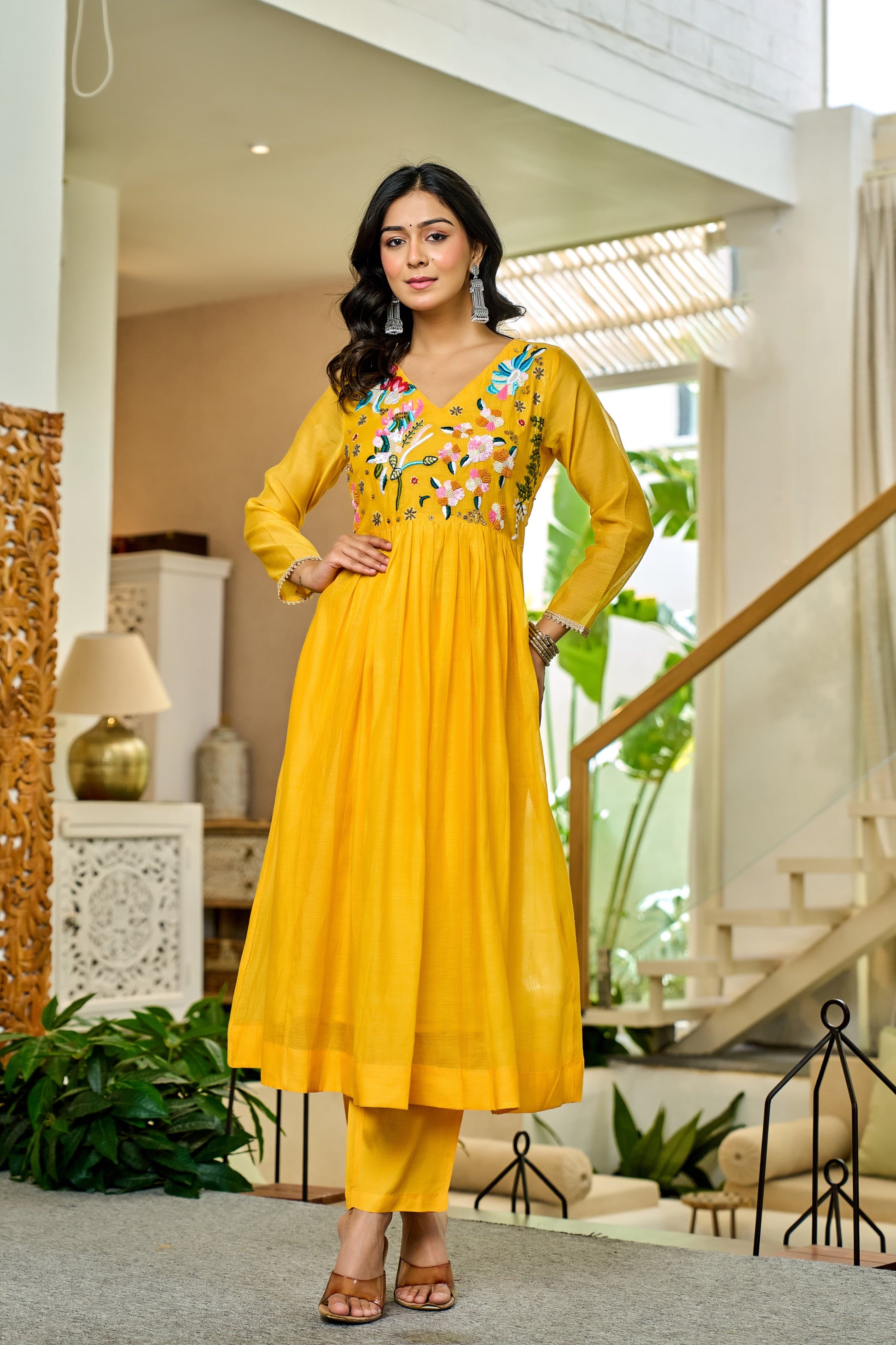 This stunning three-piece suit set features a Pure Mul Chanderi Flared Suit adorned with intricate handwork & hand paint with additional detailing on the sleeves for a touch of elegance.It’s paired with a beautiful hand scallop Dupatta, adding a graceful flow to the ensemble. To complete the look, the set includs pants, providing both comfort and style.