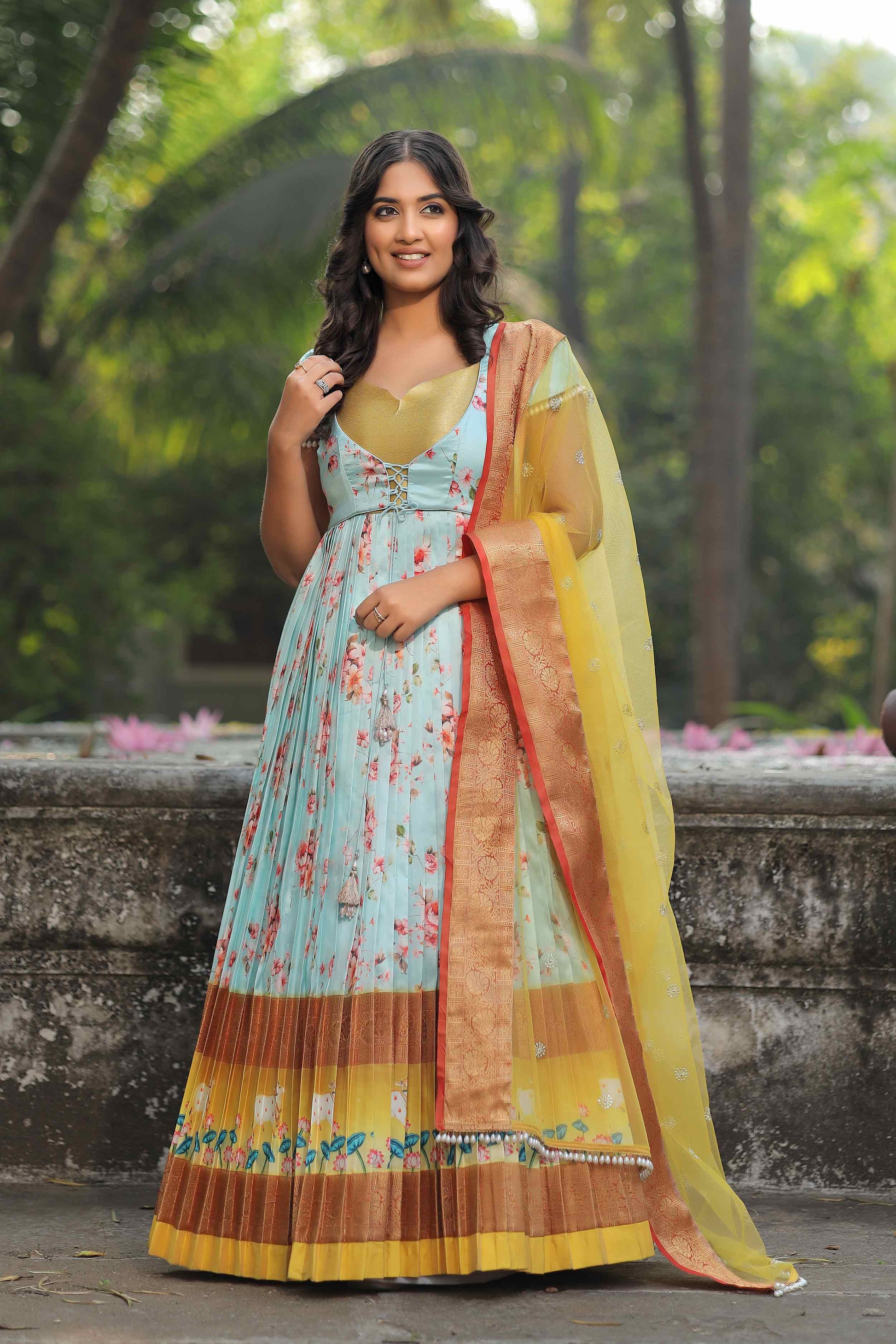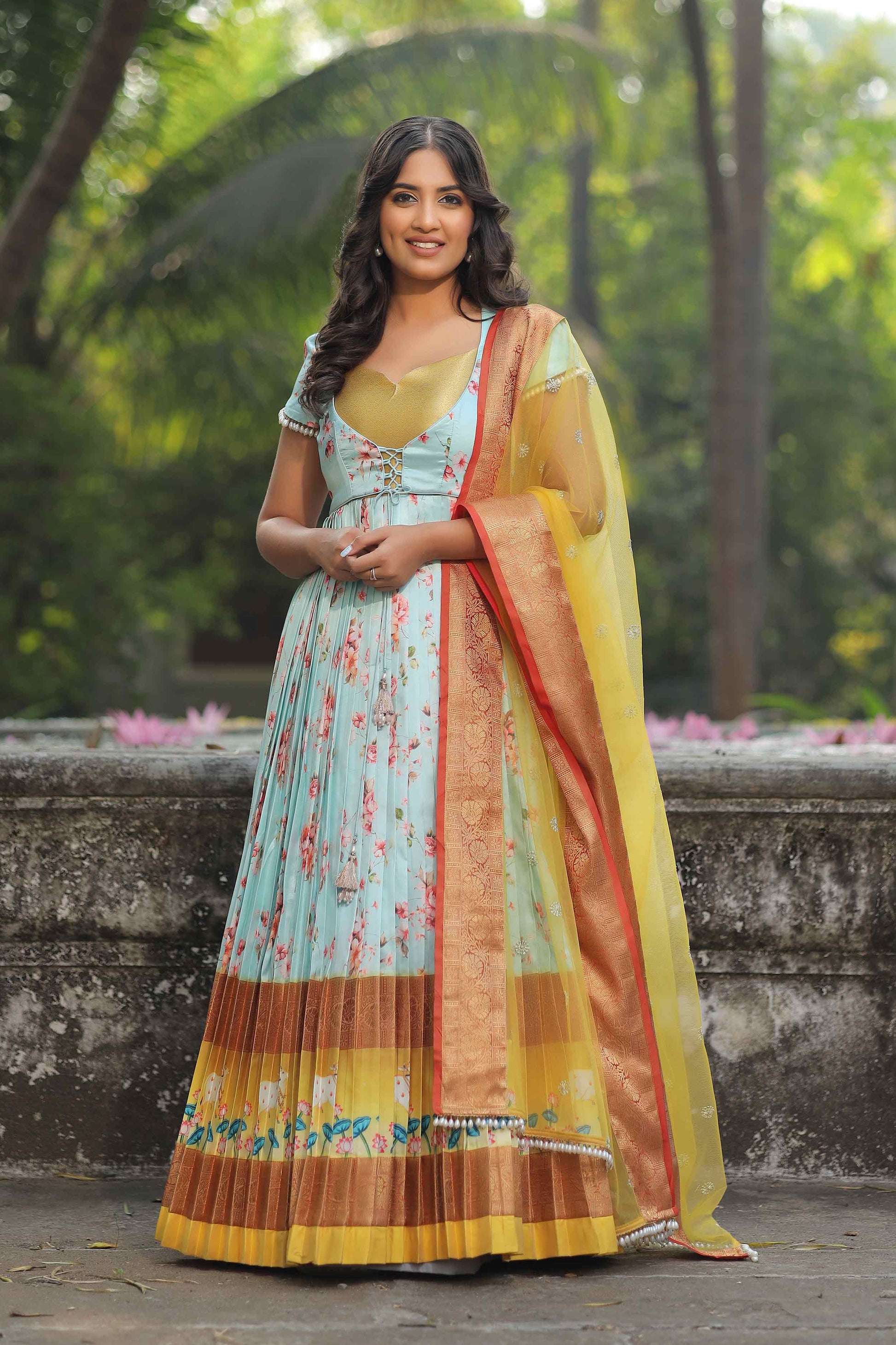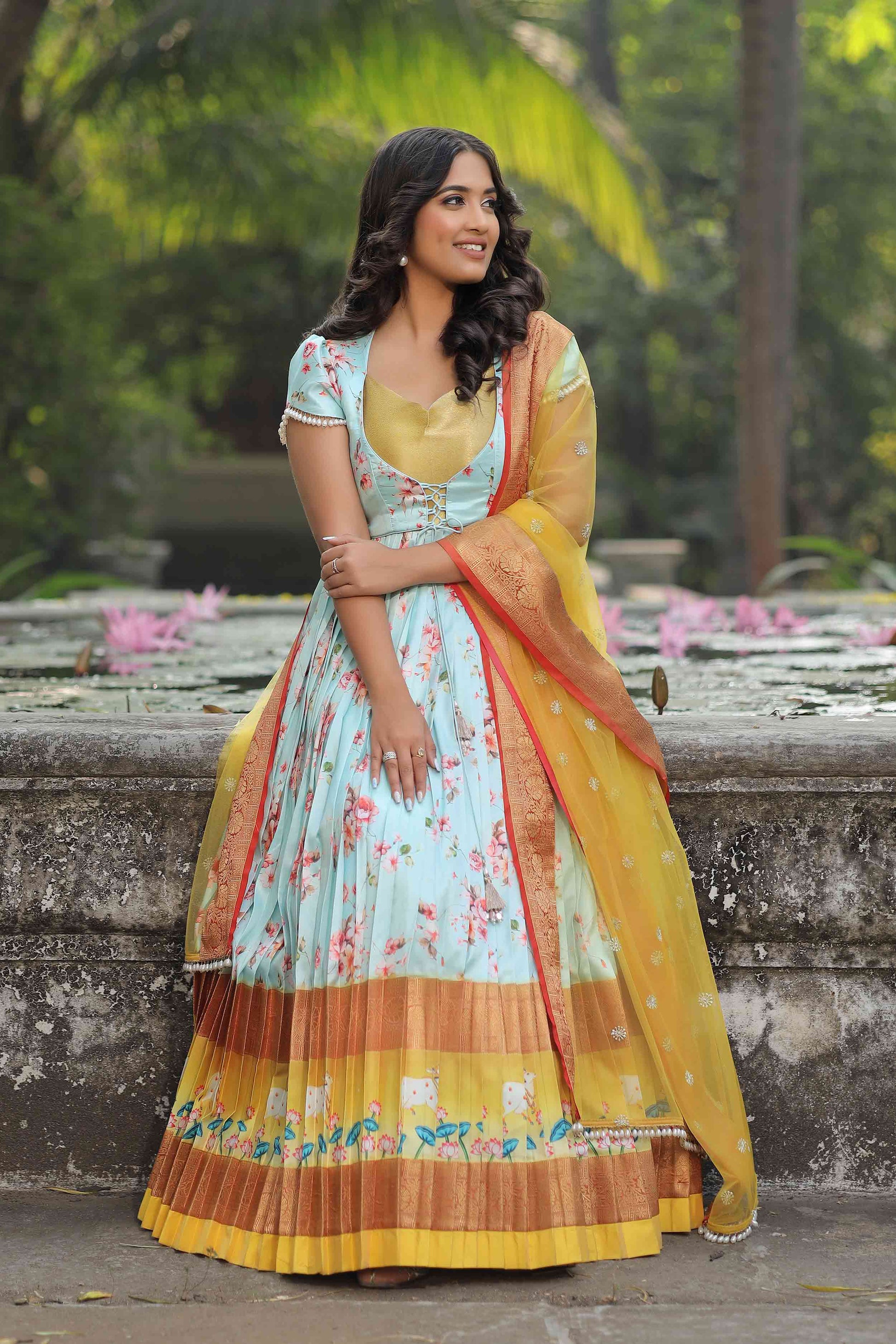 Discover the fusion of tradition and modernity with our Iris Floral Pichwai-Printed Silk Dress, featuring a unique jacket style in the yoke part. Paired with a vibrant yellow net Dupatta, this ensemble is a testament to elegant design and sophisticated craftsmanship. Ideal for any occasion that calls for a statement piece, it combines the allure of silk with the timeless beauty of Pichwai prints, ensuring you capture attention with every turn.