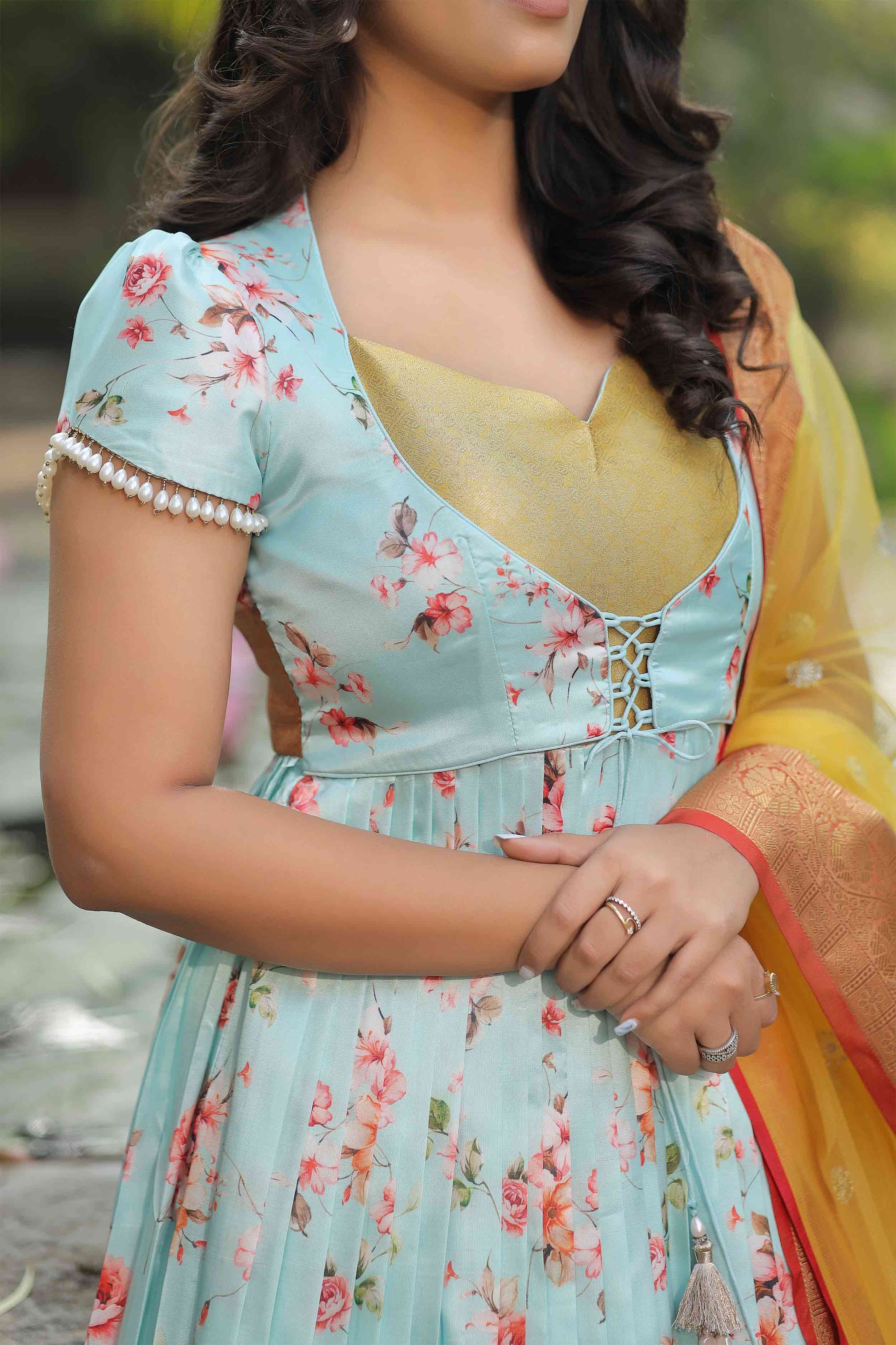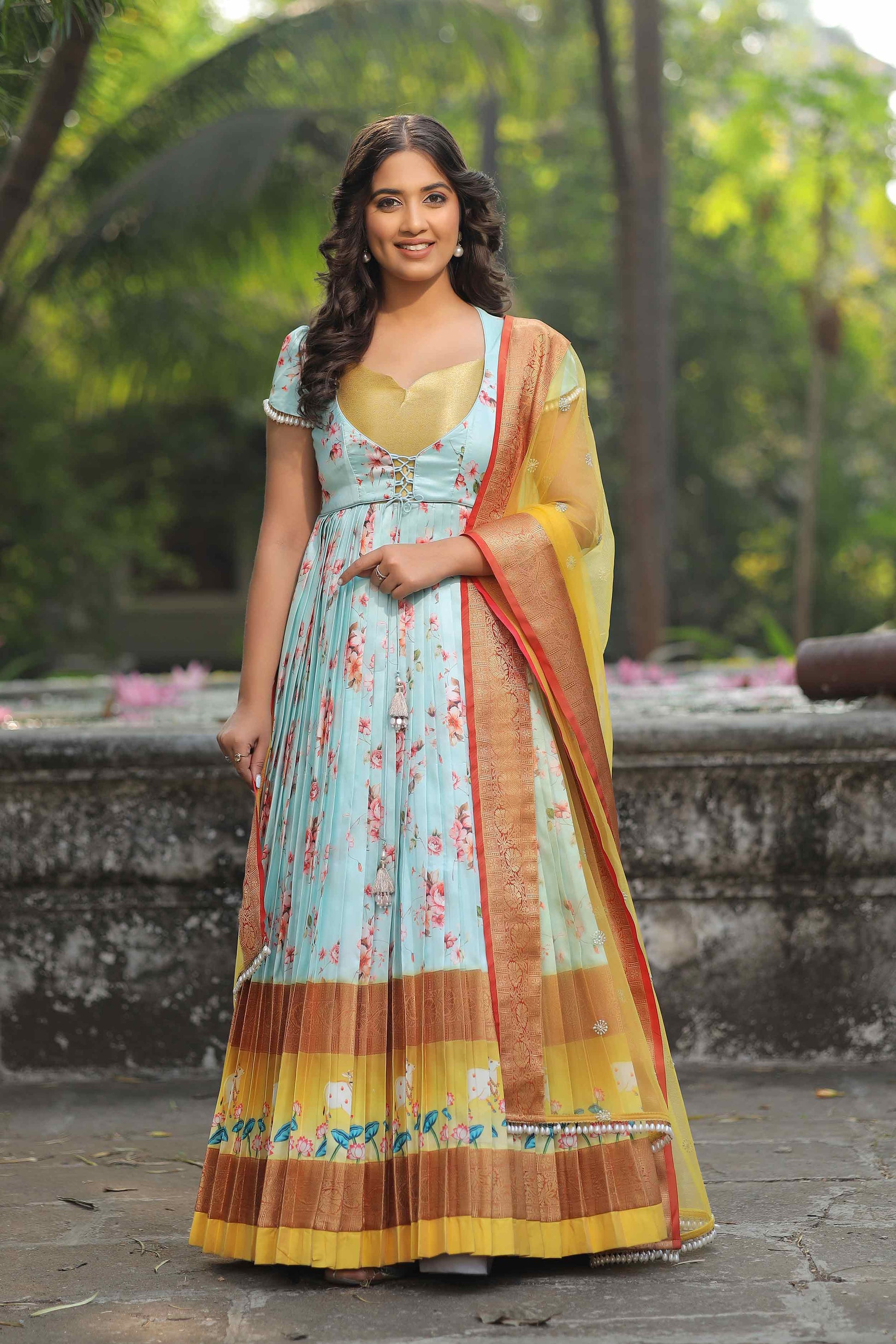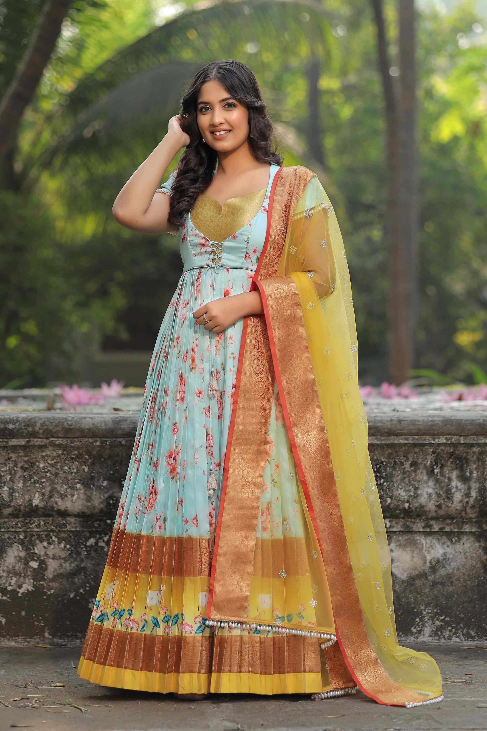 Discover the fusion of tradition and modernity with our Iris Floral Pichwai-Printed Silk Dress, featuring a unique jacket style in the yoke part. Paired with a vibrant yellow net Dupatta, this ensemble is a testament to elegant design and sophisticated craftsmanship. Ideal for any occasion that calls for a statement piece, it combines the allure of silk with the timeless beauty of Pichwai prints, ensuring you capture attention with every turn.