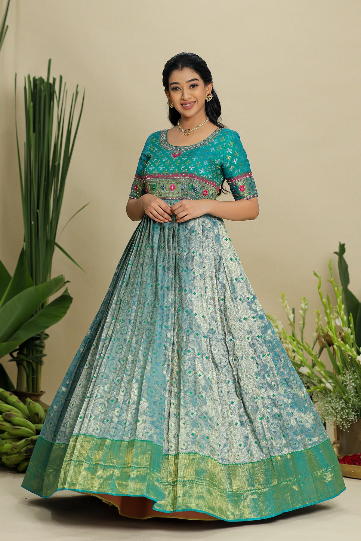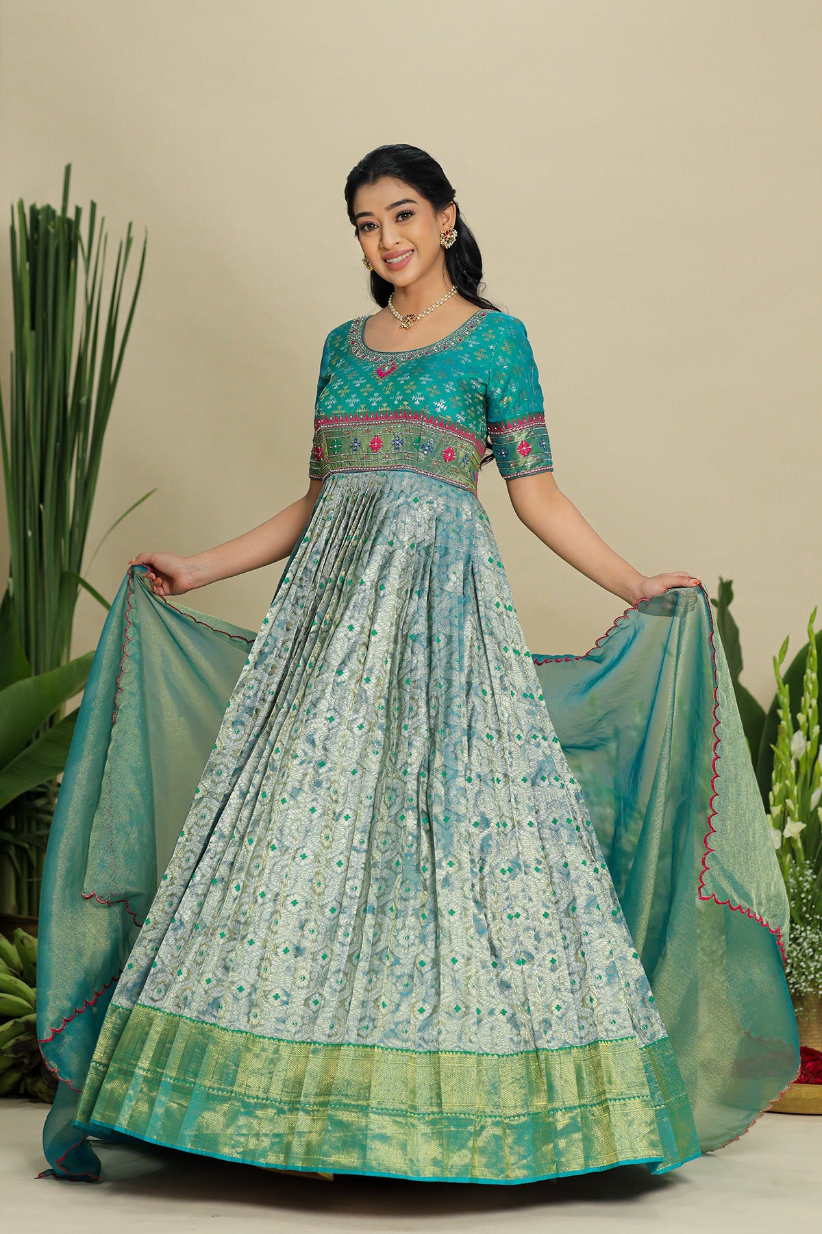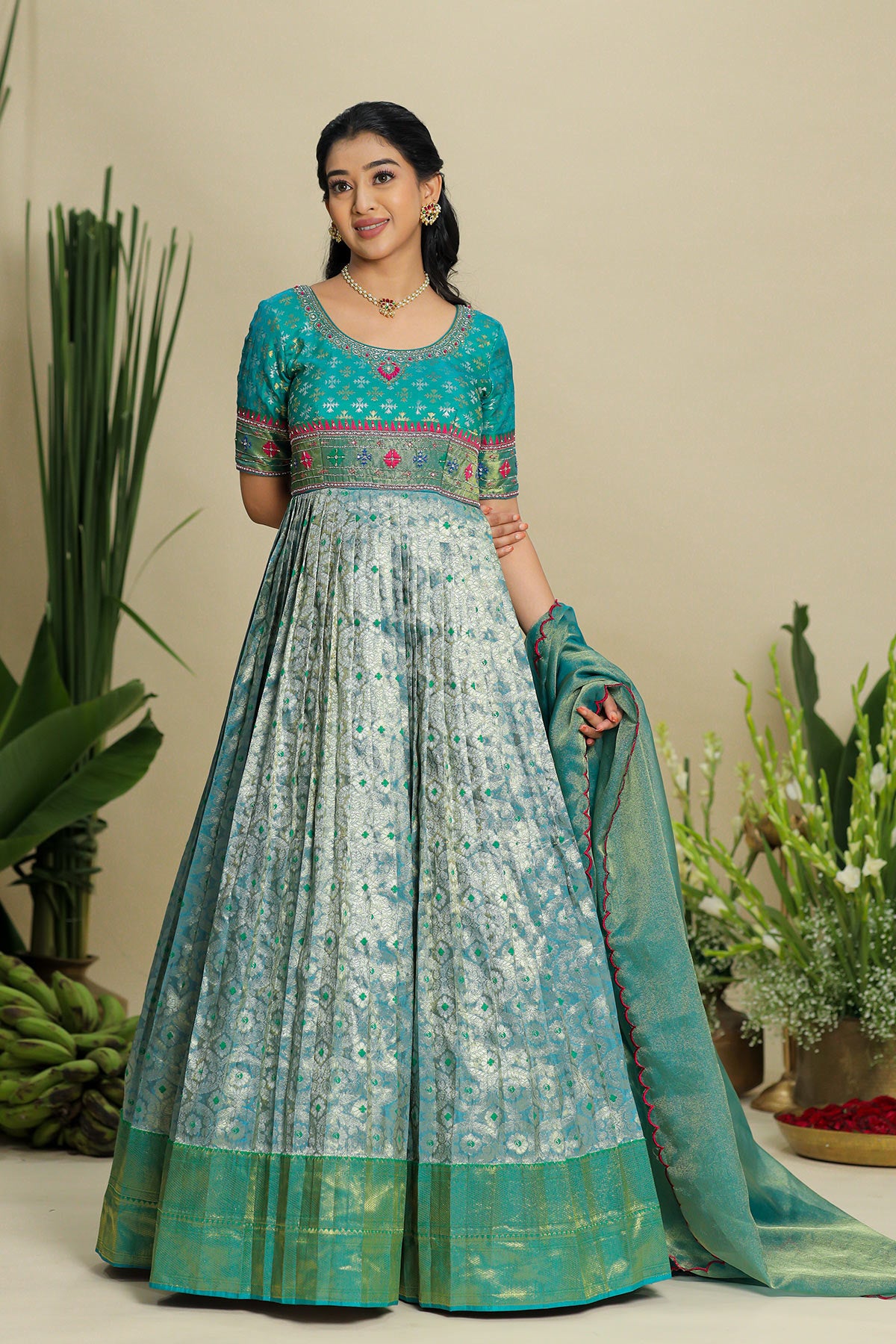 Perfect for weddings and festive occasions, flaunt this Jyoti Pattu Dress stitched from rich Banarasi silk fabric, which is very soft and lightweight, making it perfect for all occasions. This beautiful dress features a Round Neck with Handwork detailing and broad printed pattu on the yoke and sleeves. The pleated flair elevates the look. This Beautiful Dress comes with golden tissue ZARI and a cutwork-detailed dupatta.