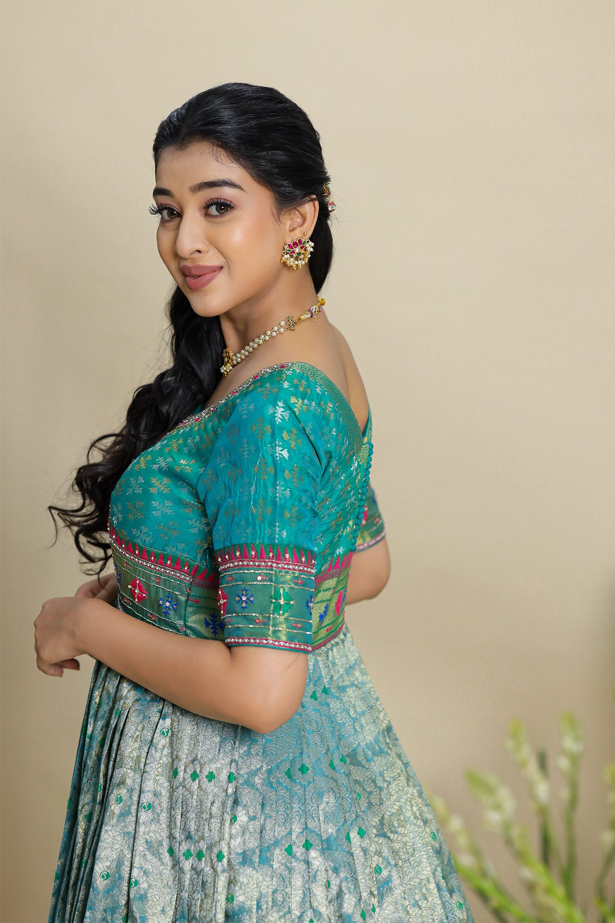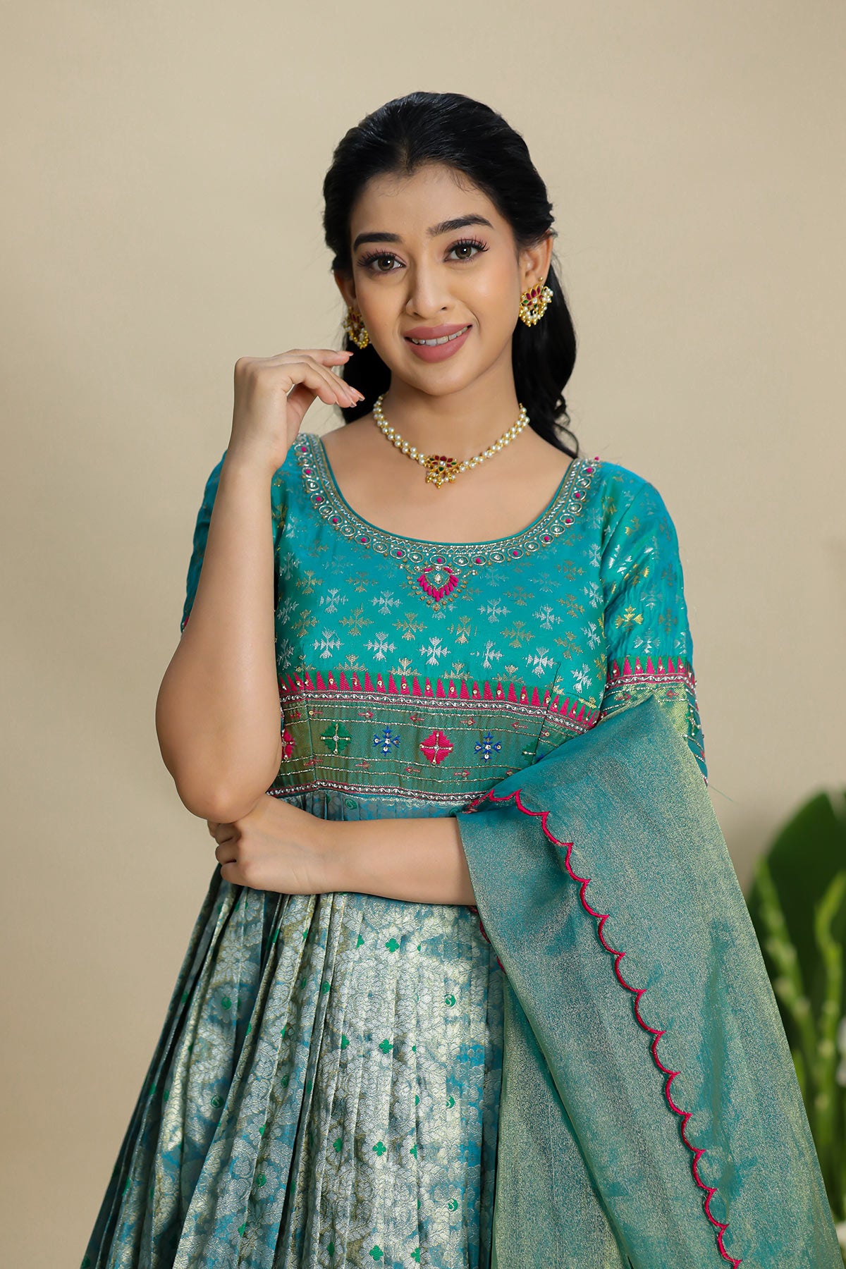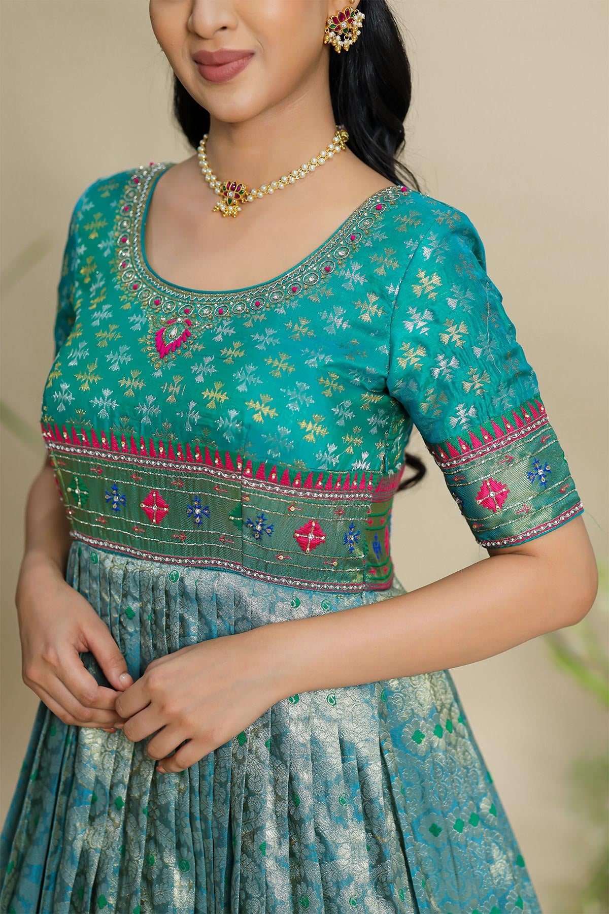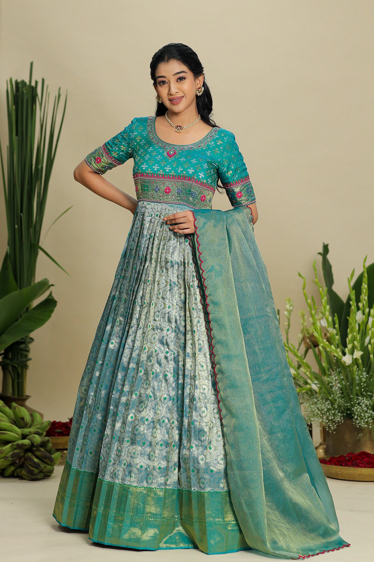 Perfect for weddings and festive occasions, flaunt this Jyoti Pattu Dress stitched from rich Banarasi silk fabric, which is very soft and lightweight, making it perfect for all occasions. This beautiful dress features a Round Neck with Handwork detailing and broad printed pattu on the yoke and sleeves. The pleated flair elevates the look. This Beautiful Dress comes with golden tissue ZARI and a cutwork-detailed dupatta.