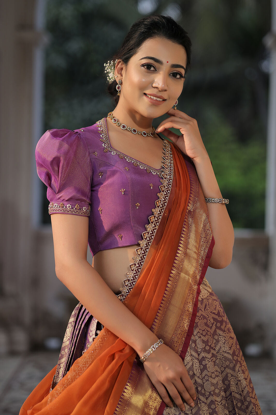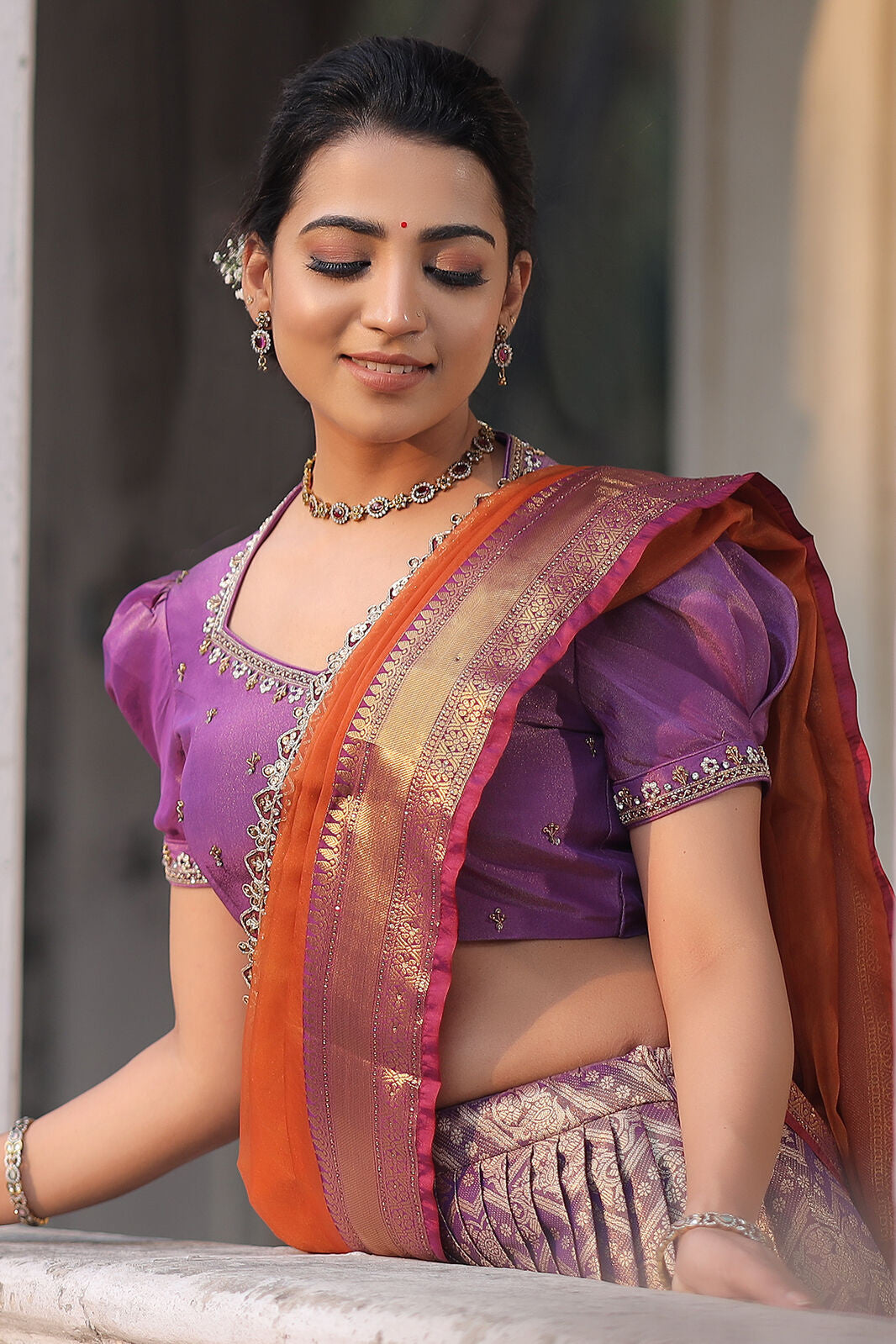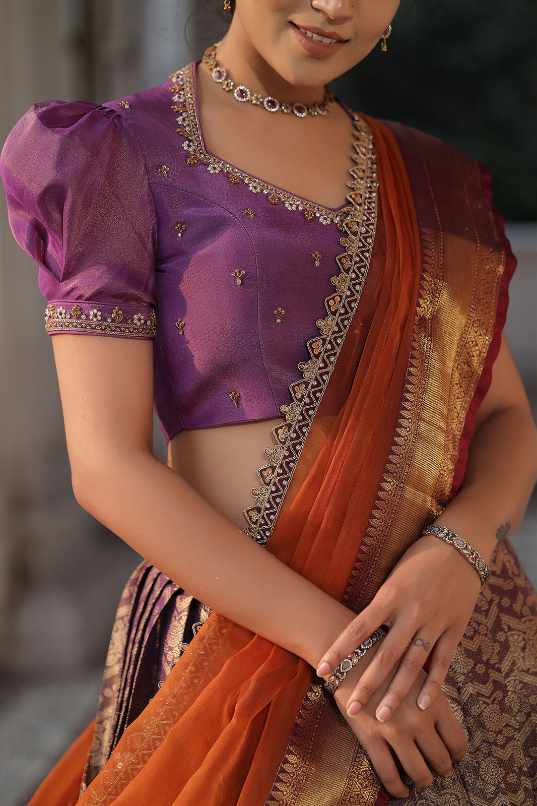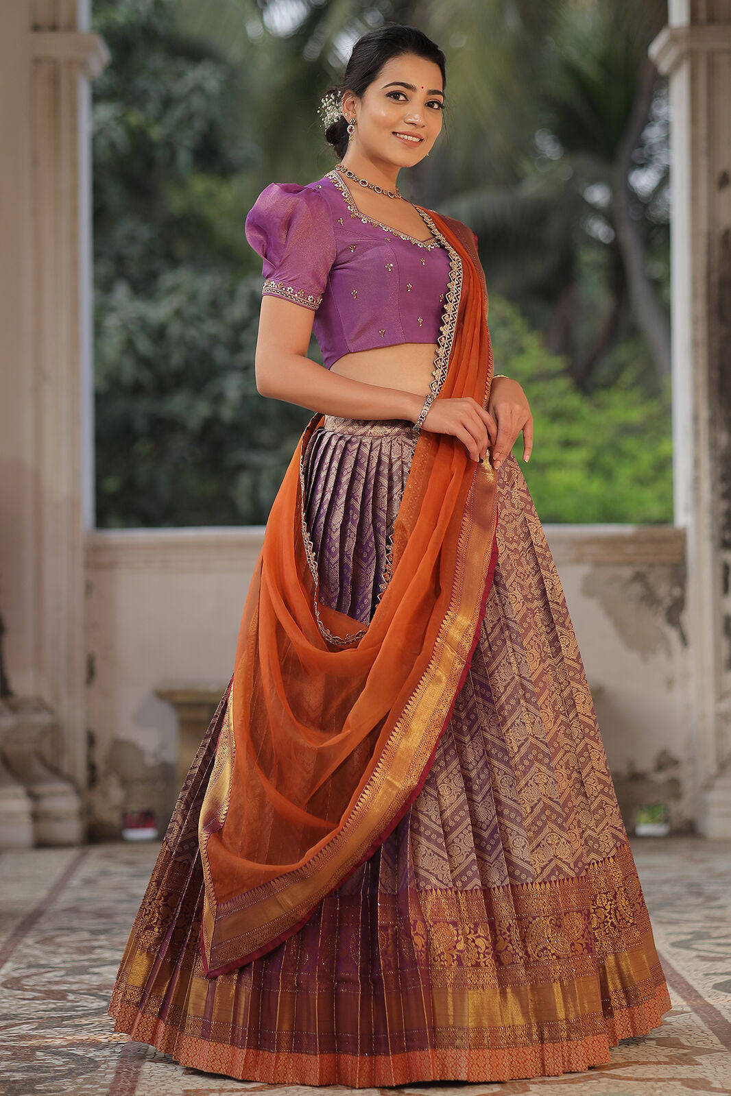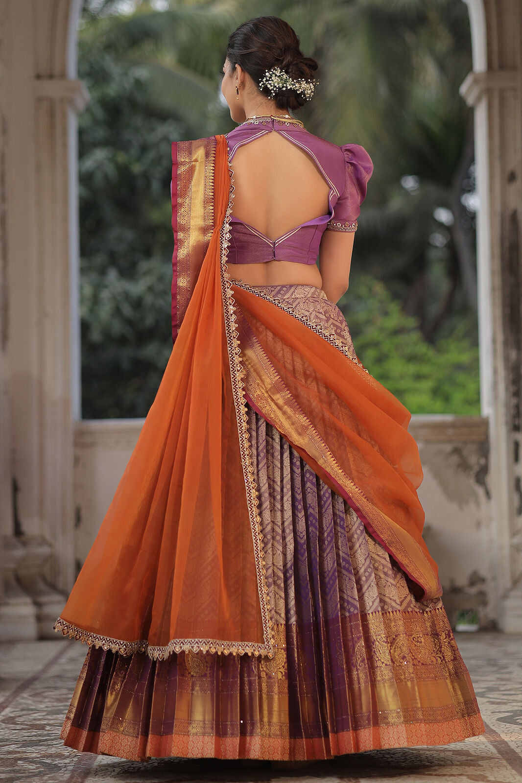 Do you need a beautiful and unique half saree for your next special occasion? Look no further than this lavender and orange Banarasi Silk lehenga! This gorgeous blouse features a collared V-neckline and puff sleeves with lace detailing on the yoke and sleeves, and the fabric used for it is golden tissue silk. The back of this dress is surely a head-to-turn pattern. It is paired with an organza silk-bordered dupatta. Whether you’re attending a wedding, a party, or a family occasion, this Banarasi silk dress is a perfect choice.
