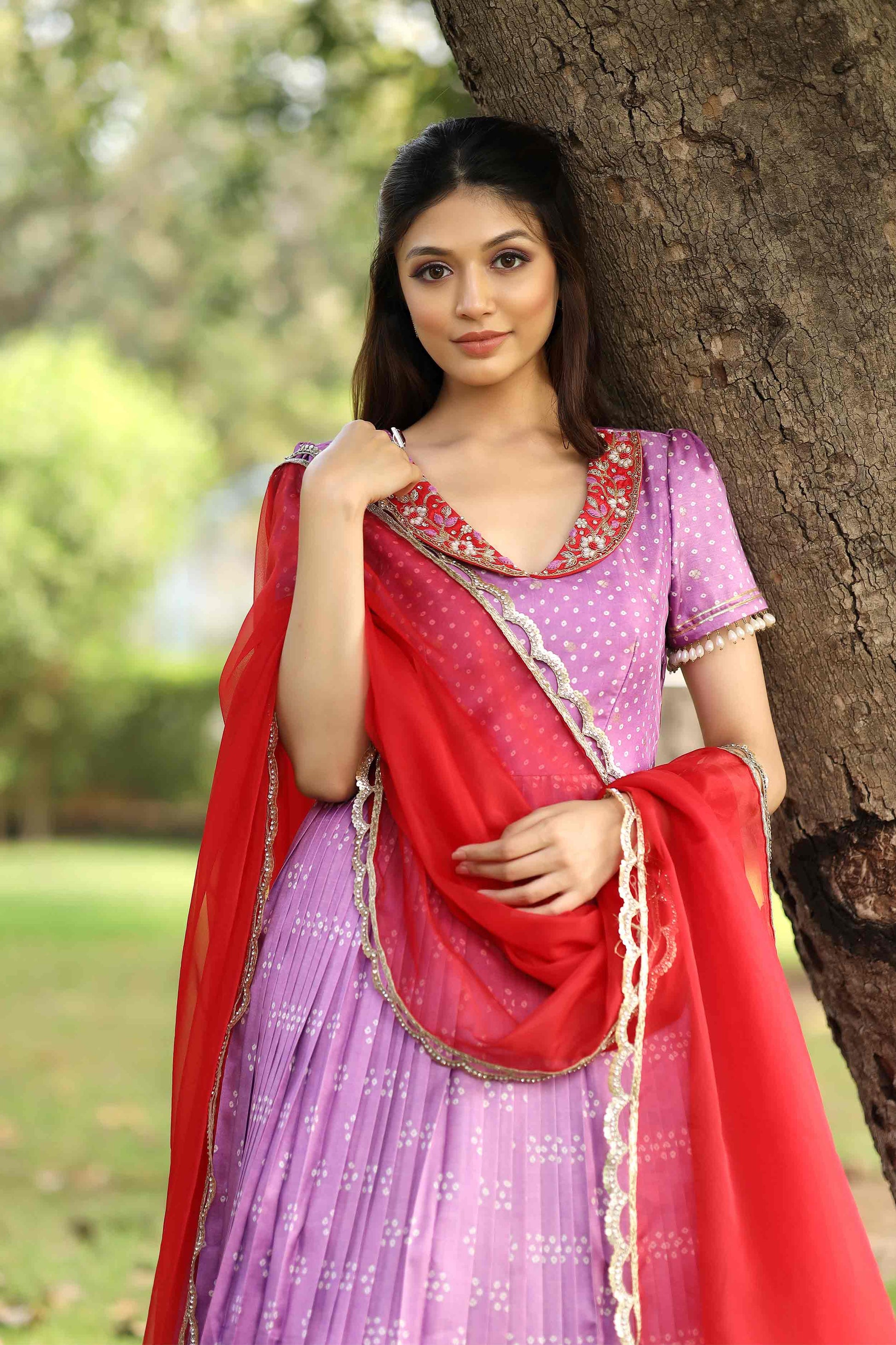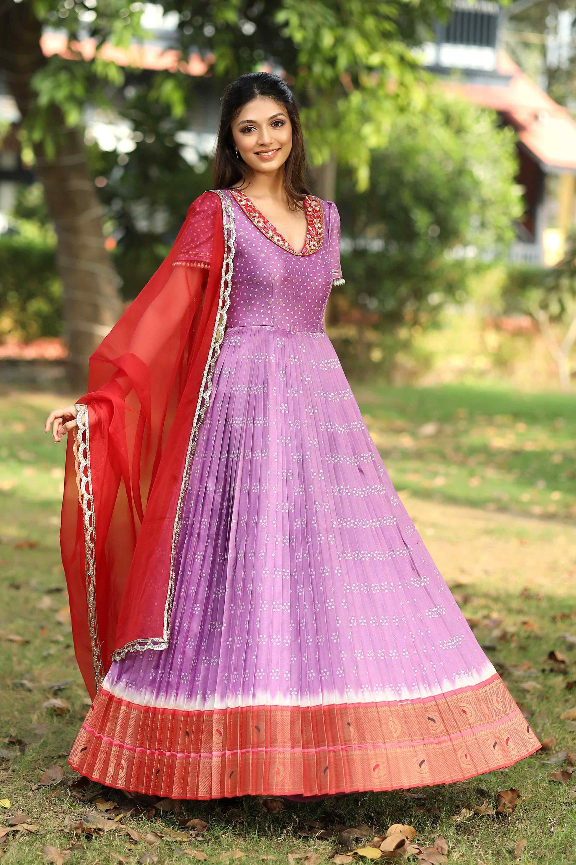 Meraki Lavender Bandhani Silk Pattu Dress PC748