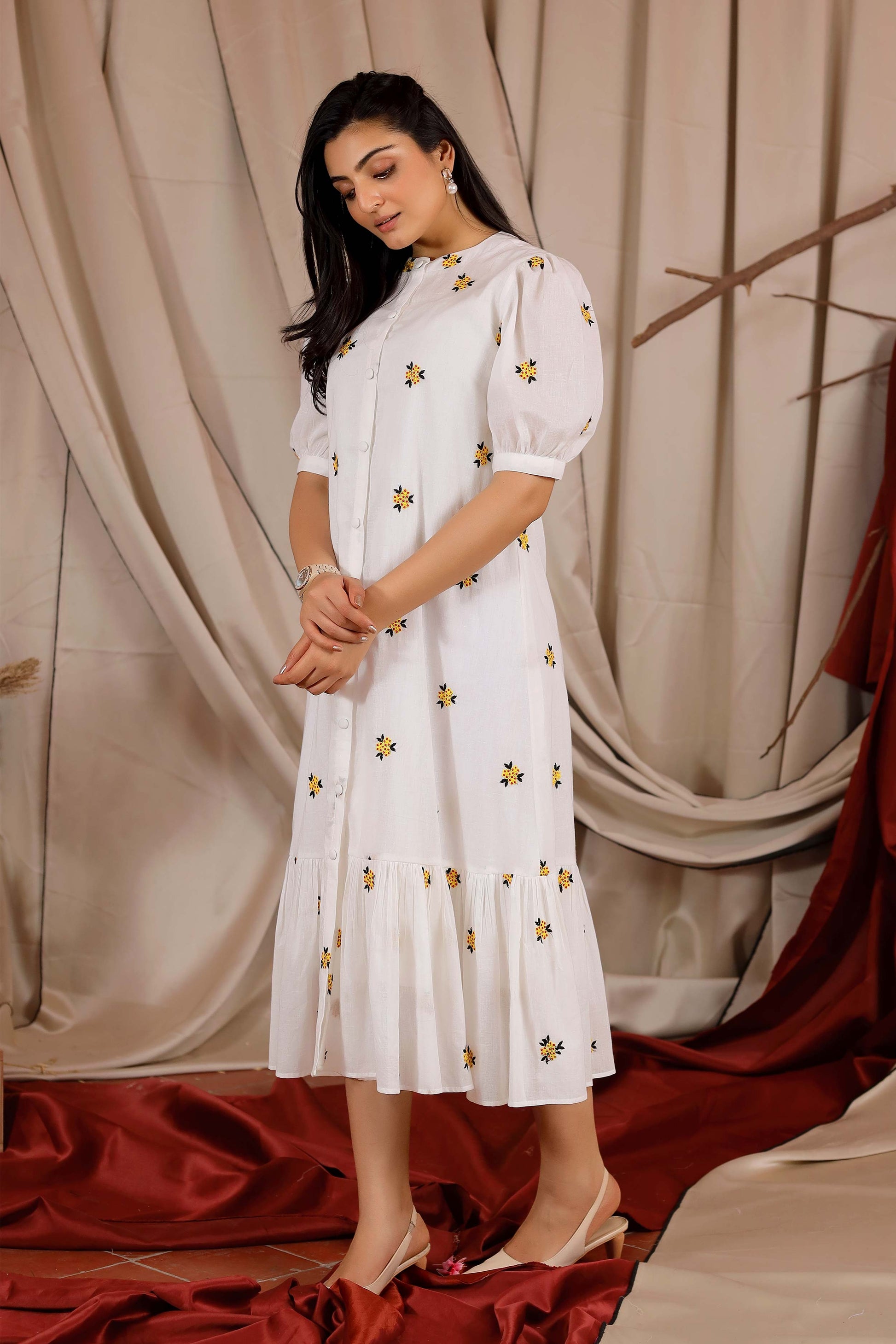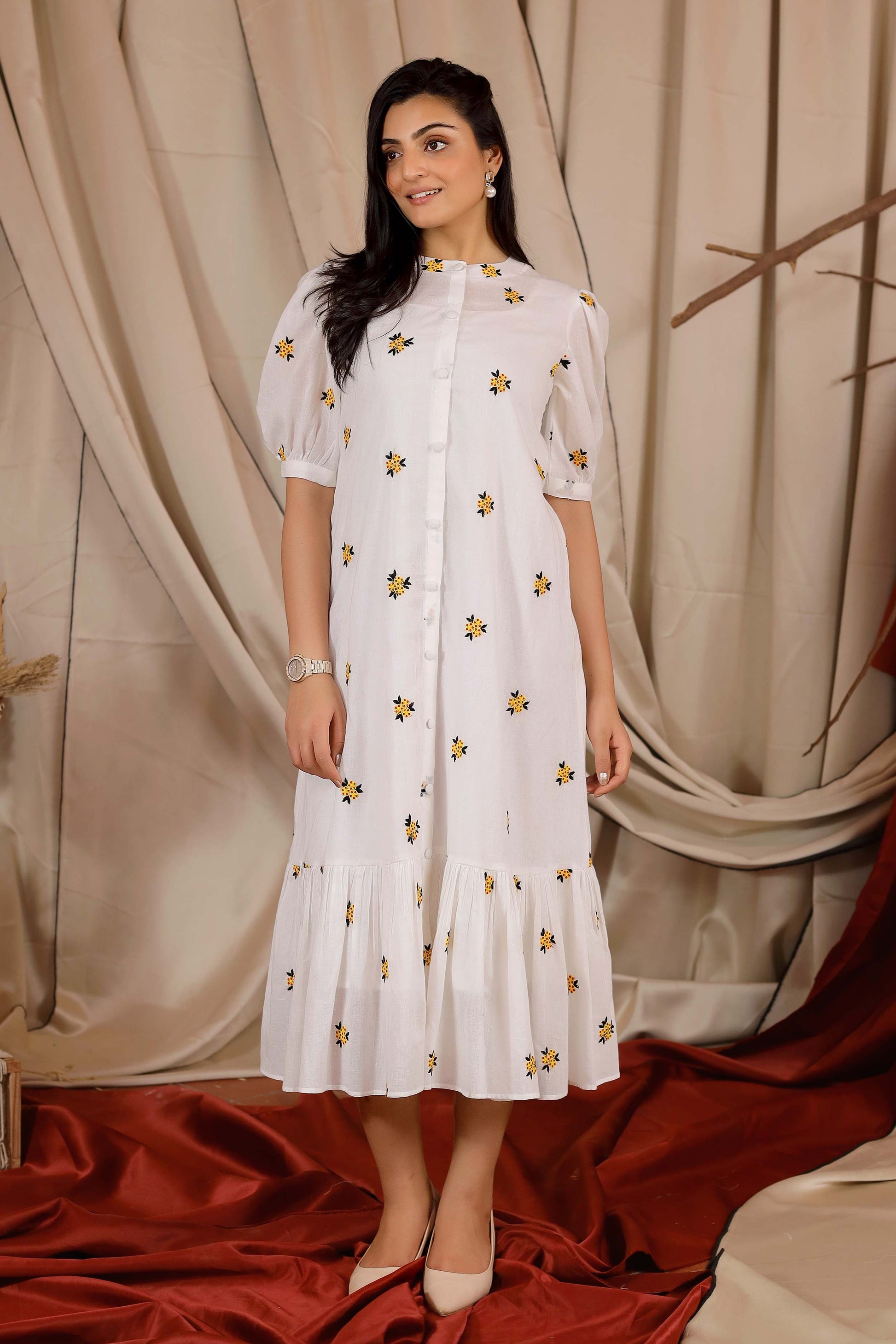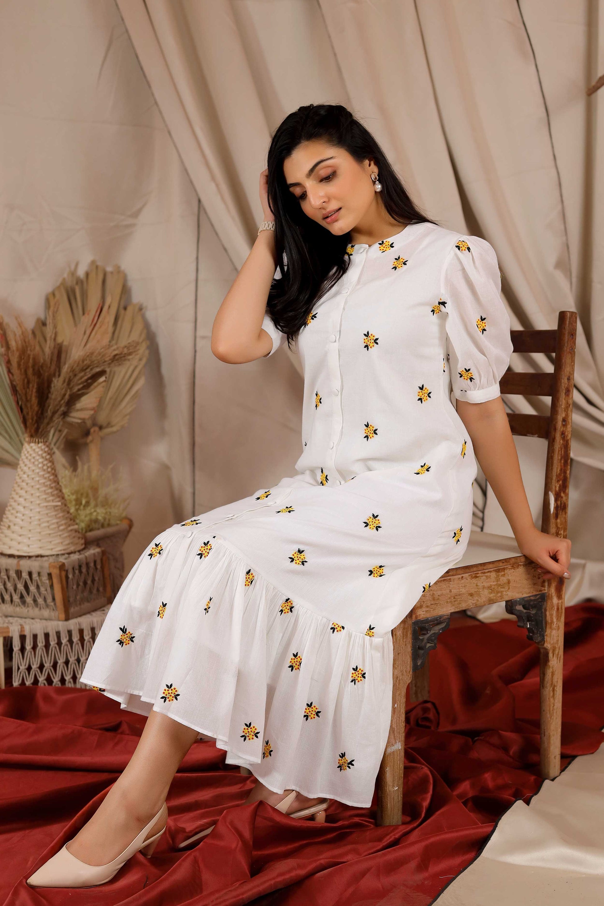 The Michael Maxi Summer Dress has Chinese Collar detailing with elbow puff sleeves. It is a straight-cut dress with front-opening button details. It features gathered pleats at the end for flair and striking floral embroidery all over.