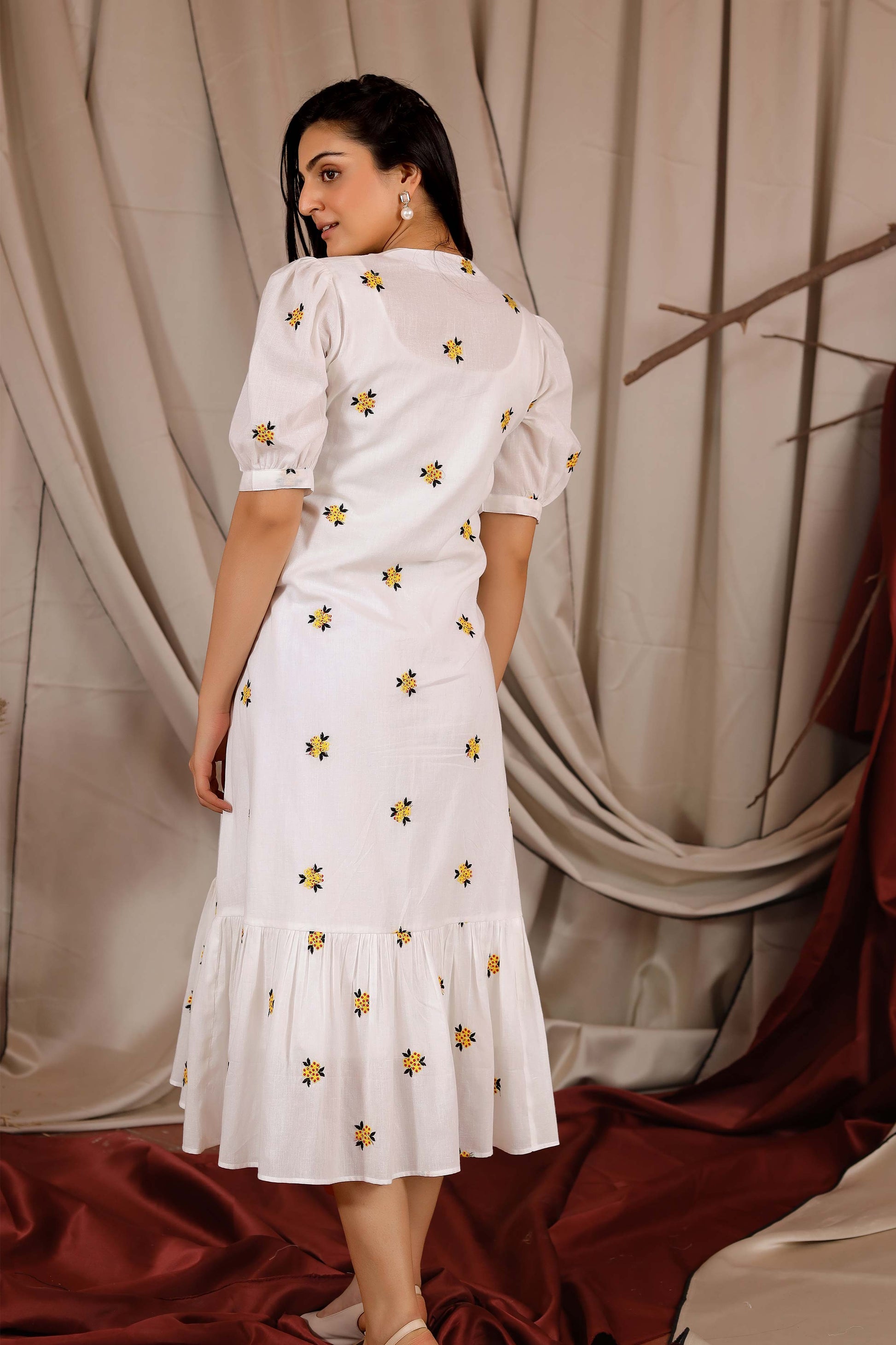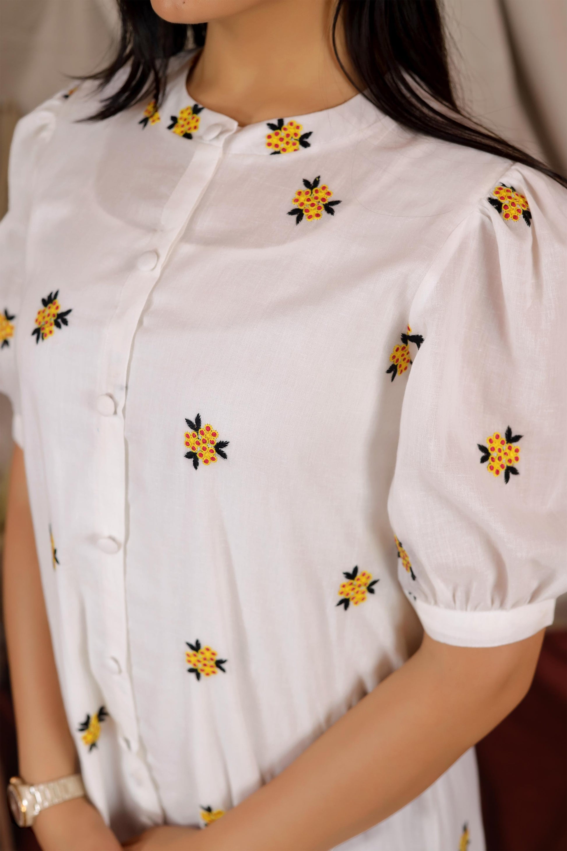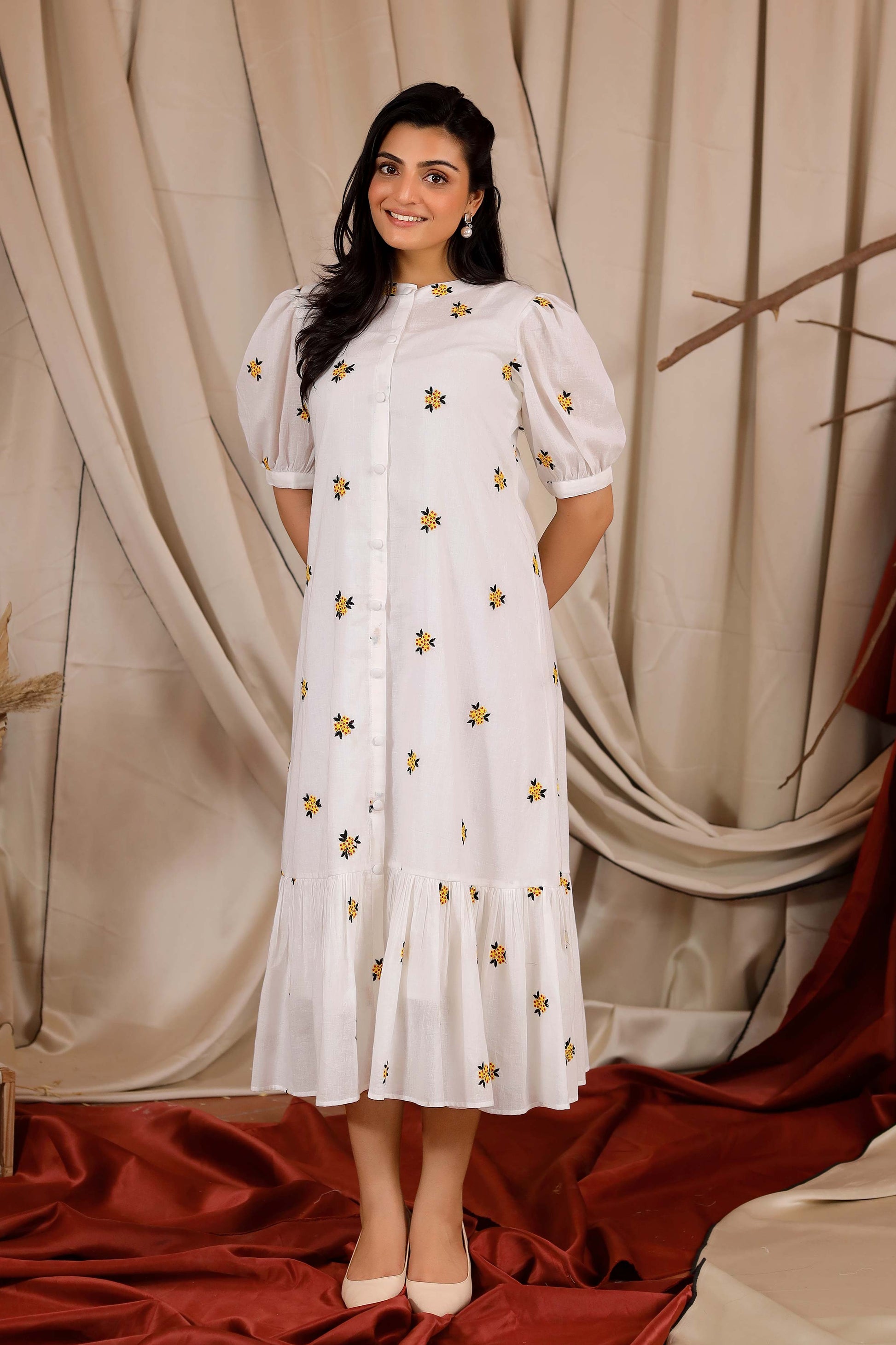 The Michael Maxi Summer Dress has Chinese Collar detailing with elbow puff sleeves. It is a straight-cut dress with front-opening button details. It features gathered pleats at the end for flair and striking floral embroidery all over.