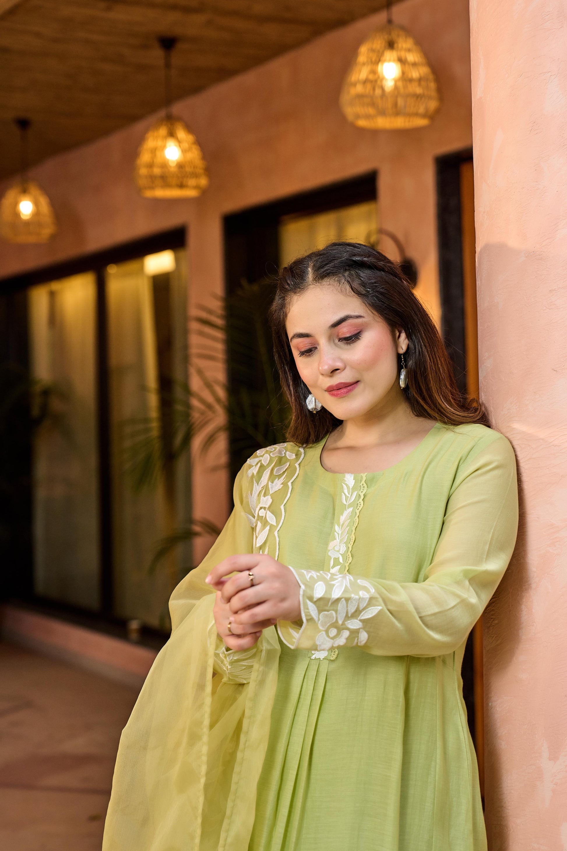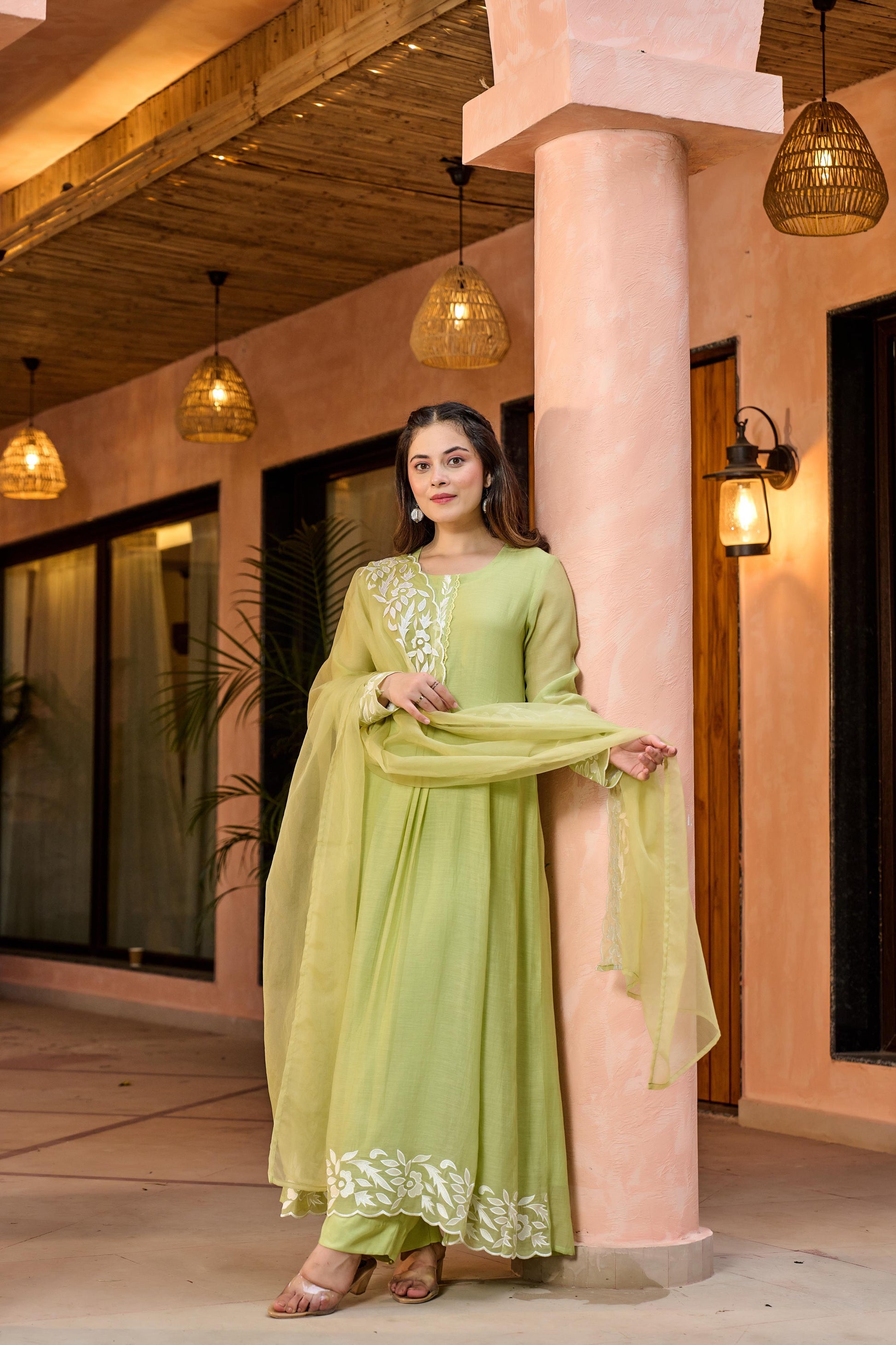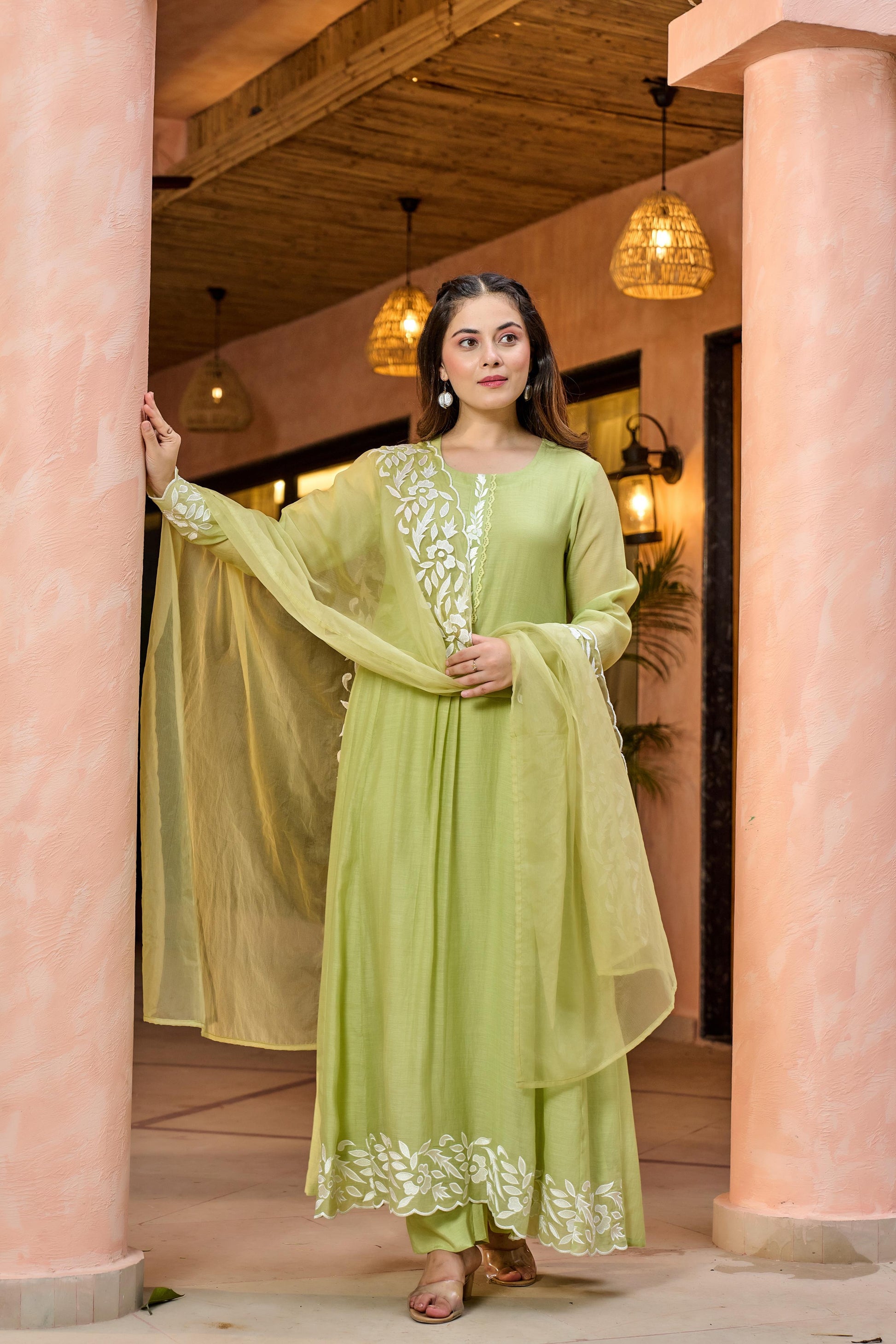 This three-piece suit set includes a pure mul Chanderi kurta with intricate embroidery on the neckline, ghera, and delicate applique work. It is paired with a fully embroidered organza dupatta and comfortable Shantoon pants to complete the look. Perfect for festive occasions and celebrations.