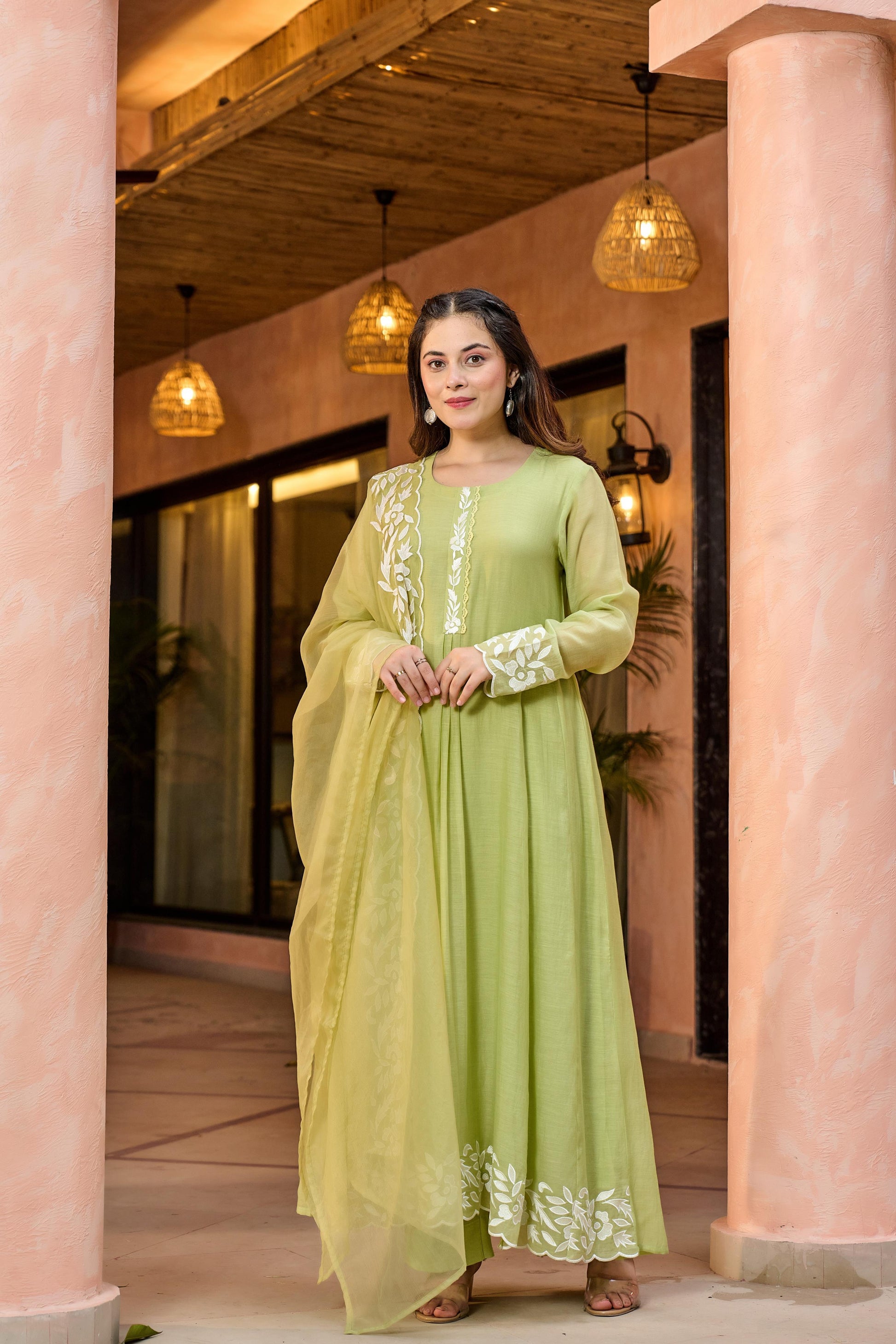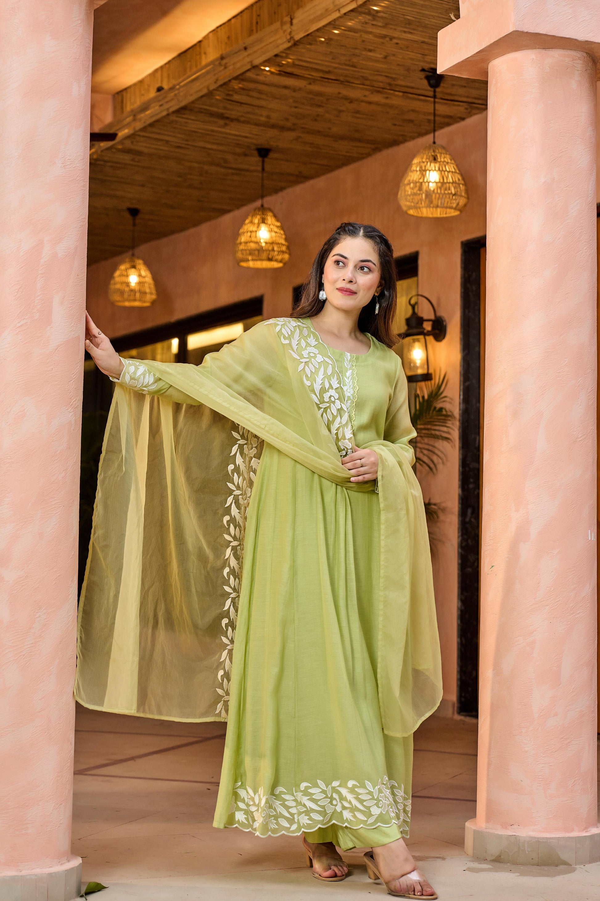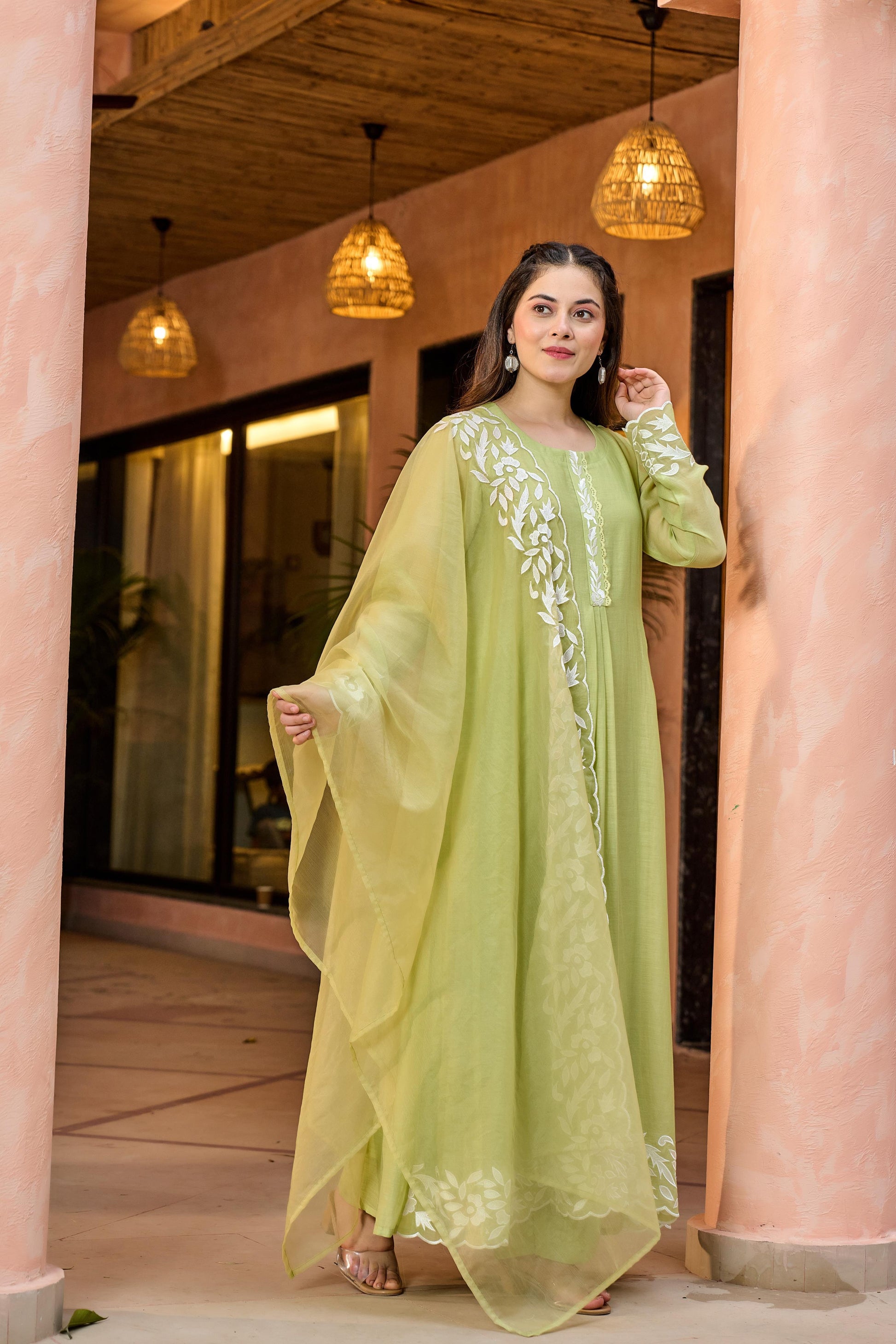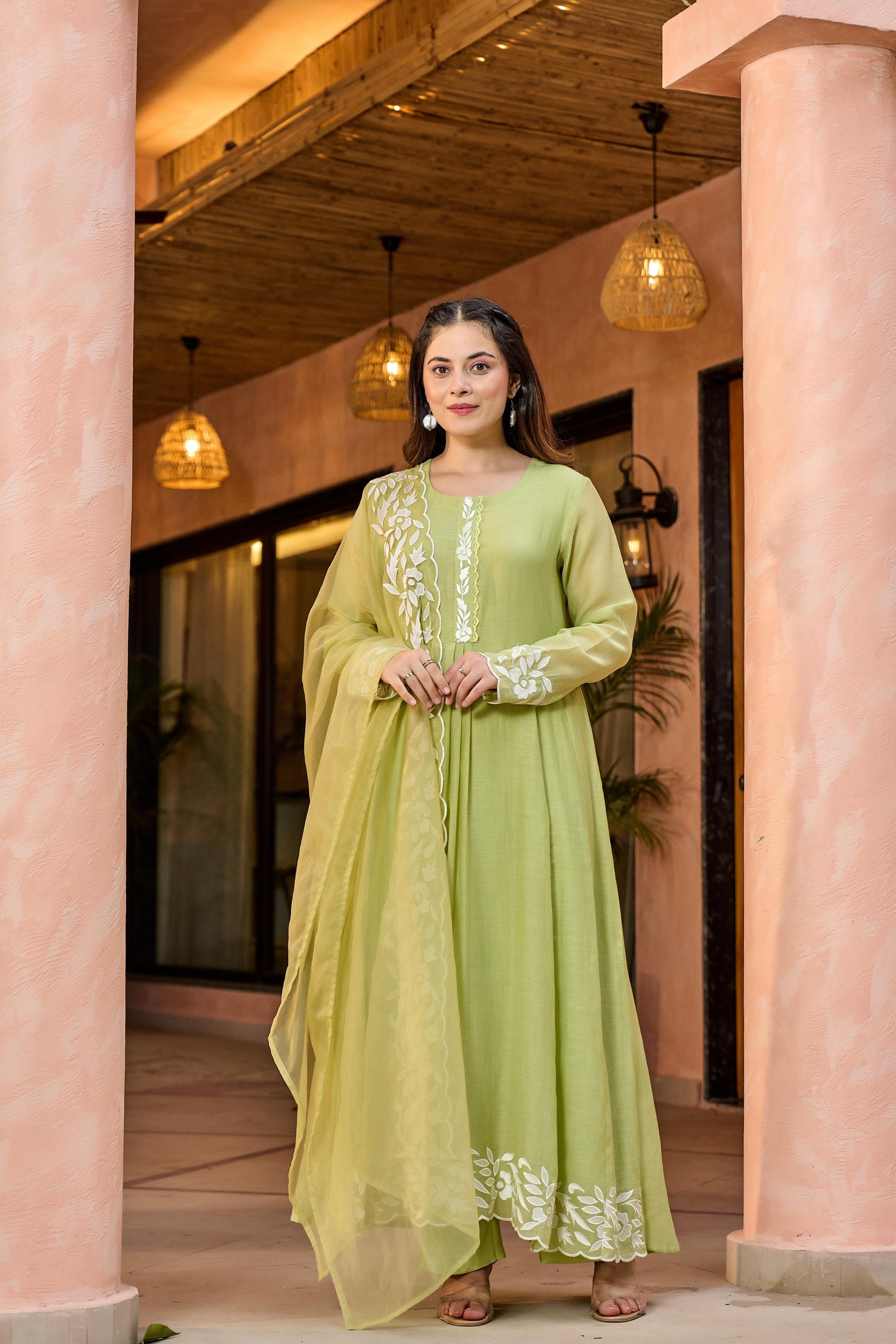 This three-piece suit set includes a pure mul Chanderi kurta with intricate embroidery on the neckline, ghera, and delicate applique work. It is paired with a fully embroidered organza dupatta and comfortable Shantoon pants to complete the look. Perfect for festive occasions and celebrations.