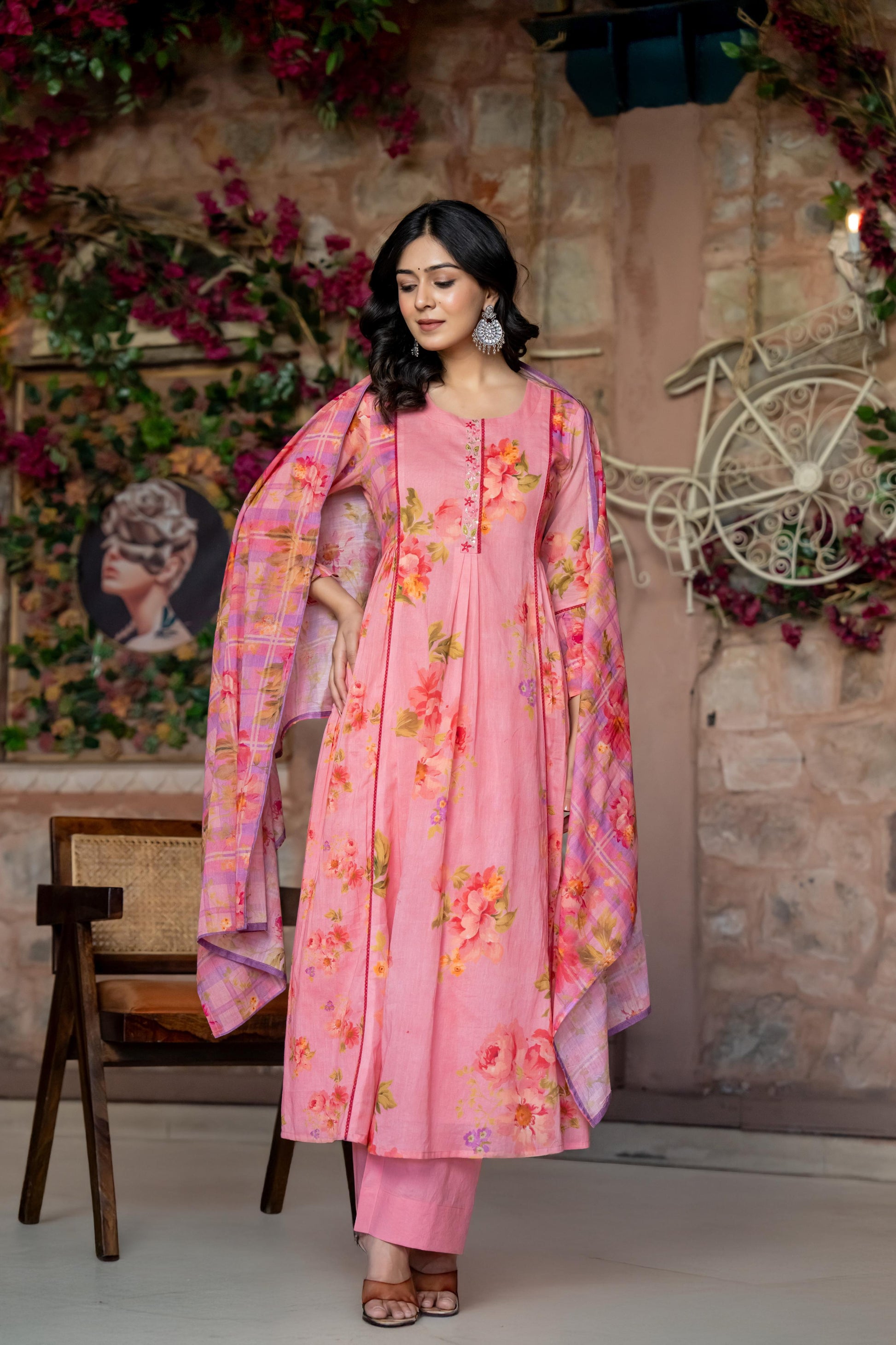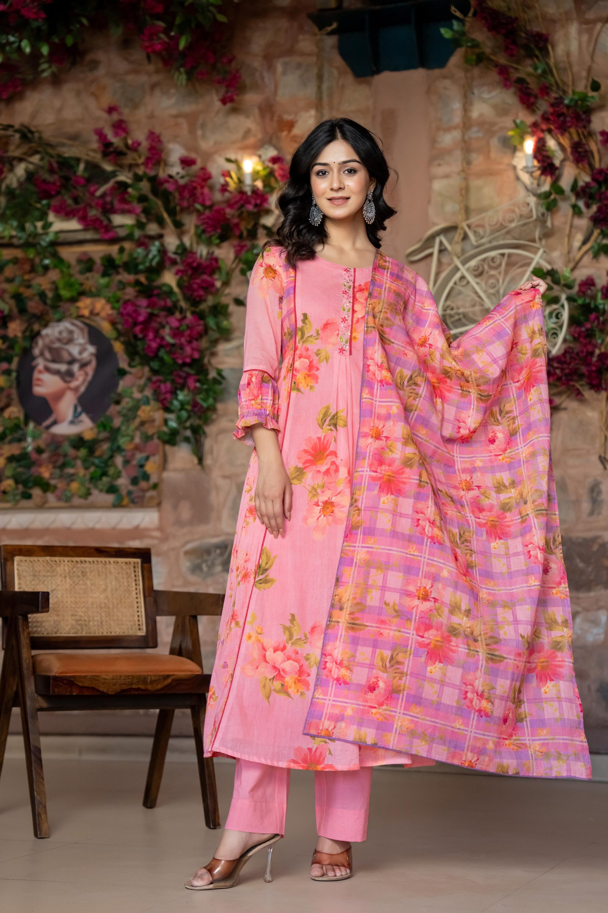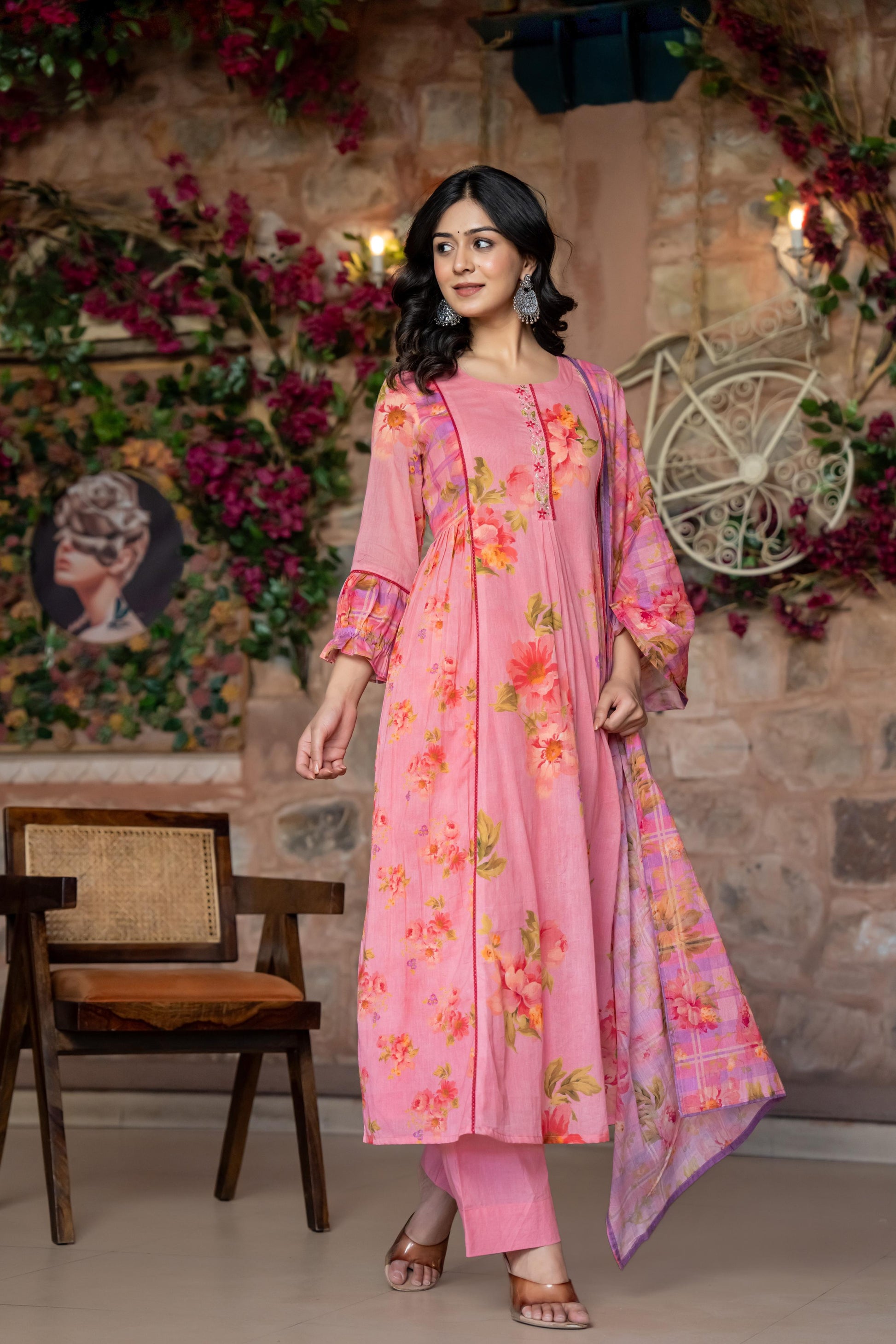 This stunning three-piece suit set features a Premium summer friendly mul cotton Flared Suit adorned with intricate crochet lace and beautiful print with additional detailing on the sleeves for a touch of elegance .It’s paired with a beautiful Dupatta, adding a graceful flow to the ensemble. To complete the look, the set includs pants, providing both comfort and style.