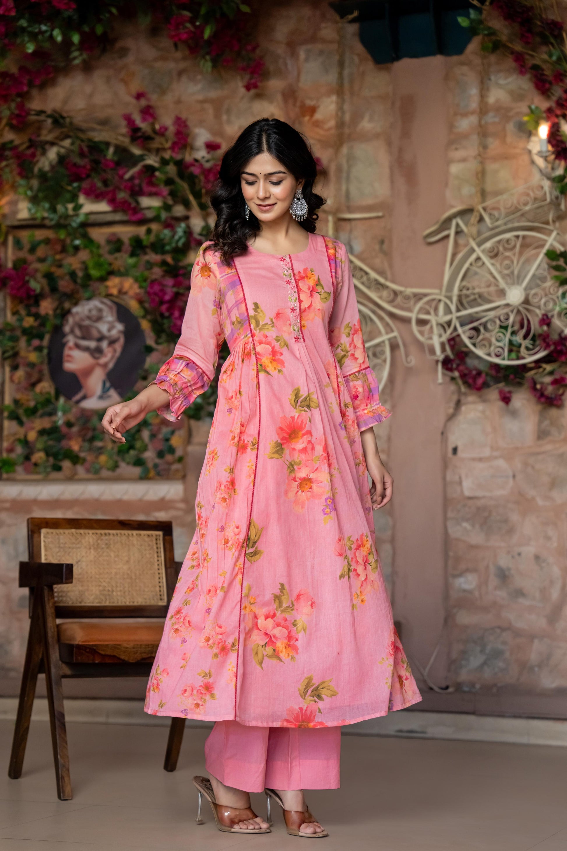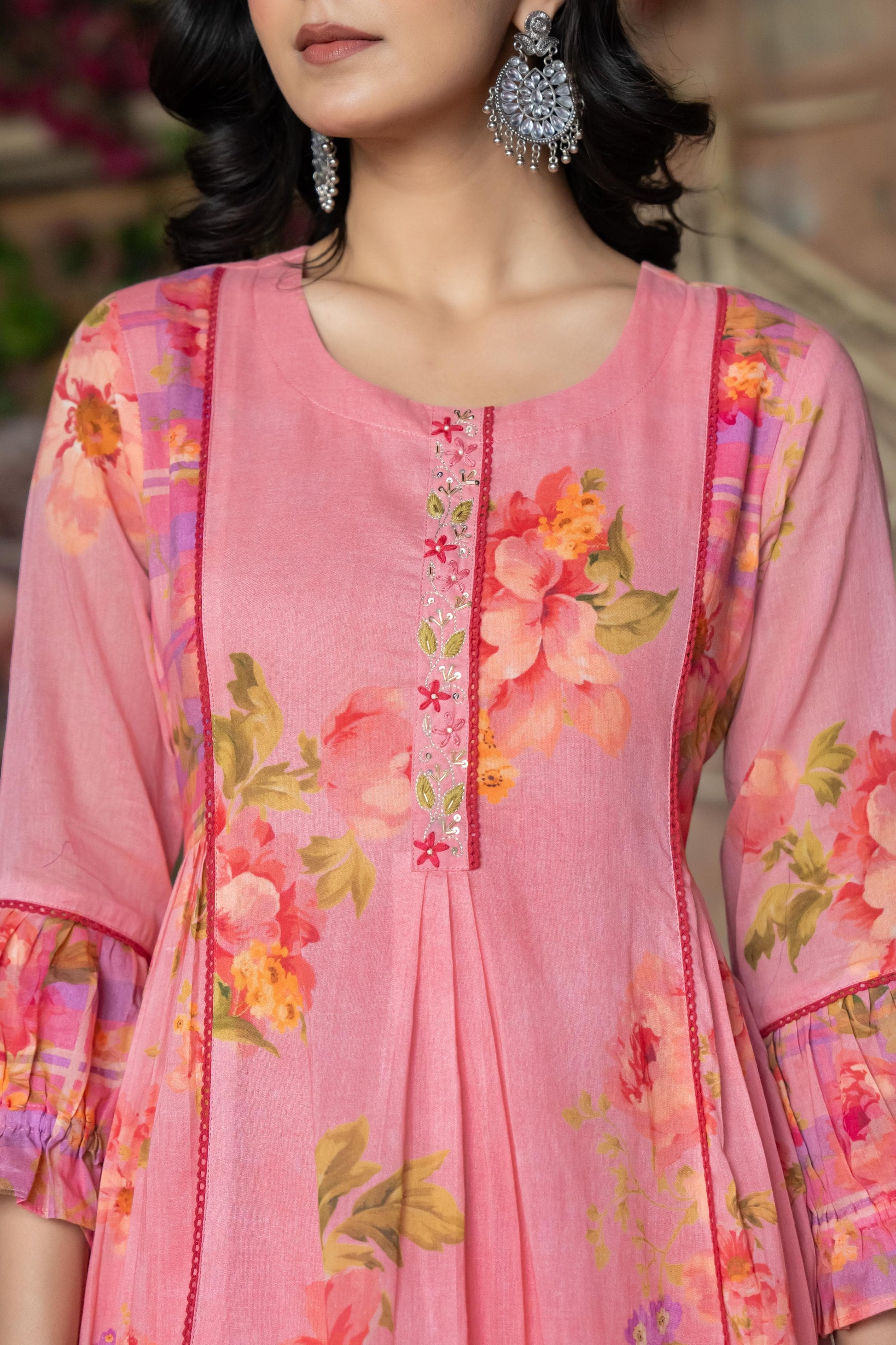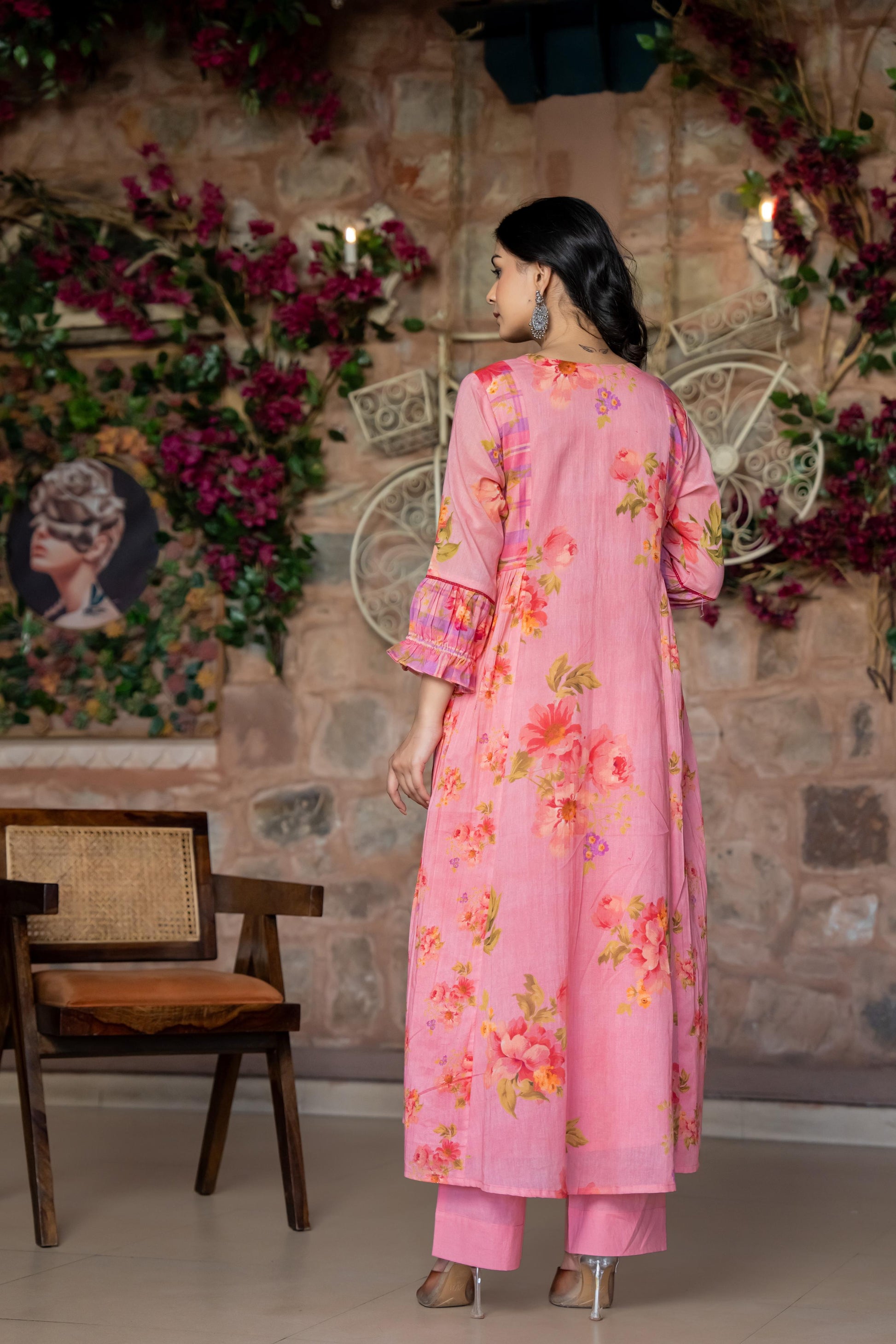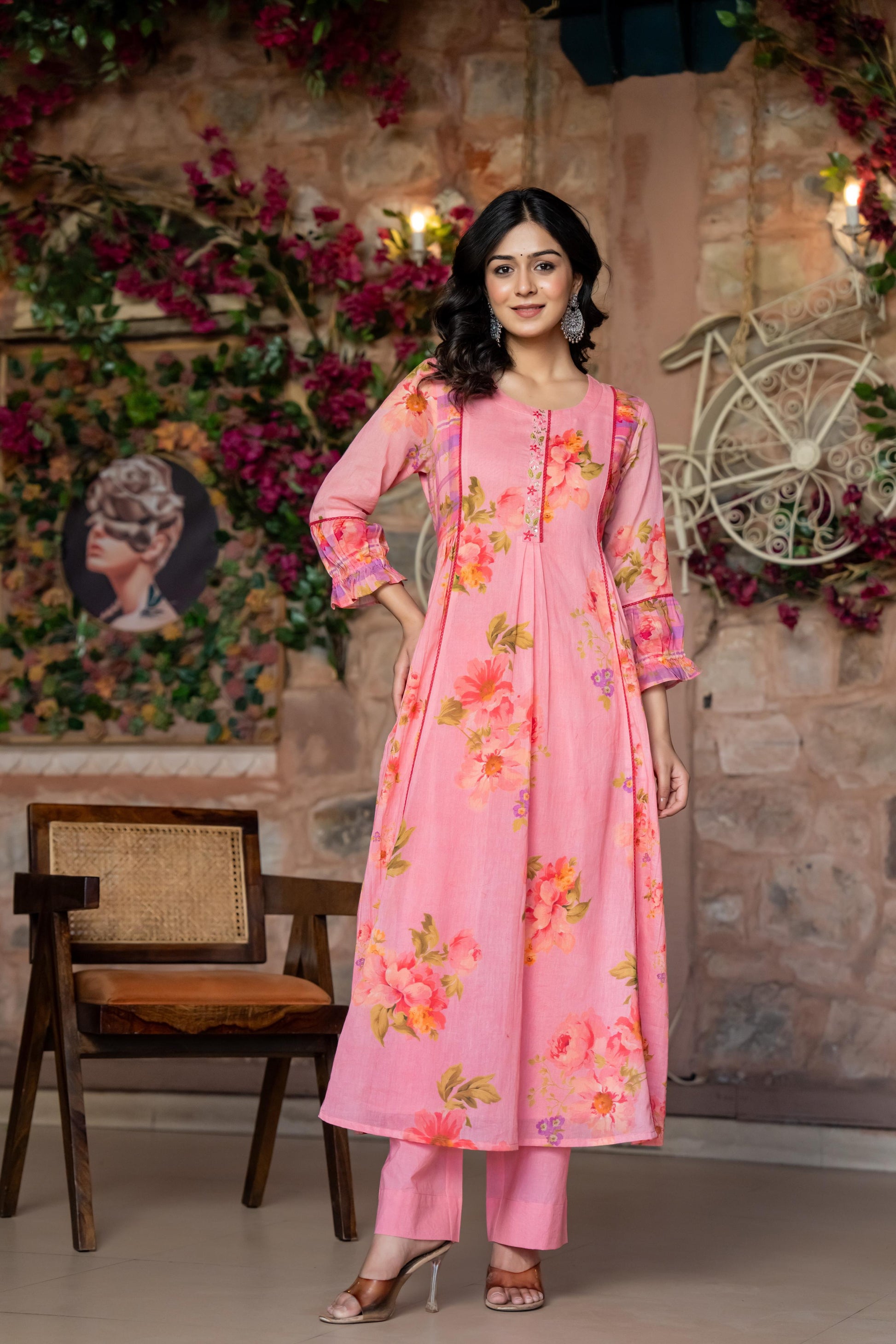 This stunning three-piece suit set features a Premium summer friendly mul cotton Flared Suit adorned with intricate crochet lace and beautiful print with additional detailing on the sleeves for a touch of elegance .It’s paired with a beautiful Dupatta, adding a graceful flow to the ensemble. To complete the look, the set includs pants, providing both comfort and style.