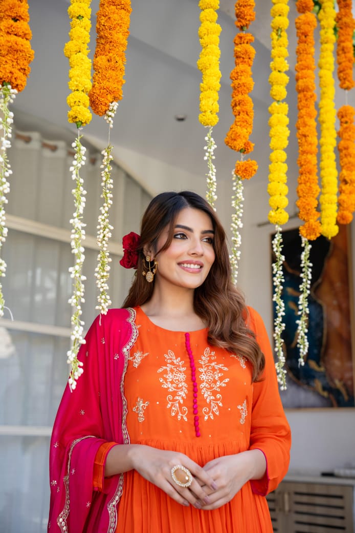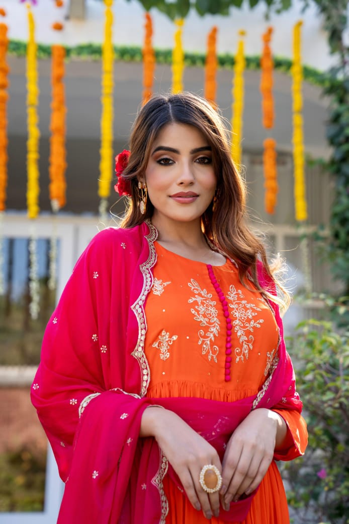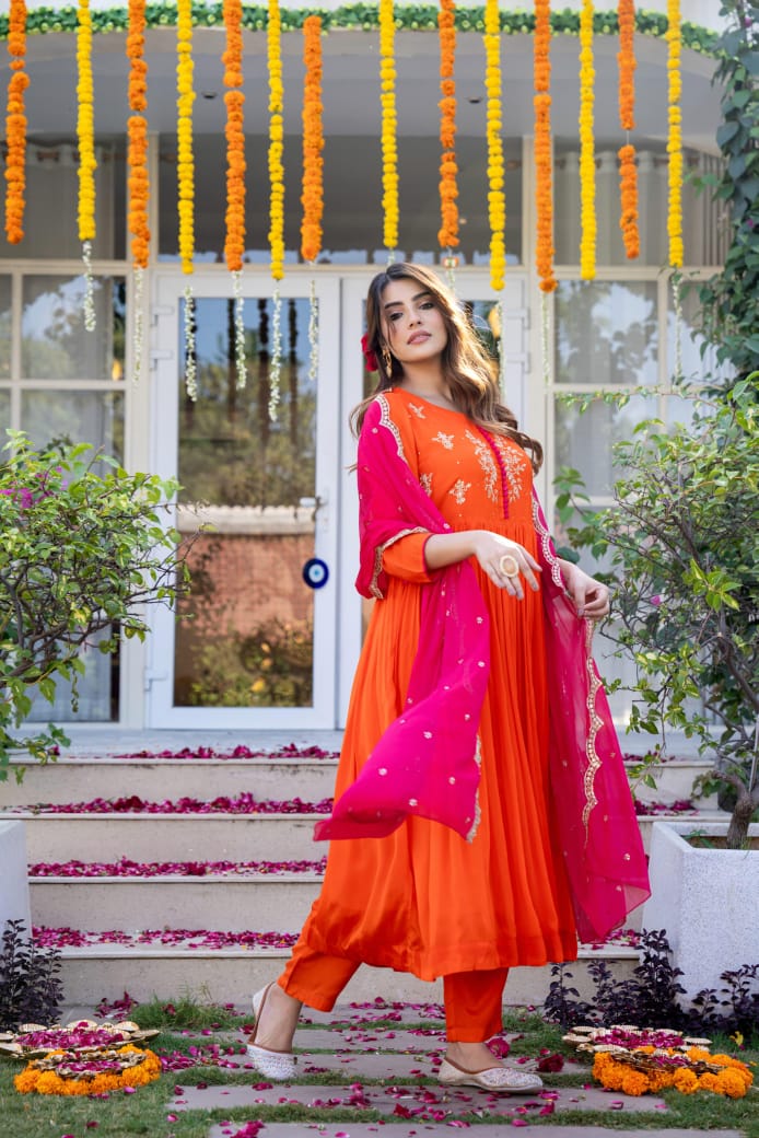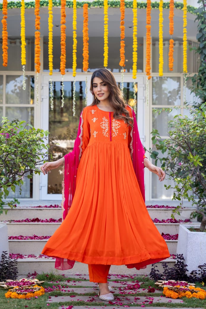 This stunning three-piece suit set features a Pure chinnon Flared Suit adorned with intricate handwork & embroidery with additional detailing on the sleeves for a touch of elegance.It’s paired with a beautiful scallop Dupatta, adding a graceful flow to the ensemble. To complete the look, the set includs pants, providing both comfort and style.