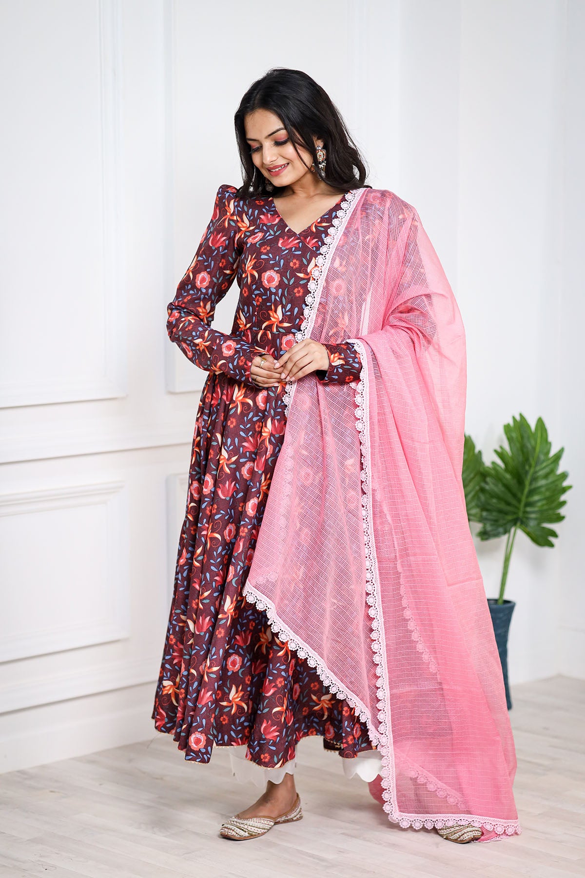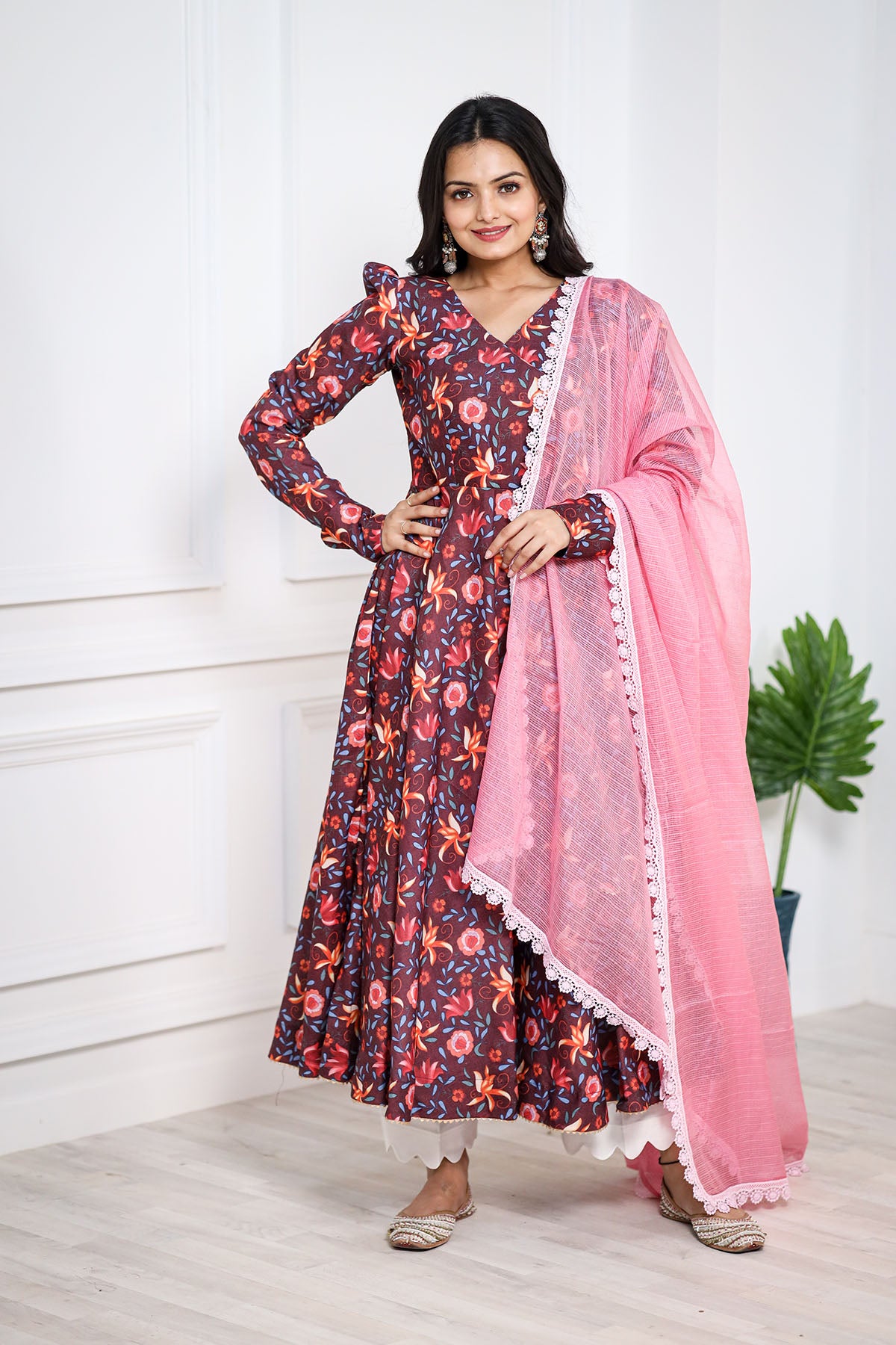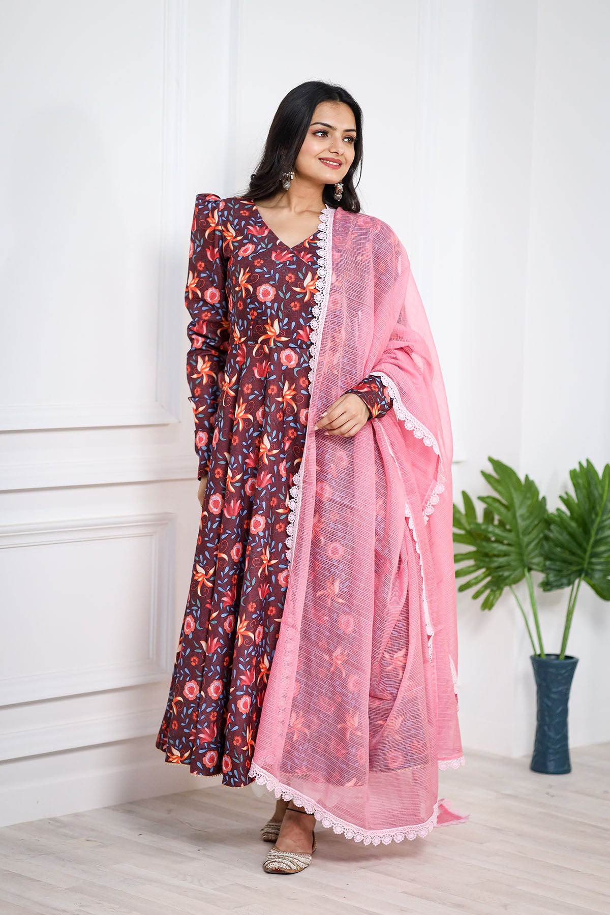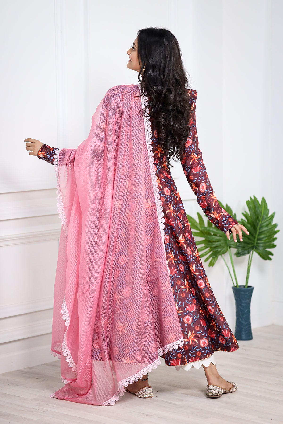 This stunning BROWN pashmina print is a treat to the eyes. We love the explosion of colors in the kurta that complement the kota doriya dupatta perfectly. This one's a must-have to celebrate and spread happy vibes around.