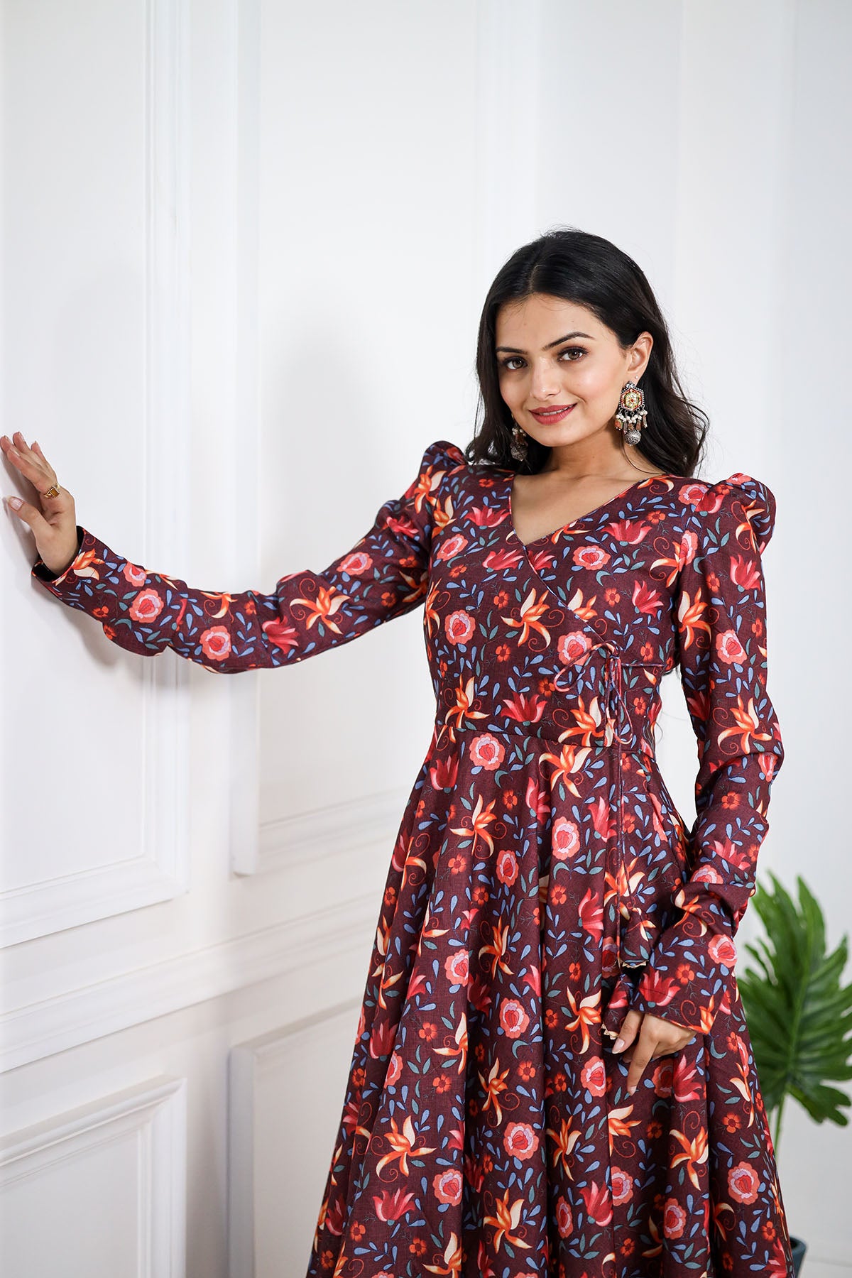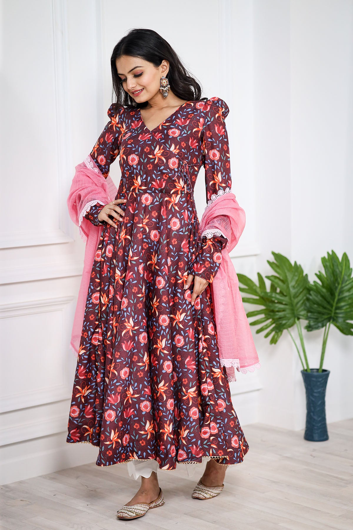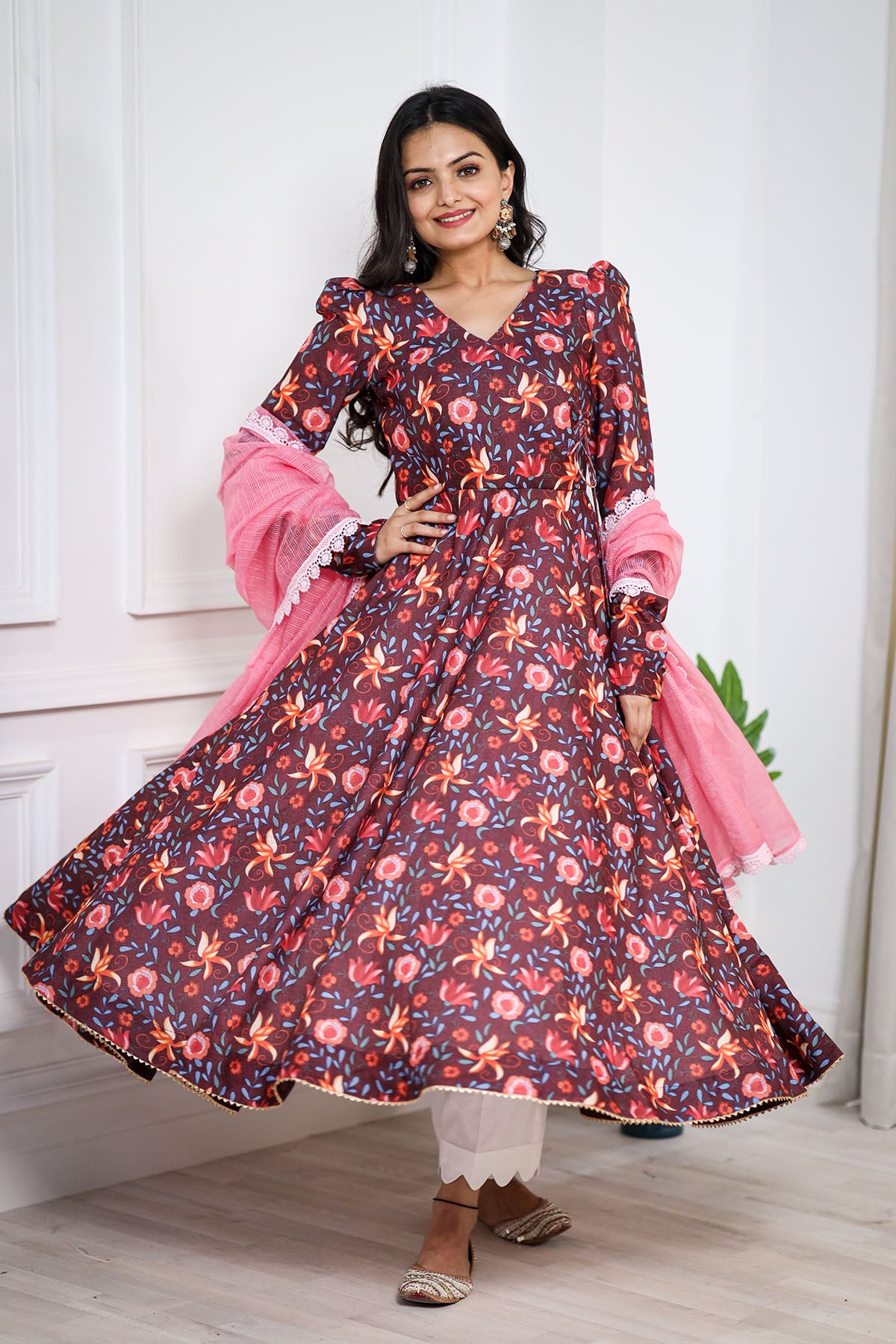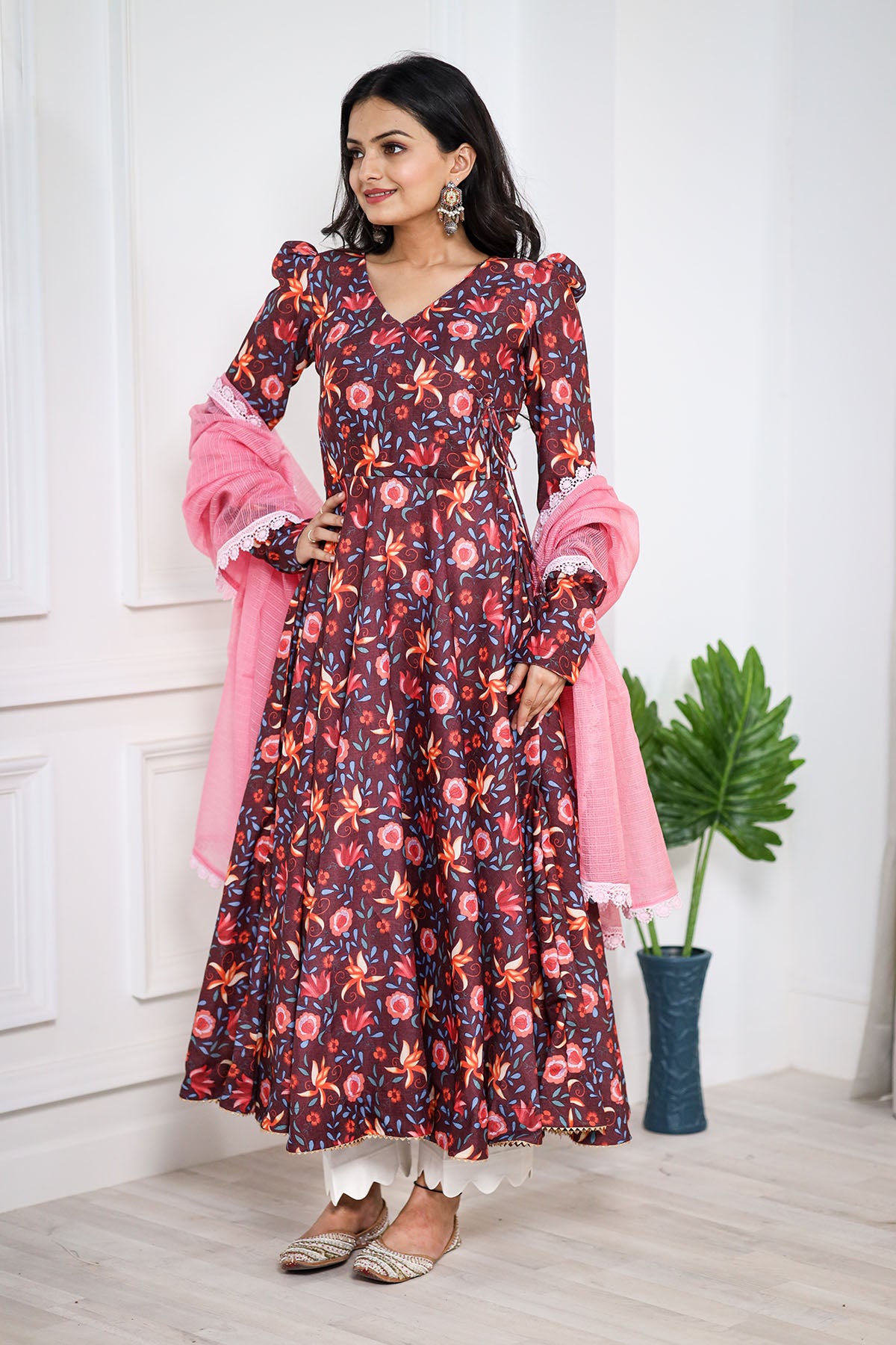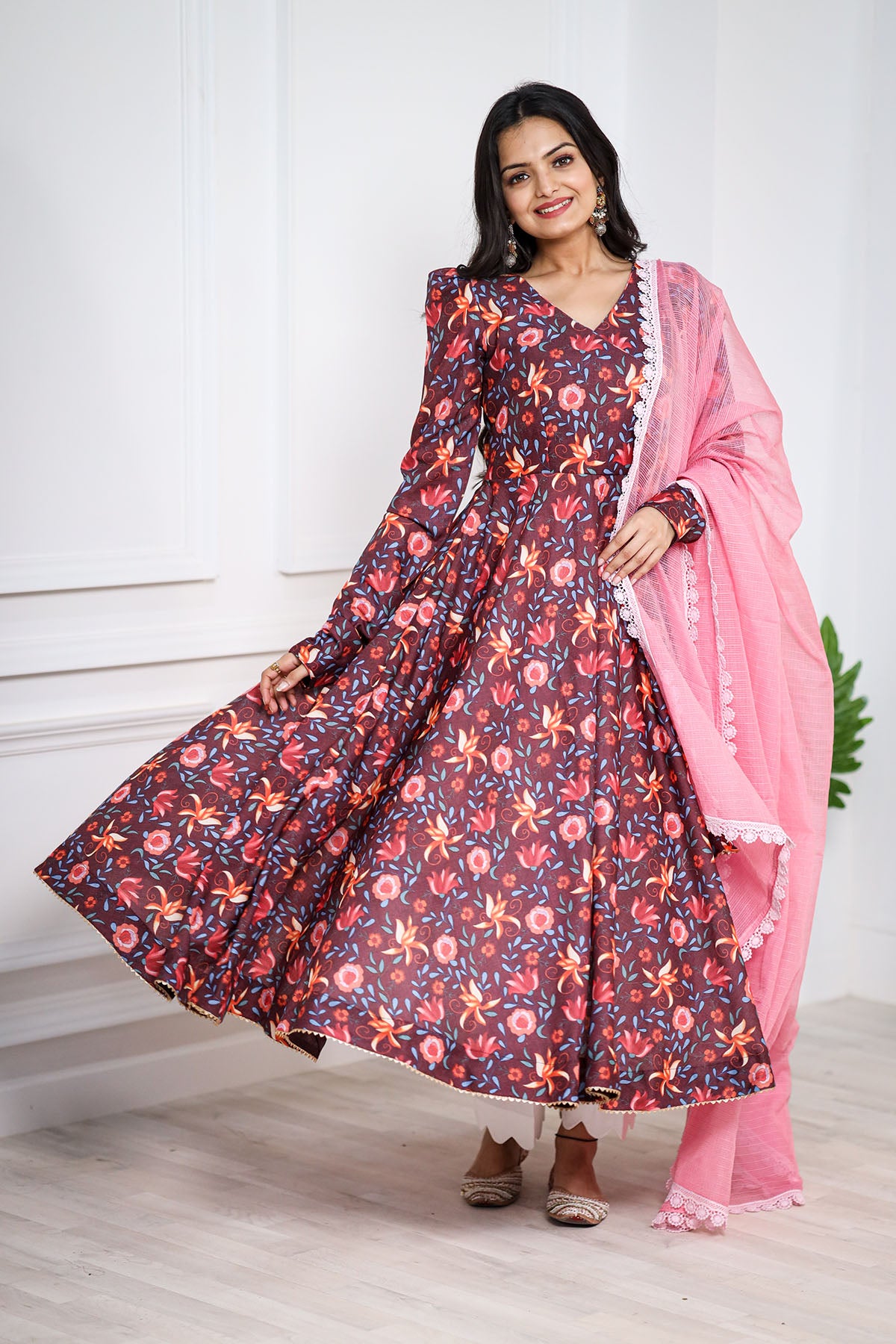 This stunning BROWN pashmina print is a treat to the eyes. We love the explosion of colors in the kurta that complement the kota doriya dupatta perfectly. This one's a must-have to celebrate and spread happy vibes around.