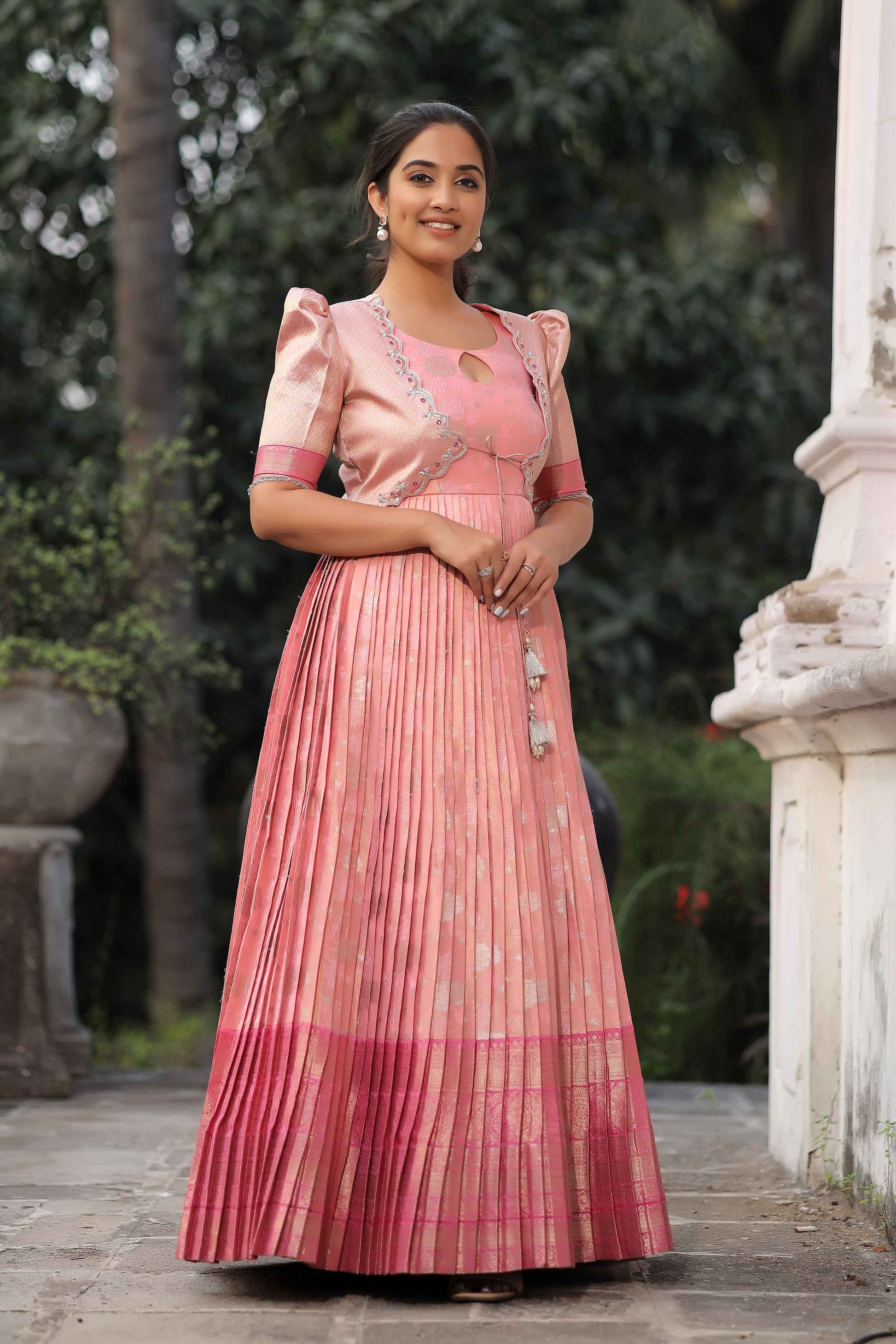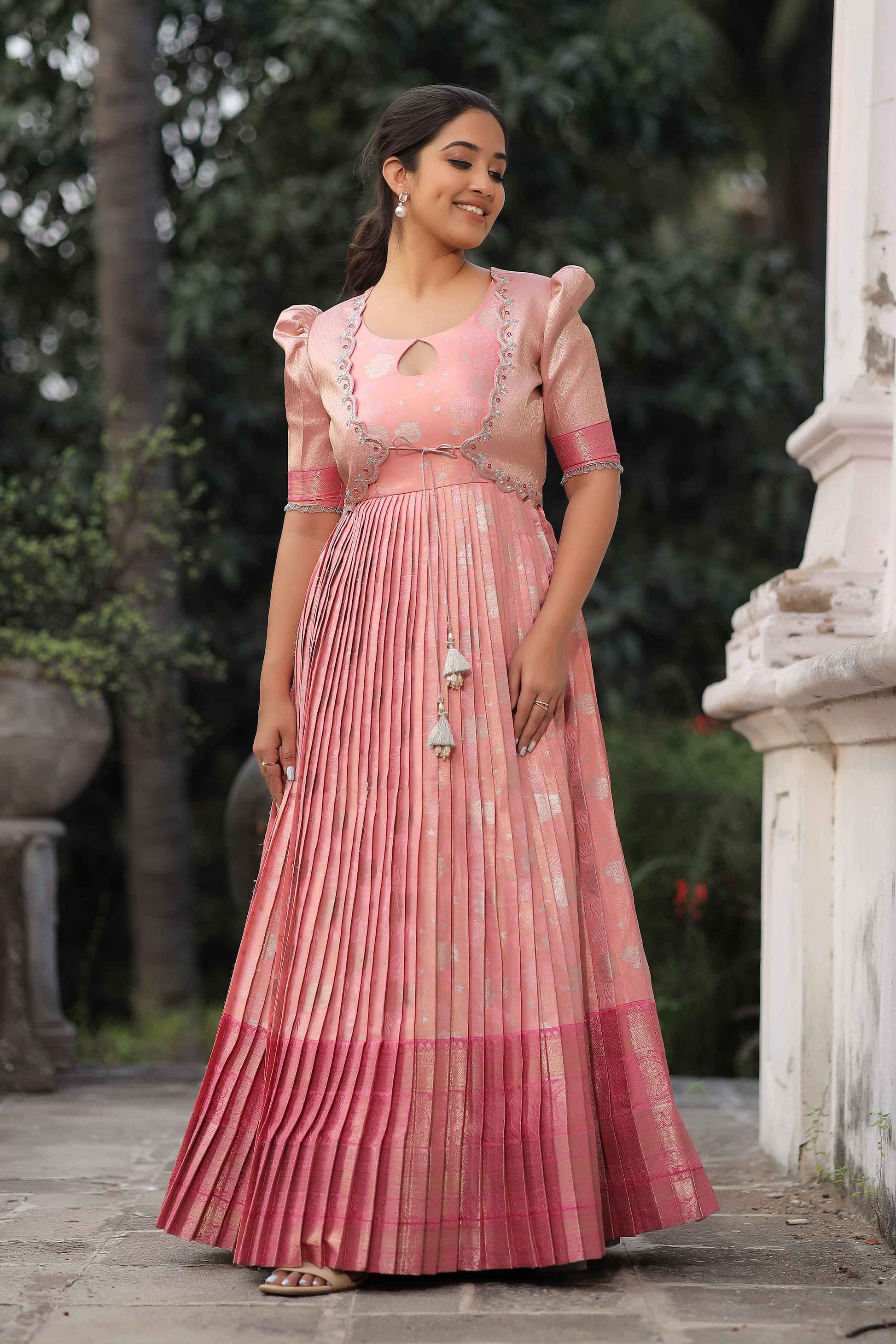 Indulge in the epitome of sophistication and luxury with our Pink Blooming Jacket Silk Long Frock, adorned with a Detachable Jacket handcrafted with exquisite embroidery, jardoshi, and mirror work. This ensemble celebrates timeless elegance and artisanal craftsmanship, meticulously designed to make you the epitome of grace and charm.