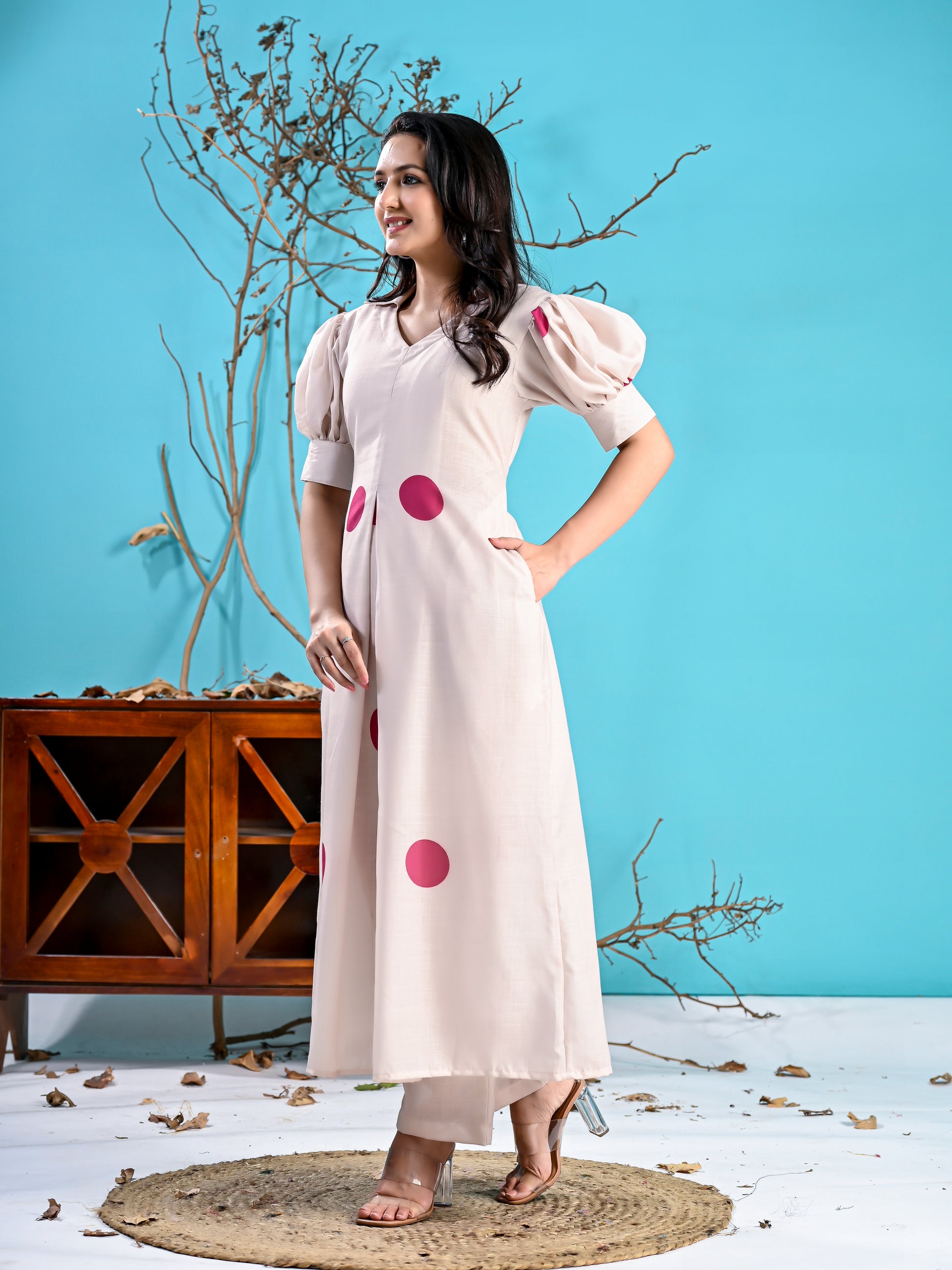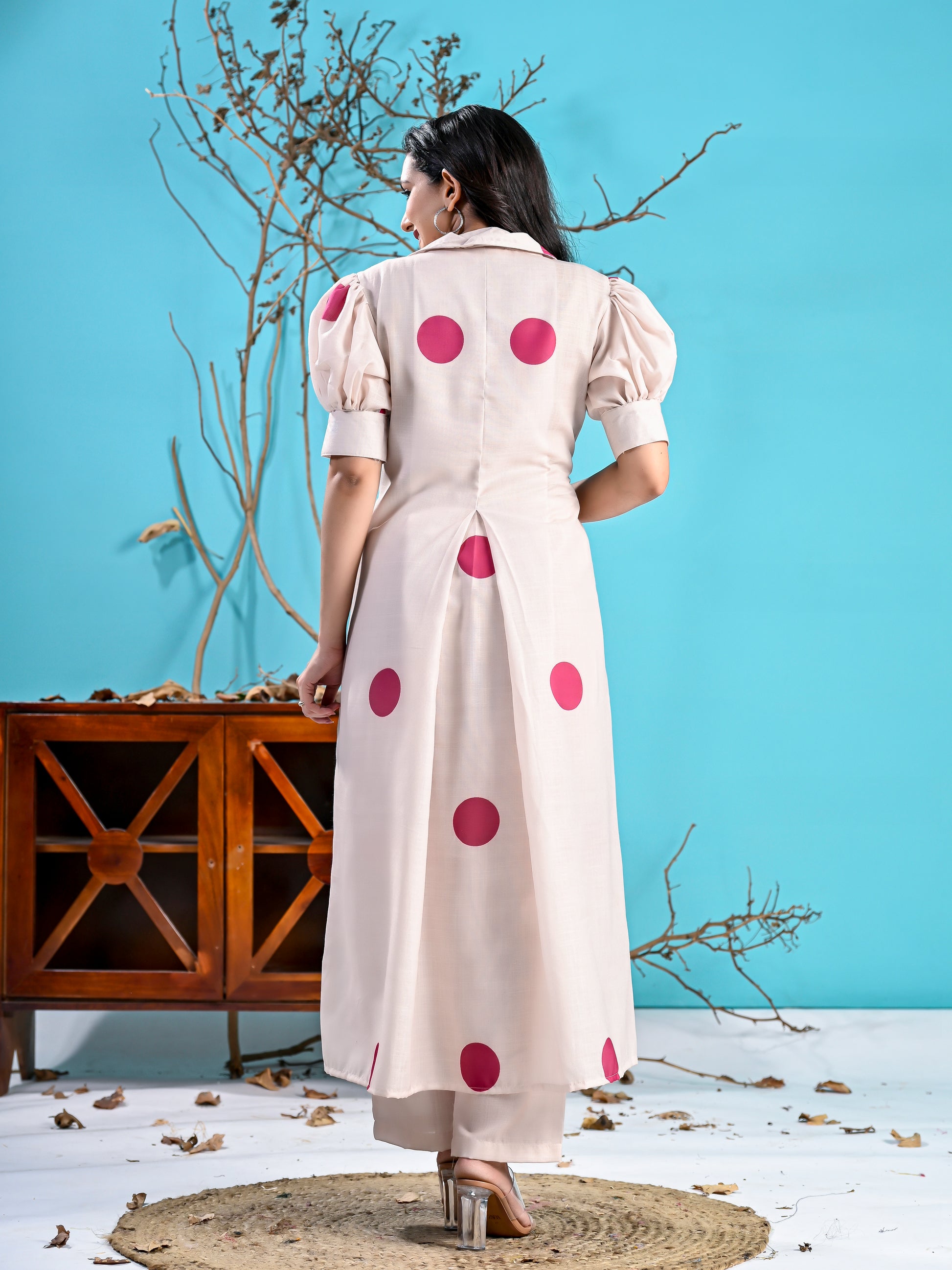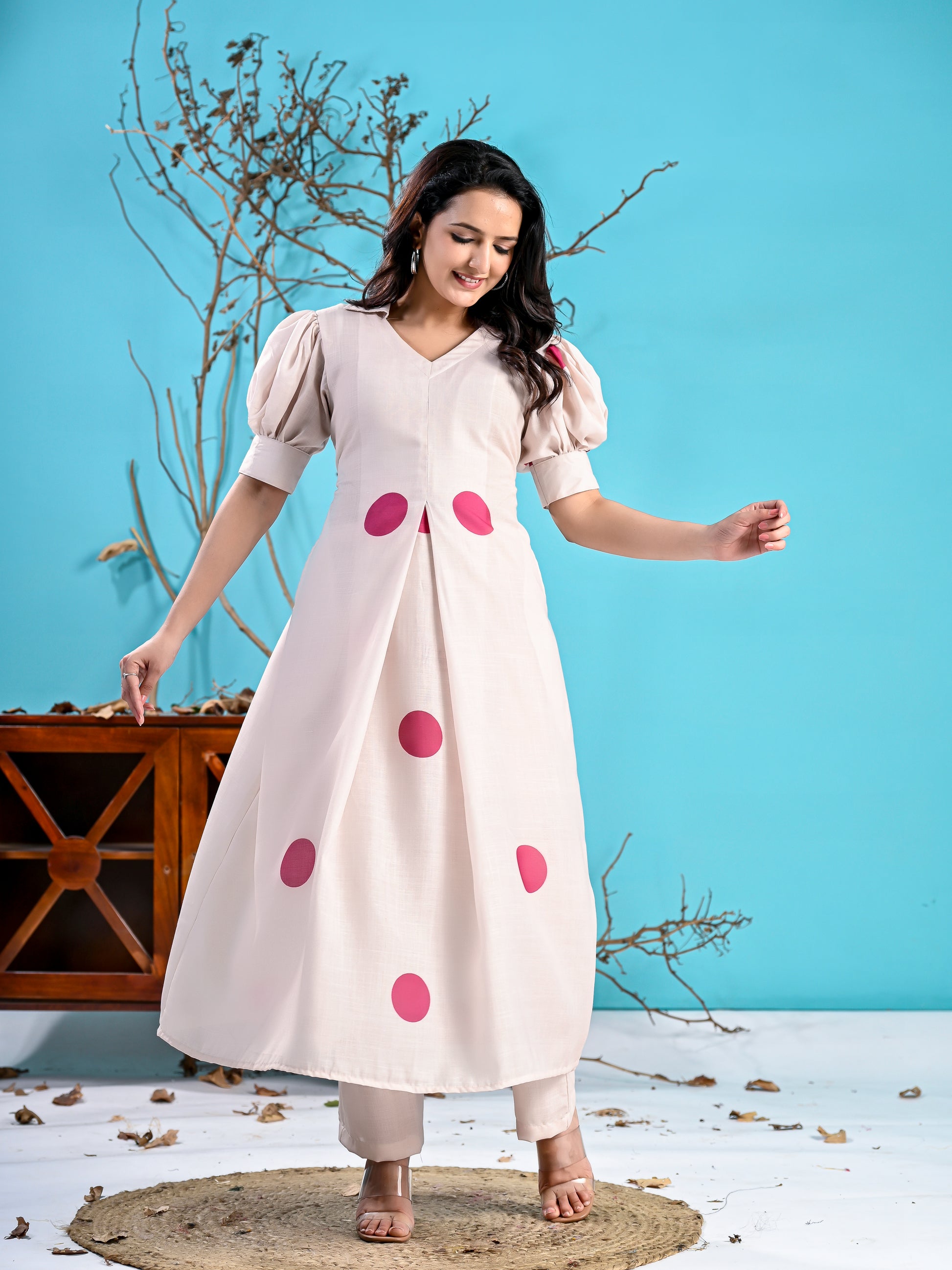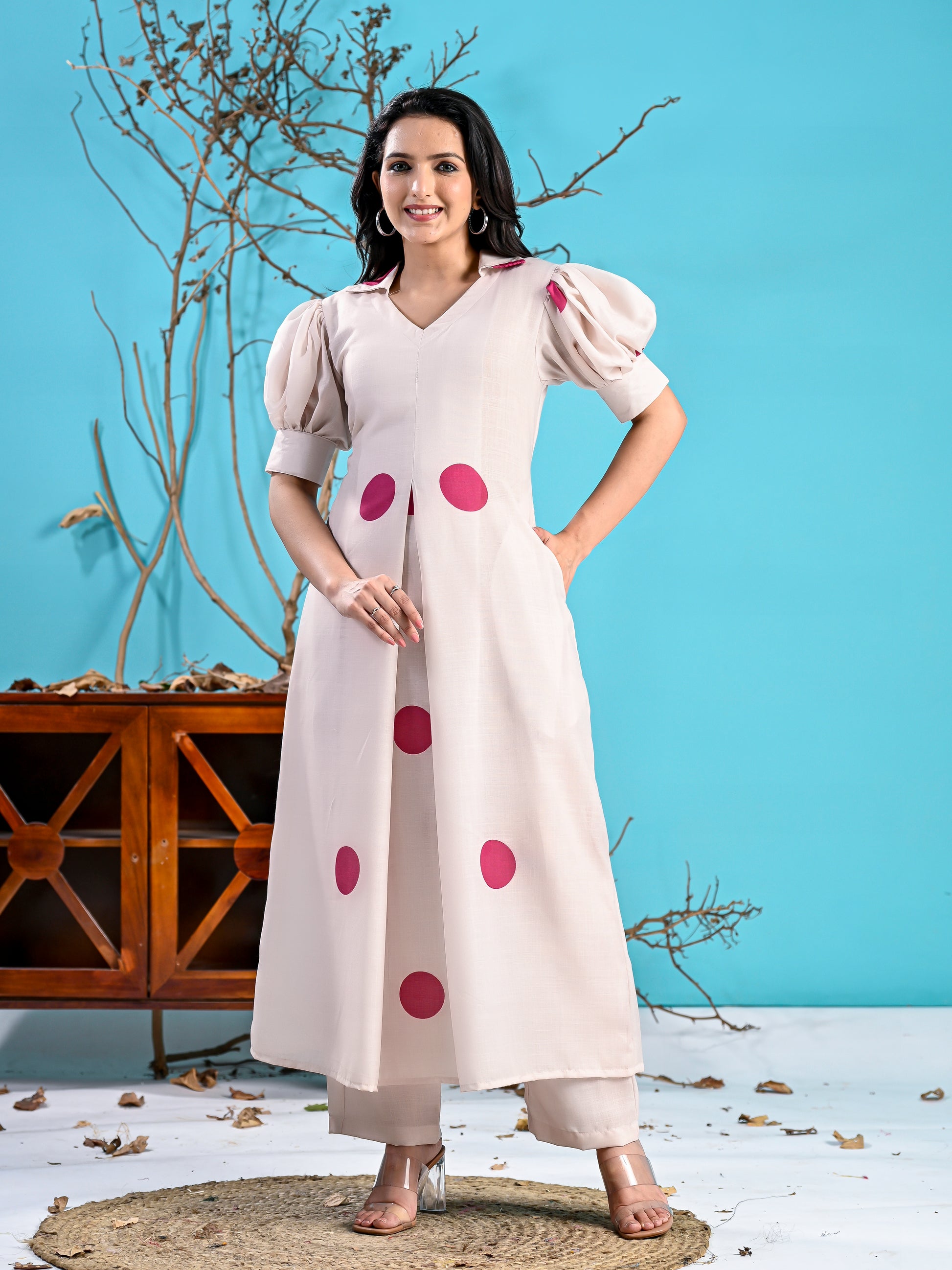 Embrace effortless elegance with this versatile pink polka kurta set. The pleated puff sleeve design features the style on your comfort. This comes with pockets adding a touch of sophistication. Paired with straight printed pants.