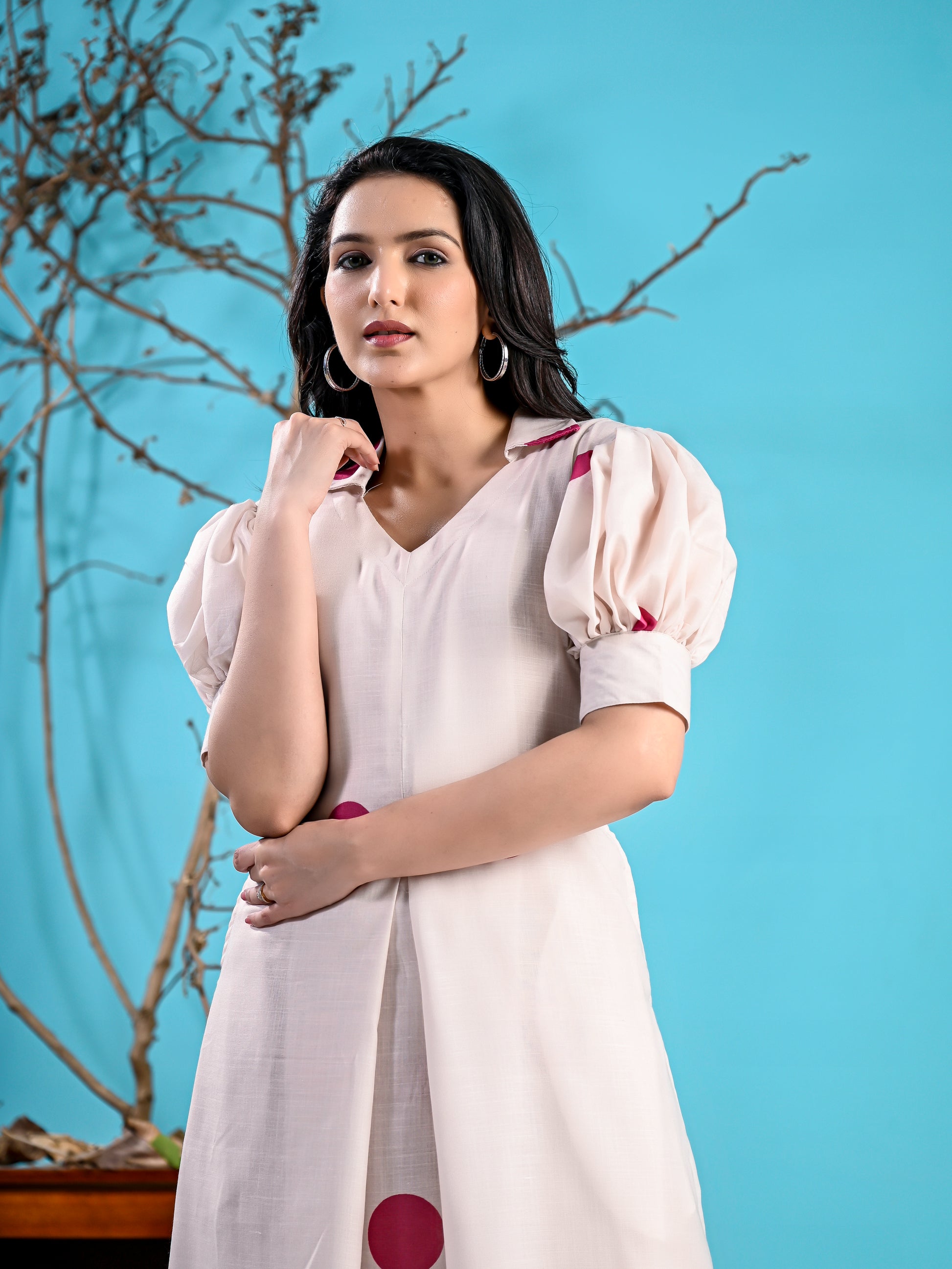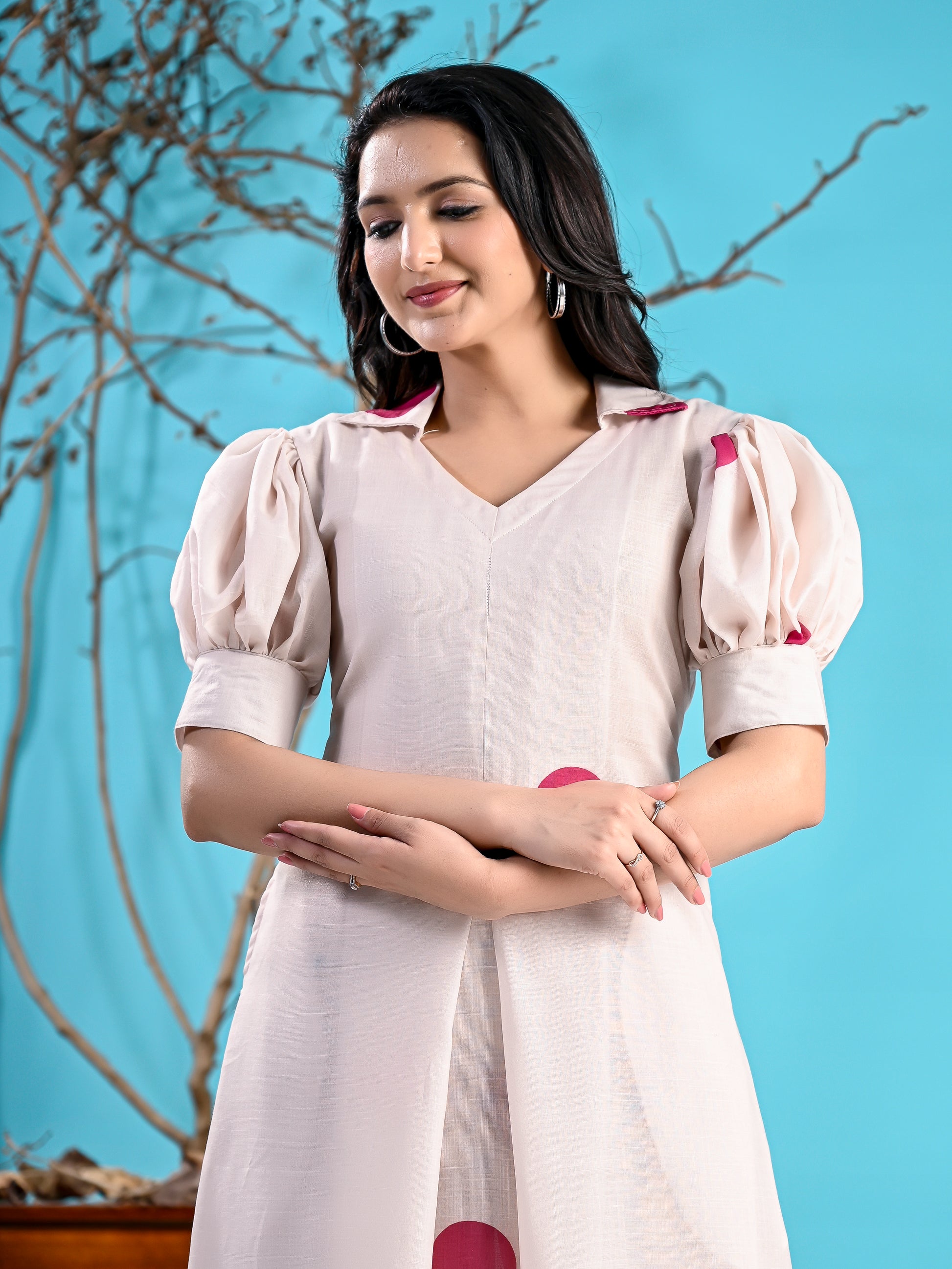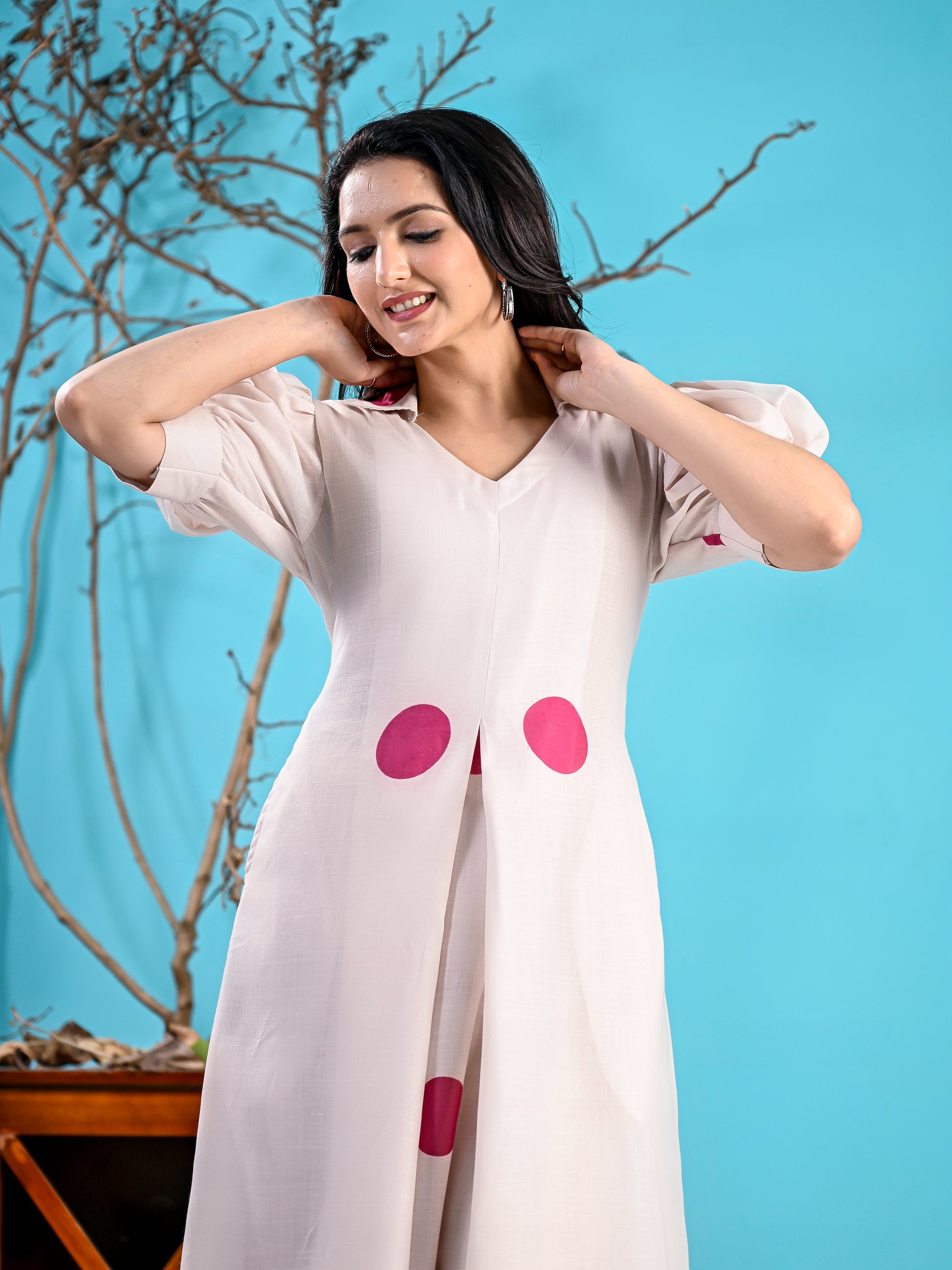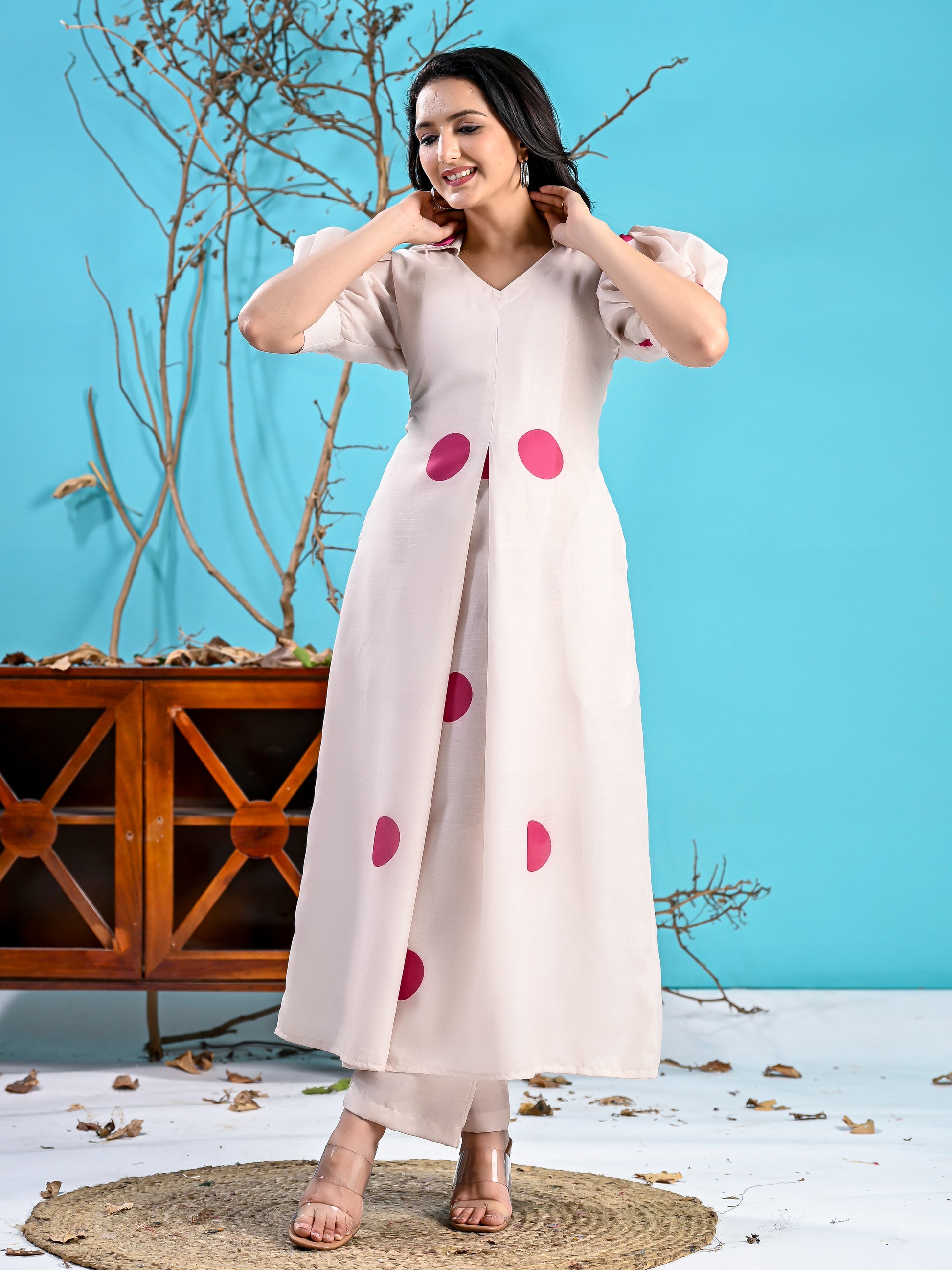 Embrace effortless elegance with this versatile pink polka kurta set. The pleated puff sleeve design features the style on your comfort. This comes with pockets adding a touch of sophistication. Paired with straight printed pants.