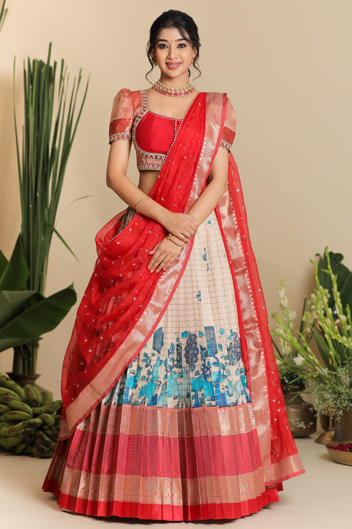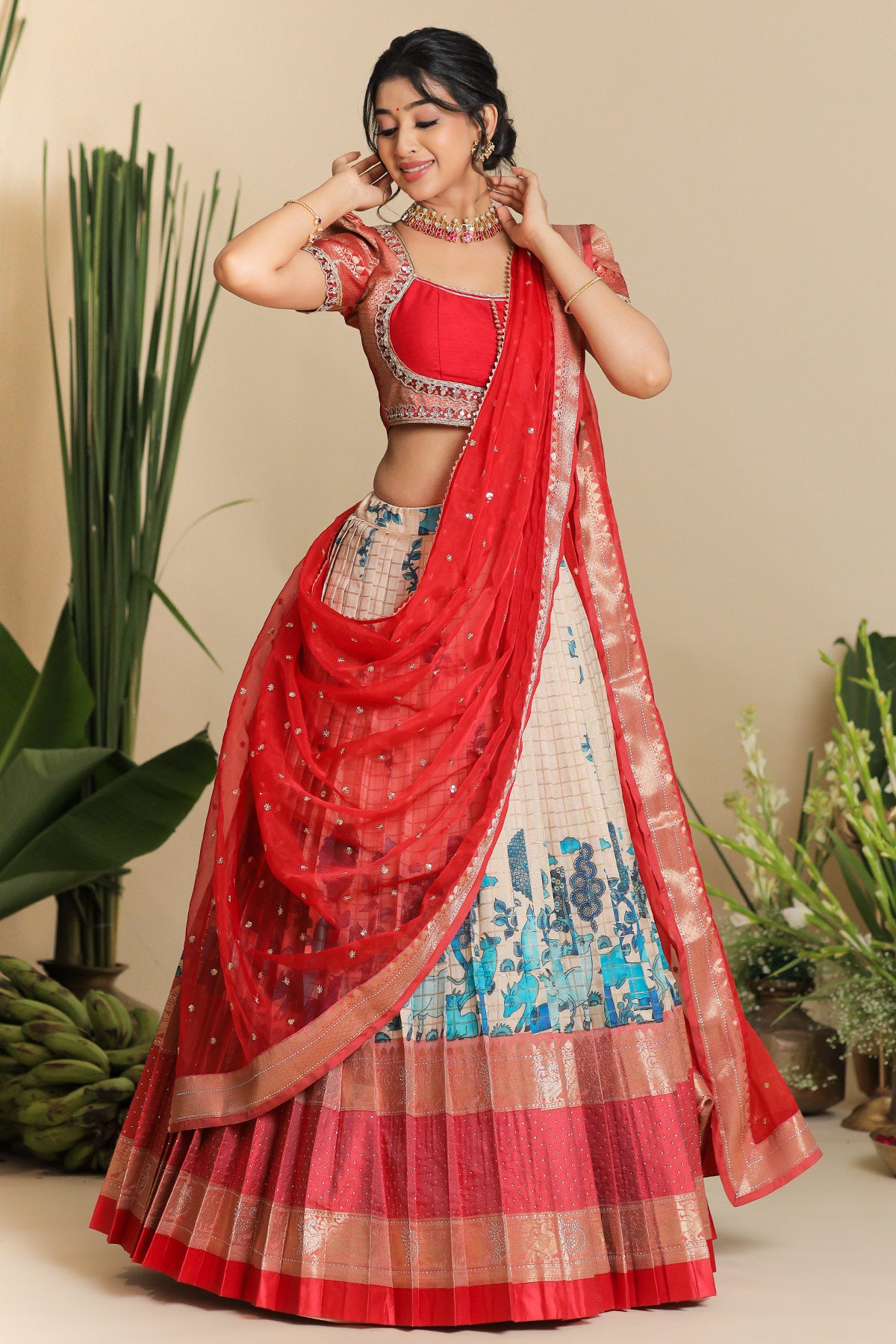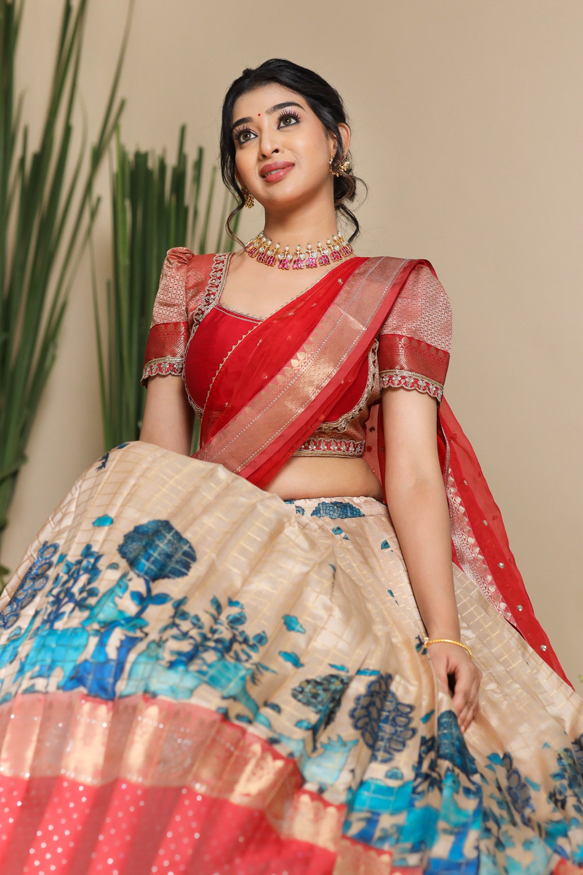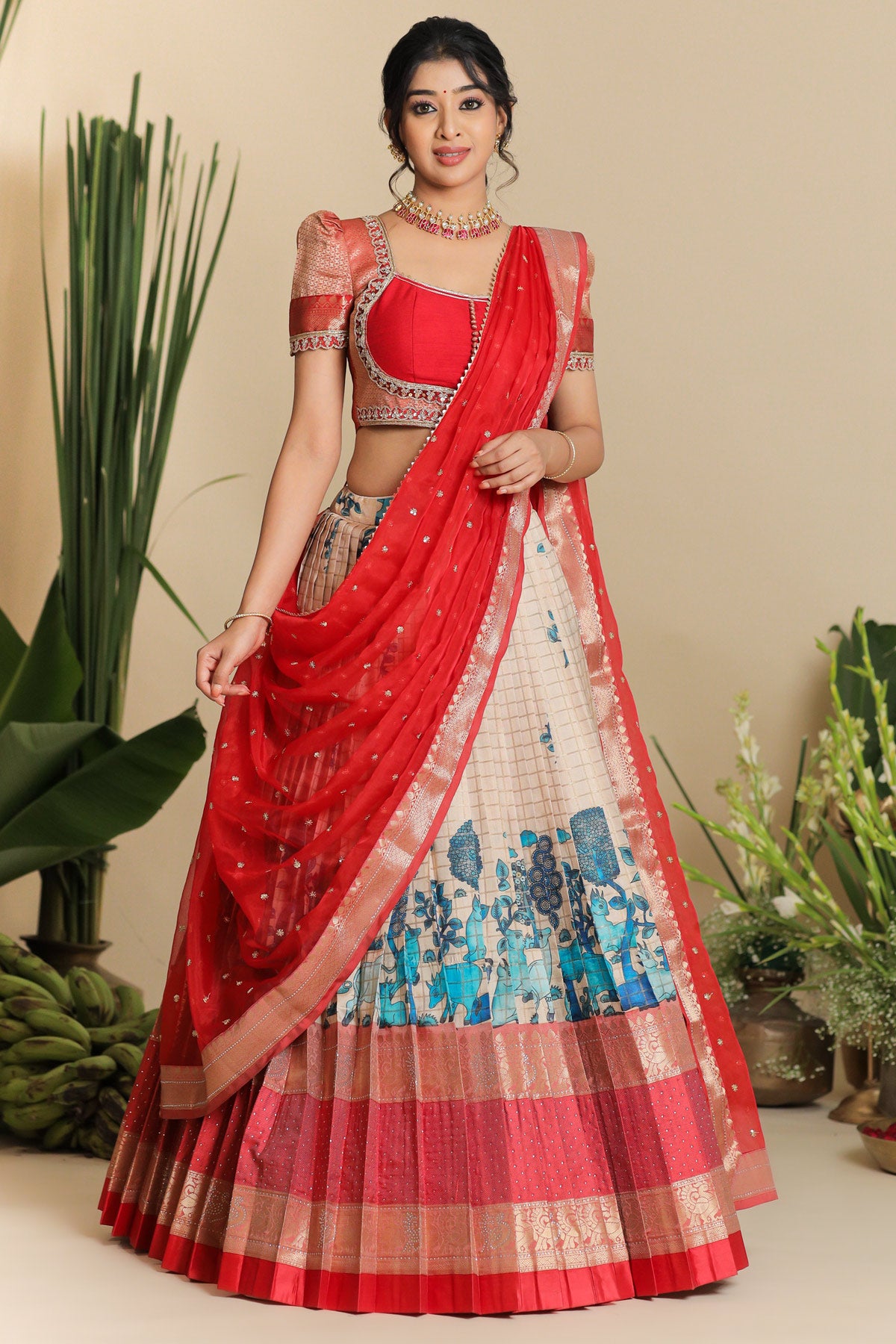 Celebrate the upcoming festive season elegantly in the stunning Saloni Banarasi Lehenga Set in vibrant red. This exquisite lehenga features intricate potli-work on the yoke and delicate lace accents, highlighted by a broad pattu border adorned with sparkling Swarovski details. Completing the look is a 3-meter Organza dupatta, beautifully embellished with butti work.