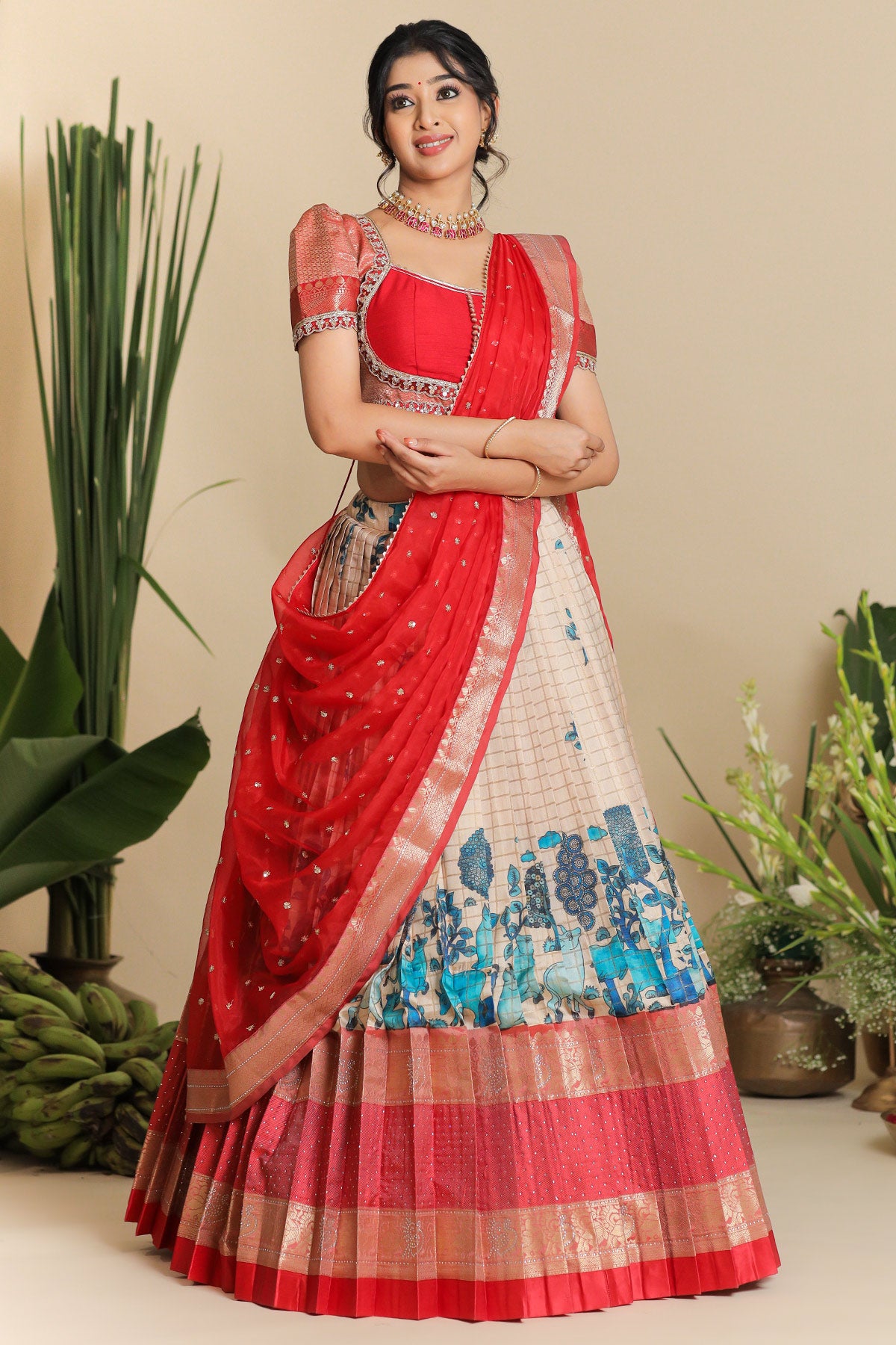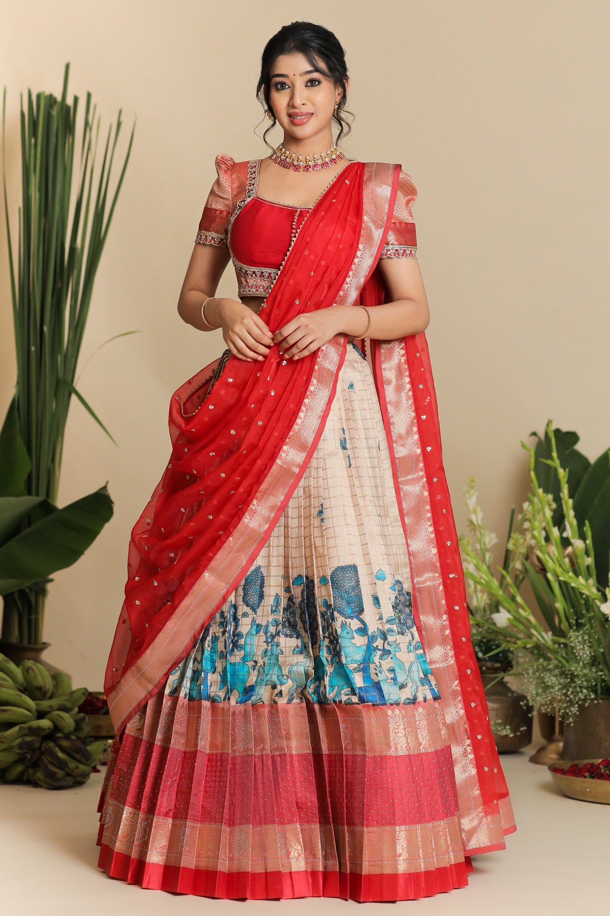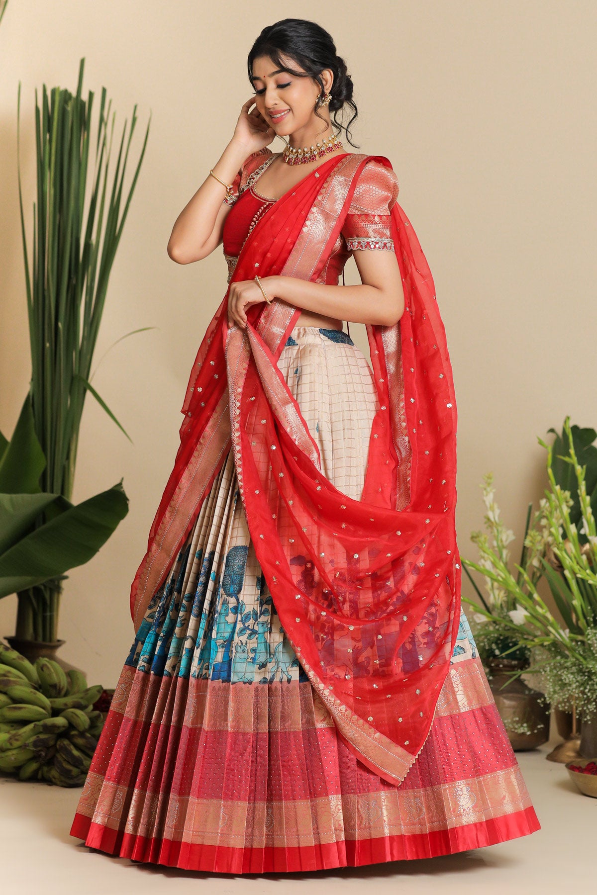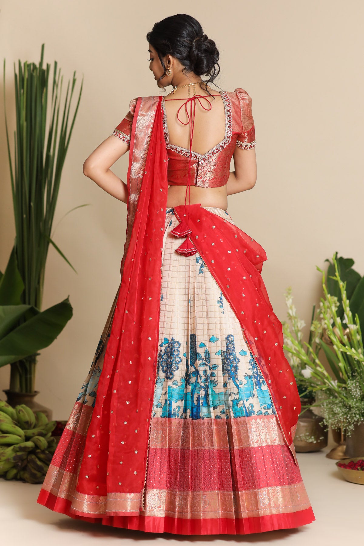 Celebrate the upcoming festive season elegantly in the stunning Saloni Banarasi Lehenga Set in vibrant red. This exquisite lehenga features intricate potli-work on the yoke and delicate lace accents, highlighted by a broad pattu border adorned with sparkling Swarovski details. Completing the look is a 3-meter Organza dupatta, beautifully embellished with butti work.
