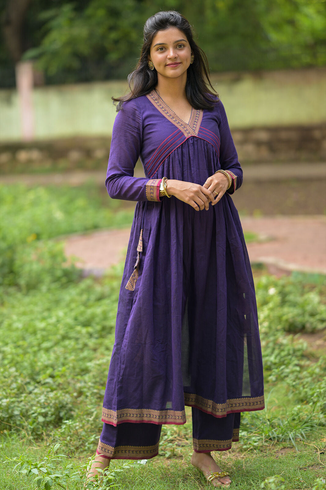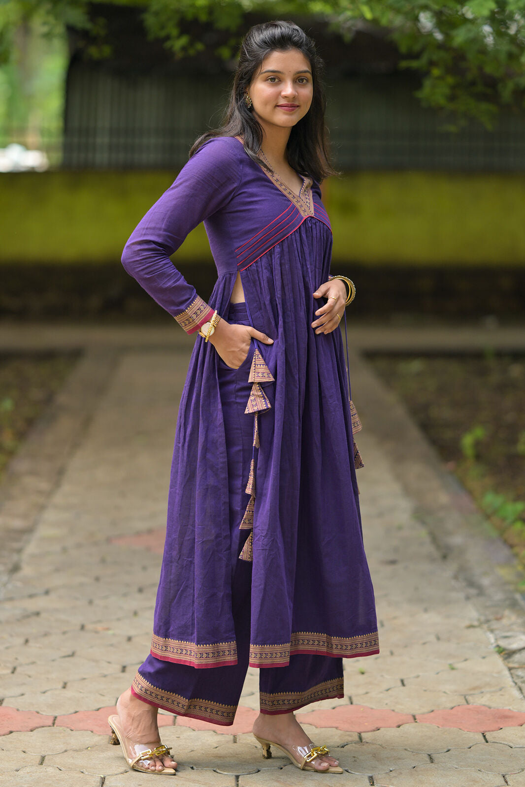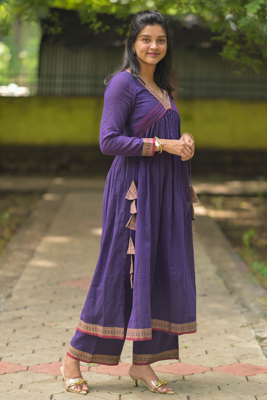 Embrace the fusion of style and comfort with this Violet Kurta set, crafted in Pure Handloom, which is lightweight and comfortable on the skin. Pair it with a straight flair Plazoo pant featuring a border on the edges. It comes in full sleeves with a V-neckline, border detailing, piping on the yoke, and tassels on both sides. Complete this look with minimal oxidized accessories.